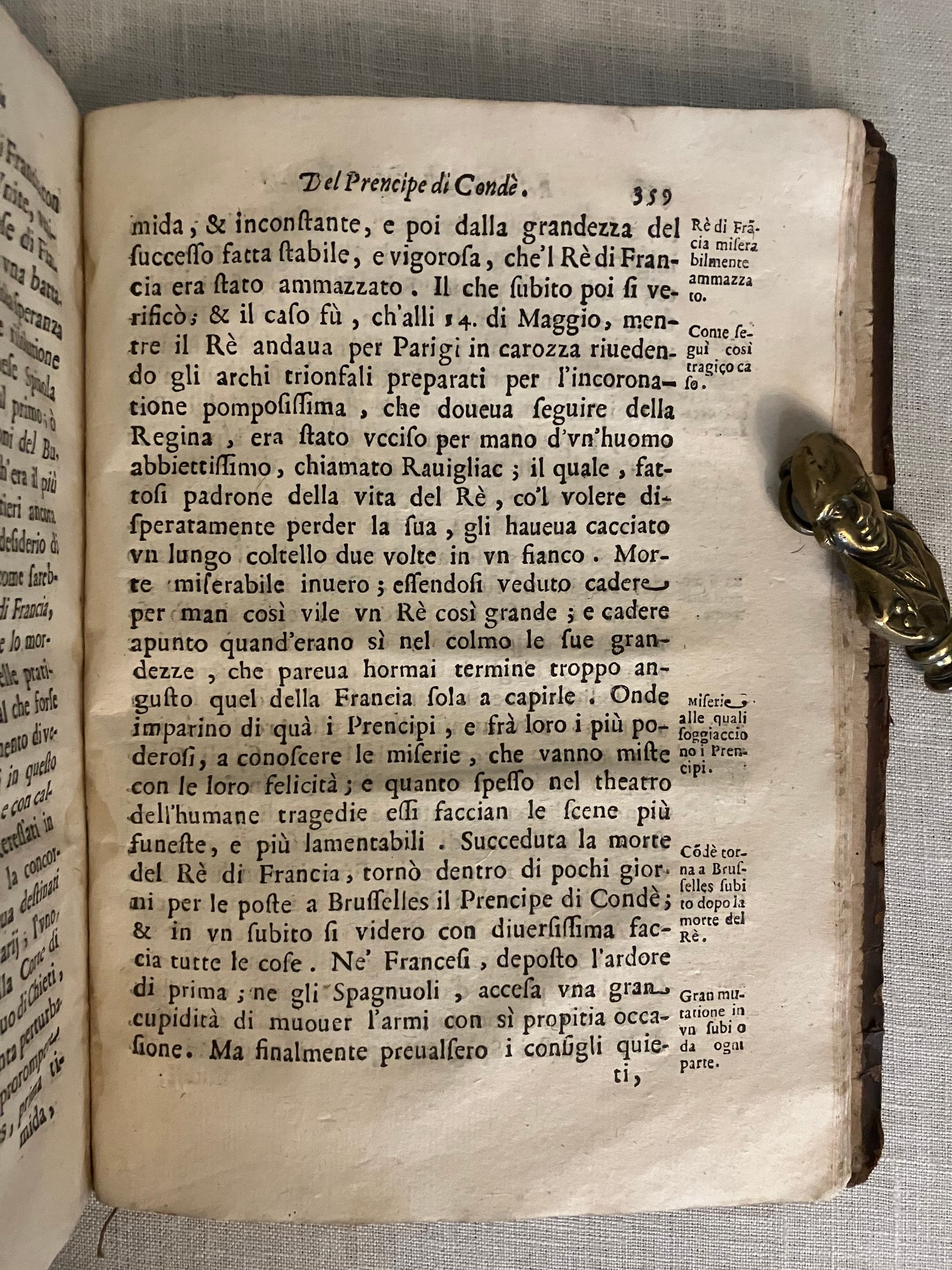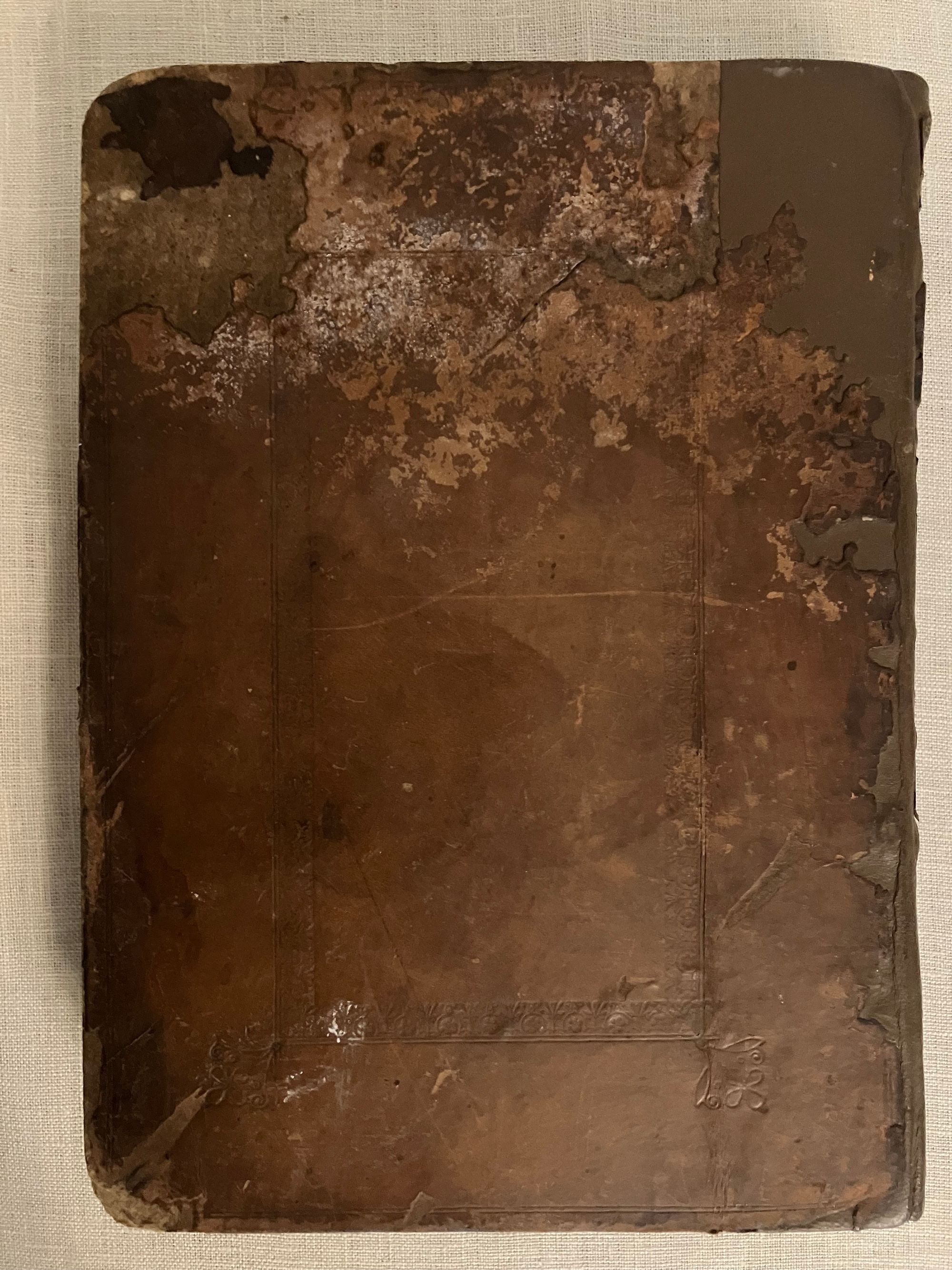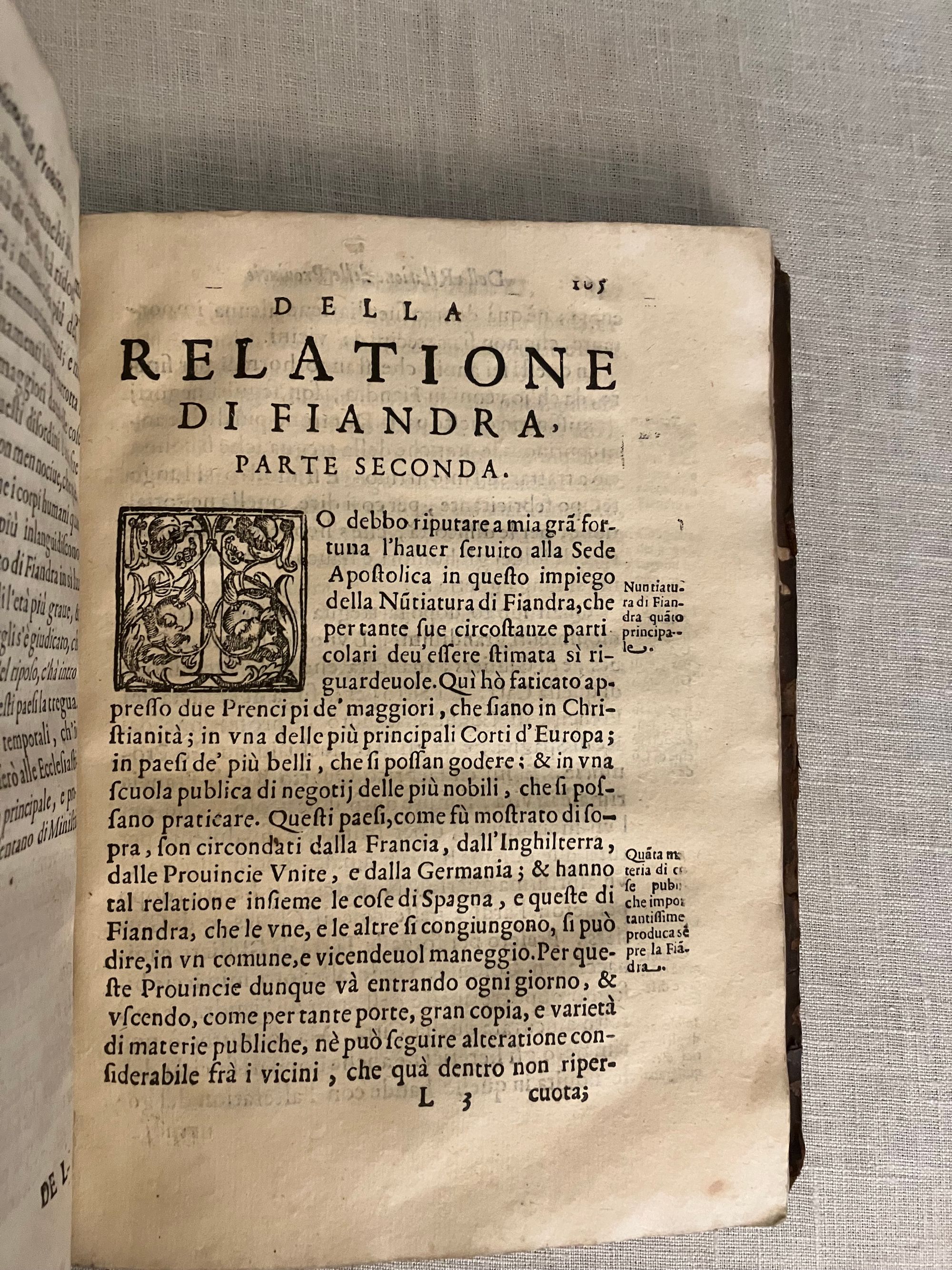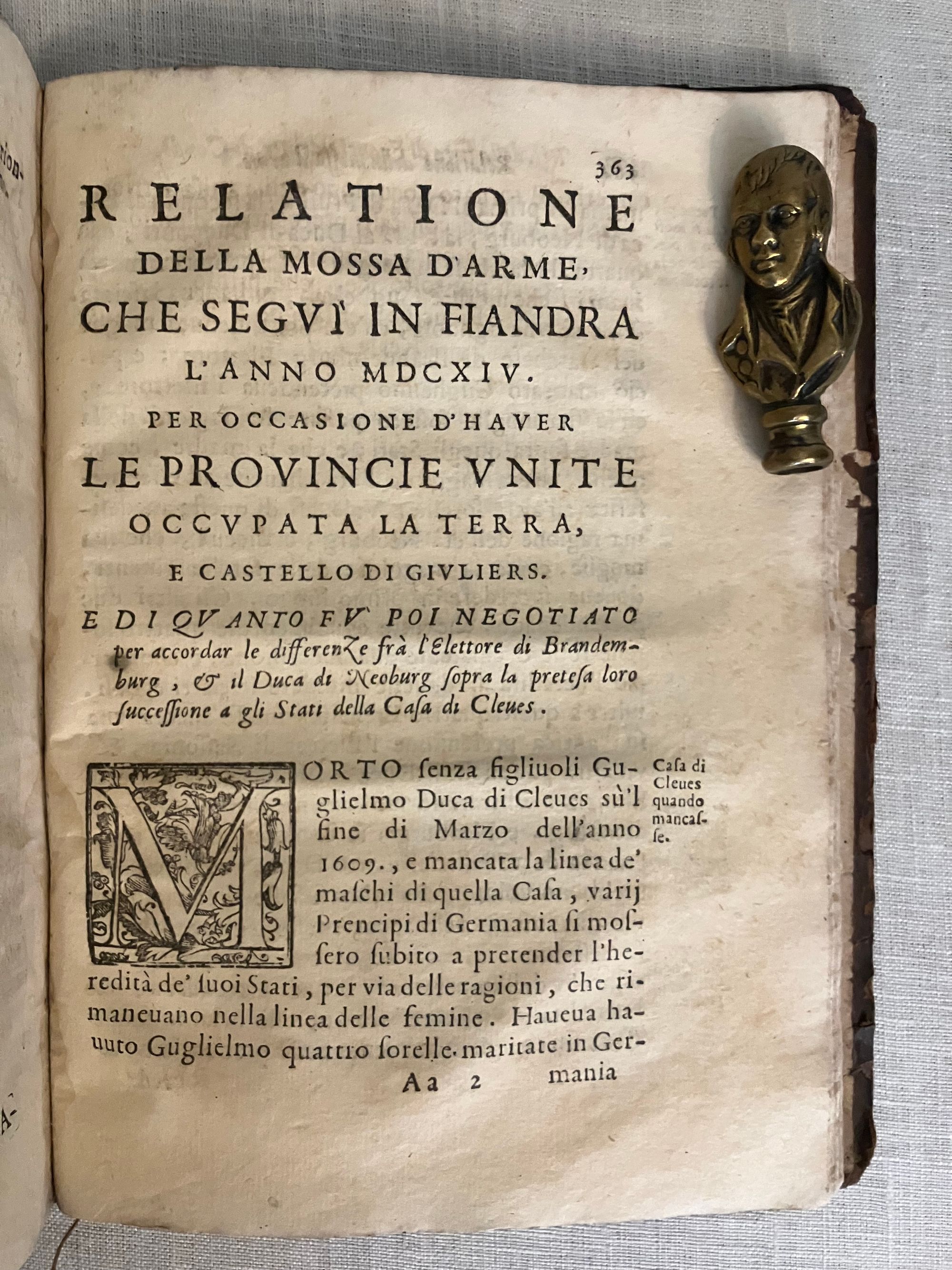 Reprint. Second Ginammi edition (his first printed the year prior.) Hardcover, 8vo in full calf, rebacked, with blind-stamped decoration to boards of rolled floral rectangular decoration and plain double filet to outer edges. Corner fleurons to the front and rear boards. The spine, with remnants of raised compartments, has bits of the original gilt decoration applied with charming irregularity. An applied leather label is illegible. Page edges are deckled with red spatter. In Italian. The title page features a printer's device with the figure of Hope, a woman facing the sun, leaning against an anchor. This figure was copied from a statue by Iacopo Sansovino at the Church of the Savior, located next to the printing house. (L. Spera, BDI, Vol. 55, 2001.) The motto on printer's device: "Spes mea in Deo est," (My hope is in God.) 2 titles in one with continuous numbering. Text features wonderful typography with side notes, wood cut historiated initials and other decorative headers and footers. **COLLATION: pp. [28] 417 [3]. [2]a6 b8 A8-I8 K8-T8 V8 X8-Z8 Aa8-Dd8. Page 361 misnumbered as 347. **CONDITION: Good antiquarian condition. Boards are worn, with show-through to the boards on corners, back and spine. There are signs of water damage to the text block at spine edge. Wear to the fore-edge of the first and final signatures.** CONTENTS: The printer's dedication of the work to Cardinal Bentivoglio, dated 1632; Bentivolglio's dedication of his work to Signor Cardinal Borghese, dated 1611; Table of Contents by Chapters; Preface to Primo Volume; Printer's Preface; Alphabetical Table of Contents incl. both works; Most quoted sentences, all p.[1-28]. VOLUME PRIMO: Report of the Provinces of Flanders made by Cardinal Bentivolio, including an assessment of the political and military strengths 1-164pp. VOLUME SECUNDO: "Della Relatione di Findra, Parte Seconda " p. 165-306. THIRD PART:" Relatione della fuga di Francia Denrico di Borbone Prencipe di Conde, Primo Prencipie del Sangue Reale di Francia, e di quello che sugui fino al sua ritorno a Parigi," p. 307-362. FORTH PART: "Relatione della Mossa D'Arme che Segui in Fiandra L'Anno MDXXIV, per Occasione d'Haver Le Provincie Unite Occupata La Terra, e Castello di Giuliers,"p. 363-417. FINALLY: "Libri Stamparti da Marco Ginammi alla Liberia della Speranza," 2pp. Printer/publisher's catalogue. **AUTHOR, Cardinal Guido Bentivoglio d'Aragona, (1579-1644) was an influential historian and papal statesman, or nuncio, at the Court of the Netherlands around the time of the conclusion of the Eighty Years War, and later, at the court of France. Educated at the University of Padua in both civil and canon law, he was singled out for early advancement by Pope Clement VIII, becoming his private chamberlain. Under Pope Paul V, Bentigvolio would become nuncio at the Court of Archduke Albert and Isabella in the Hapsburg Netherlands from 1607-1615, and later Cardinal Protector of France between 1618-1621. Bentivolgio was a signer of the papal condemnation of Galileo, his one-time teacher at Padua. He was favored as successor to Pope Urban VIII, but died suddenly after the opening of the conclave in 1644. ***First published in1629, Bentivoglio wrote to his colleague Cardinal Vitelli, nuncio to Venice and Thessalonika, in the Relationi, with observations on the United Provinces of the Netherlands: the people, the naval and military strength and personalities of the major international players in the area. He also discusses the stresses leading into to the Thirty Years' War, frictions between the Austro-Spanish Hapsburgs and the French Bourbons, and the struggles for control by Catholic and Protestant parties. The second book, with its own half title page, is a history of the War of Flanders. *** PRINTER, Marco Ginammi (1590-1654) published two editions of the Relationi, this one in 1633 and another in 1636. The infamous plague which devastated Venice between 1628-30 had forced Ginammi to temporarily cease all production, and he had to borrow a press to print an Operetta he had penned celebrating the end of the pestilenza in 1631. However, his fortunes would recover. He was elected both priore and sindaco (mayor, or administrator) to the Guild of Printers and Booksellers of Venice in the 1630's and 40's, and owned and rented out land. His was a small family print shop, although his bookstore carried volumes produced all over Italy. He would collaborate editorially with a number of others. He published a great number of the works of Ludovico Zuccolo as well as the sacred works of Pietro Aretino. A son, Bartolomeo Giammi, learned Slavic and Turkish languages, enabling the family print shop to cater to the "oriental" markets. Ginammi also translated French editions into Italian. USTC: 4012401 (11 copies worldwide.) RARE.