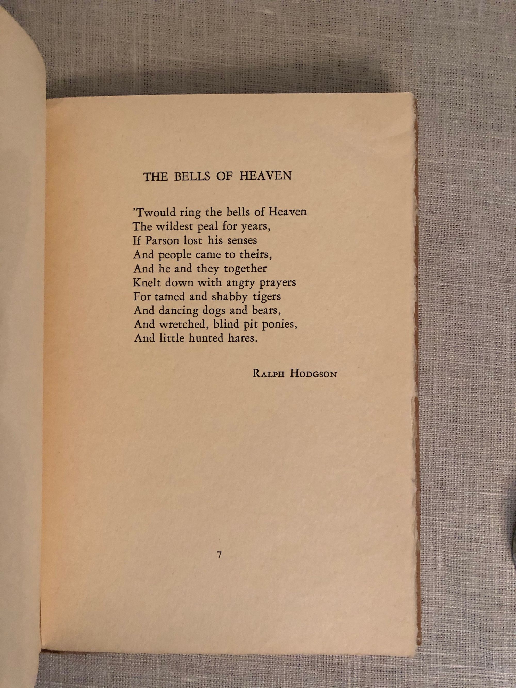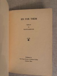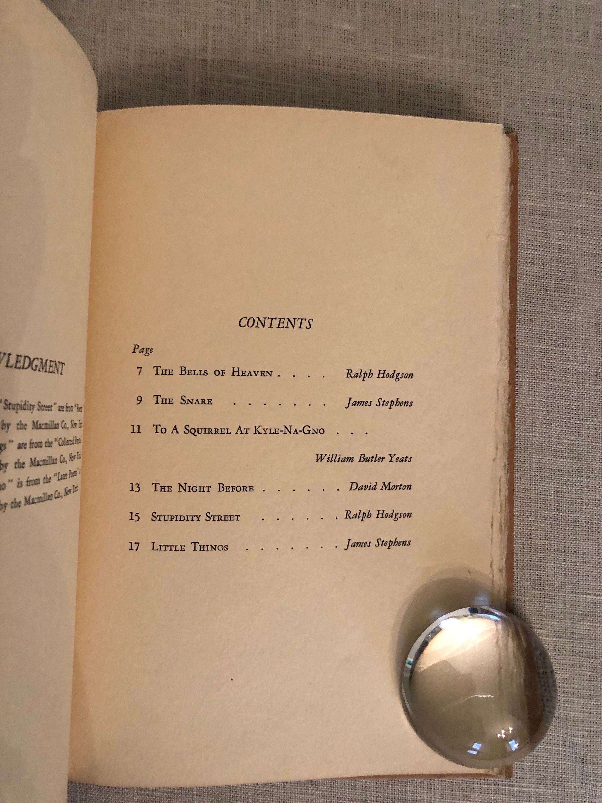 Hard cover, 8vo, 17pp. Small volume of poetry compiled by David H. Morton (1886-1957), an American poet who won the Golden Rose Award and the National Arts Club Prize, and signed by him on the front free endpaper. Morton also wrote the 1929 book "The Renaissance of Irish Poetry: 1880-1930". Includes poems by Ralph Hodgson, James Stephens, William Butler Yeats, and David Morton. Condition: Very Good, with one corner bumped. Moderate age toning to text. Lacking dust jacket.
