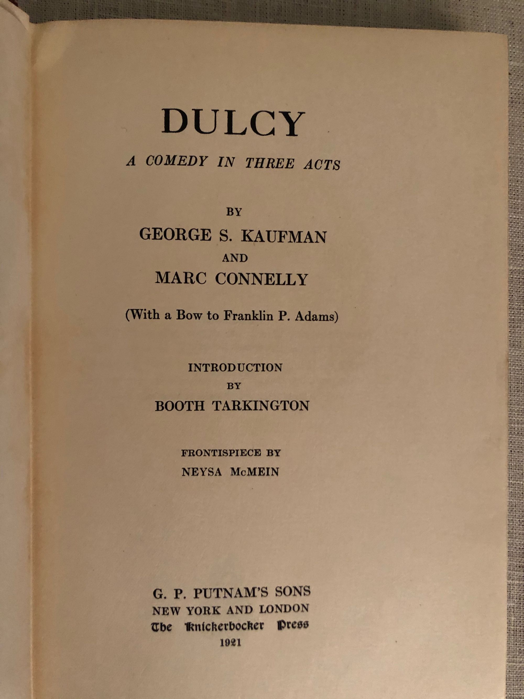 207pp+ads. A drama by George S. Kaufman (1889-1961), an American playwright who wrote for the Marx Brothers, and won the Tony Award for Best Director in 1951 for the musical "Guys and Dolls". Kaufman wrote "Dulcy" and four other comedy plays in collaboration with Marc Connelly (1890-1980), who received the Pulitzer Prize for Drama with "The Green Pastures" in 1930. Condition: The book is remarkable fresh and clean-looking, about Very Good or better. The spine label is lightly dust-soiled.