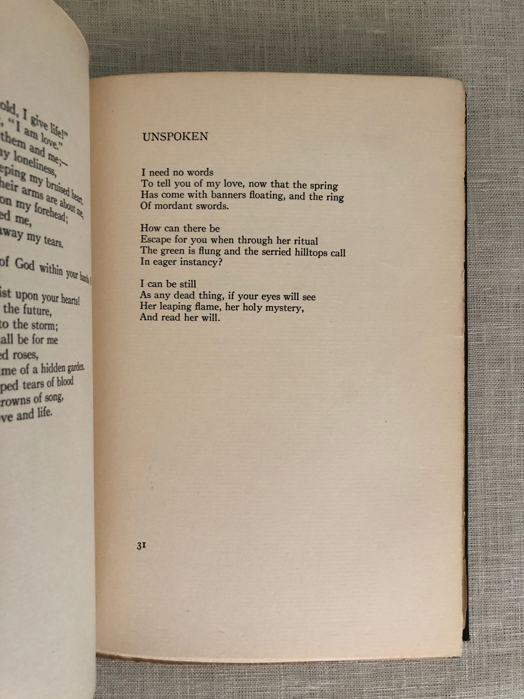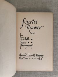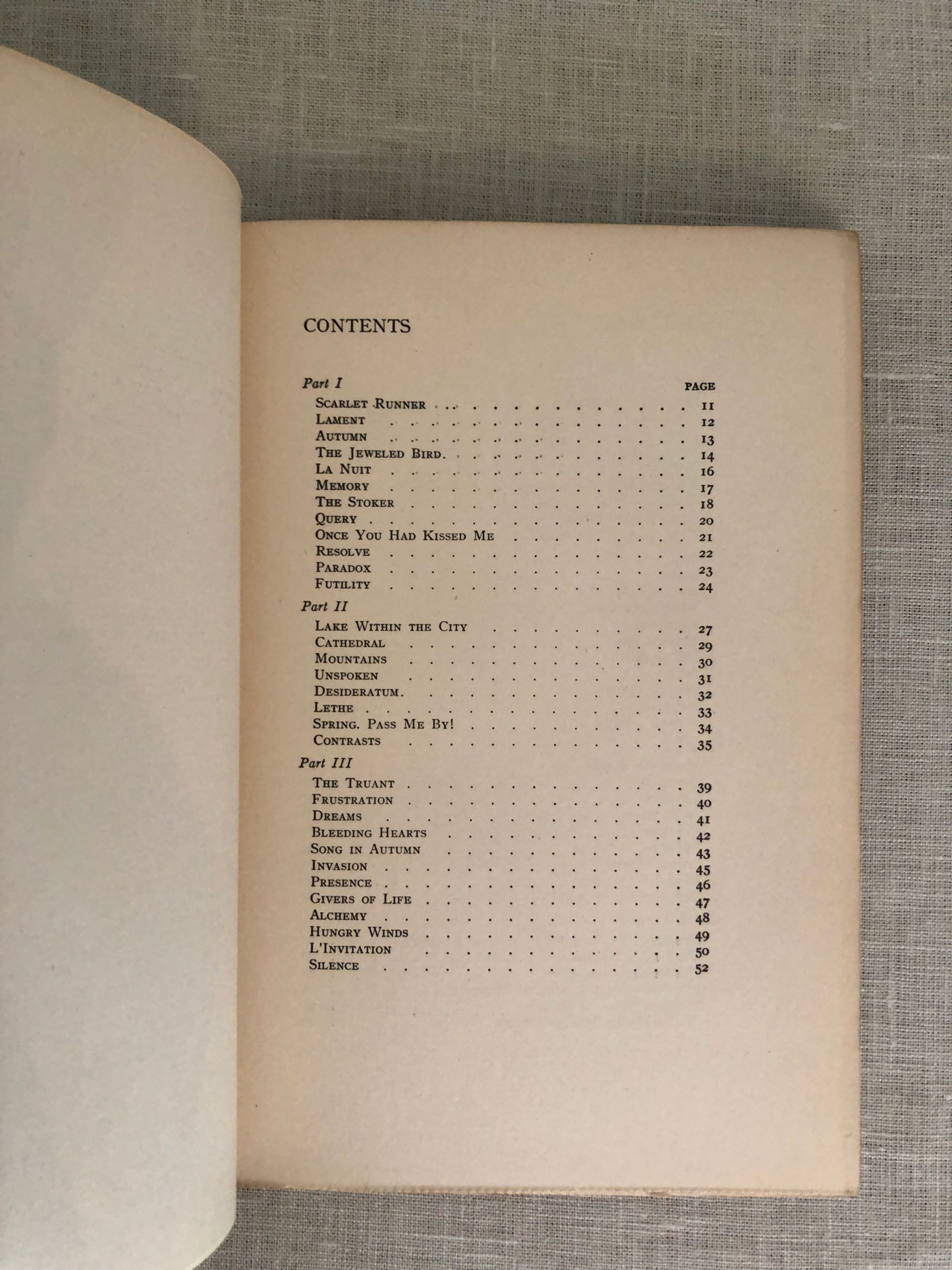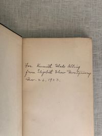 Hard cover 12mo., in publisher's green cloth binding with gilt lettering. 96pp. First book of poetry by Elizabeth Shaw Montgomery, as reviewed in "Current Poetry" (1924) alongside Edna St Vincent Millay's "The Curse". Poems include "La Nuit", "Lake Within the City", "Lethe", "From the Arabic" and "Alchemy". In these works we see the beginnings of the more gothic work, such as "Scarabaeus" (1926). Condition: About Very Good with light wear to corners of covers. Inscribed by Author to front free endpaper to fellow-poet Kenneth Slade Alling, dated 1923.