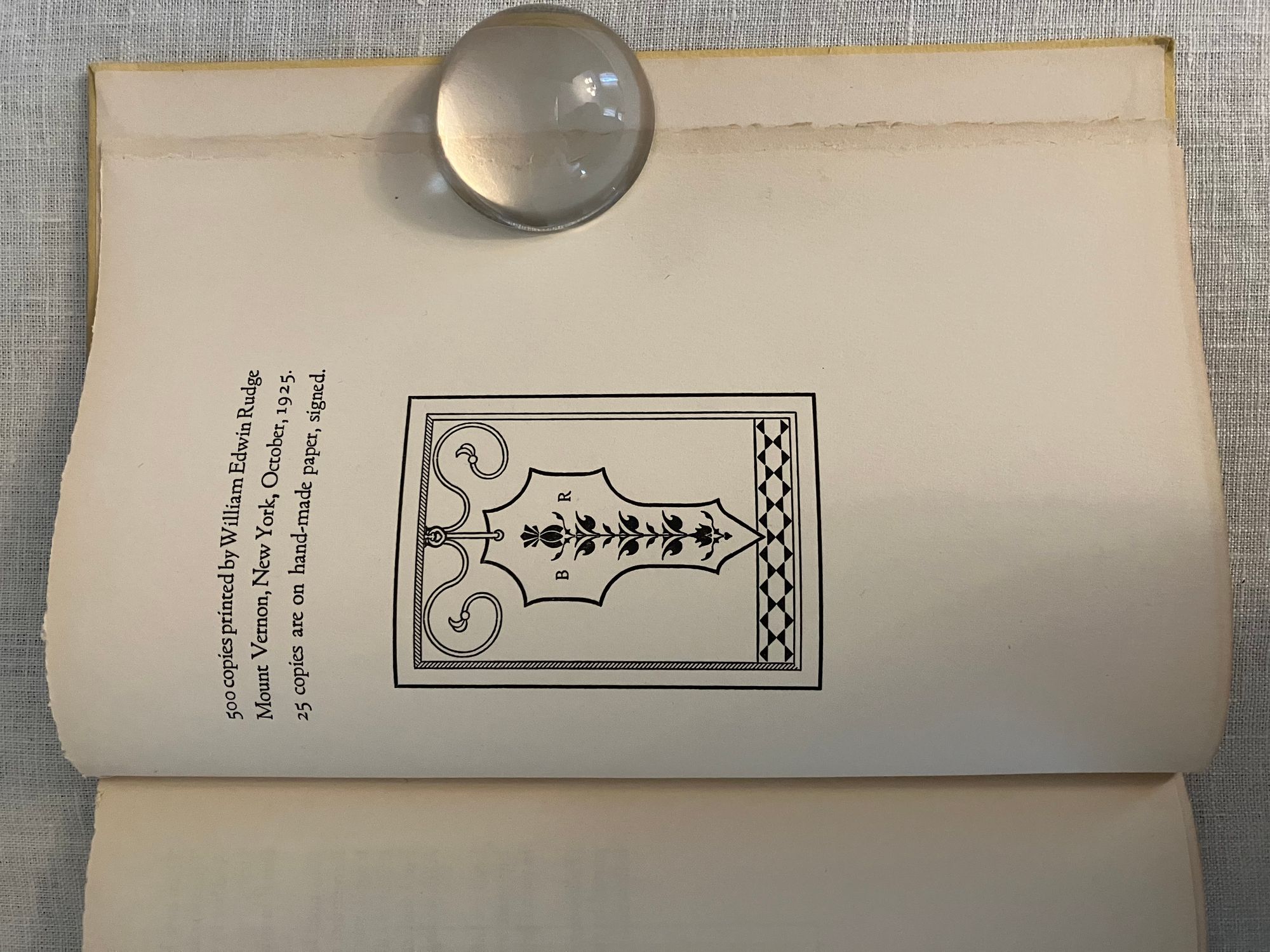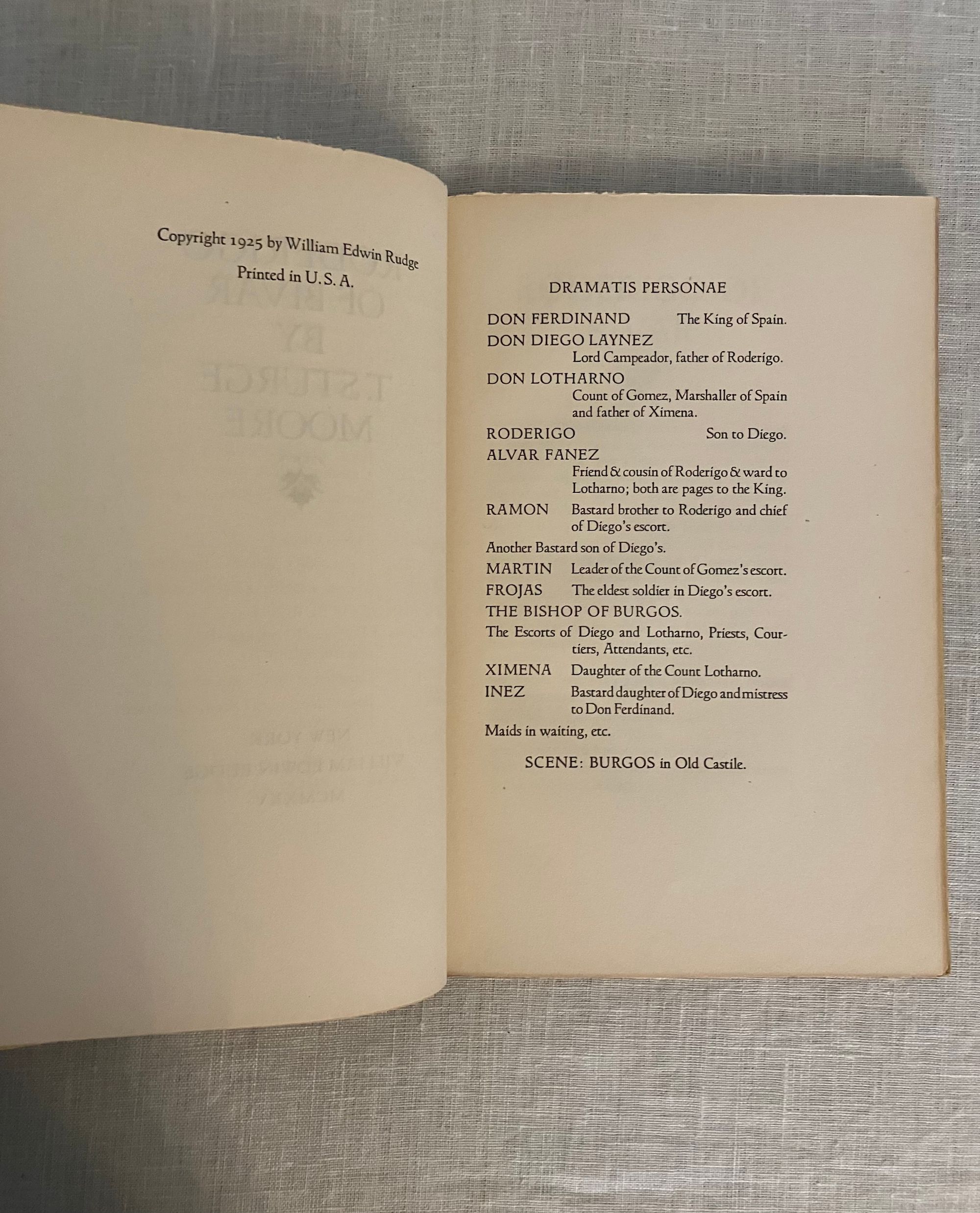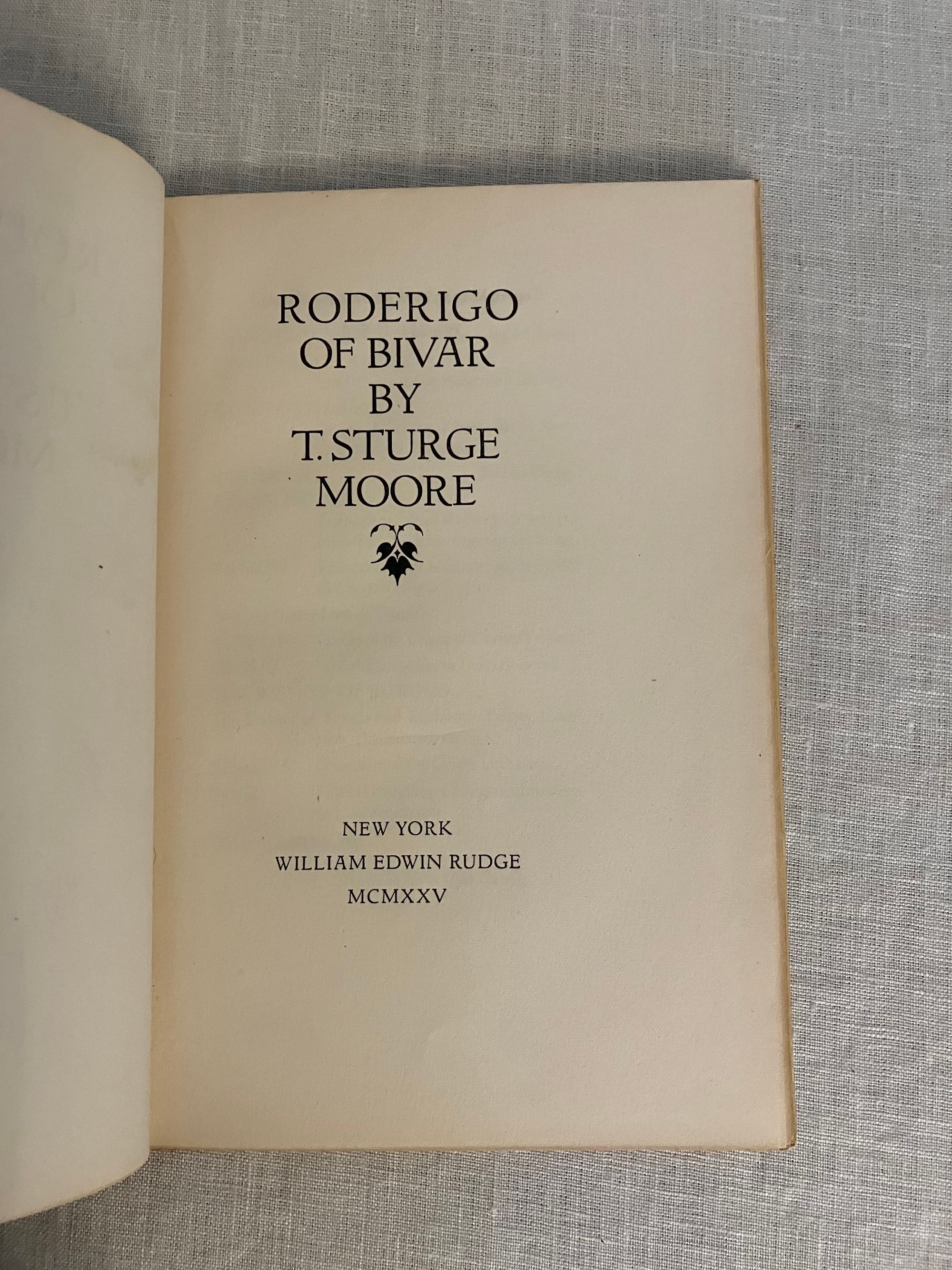 Limited Edition of 500 on B.R. Rag paper, First Edition. Hard cover in publisher's original quarter red cloth with yellow paper-covered boards, and applied, printed paper label to spine, 51 pp. Lacking glassine jacket, but now in protective mylar. Publisher's colophon states the copies in the Limited Edition printed by William Edwin Rudge, Mount Vernon, NY, October, 1925.** Printer's colophon at rear shows the device of Bruce Rogers, noted typographer and book designer.** Condition: Very Good Plus with a few light marks to covers, slight corner wear, and remaining mostly unopened. Front hinge partly cracked. Otherwise, the interior is clean, bright, and unwritten in. ** This one-act drama about the medieval national Spanish hero known as El Cid, was written by the multi-talented Bloomsbury poet, dramatist, artist, critic and translator T. Sturge Moore ( 1870-1944.), who had associations with W.B. Yeats, Shannon and Ricketts of the Vale Press, and was an ancillary member of London's Bloomsbury Set through his brother, the philosopher G. E. Moore. He was author of thirty one plays. Warde & Haas, Kennikat Press, (1968), 113. Rogers, Paragraphs on Printing (Dover, 1979), p. 64. (title pg.) Warde, Bruce Rogers Designer of Books, (Harvard, 1926) pl. 15 (colophon.) Ransom, (1929), "Rogers" checklist, No. 4, p. 402.