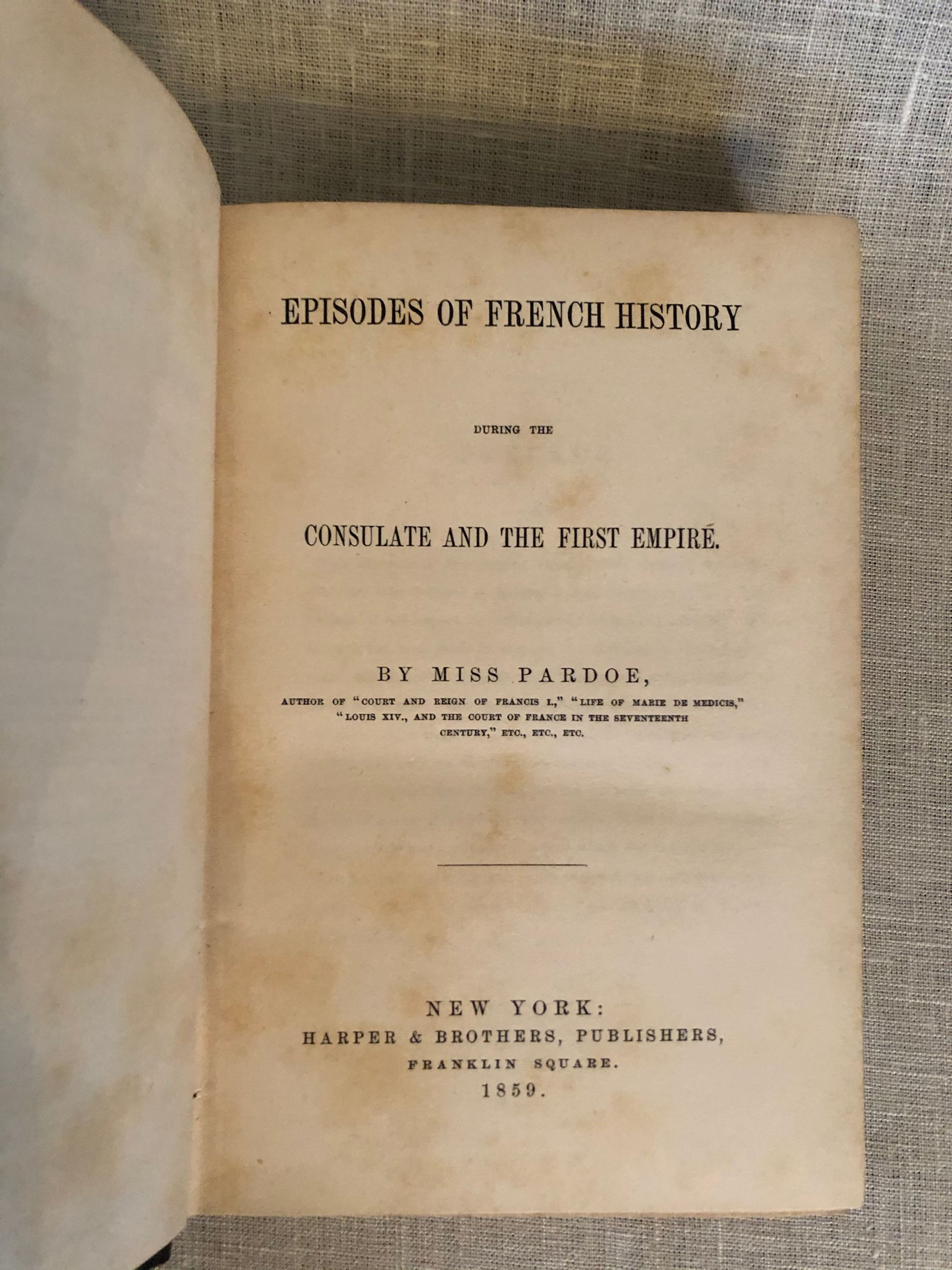Hard cover, 8vo., in publisher's brown stamped cloth with title in gilt to spine. 361 pp. plus 3 pp. adverts. In English. Small inscription in old ink to ffep. This is a scarce to market title, penned near the end of the career of this popular historian. Author Julia Pardoe (1806-1862) is well known for her books on the French court in the 16th and 17th centuries. Here, she chronicles the stormy relations between the Empress Josephine and Napoleon, conveyed with no small amount of melodrama. Condition: Very Good. Sutherland, p 488.