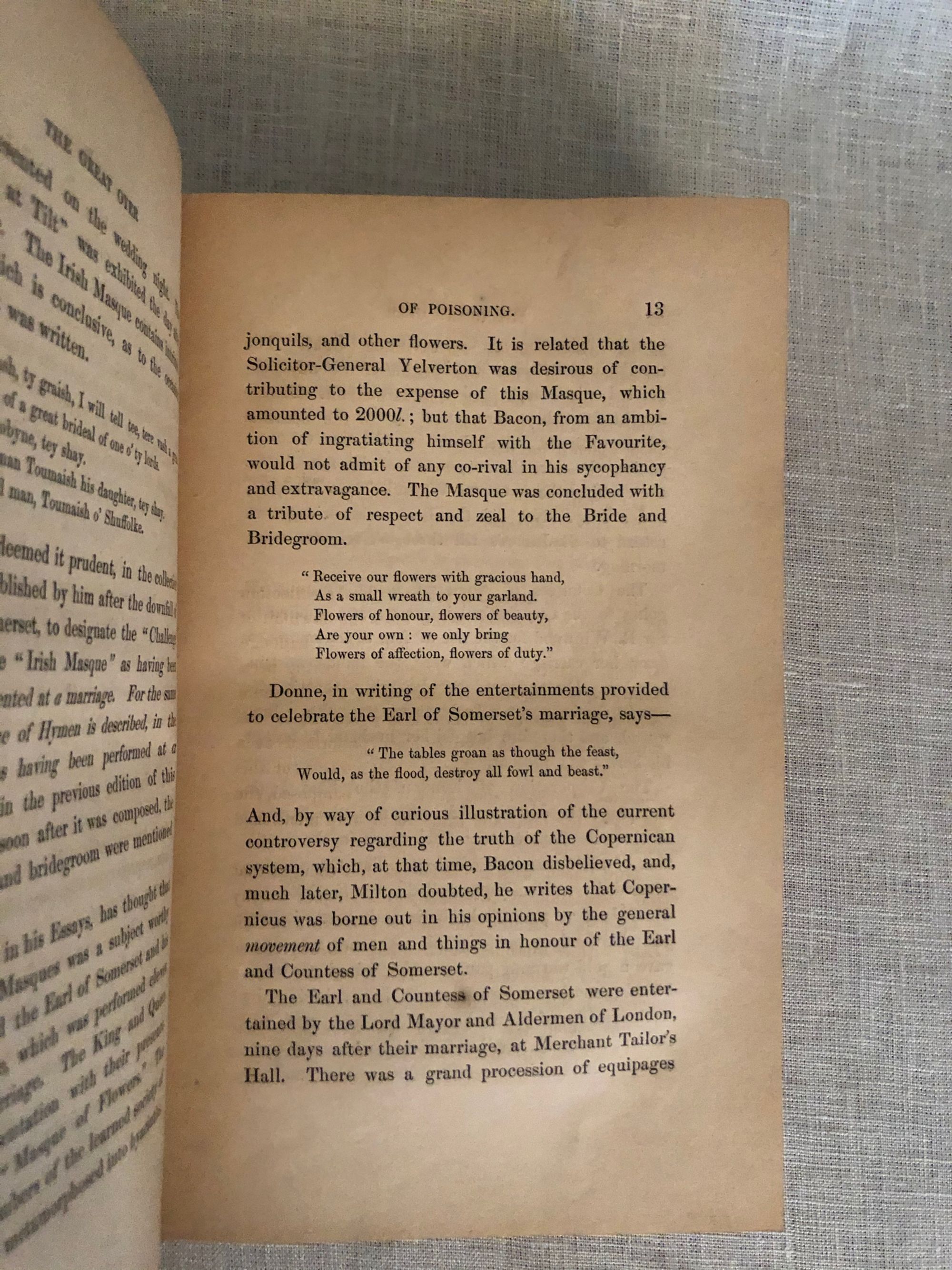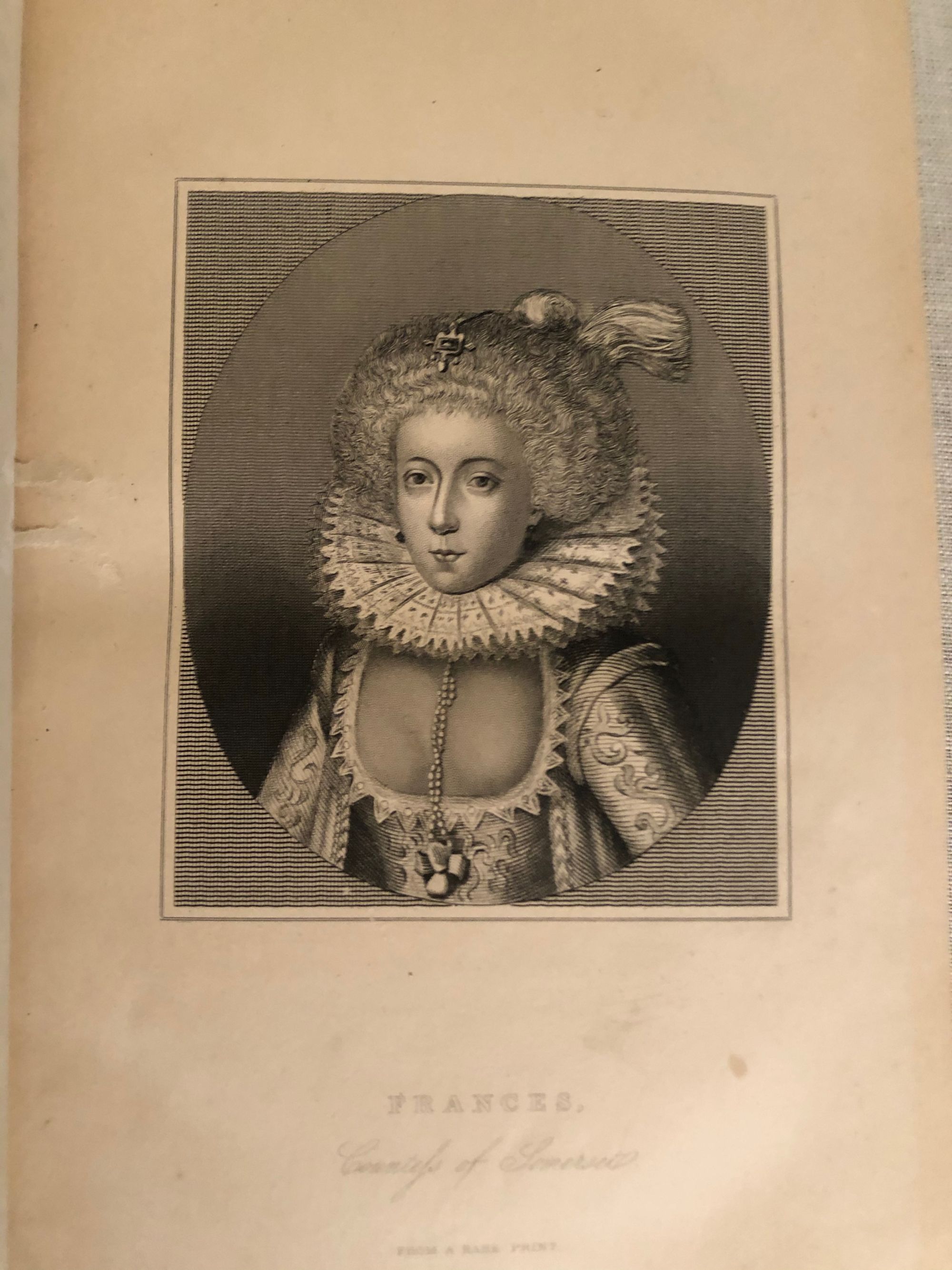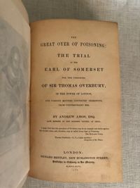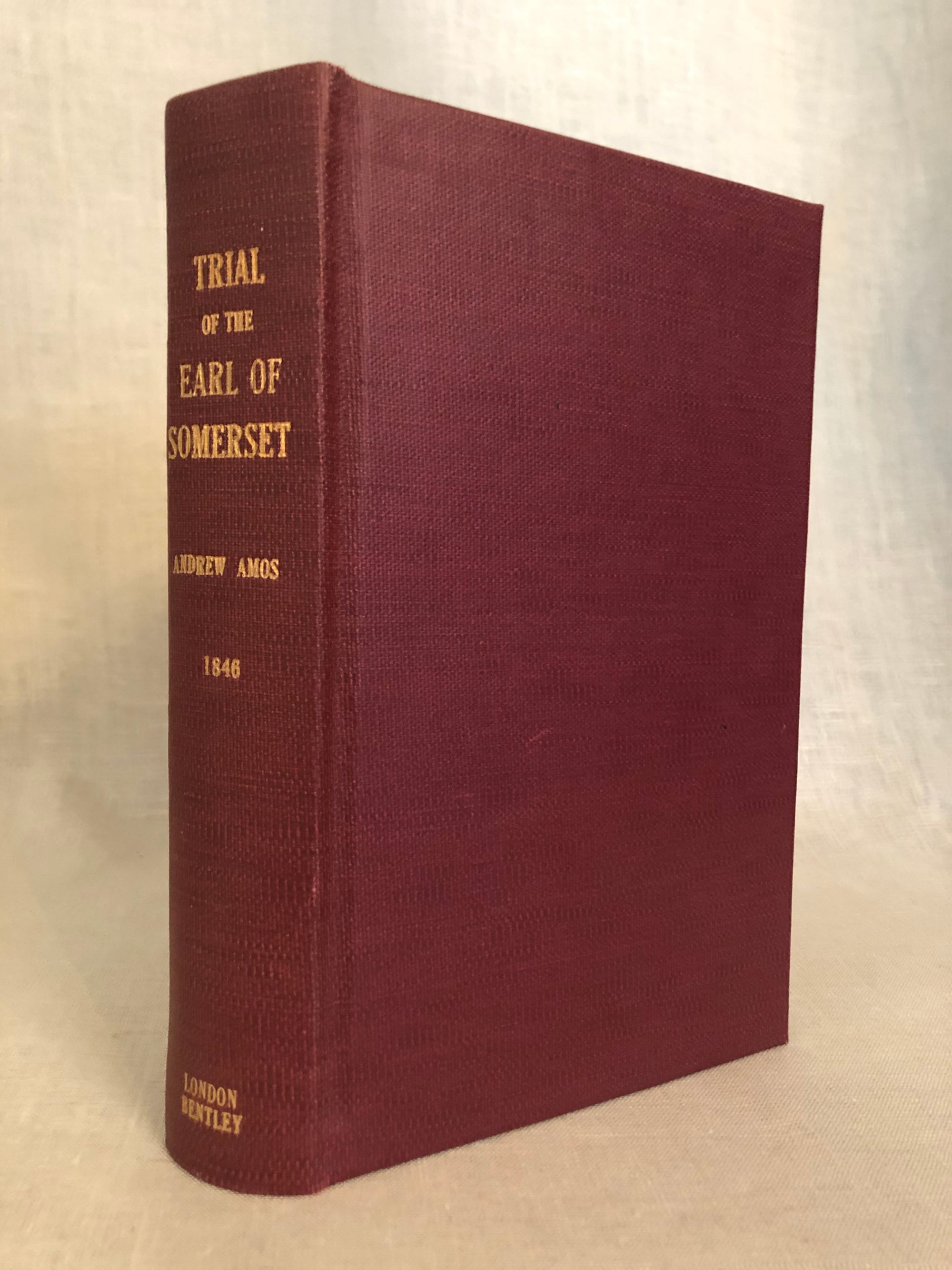 Richard Bentley, "Publisher in Ordinary to Her Majesty", London 1846. 551 pp. Hard cover, rebound in sturdy, modern red buckram with gilt title to spine. Includes tissue-guarded frontispiece of Sir Thomas Overbury, taken from "an Extra- Rare Print by R. Elstracke." A second plate is within, of Frances, Countess of Somerset. Condition: Very Good. Binding is sound and firm. Pages are toned but clean. Small chip missing from corner of title page. ** This sad and salacious document details the trial for murder and poisoning of Sir Thomas Overbury in 1613, at the hands of the conniving Lady Frances Somerset (née Howard), who was revealed to have smuggled arsenic-laced treats and a septic enema to her victim. The Howards had manipulated King James I (and VI of Scotland) into imprisoning Overbury, whose only crime was in protesting the marriage of Frances to his good friend, Somerset. Frances was revealed as the poisoner, and she and her husband had their death sentences commuted to a lifetime imprisonment in the Tower of London. It was a great scandal at the time, and several ancillary witnesses were convicted as accessories. The author, Andrew Amos, Esq. is described as a "late member of the Supreme Council of India, Recorder of Nottingham, Oxford and Banbury; Auditor and Fellow of Trinity College, Cambridge etc."