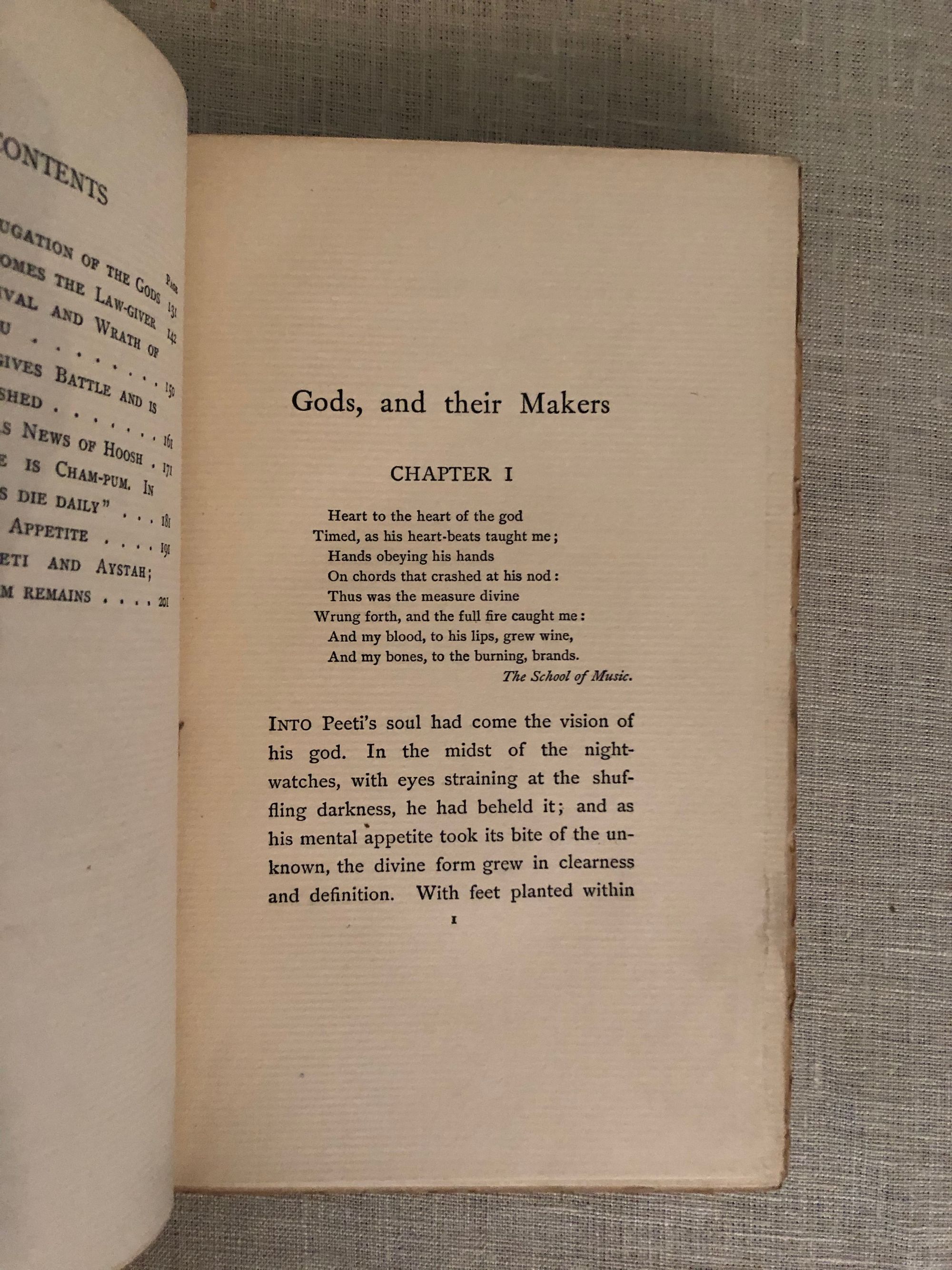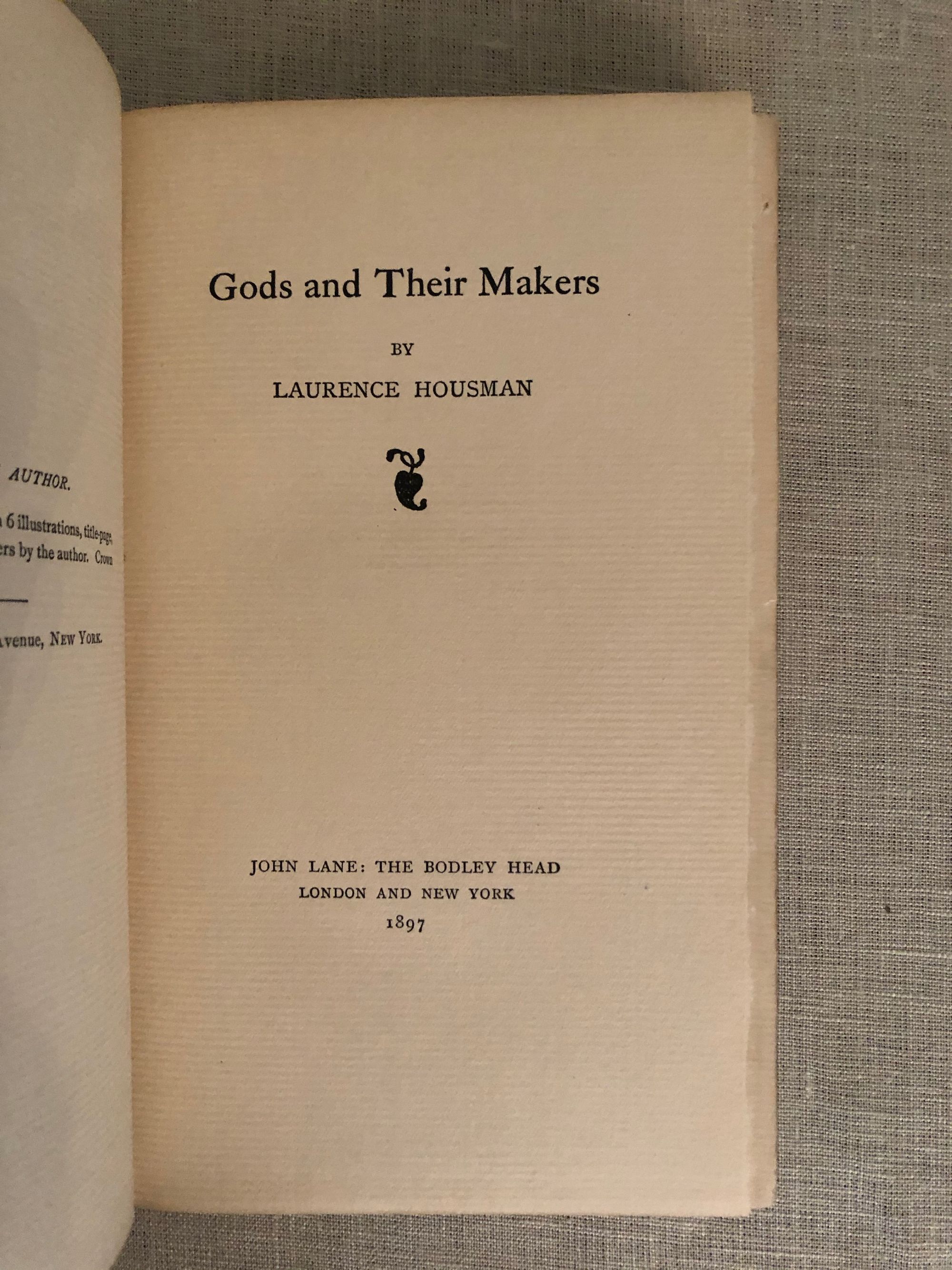 Hard cover, 8vo., in green cloth covered boards with gilt titles, top edge gilt, on laid paper, untrimmed, partially unopened, 213 plus 13 pp. advertisement for John Lane Bodley Head publishers entitled: "A List of Books in Belles Lettres." Printer: University Press, John Wilson and Son, Cambridge, U.S.A. With stamp inside rear cover, "Boston Bookbinding Co." Laurence Housman, (1865- 1959), prolific British author perhaps better known for his dramas and book illustrations, gives us a fantasy tale for adults. This was his first novel. Condition: Good: Spine darkened. Some loss at head and foot of spine. One bumped corner, edges of text browned. Interior is at least Very Good: bright, clean and firm. Hint of foxing to endpapers only. Name of former owner in old ink on ffep. A handsome item and scarce.