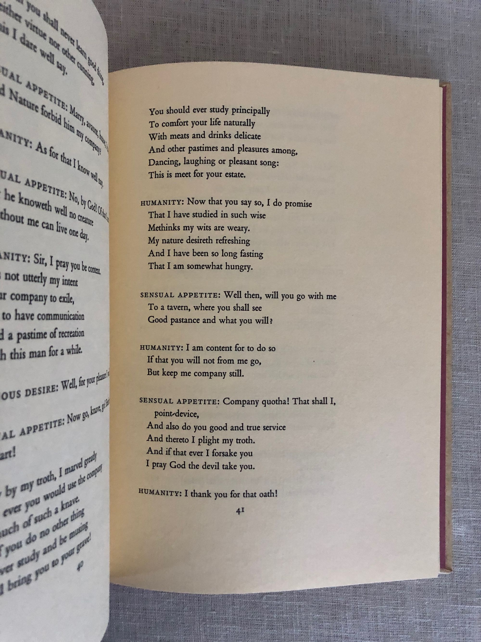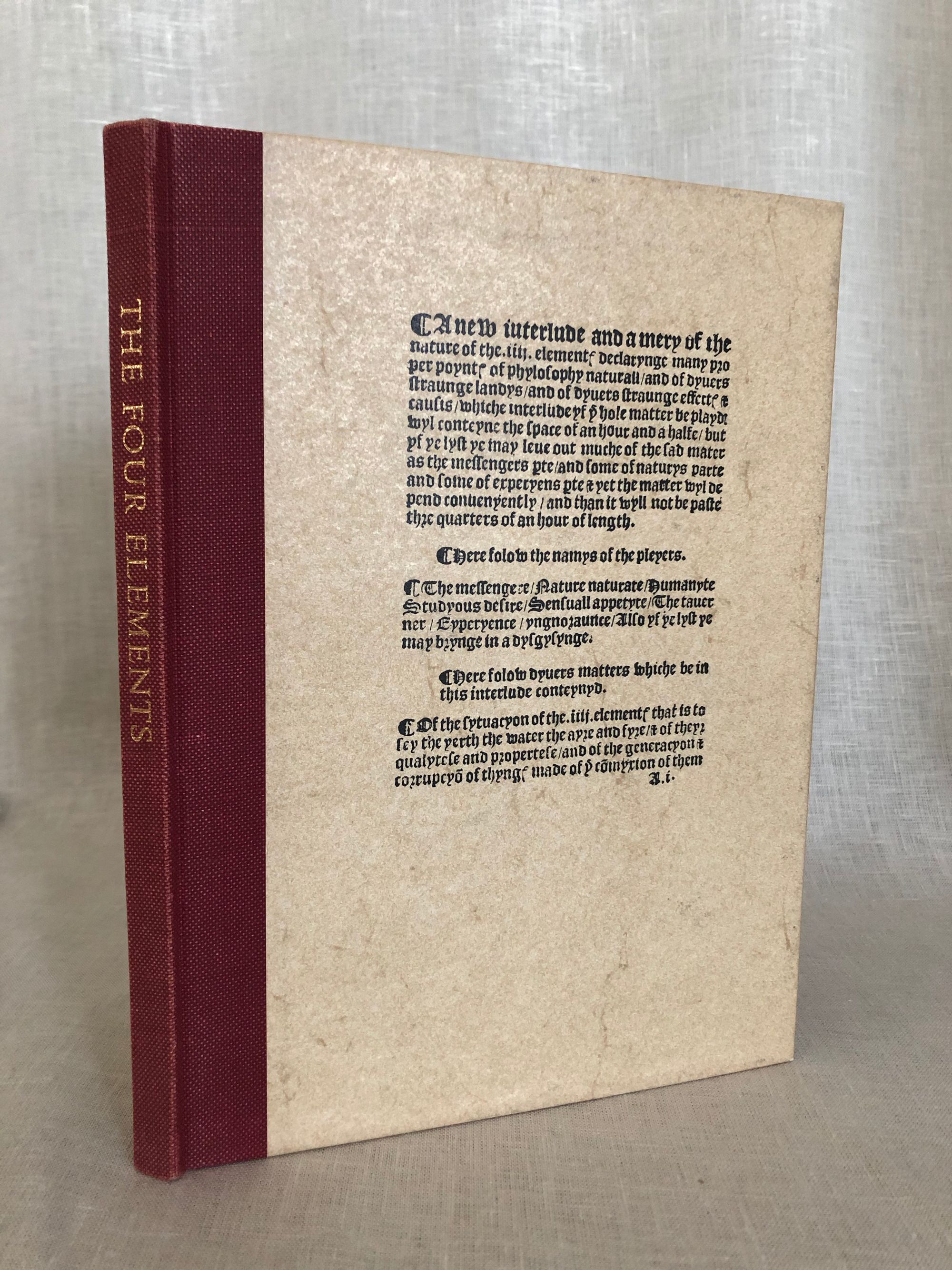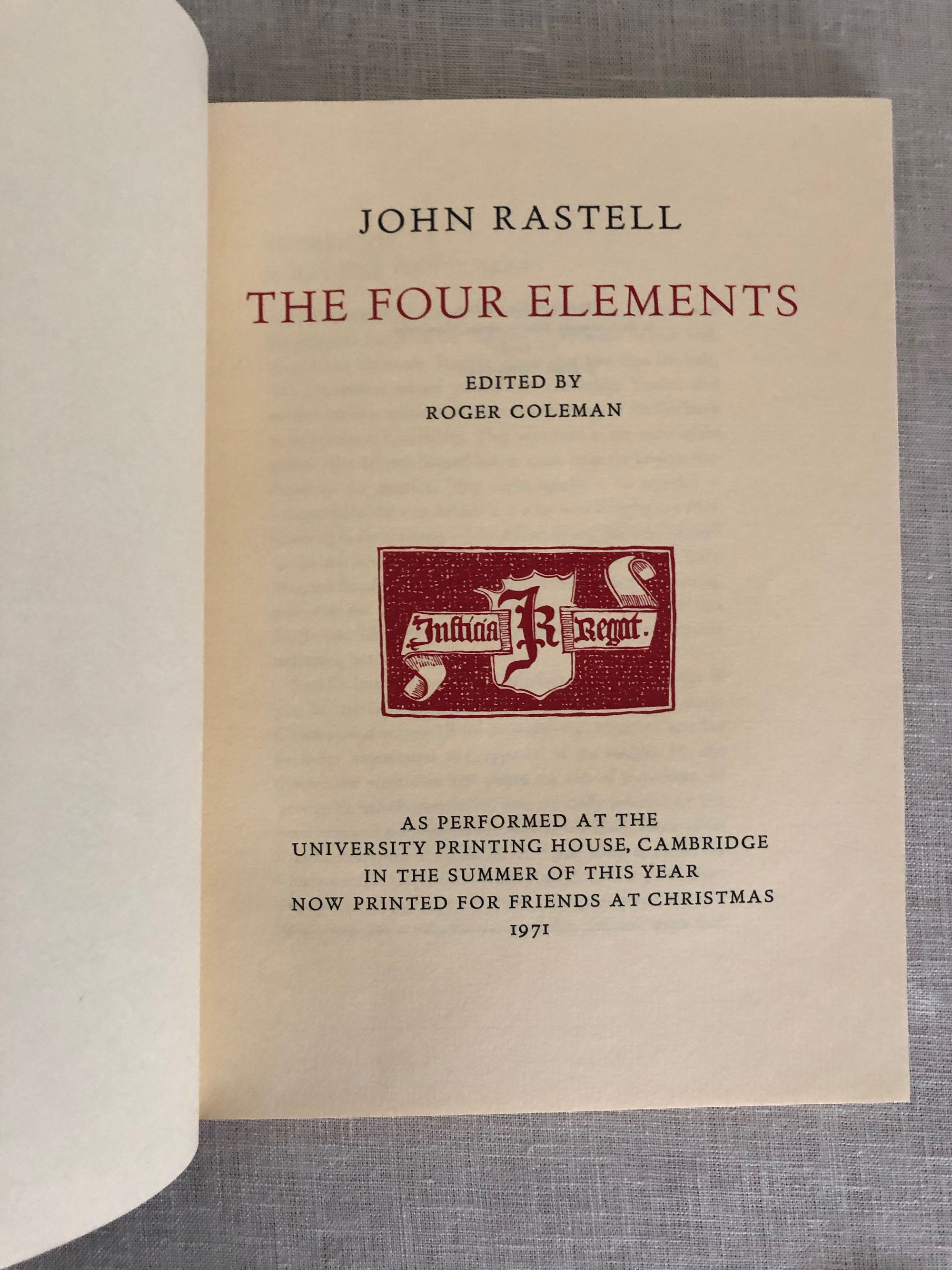 Hard cover, 8 vo., with red cloth spine with title in gilt, cream paper covered boards featuring a facsimile of the title page of the original text in black, 73 pp. The dramatic text is accompanied by several modern illustrations in red ink, as well as reproductions of original woodblock illustrations, and musical notations, in black. The title page is in black and red. The title performance was part of celebrations honoring the four hundred fiftieth anniversary of the first book printed at Cambridge. The Introduction by Brooke Crutchley includes a good biography of the Tudor polymath John Rastell, (1475-1536.) He trained as a barrister at Oxford and was a member of Middle Temple. He would devise pageants for King Henry VIII, married the sister of Sir Thomas More, and was ultimately denounced as a Protestant. He thus would lose his burgeoning printing business, begun around 1512, (specializing in a new method of printing music,) as well as his own works concerning the law. The original Tudor drama was written around 1519. Condition: Fine.