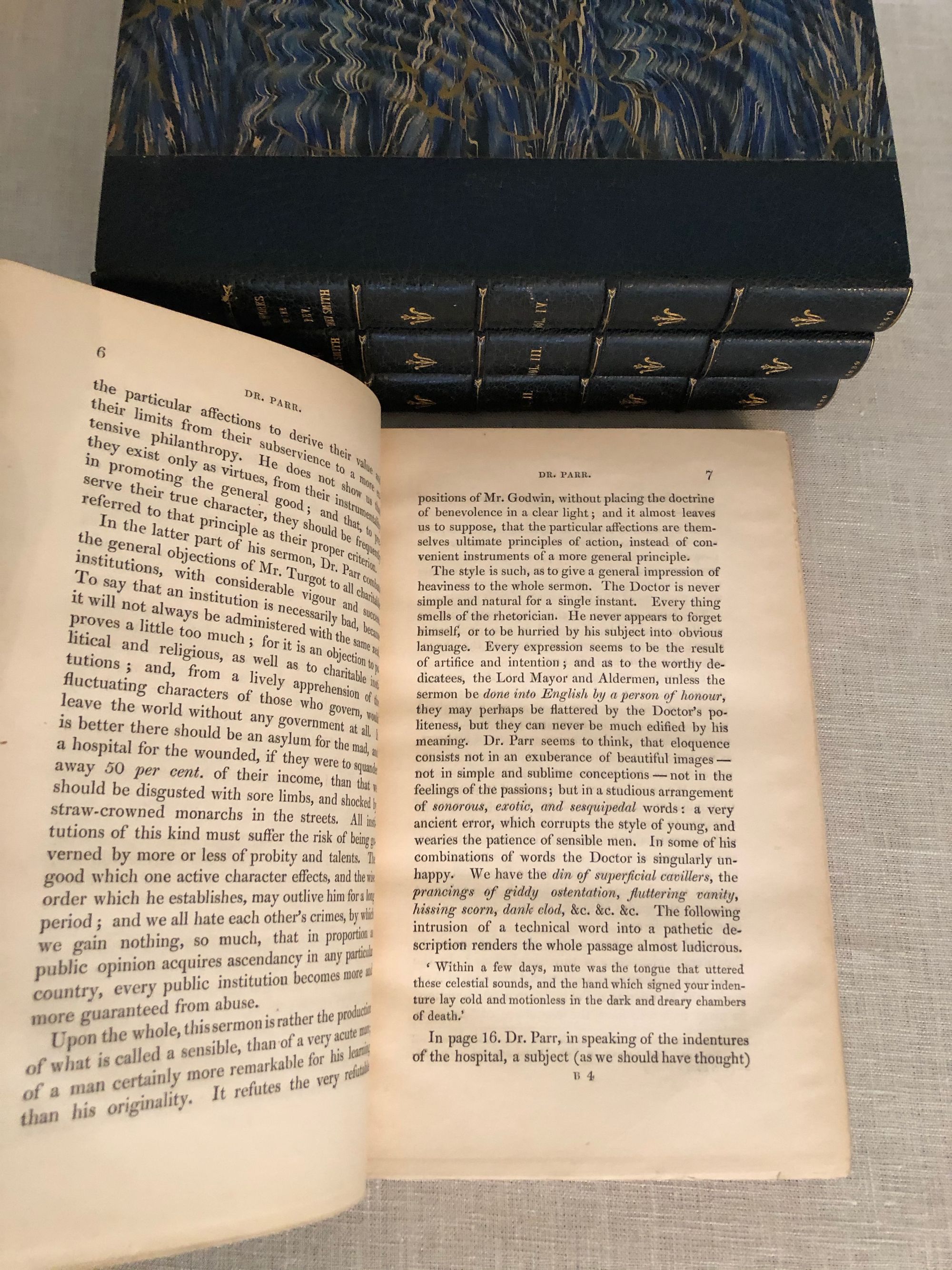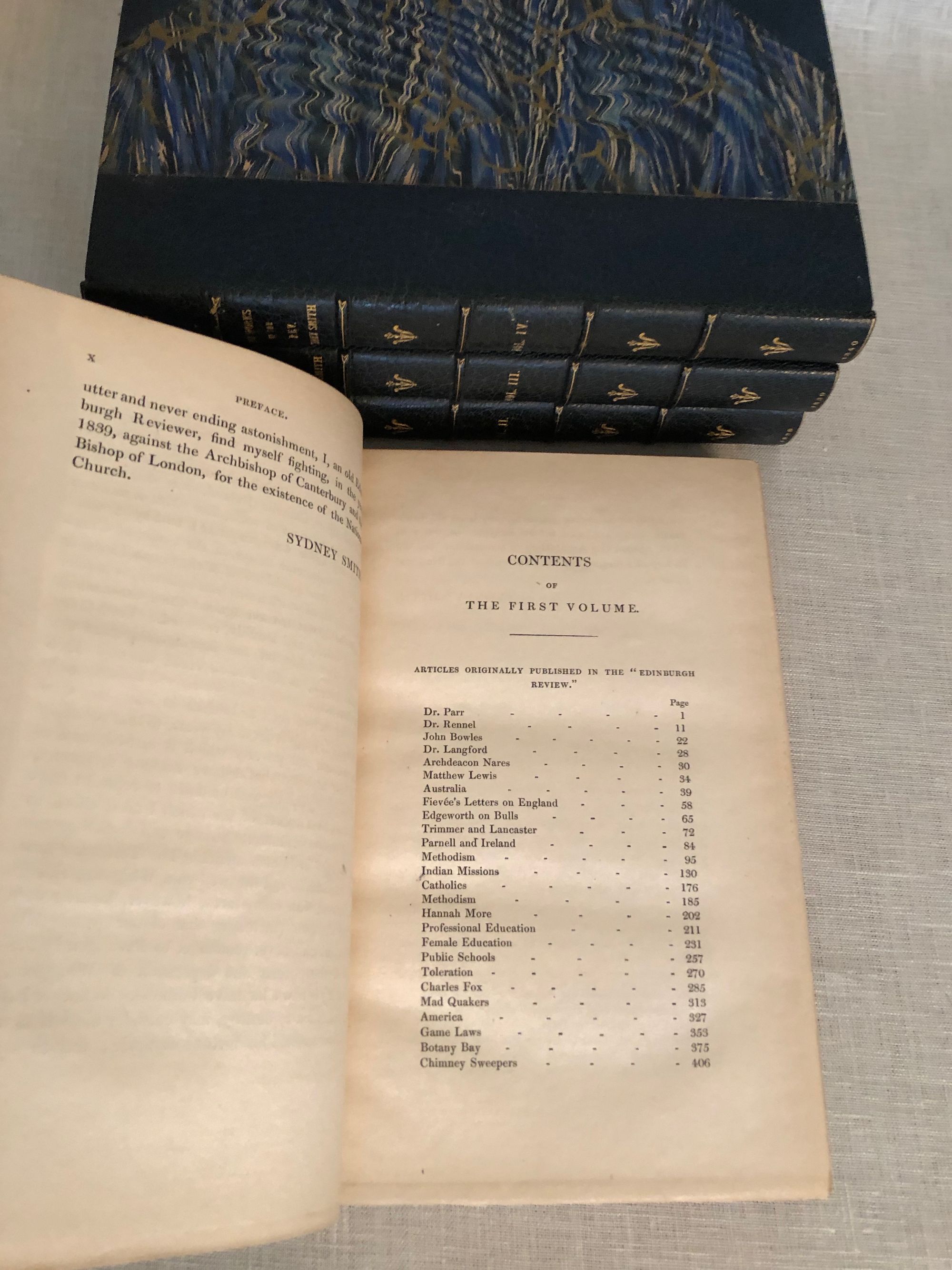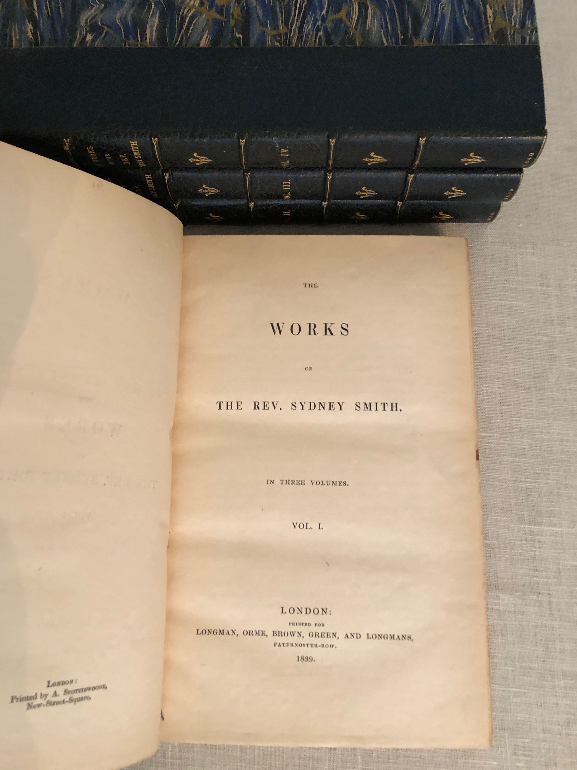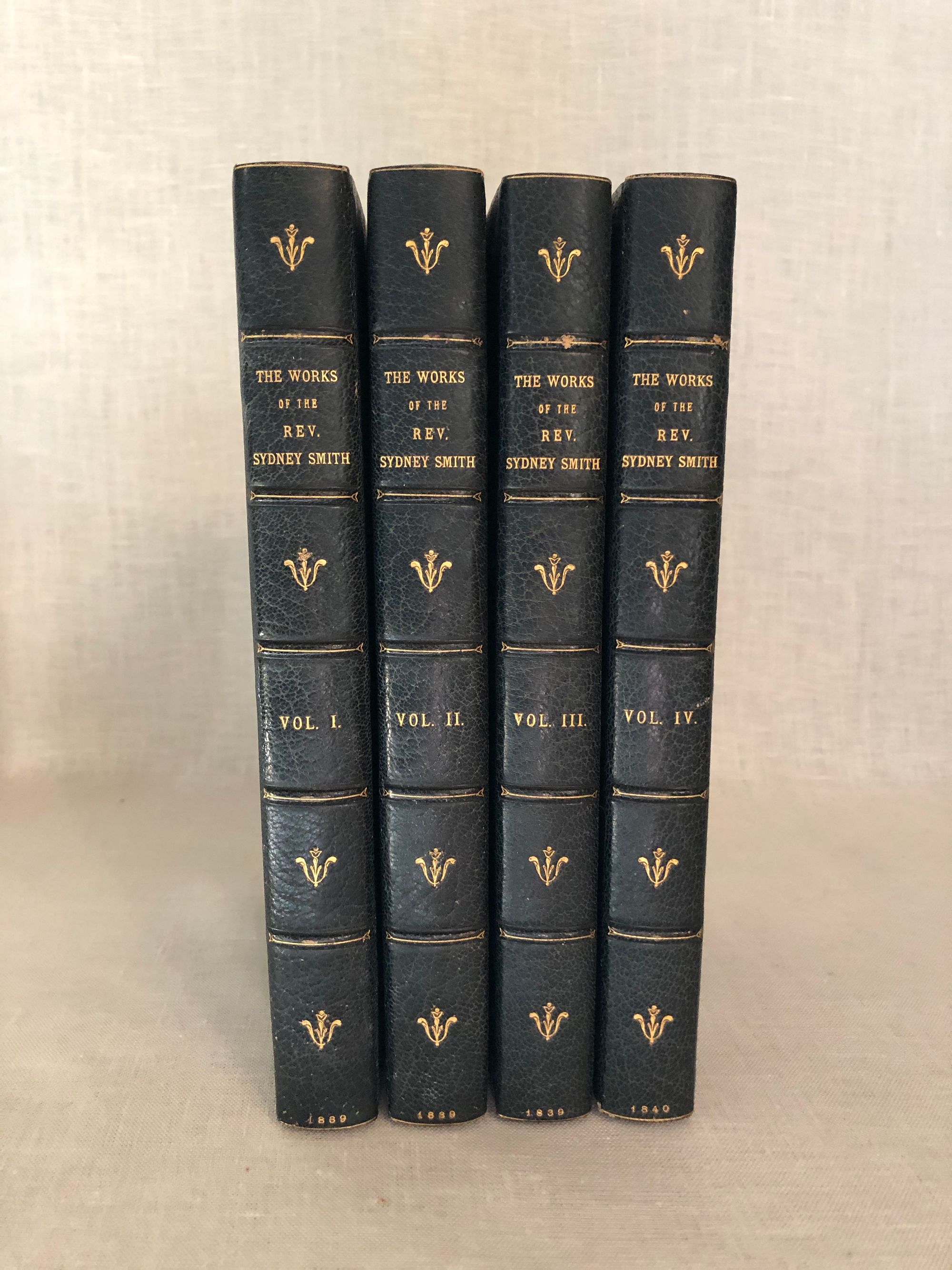 Hard cover, 8vo, in four volumes, finely bound in three-quarters blue morocco over marbled paper covered boards, the spine with five raised bands with titles and and gilt decoration, bound by British bookbinder R.W. Smith with his stamp to the endpapers. Various pp. The first three volumes were published as a set in 1839, with the fourth added to the series in 1840. *** Sydney Smith (1771-1845) cleric, orator and writer, and a co-founder of the influential magazine of the Scottish Enlightenment, the "Edinburgh Review" (1755-1756). This publication included a review by Adam Smith on Rousseau's "Discourse on Inequality", in which private property is shown to be the original source and basis of all inequality. Sydney Smith was a regular visitor at the famous salons held at Holland House in London, where Lord & Lady Holland hosted political and literary gatherings, and whose attendees included the Scottish novelist Sir Walter Scott, and the Irish playwright, Richard Sheridan. Some quotations from Smith: "All lives lived out of London are mistakes", "No furniture is so charming as books.", and "Poverty is no disgrace to a man, but it is confoundedly inconvenient." *** Bookbinder R.W.Smith was one of the first employees of the Club Bindery (1898-1909), which had been established by members of New York's Grolier Club to bring the art of European fine bookbinding to America. Condition: About Very Good or better, with very light shelf wear and a couple of tiny chips to the spines. Watson 1304. Note: Heavy set, extra postage may be required if sent abroad. (6 lbs.)