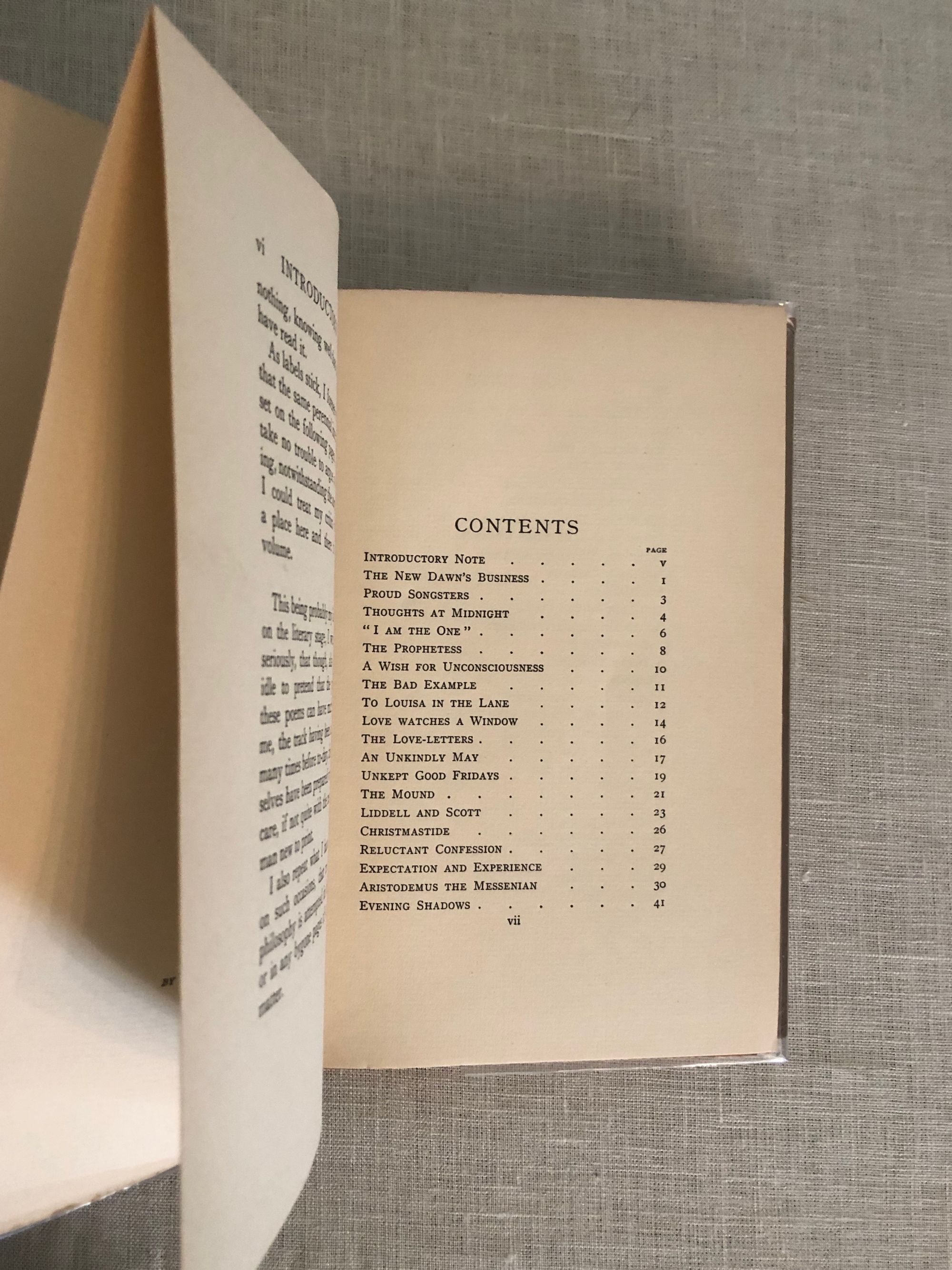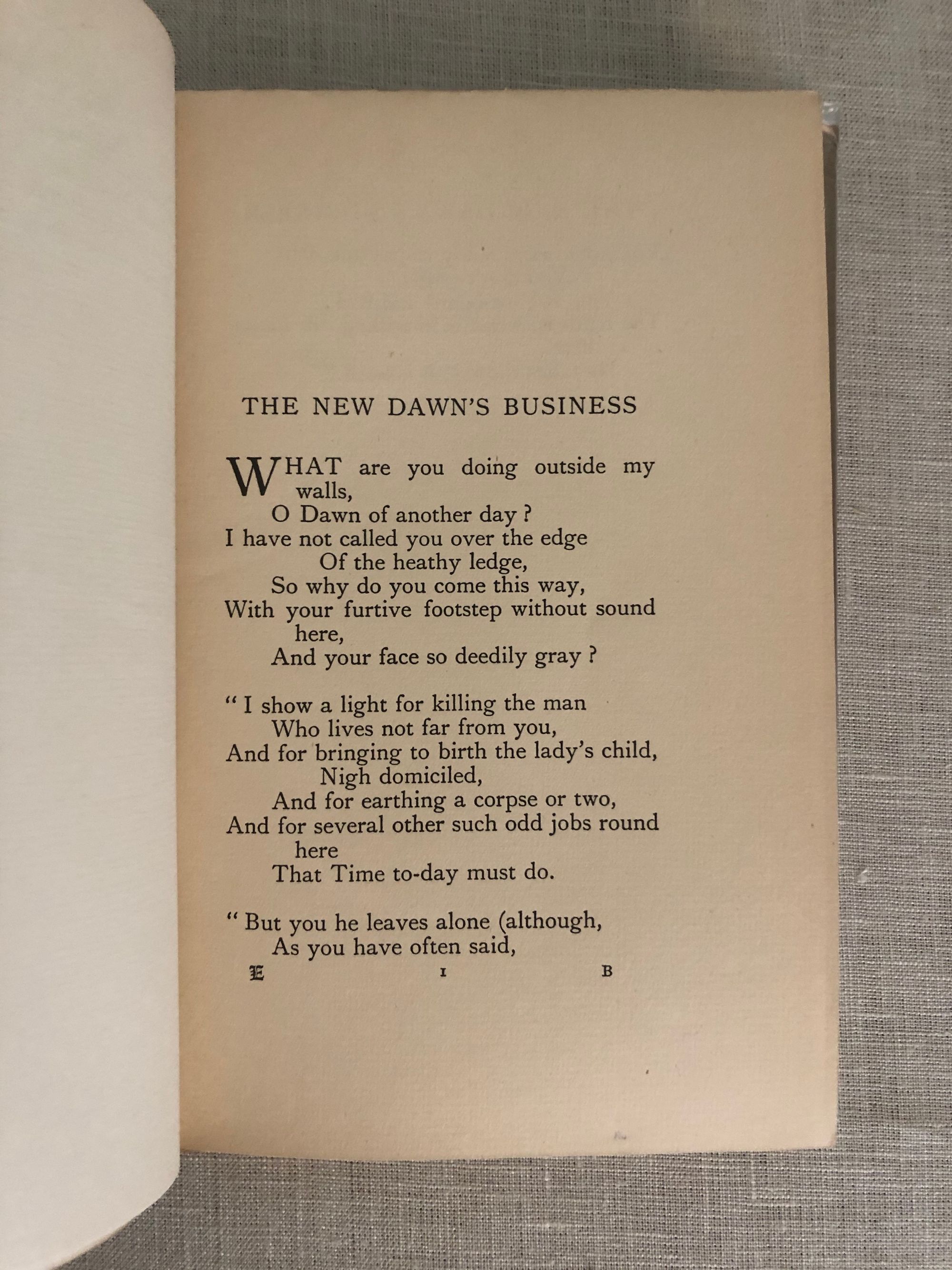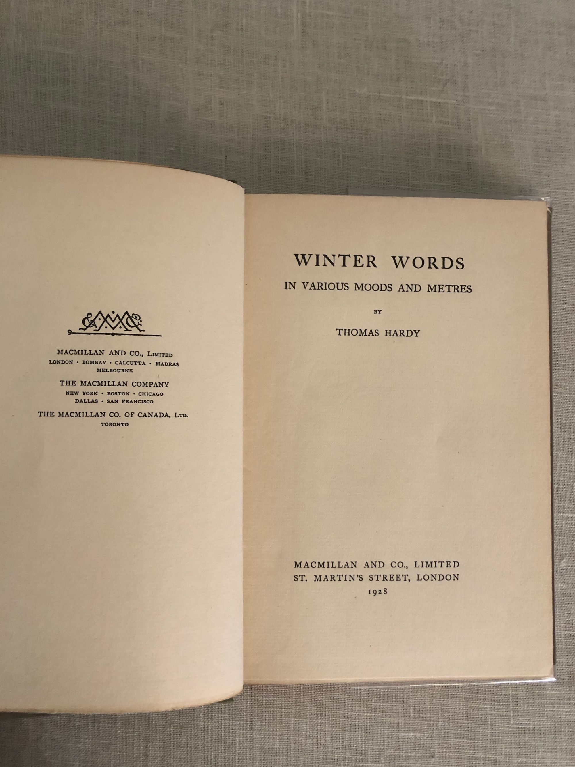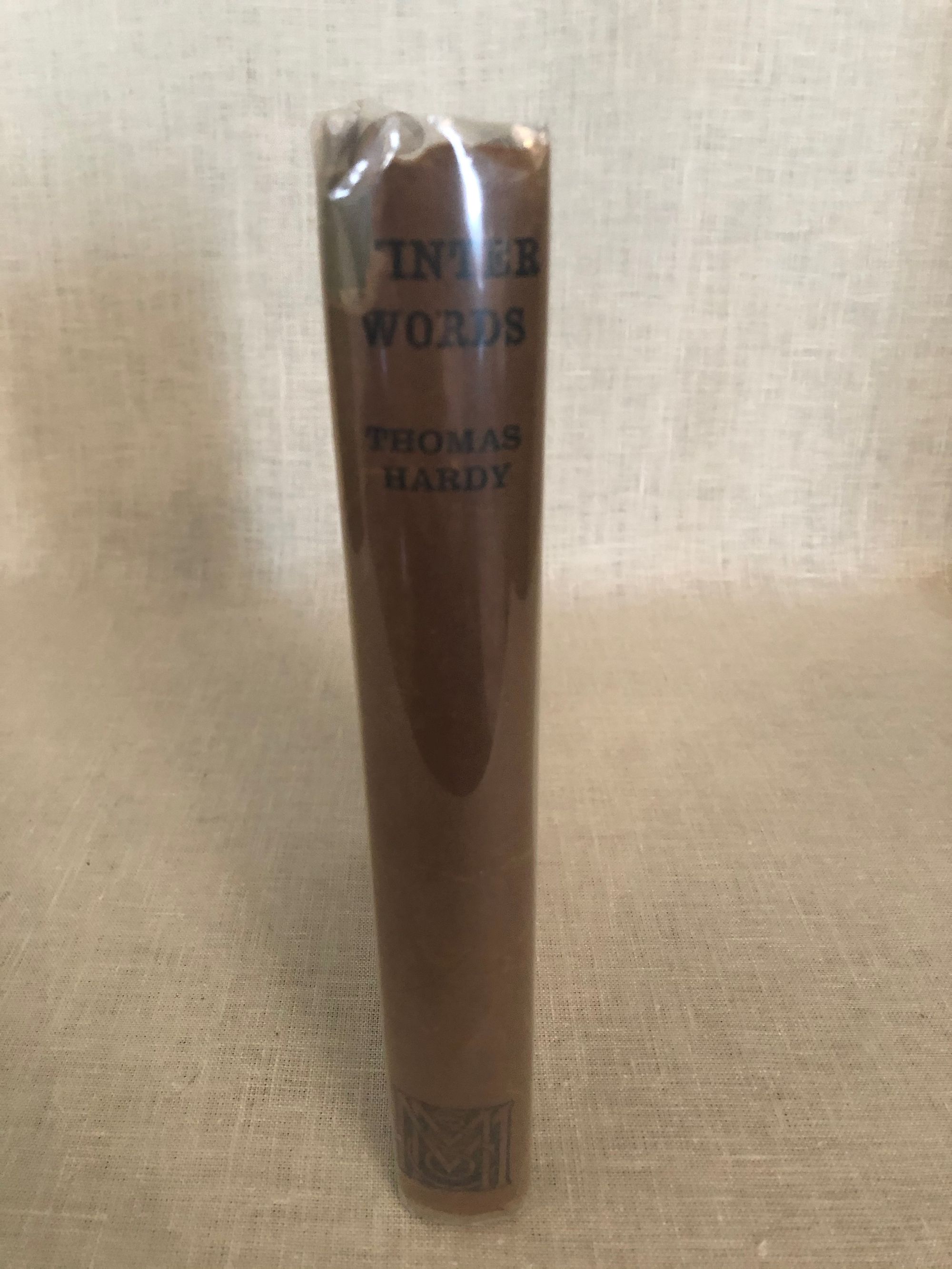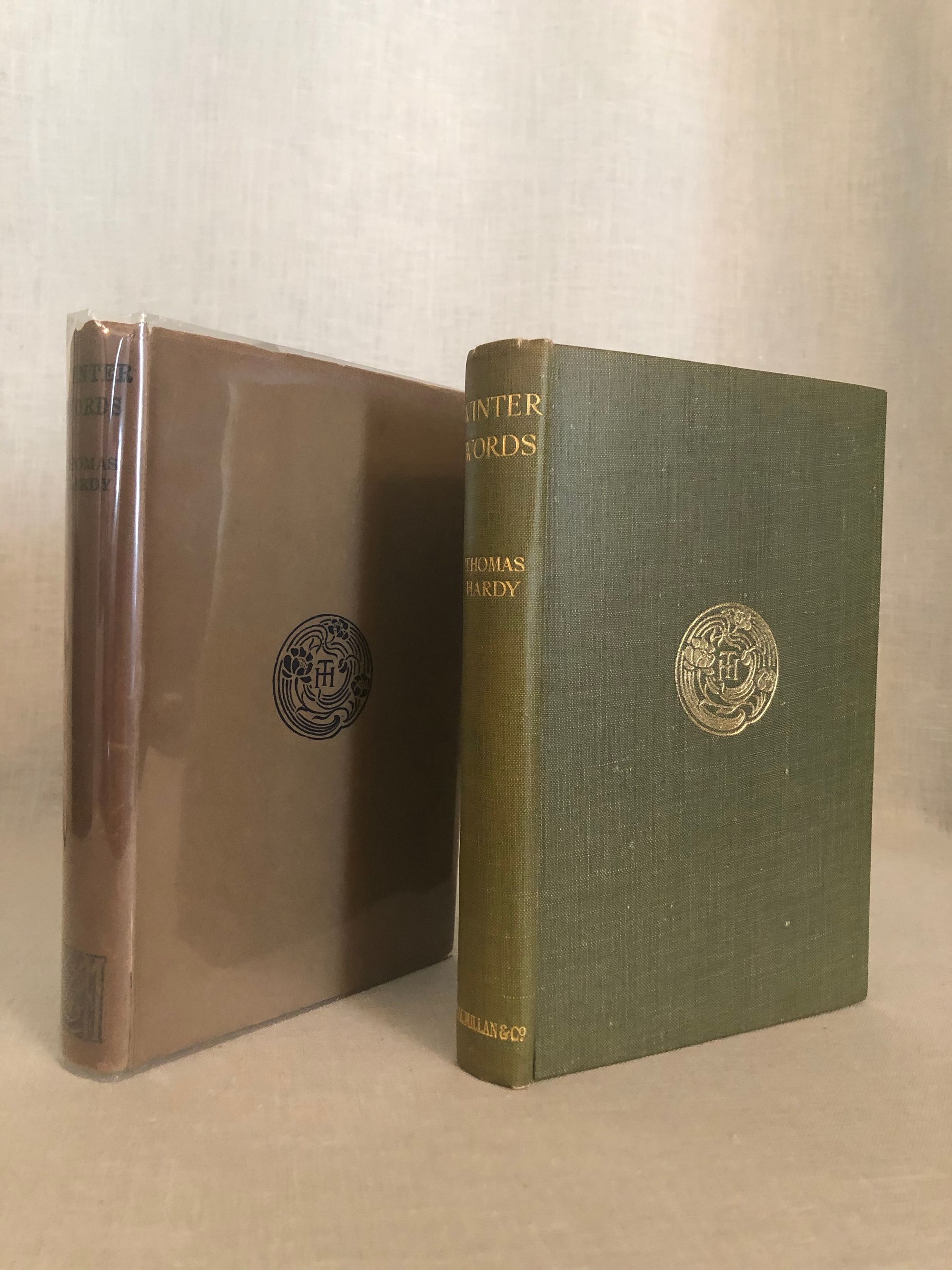 Hard cover, 8 vo., in publisher's green cloth with gilt "TH "monogram design to center front, and titles in gilt to spine, with unclipped dust jacket in tan with black print, 202 pp. In mylar protector. Printed R. & R. Clark, Edinburgh. CONDITION: Very Good : Ffep has ghost from the original application of binding glue near the gutter. Very slight wear to head, tail of spine. Interior is clean, tight and gently age toned. Many pages unopened. D/J: Good, with sunning to spine, a loss at head of spine, split at front joint, and some damage to rear at top. This was the valedictory volume of poetry written by English poet Hardy, who died the same year.