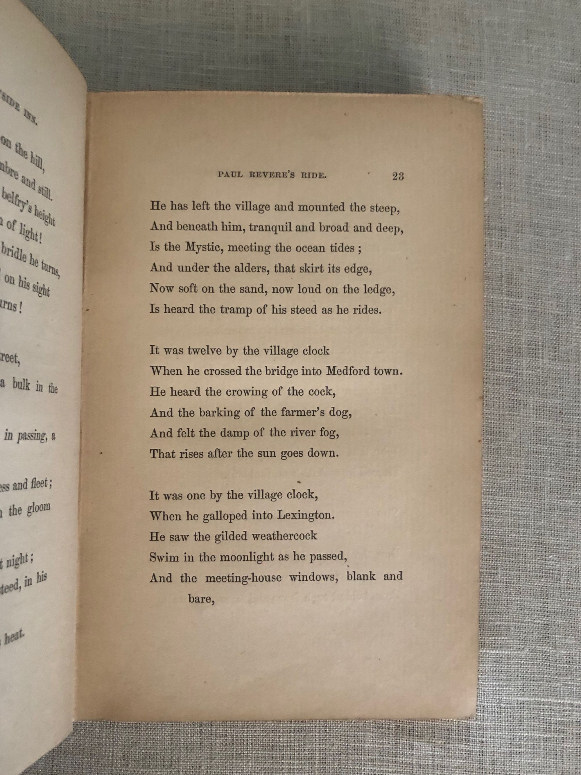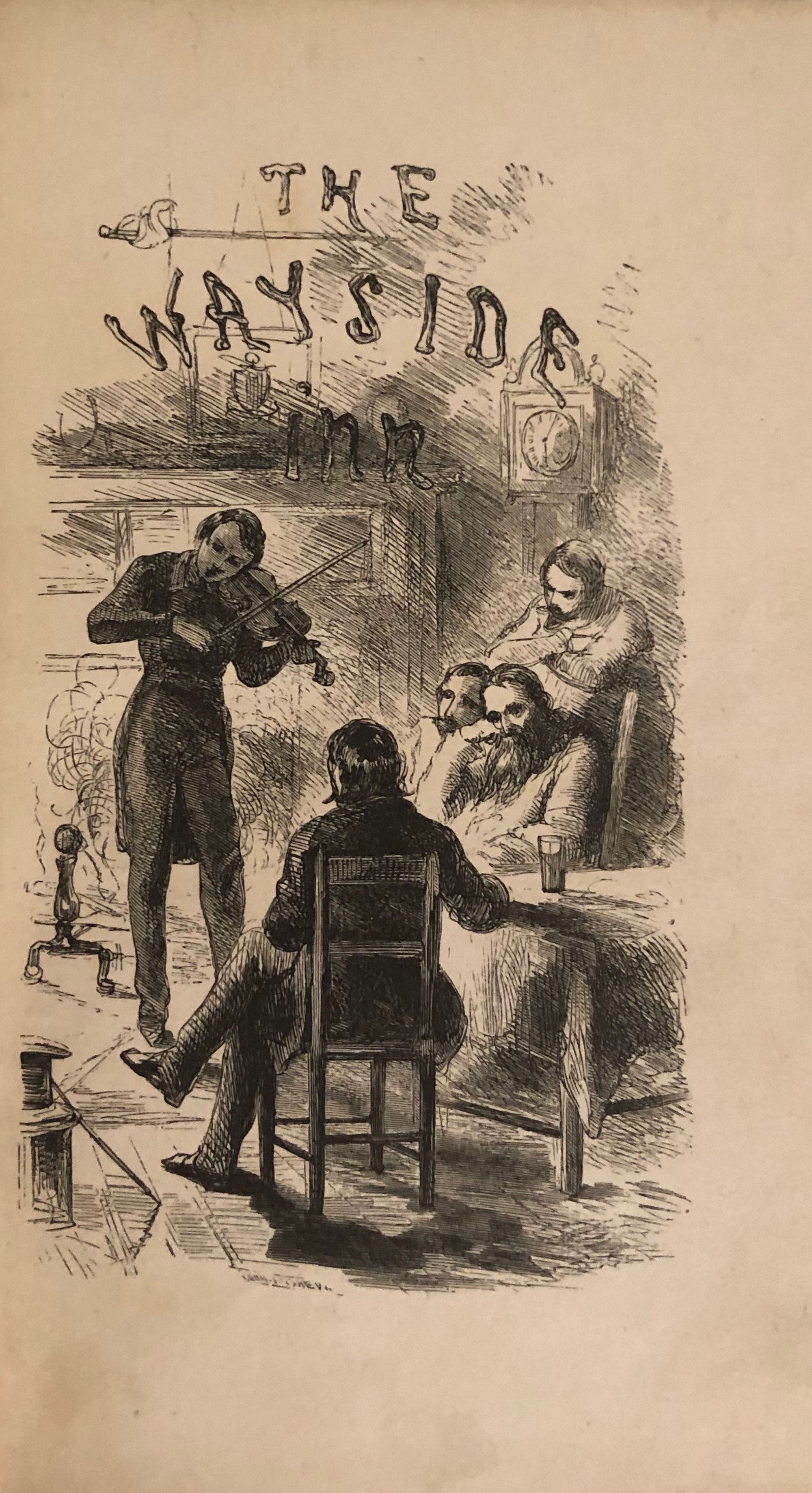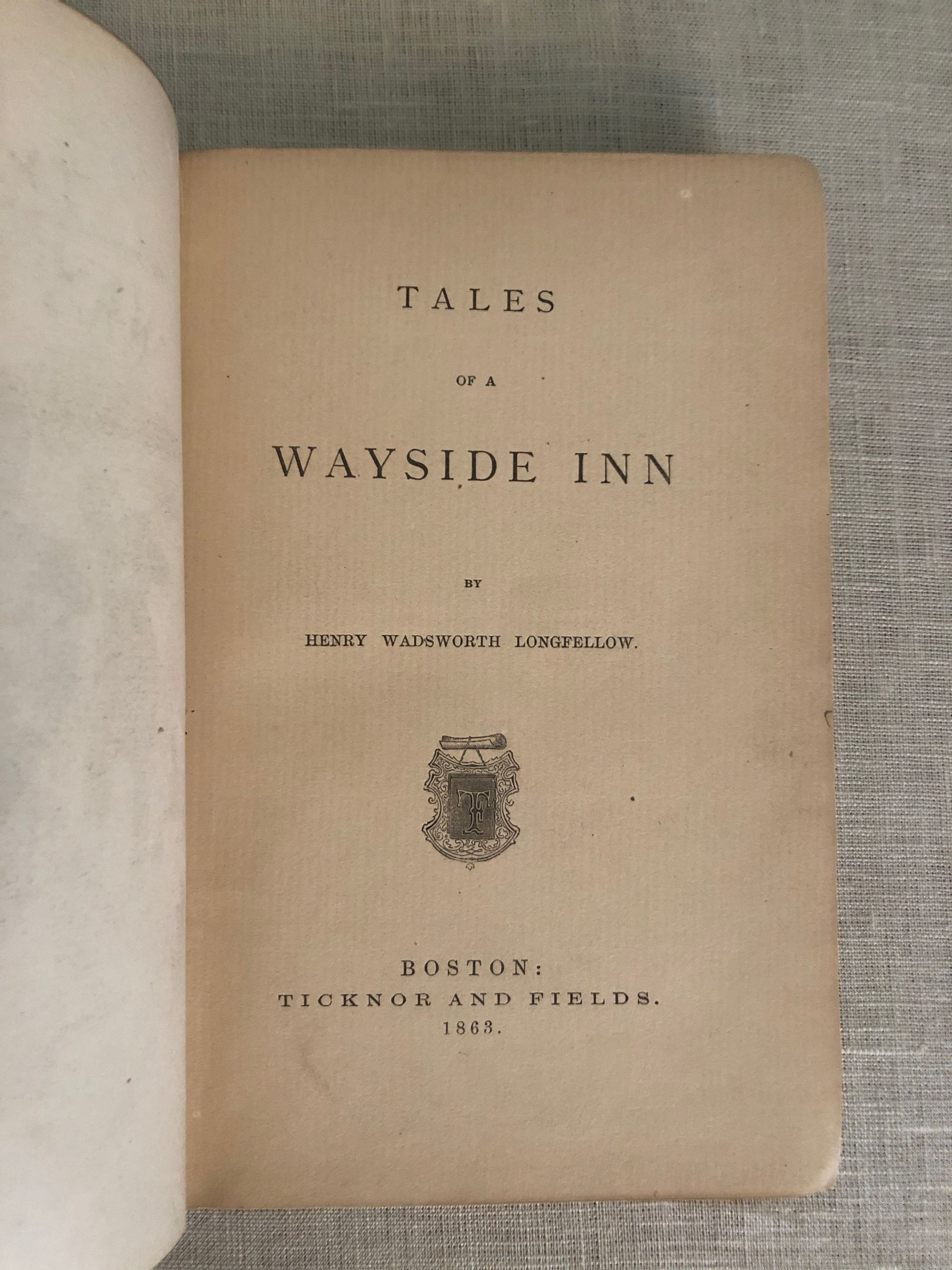 [First American edition, presumably not first state.] Hard cover, 16 mo., in the original brown pebbled cloth with blind stamped border with a small rosette to each corner, title in gilt to spine (very faded,) coated brown endpapers, lacking front fly, with vignette title page, top edge gilt, 225 pp. plus 22 pp publisher's catalogue (dated Nov. 1863, the later variant "B") CONDITION: Good Plus. Losses to cloth at head and tail of spine, and a couple of very small rends at the joint. Wear-through at corners. Exterior is otherwise clean and unmarked. There is an ink inscription in old hand to ffep. as well as bookseller's pencil note, otherwise clean within. The work is set forth as a series of poems narrated by characters taken from among the poet's friends, and set in the eponymous Wayside Inn of Sudbury, Massachusetts, called" a favorite resort for parties from Harvard College." Poems include "Paul Revere's Ride and The Saga of King Olaf." BAL 12136