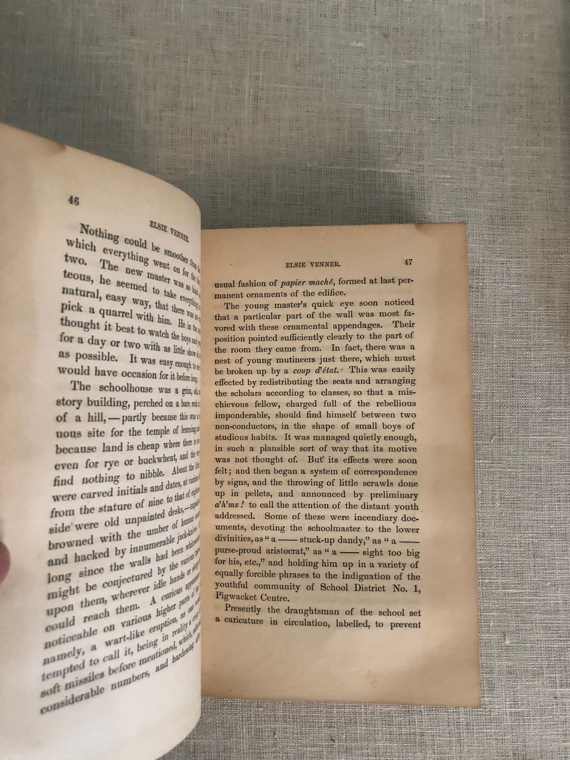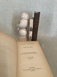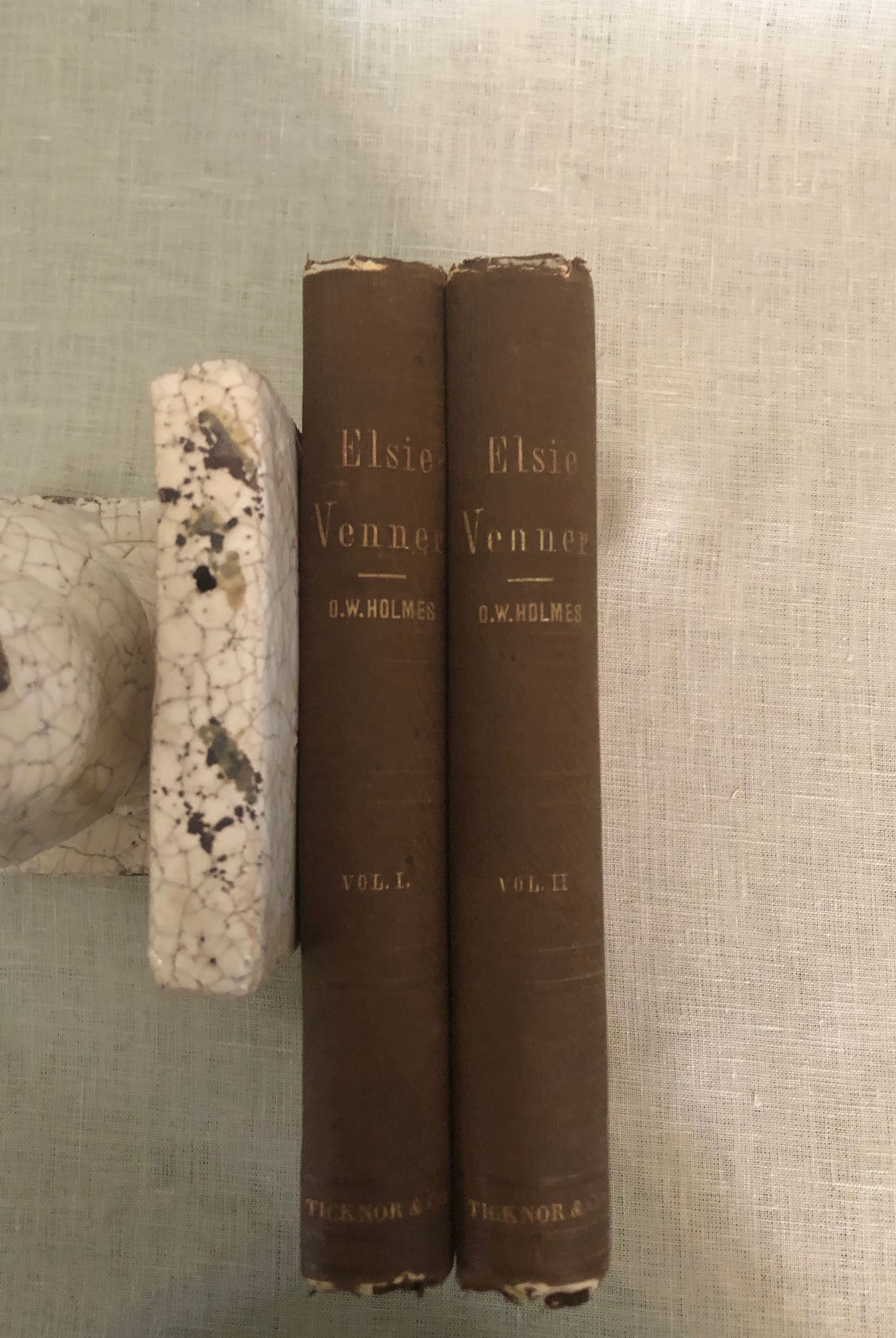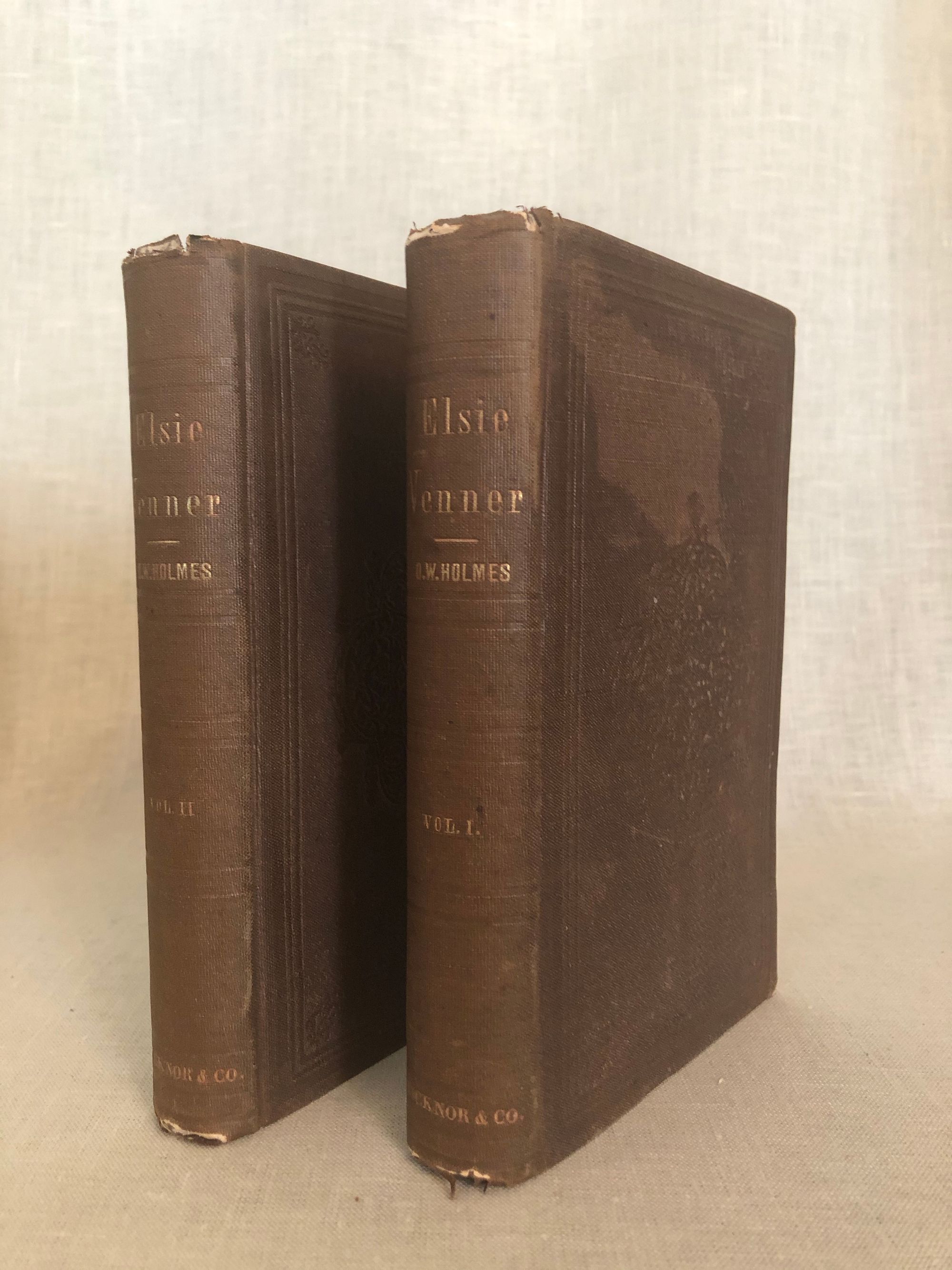 Hard cover, 12 vo., (measuring 4 3/4 x 7 3/8 inches) in brown "T" publisher's cloth with several blindstamped banded borders, corner fleurons and a large central filigree design. Title in gilt to spine. 288 pp and 312 pp. Per Blanck: <ii> has Currents "Nearly Ready," suggesting first or second state. However, p. 13 "richer" and p. 23 "all" and "it's" suggest fourth state. So, likely an amalgamation of the two. This was Oliver Wendell Holmes Sr.'s first novel, republished from earlier serialization in The Atlantic Monthly. This was one of Holme's "medicated" novels, wherein the Harvard-trained medical doctor and author diagnosed a "medical aberration" in his main character. In this case, a snakebite to the mother whilst pregnant, causing the onset of weird, snake-like tendencies in a young woman. An interesting moral tale, involving marriage, inheritance and the concept of original sin. The origin of the phrase "Boston Brahmin" stems from the first chapter of this work. Condition: Good Plus. Stain to front board of Vol. 1. Some water staining affects preliminaries (not Title page) and other external edges of some text and endpapers in Vol. 1 only. Shelf wear to head and tail of both spines, with small losses. Owner's signature in old hand (pencil) dated May 1861 in both volumes. Lacking Publisher's catalogue. BAL 8801, p. 252. Bleilor p. 102.