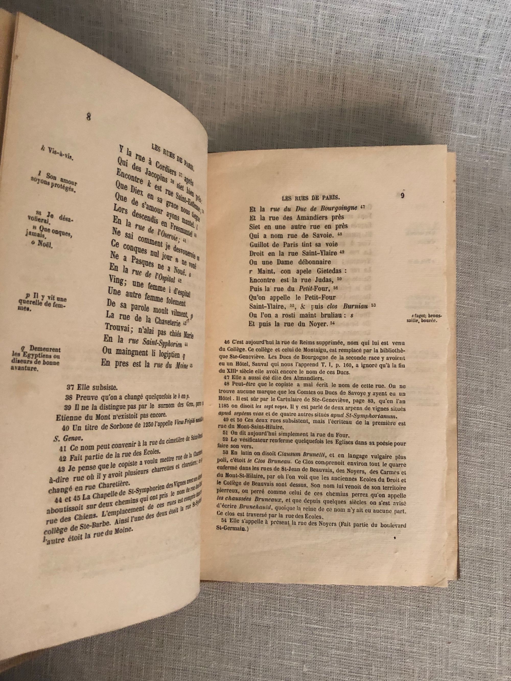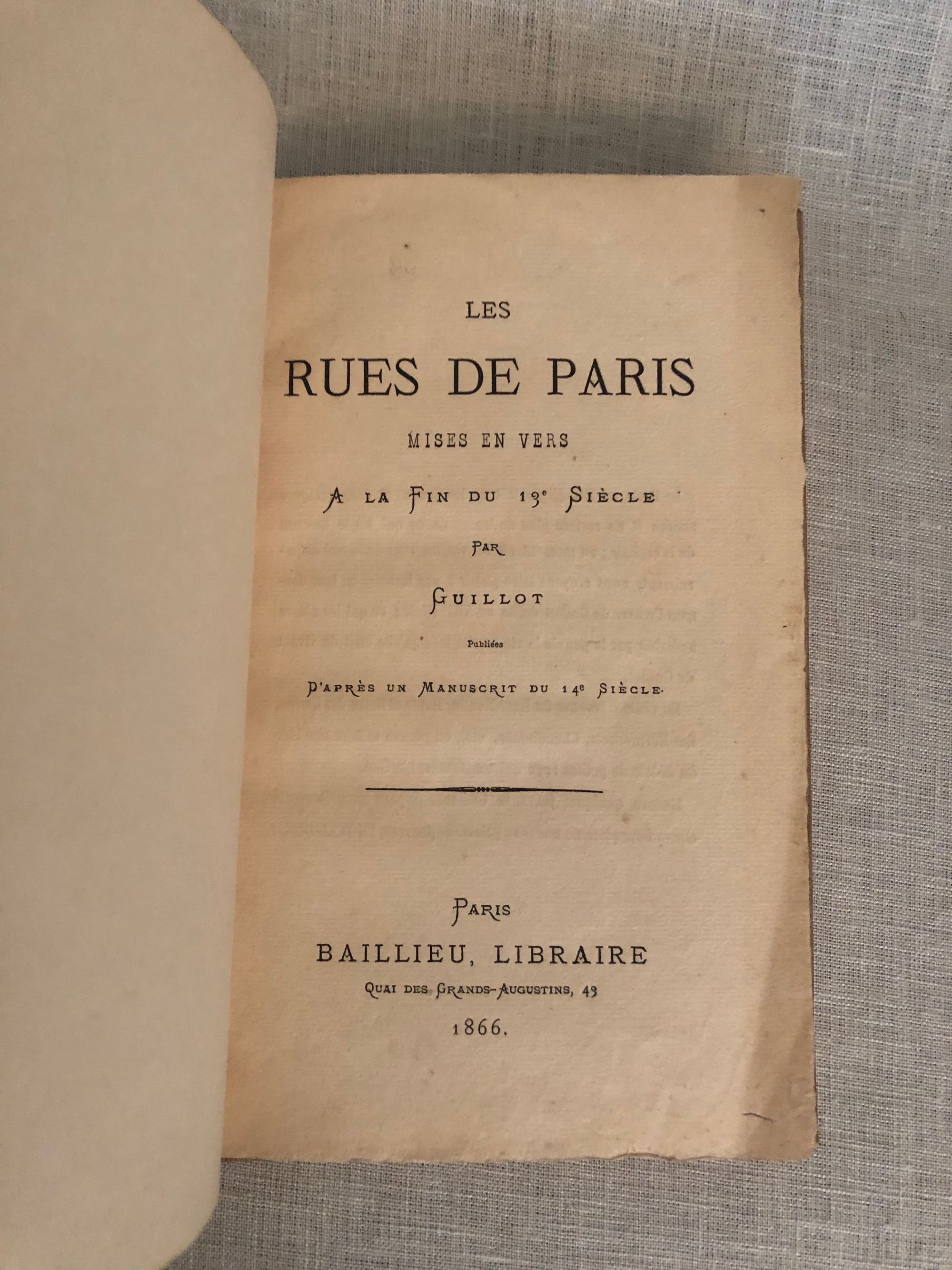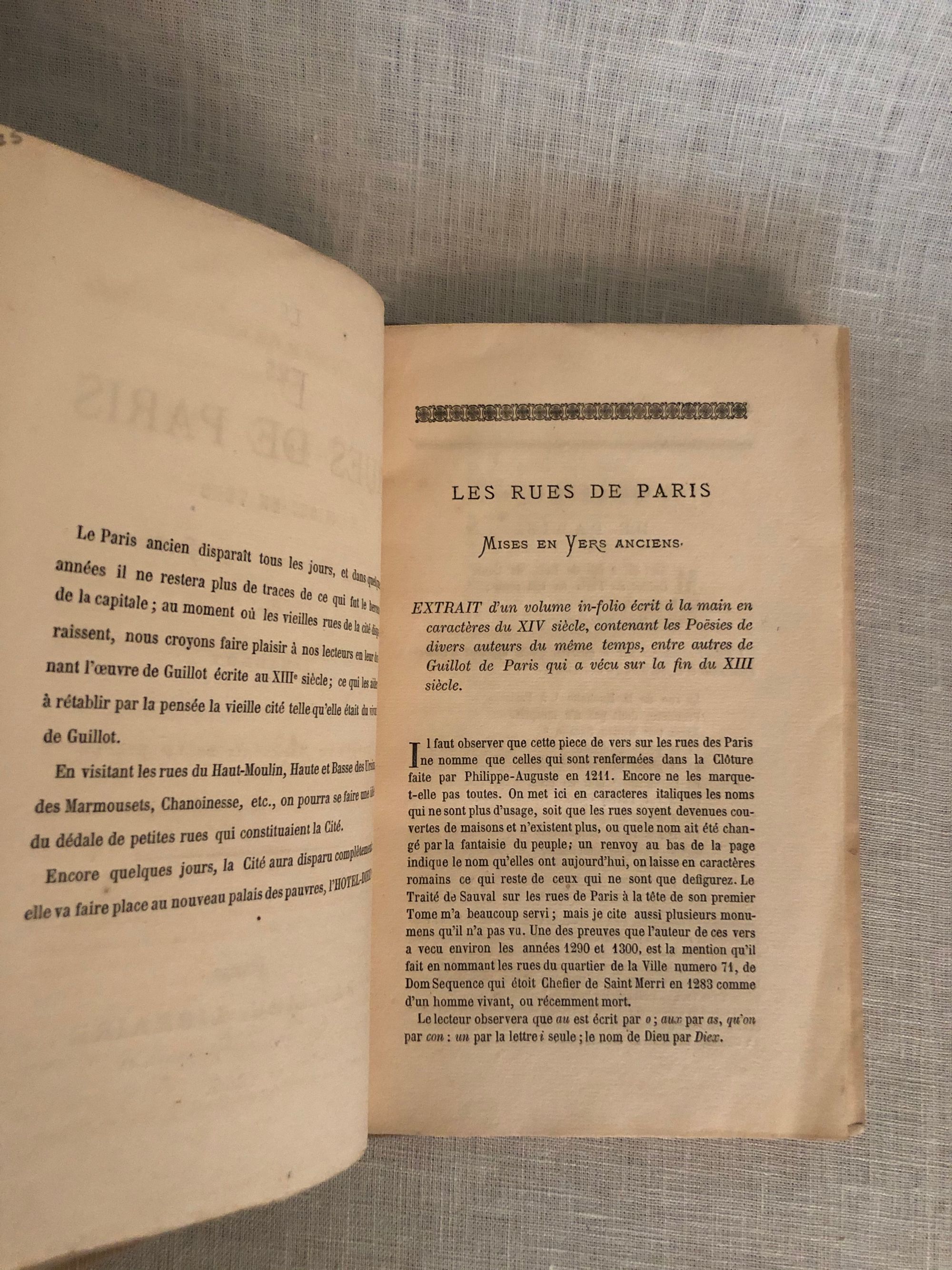 Hard cover, 8vo, in modern buckram binding. Scarce edition of the poem by the late 13th century French poet, Guillot, depicting the street life of Paris in the late 13th or early 14th centuries. Describes the various activities of the time: armourers, goldsmiths, tailors and grocers etc. With extensive (printed) notes in French. CONDITION: Very Good. Covers lightly marked. Spine label (original?) chipped. Some pages uncut. One dog-ear crease present from printing.