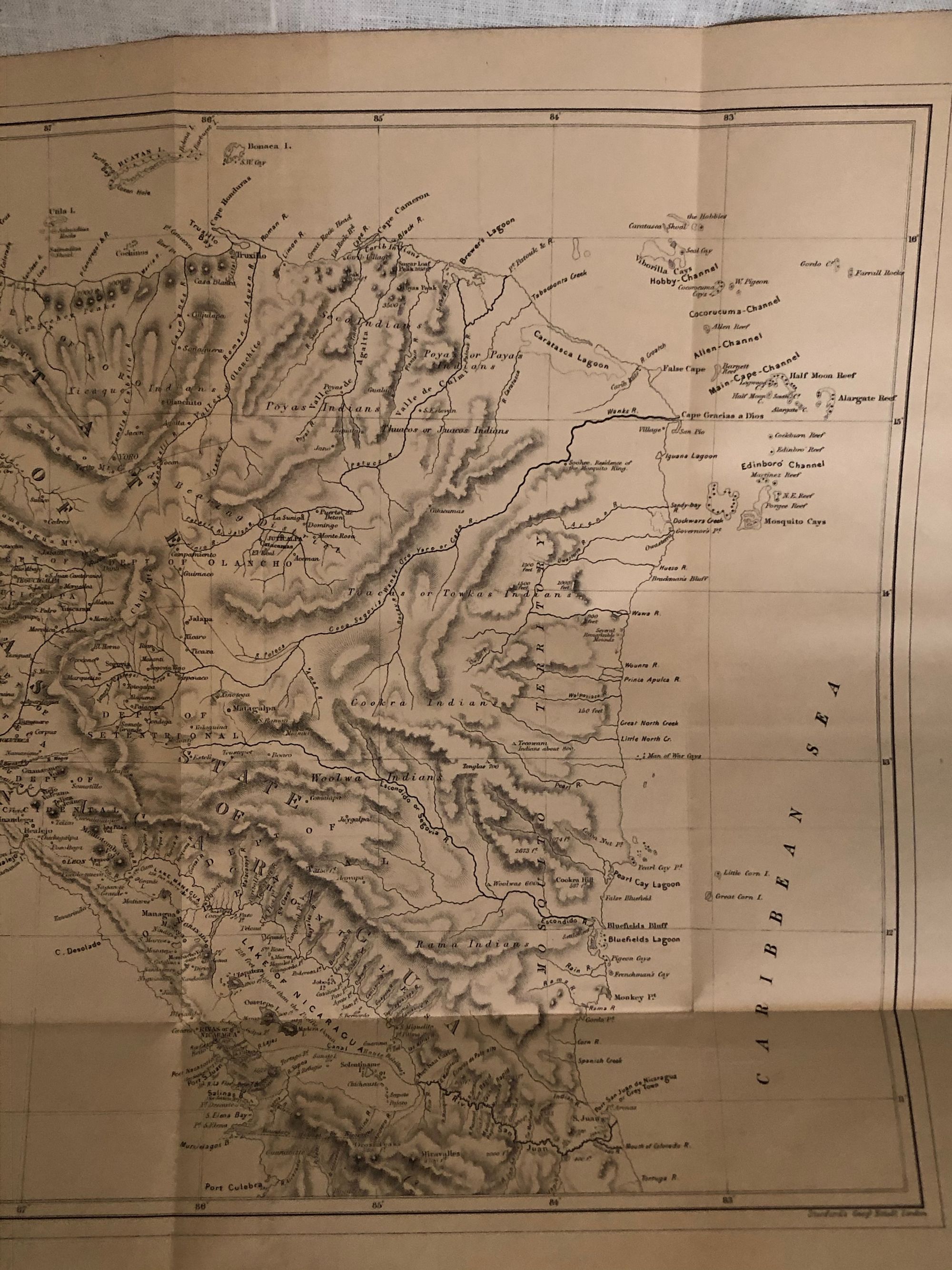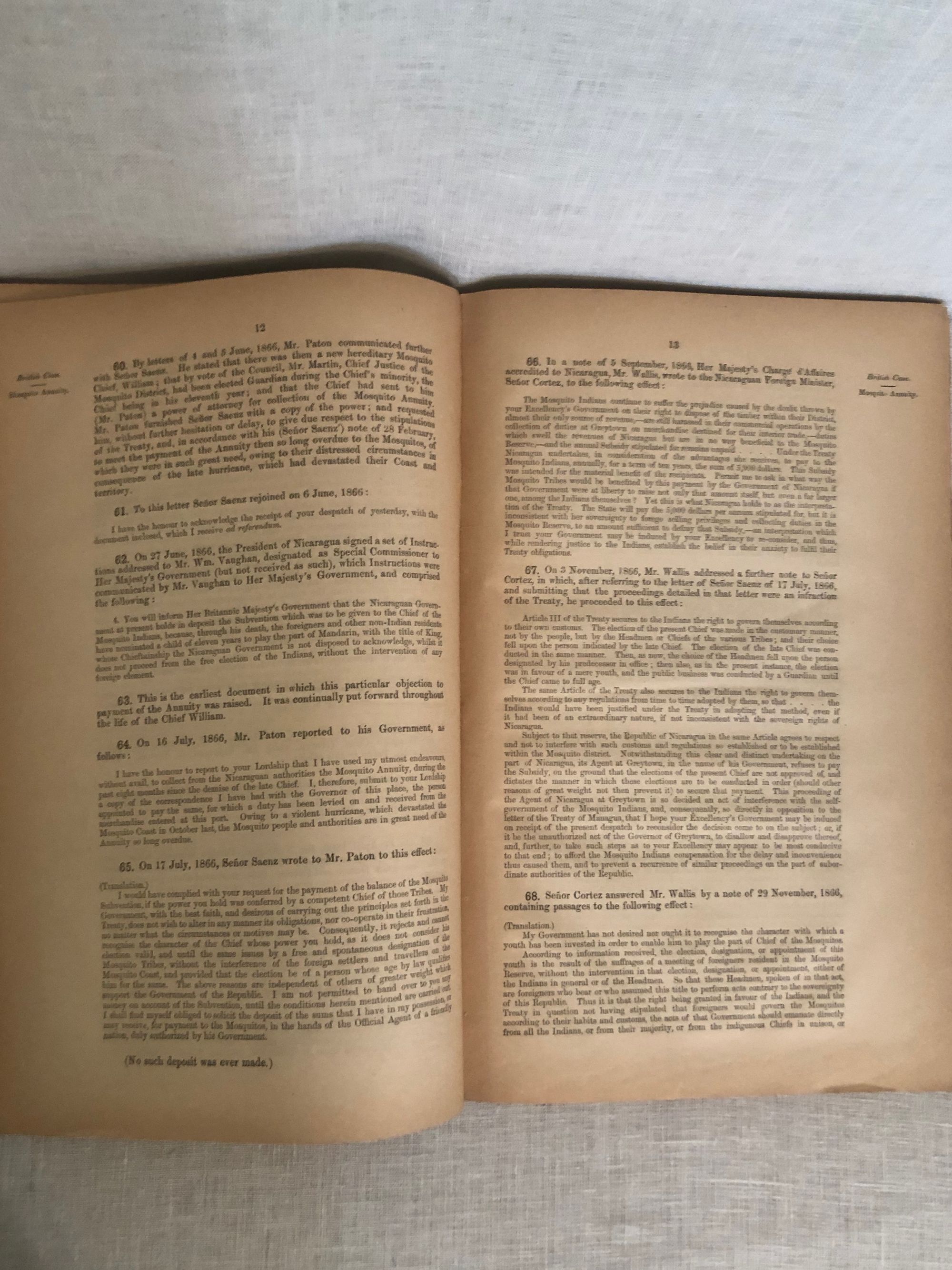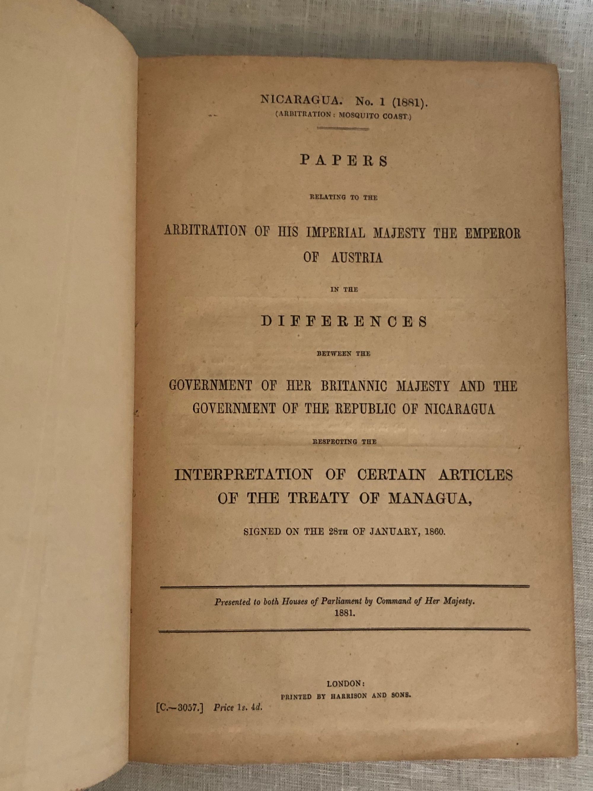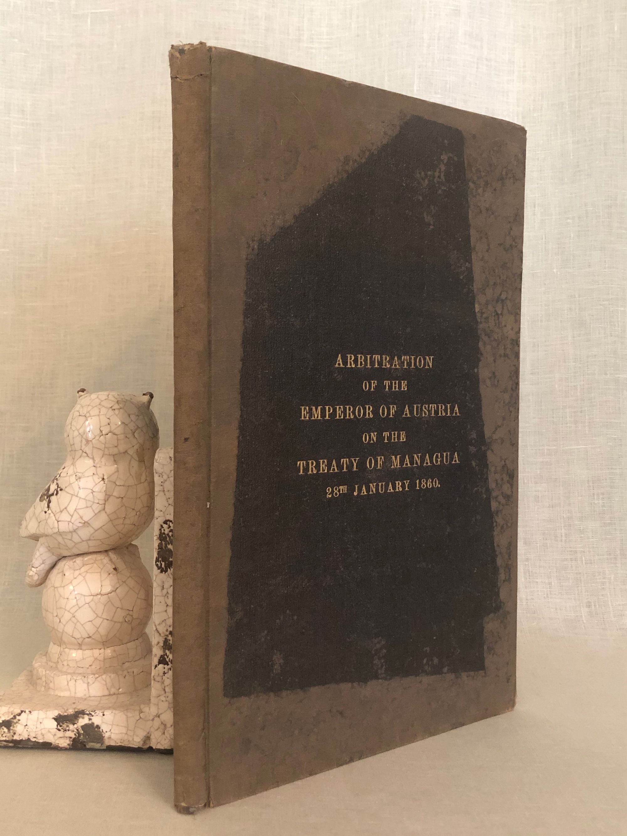 British Parliamentary Report[C3057]; bound with Report [C3058] containing "Further Papers " relating to the same. Hard cover, folio (measuring 8 ΒΌ x 13 inches), in brown cloth boards with title in gilt, 29pp. and 115 pp. plus foldout map. In English, Spanish and French. SIGNED in pencil on ffep.: "Lewis Baker , Bluefields, May 8th 1894." Lewis Baker was the Envoy Extraordinary and Minister Plenipotentiary, appointed by the American President Grover Cleveland to Nicaragua, Costa Rica and El Salvador, serving from May 13, 1893 to December 9, 1897. As such, he reported his observations on the "negro insurrection" at the Caribbean port city of Bluefields to the State Department in a series of letters, now accessible at the Foreign Relations website of the State Department. The 1860 Treaty of Managua, established the "Mosquito Coast" as an autonomous region from the former British colony of Nicaragua, thereby maintaining British trade access to the lucrative port of Bluefield. Condition: Good+. Both boards, as well as the spine, are sunned. Tear at head of spine. Minor insect damage not affecting text. Wear to corners. Pages age-toned.