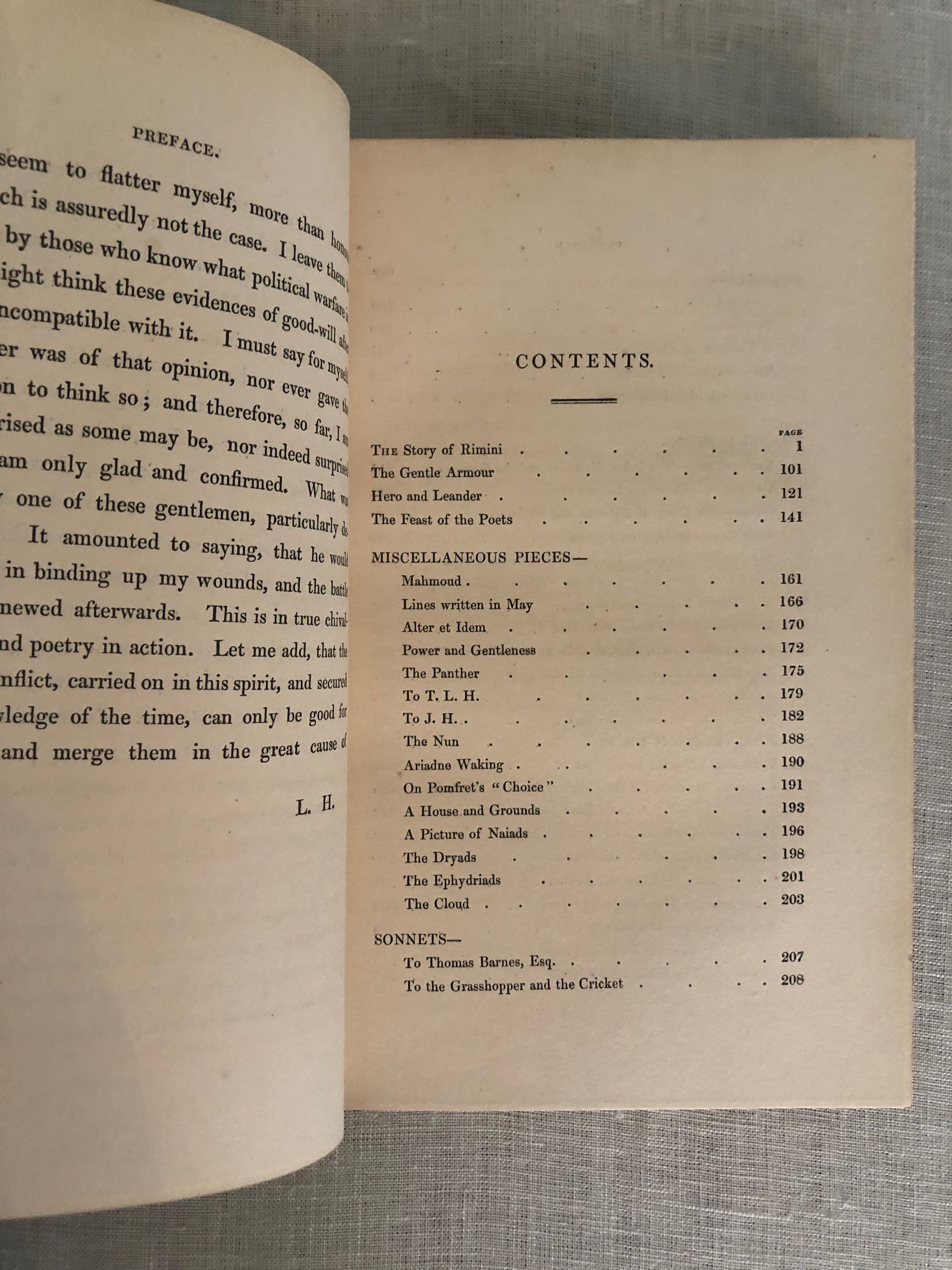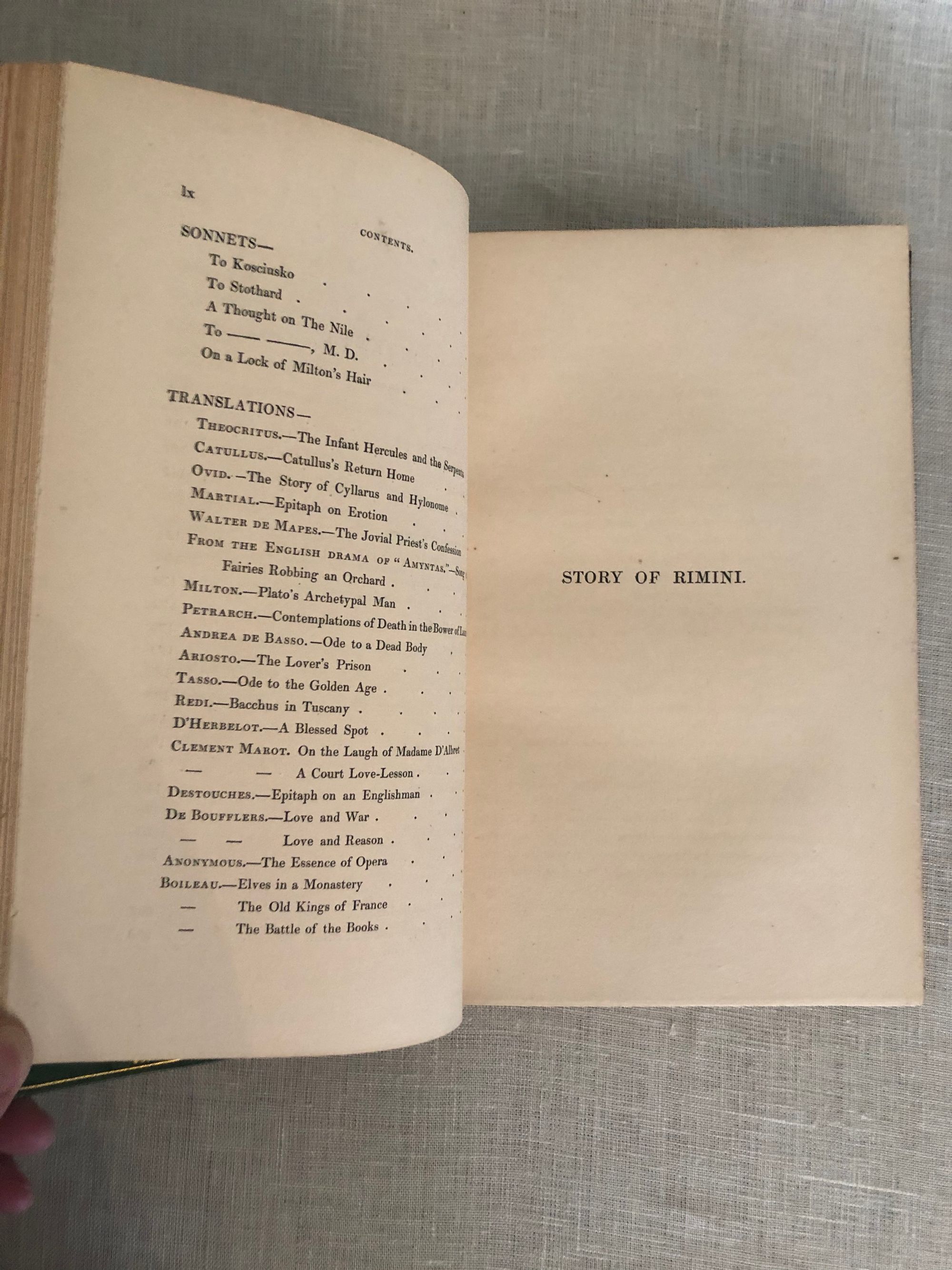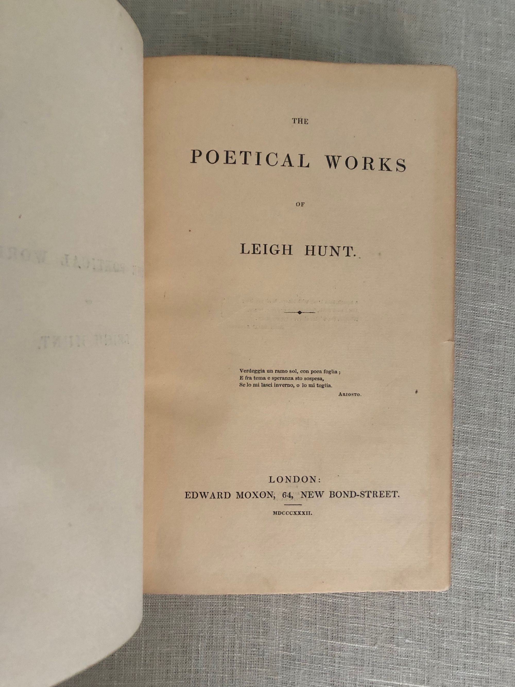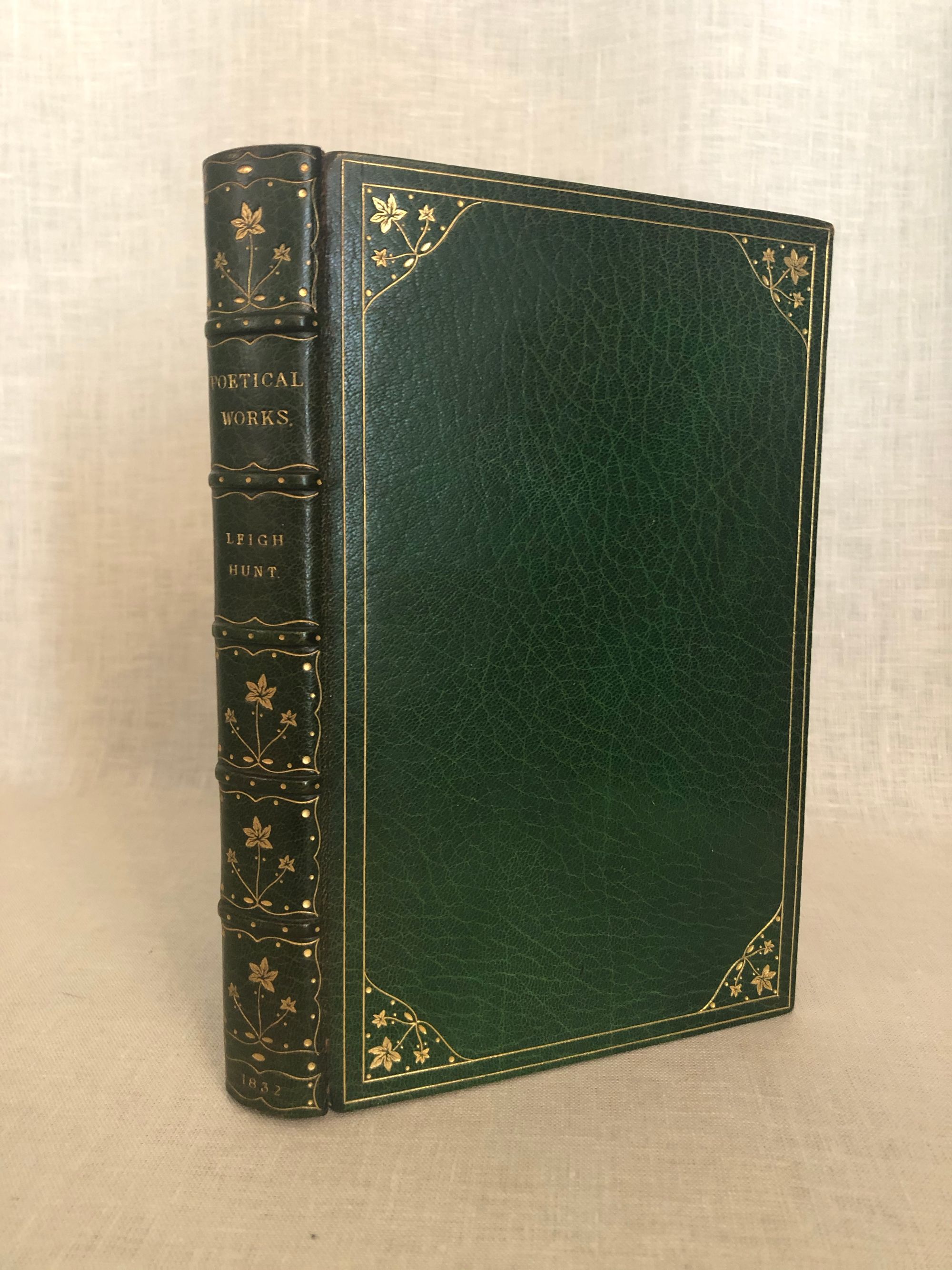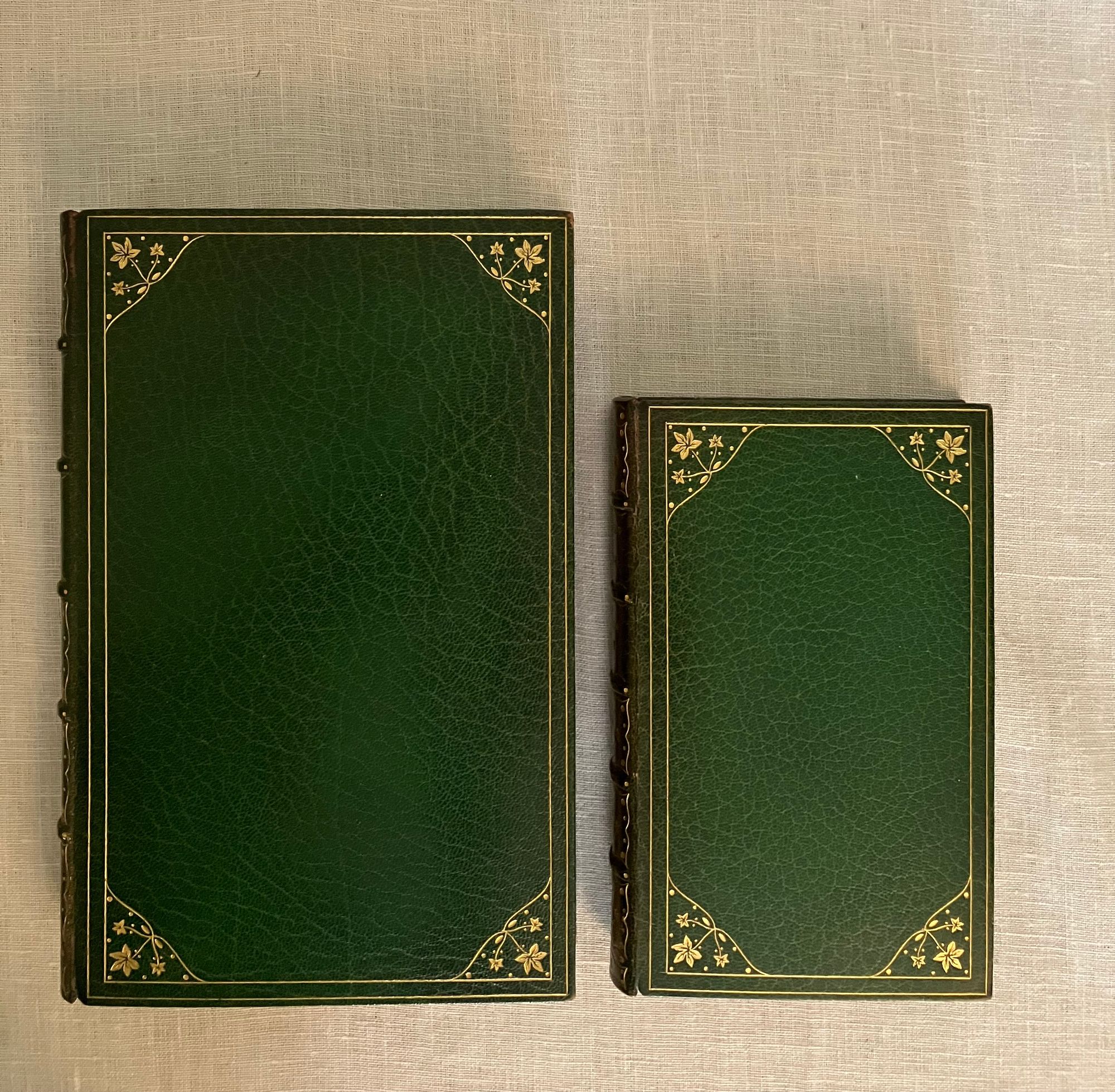 Hard cover, 8vo (measuring 5 ¾ x 8 ¾ inches) in a lovely Arts and Crafts style fine re-binding of full, crushed green morocco, top edge gilt, with gilt decoration of ivy leaves, dots and gilt rule to both boards, the spine in six raised compartments with matching decoration and titles in gilt. The signed binding is stamped signed to the front turn-in.: "Bound by Worsfold." This is presumed to date from the early twentieth century, matching other documented examples. The original cloth binding has been bound in at the rear. An engraved armorial bookplate of collector Charles Waterman Armour appears on the front pastedown. Printed by Bradbury and Evans, London on heavy, laid watermarked Ingres paper. **CONDITION: Very Good Plus or better. Light darkening to spine, very light wear at head and tail of joints. Hinges in order. Light toning. Polish offset to endpapers. Otherwise, very tight and clean. **COLLATION: (lx), 361, (12). ** British -American poet, James Henry LEIGH HUNT (1784-1859) was best known for his promotion of the Romantic poets in his newspaper, The Examiner, founded in 1808, furthering the literary careers of Keats, Shelley, Tennyson, Charles Lamb, Browning, Dickens and others. As a journalist he was also an impassioned defender of the abolition of the slave trade, and supported parliamentary and criminal reform. Includes his most acclaimed poem, "The Story of Rimini," based on characters from Dante's Inferno. Francesca and her brother-in-law Paolo have a forbidden romance and are murdered by her husband in this evocative drama. Also included are some of the author's translations of poetry from the original Greek, French and Italian. **London BOOKBINDER, WILLIAM WORSFOLD ]came from a London bookbinding family, being at least a third generation participant. An article from the New York Times Saturday Review of Books mentions him (Jan. 9, 1904 p. 26) in the same breath as other really notable bookbinders of the day. [See our No. 8391 for another (smaller sized) edition of this work in a matching binding, seen in the final web photo. Available separately.] Watson Vol.3, no. 1217. PROVENANCE: Charles Waterman Armour.
