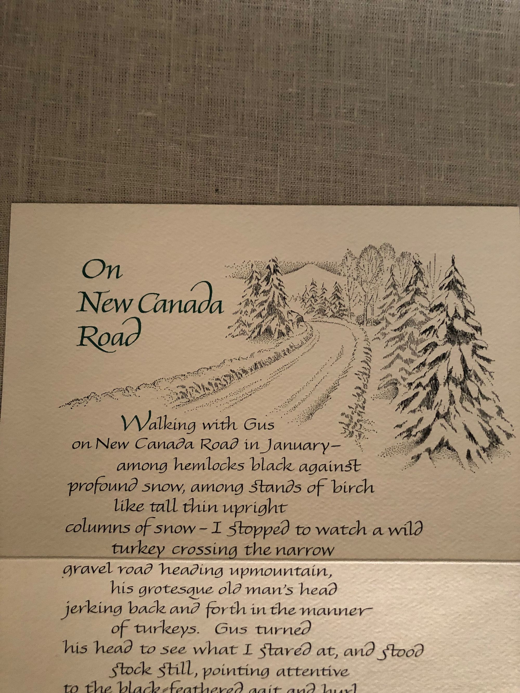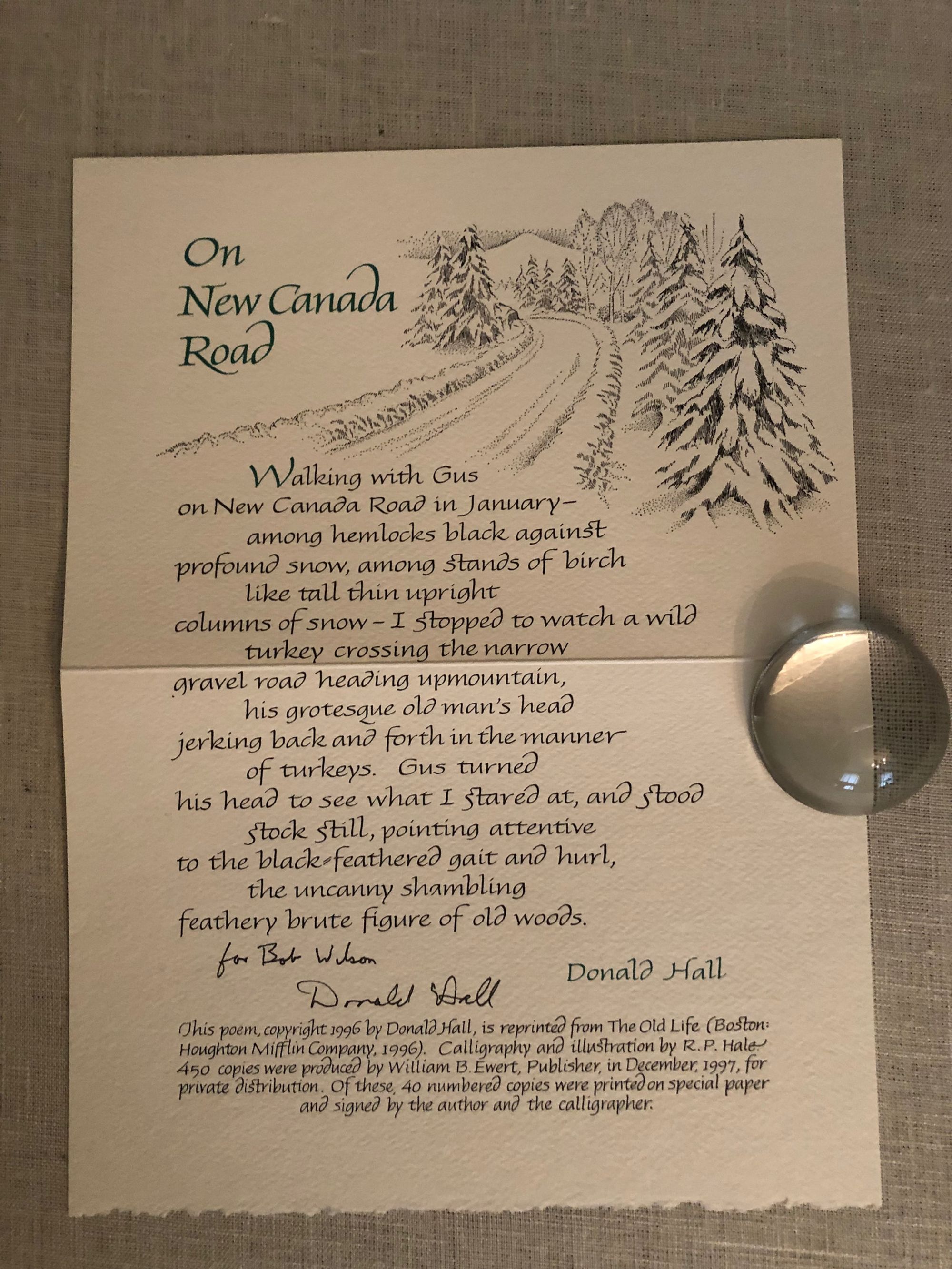 Signed, limited edition (one of 450 copies) of a single-sheet "broadside" publication of a poem by Donald Hall, with calligraphy and illustration by the Concord, New Hampshire craftsman, R.P.Hale. Published by William B. Ewert (1943-2001), a publisher in Concord, NH, who was also an expert on the poet Robert Frost. *** Donald Hall (1928-2018) was an American poet and author, who became Poet Laureate of the United States in 2006. He is also famous for his children's stories, including "Ox-Cart Man" (1979). *** Condition: About Fine. Folded in half and protected in a plastic sleeve.