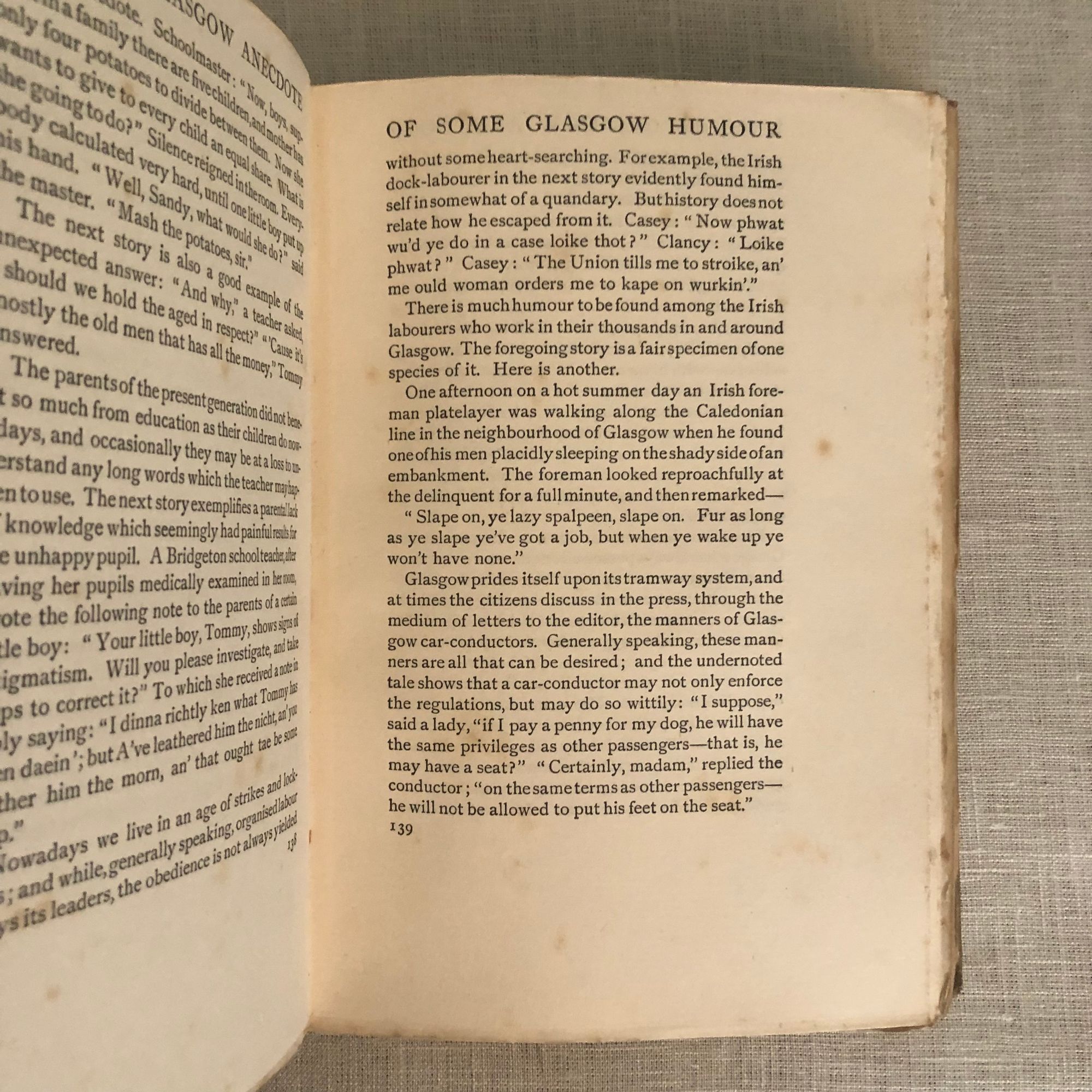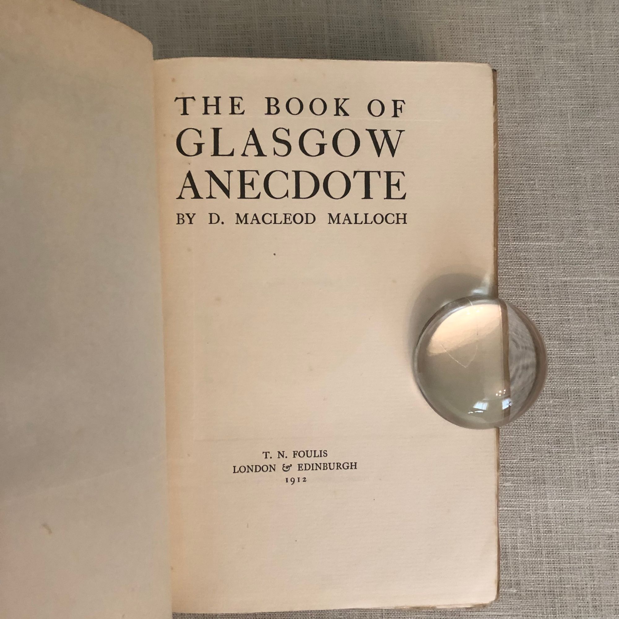 395pp + ads. Stories of the people of Glasgow, Scotland's manufacturing city. With chapters on Commerce, The University, Law, The Medical Profession and The Church. One story: "A boy was brought before a Glasgow magistrate charged with stealing a handkerchief from a gentleman's pocket. The indictment having been read, the Bailie [magistrate], addressing the boy, said - 'I hae nae doot ye did the deed, for I had a handkerchief ta'en out o' my ain pouch this vera week; sae ye maun gang to the jail for sixty days'. The Assessor here interposed, stating that the case had not yet been proved against the boy. 'Oh, then, in that case,' said the worthy Bailie, 'I'll just gie ye thirty days'." Condition: About Very Good, with light foxing, and an ink-spot and some dust-soiling to covers.