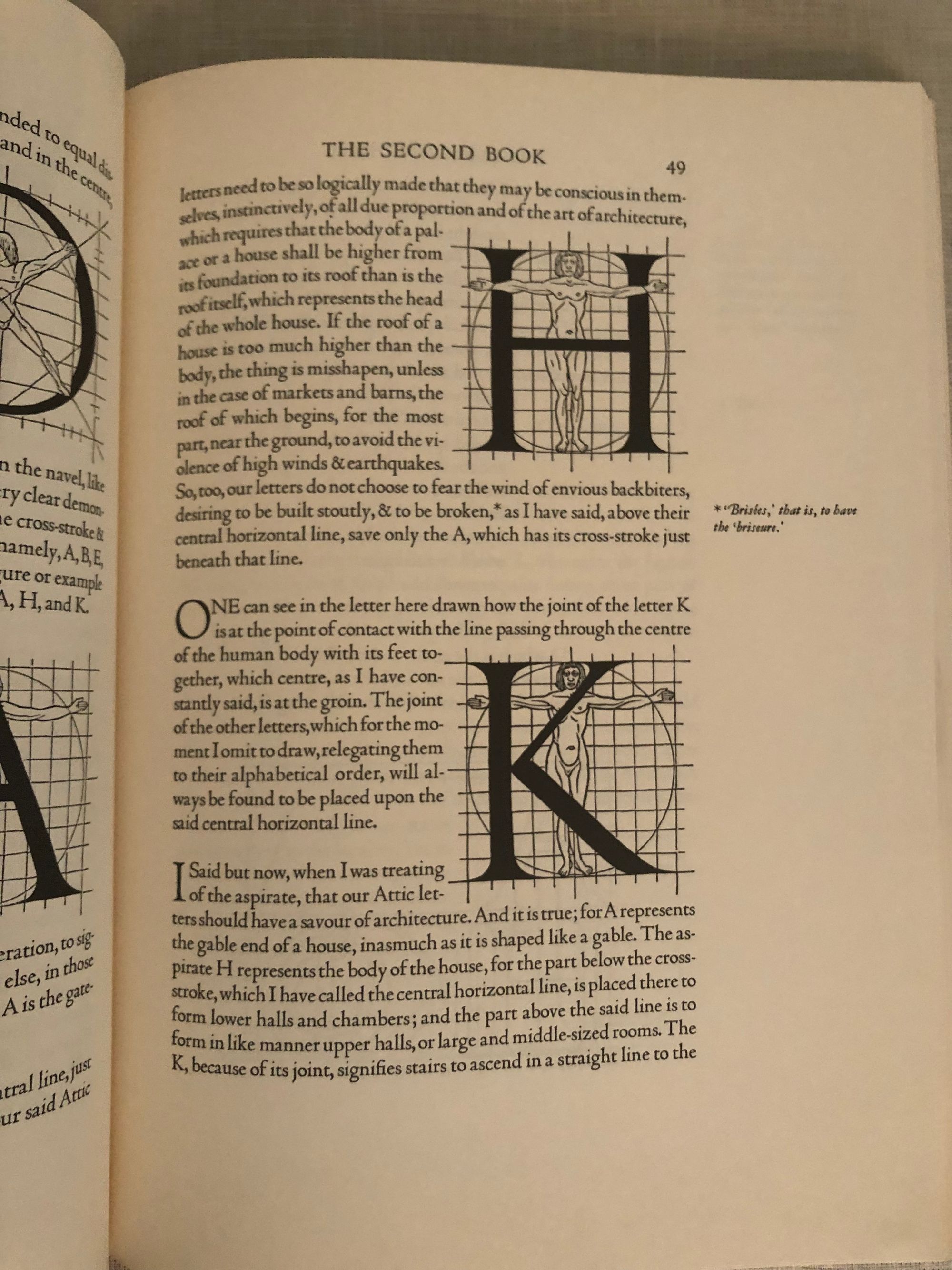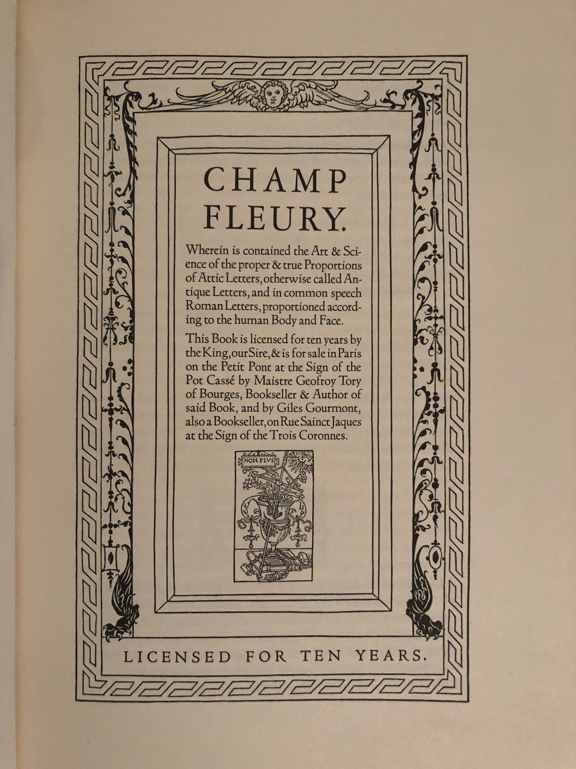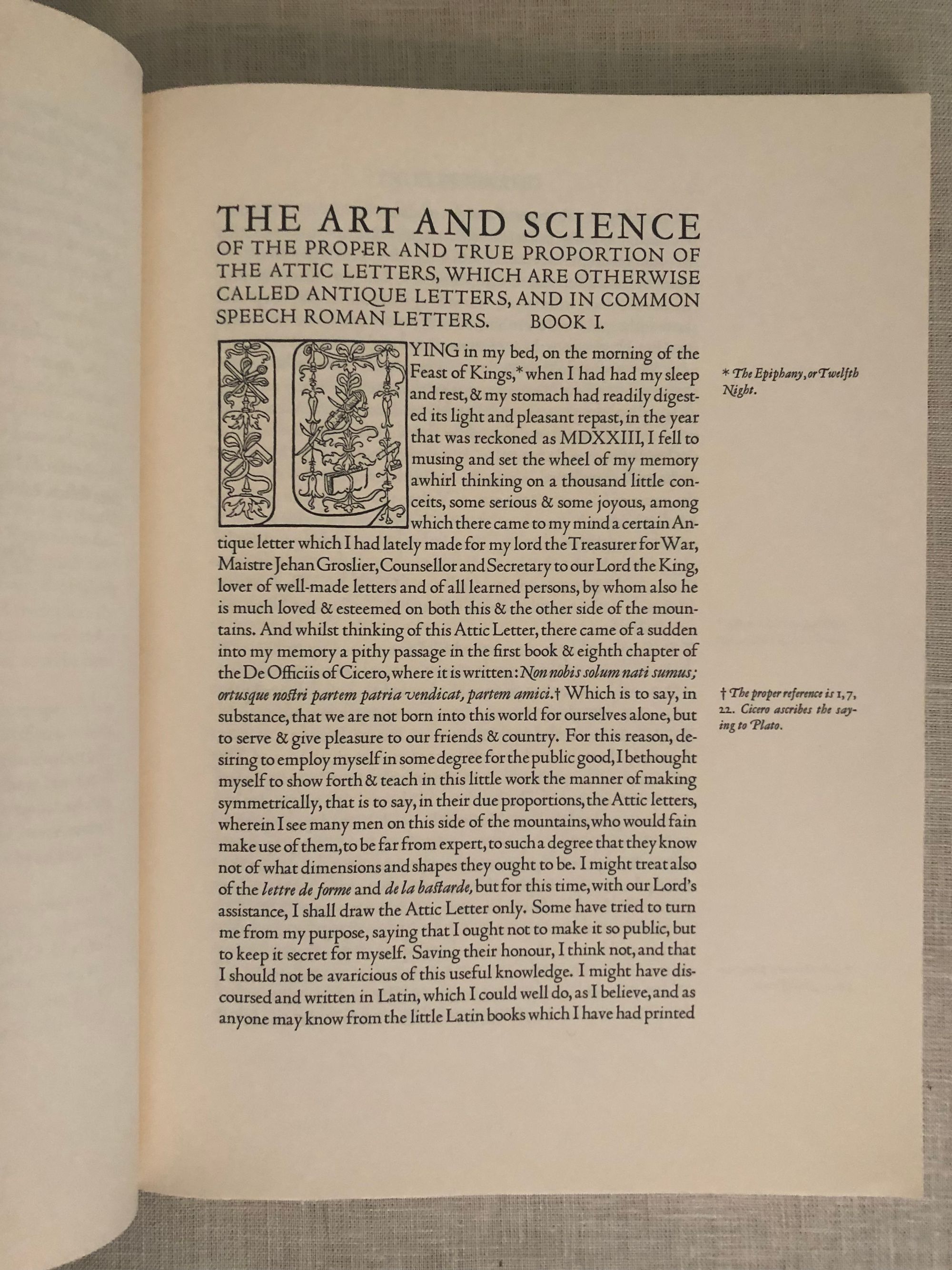 Soft Cover, quartos, 208pp. In English. A reprinted translation of the 1529 classic of typography from one of the French Renaissance masters. Includes his mathematical and humanistic, aesthetic principles for the ideal Roman alphabet, as well as thirteen additional alphabets, block ornamental, fraktur, Greek, Hebrew and other typefaces as well as suggestions for the making of monograms. A classic of the history of printing. Condition: Good, with two small areas of delamination and one bent corner. Contents are clean and slightly toned. Ransom, "Rogers" checklist, No. 17, p. 402--the 1927 edition, reproduced was designed by Bruce Rogers.