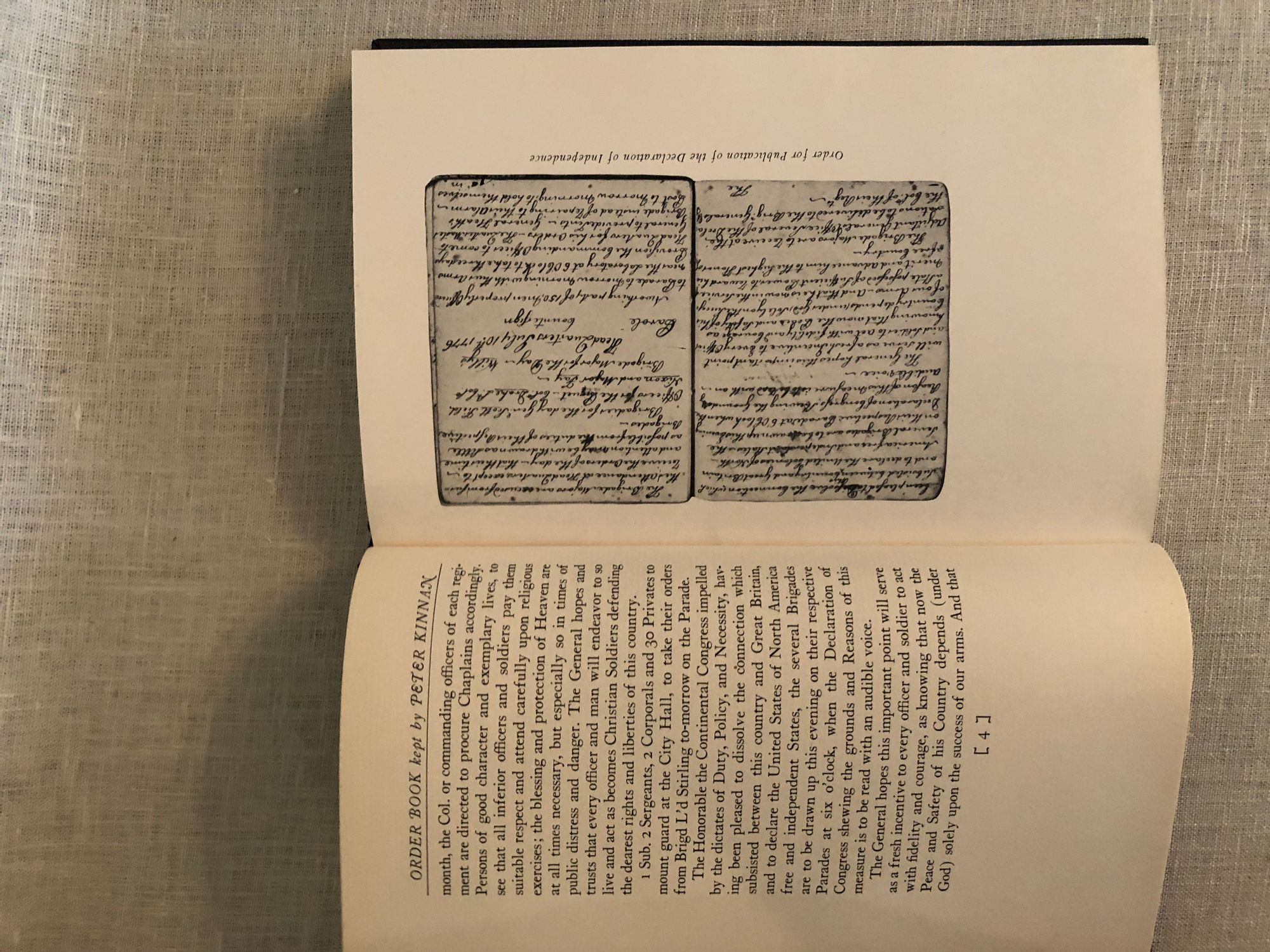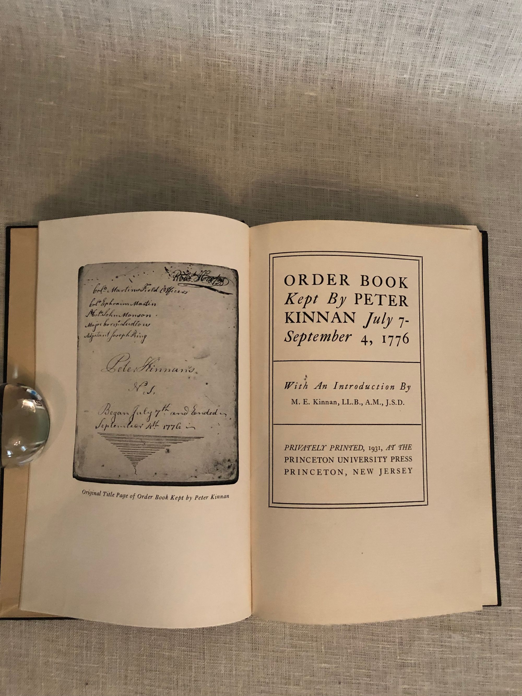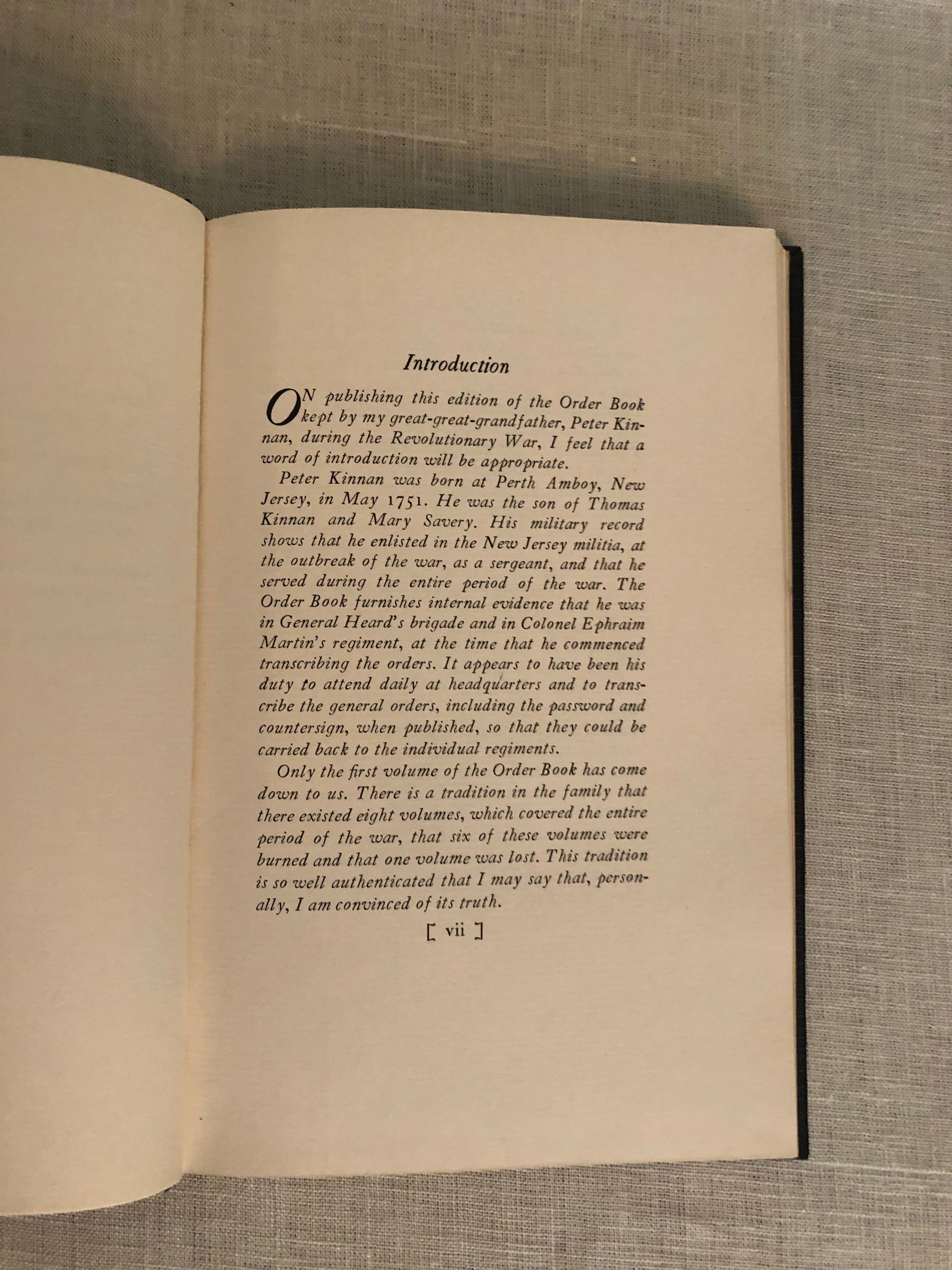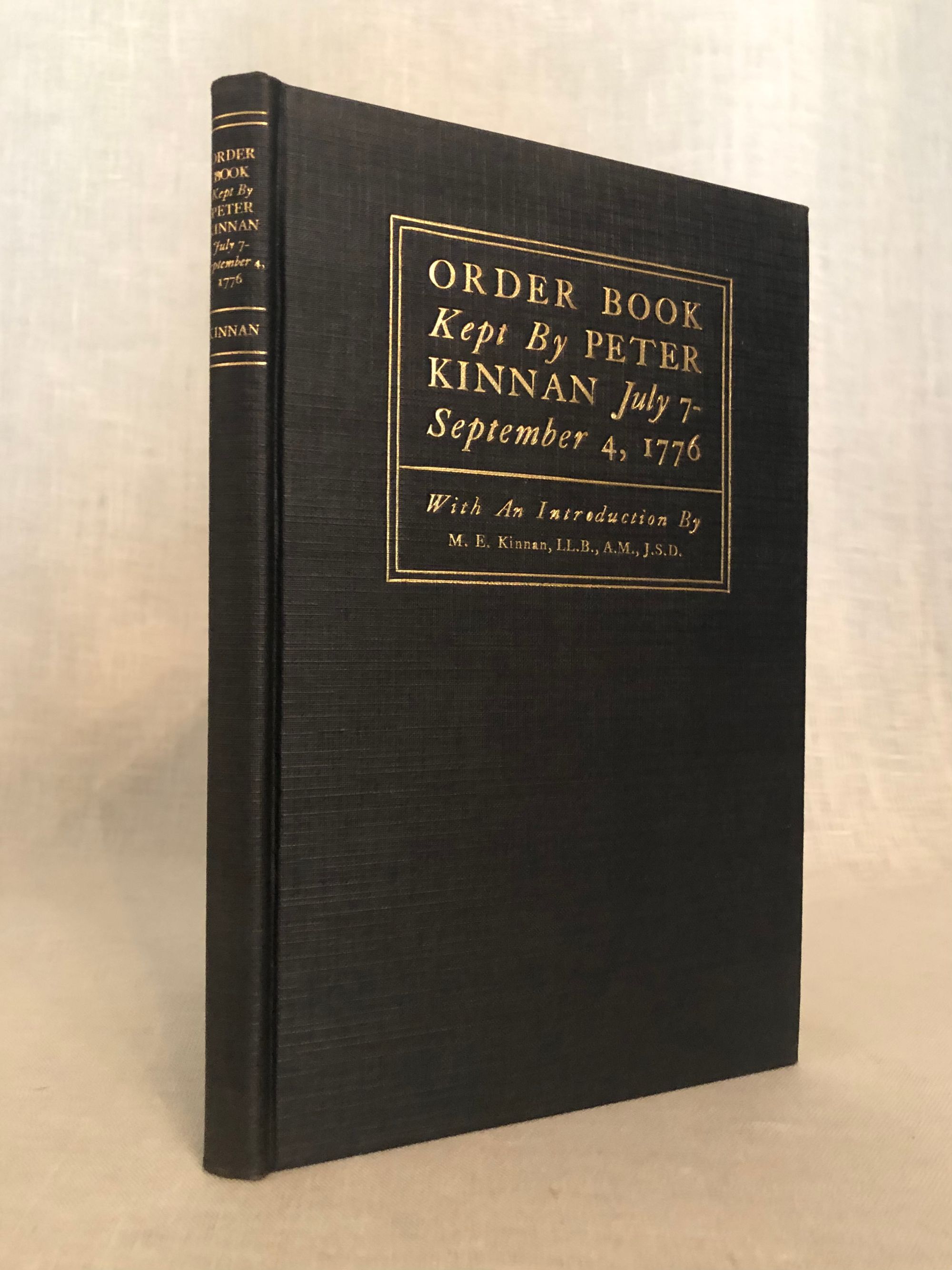 Hard cover, 8vo., 98pp. In publisher's black cloth binding with gold lettering. Condition: Near Fine. ** Illustrated with photographic plates. ** Military Order Book kept by Peter Kinnan, a New Jersey soldier during the American Revolutionary War, who was in General Heard's brigade and in Colonel Ephraim Martin's regiment. Among his other duties, Kinnan had the authority to sign passes to allow civilians to cross the Hudson, carrying General Head's authority. A photograph showing such a pass is included among the illustrations. OCLC 2321781.