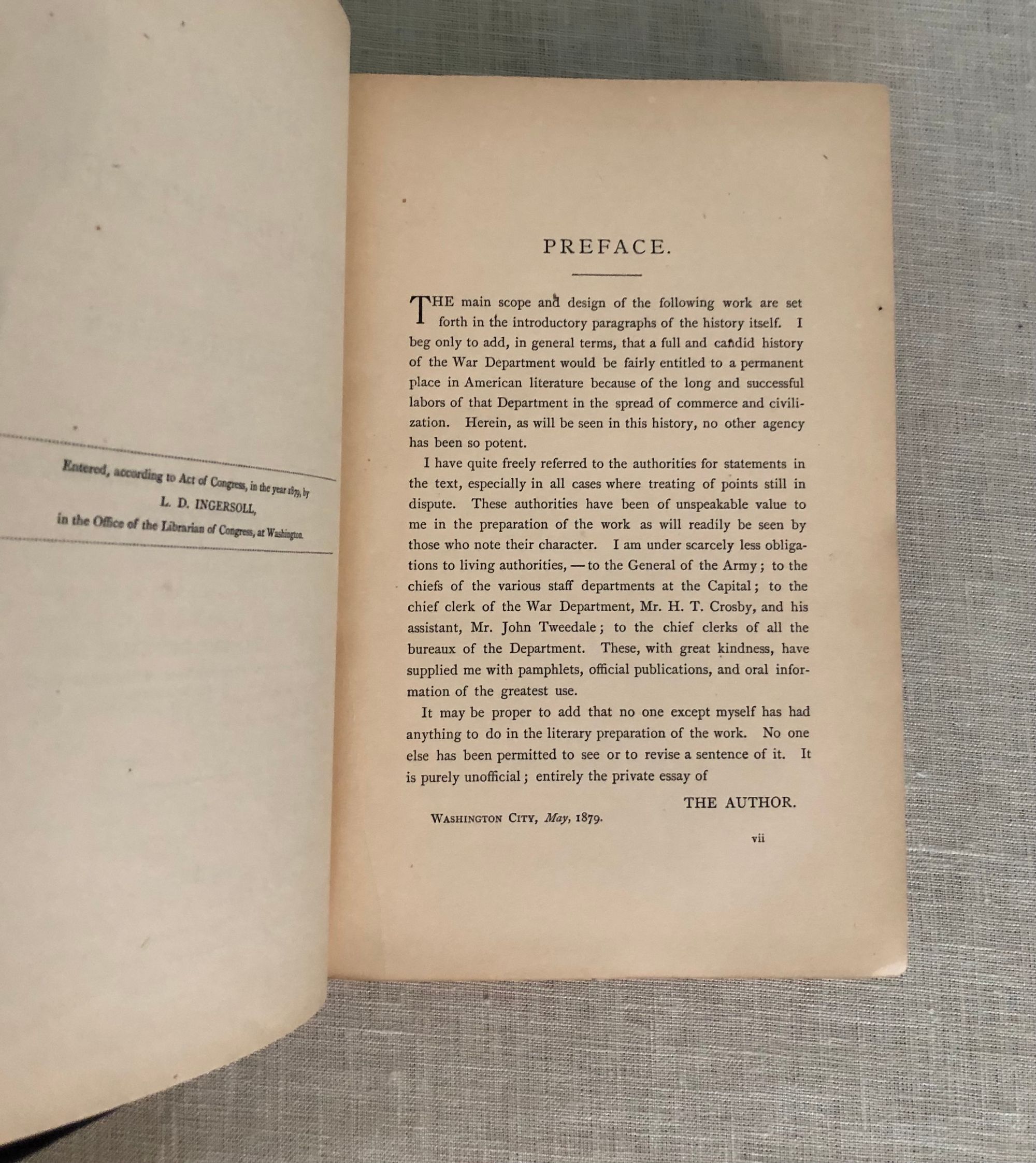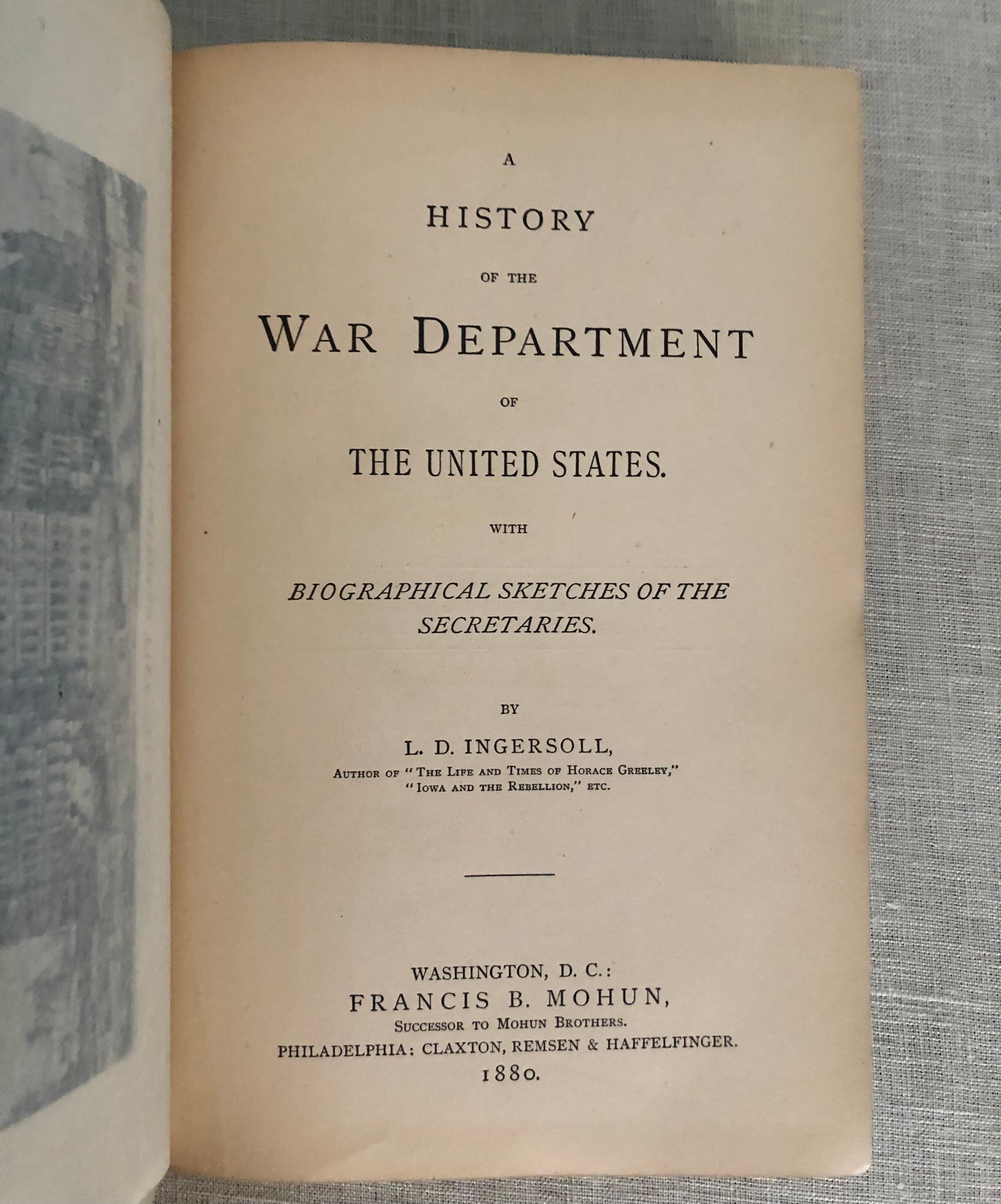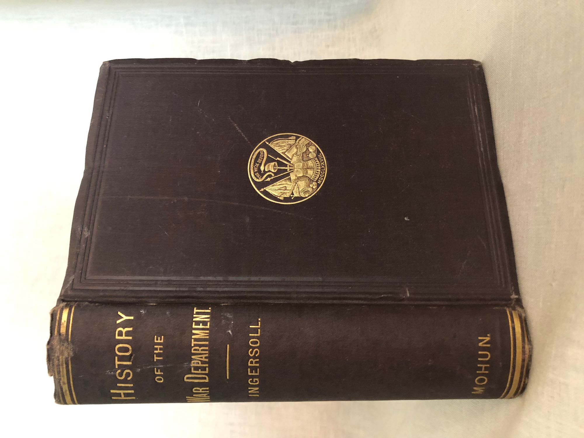 Hard cover, 8vo., 613pp., First edition with copyright of 1879. In publisher's brown cloth binding, gold lettering and US Army seal with motto "This We'll Defend" to front cover. Condition: About Good. Cracked front hinge with ghost of old tape, and a number of bumps to the edges of the covers. ** Contents include the founding of the War Department, the War of 1812 with Great Britain, the Mexican War, "The Situation of the Indians at the The of the Establishment of the Government", and an appendix of the Roster of the Medical, Pay, Corps of Engineers and Ordnance Departments. With two illustrated plates. Includes a leaflet advertising another book by the publisher. Author L.D. [Lurton Dunham] Ingersoll (1841-1918).