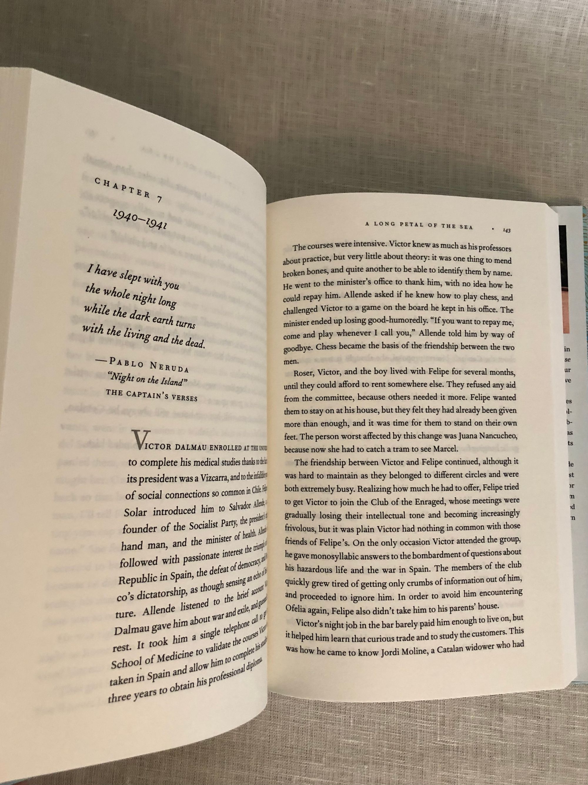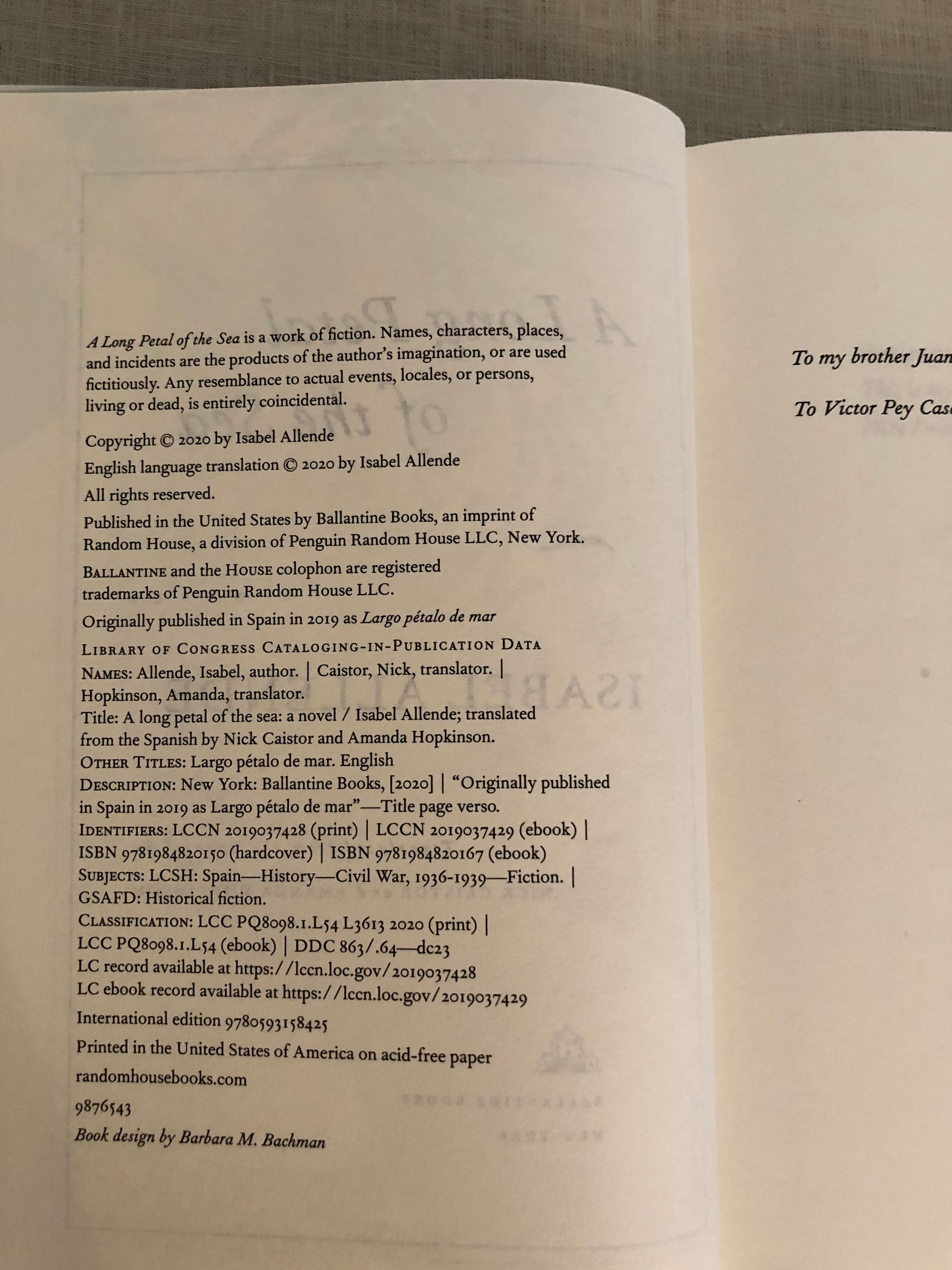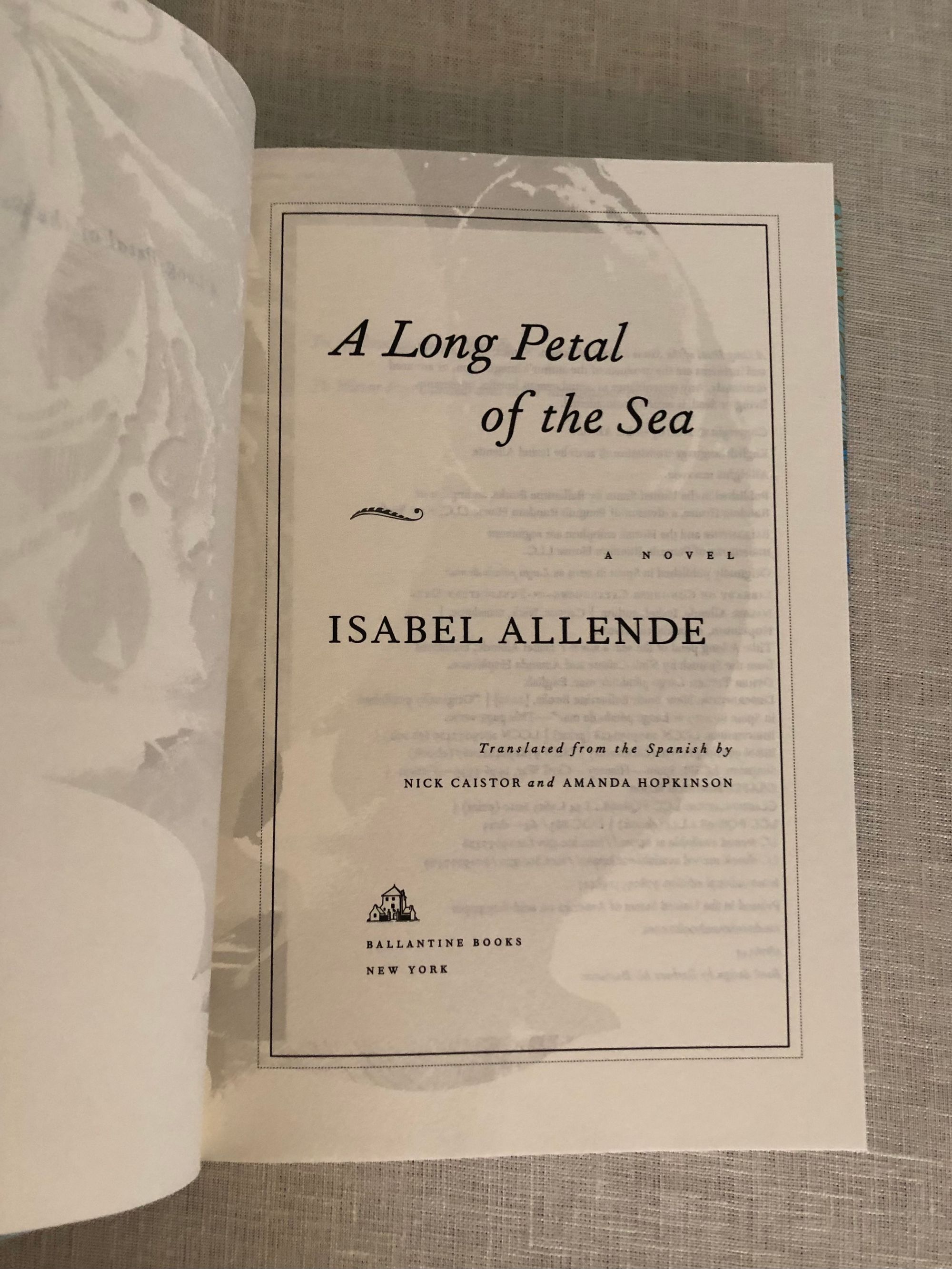 First International Edition, third printing. Hard cover, 8vo., (measuring 6 ½ x 9 ½ inches) in mint colored paper covered boards, a light blue spine, titles in gilt. In a similar colored, art deco-influenced dust jacket, now protected in mylar. Condition: Near Fine, with one small scuff to front board; d/j/ is Fine. Allende's best selling novel is based on some true events of the Spanish Civil War. Her characters, an unlikely couple, undertake a dangerous mountain journey to France, and thence sail aboard the cargo ship "Winnepeg" to exile in Chile, an escape organized by the Chilean poet and diplomat Pablo Neruda in the late 1930's. From a review by Paula McLain in the Telegraph (2020): "In "A Long Petal of the Sea," as in much of Allende's fiction, there is the sense that every human life is an odyssey, and that how and where we connect creates the fabric of our existence: the source of our humanity."