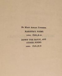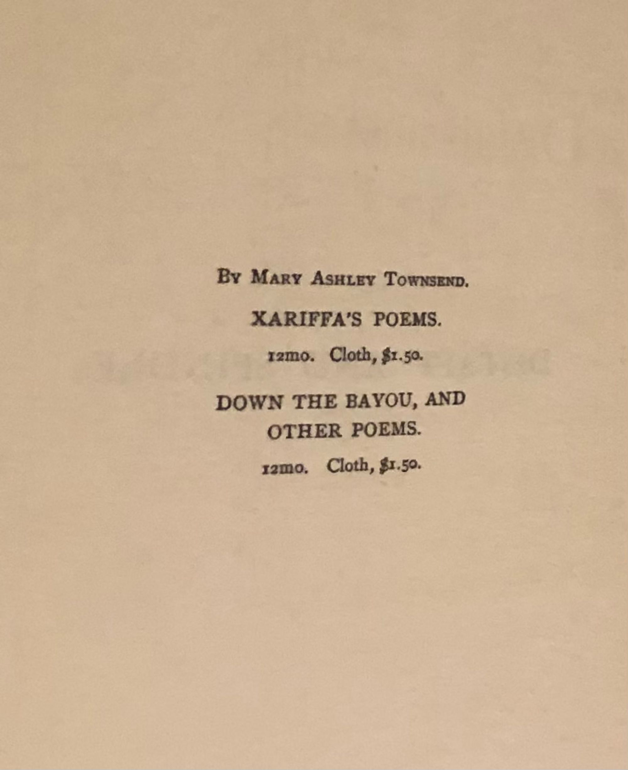 Hardcover, small 8vo., (measuring 7 ¾ x 6 ¼ inches), in green publisher's cloth with pictorial design in gilt to front board and spine. X-Library with small paper label to spine and withdrawn sticker within. Printed on van gelder type paper, with top edge gilt, others untrimmed. Unpaginated, containing 69 poems, (blanks verso.) Condition Very Good Plus, with some spotting to rear board. Small amount of sunning to boards and spine. Interior is bright, clean and square. The author Mary Ashley Townsend, (1836-1901), was originally from upstate New York, but resettled after her marriage to New Orleans, where her career as a writer began. She wrote under the penname of Xariffa, publishing humorous stories and poems in the southern and western press to some acclaim. The highlights of her career were the delivery of the opening poem to the New Orleans Exposition in 1884. She was also nominated to the Mexican literary society, the Liceo Hidalgo.