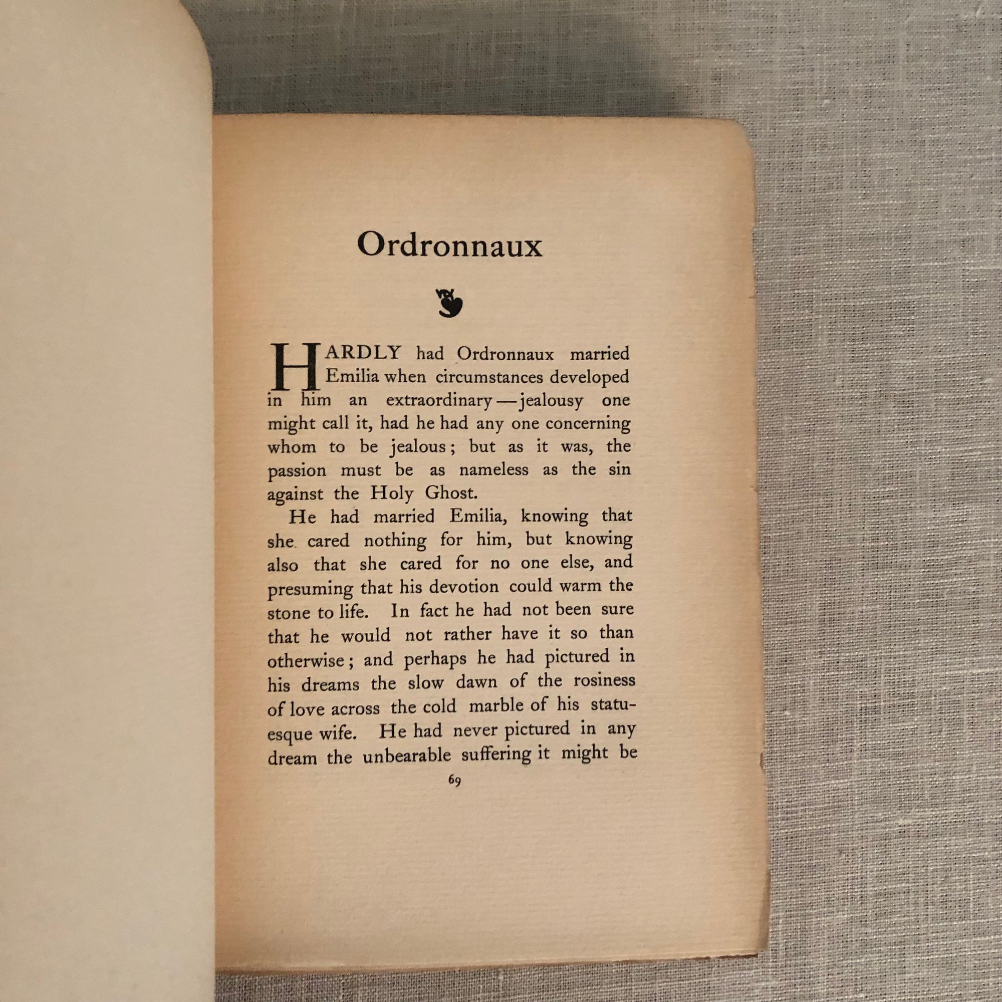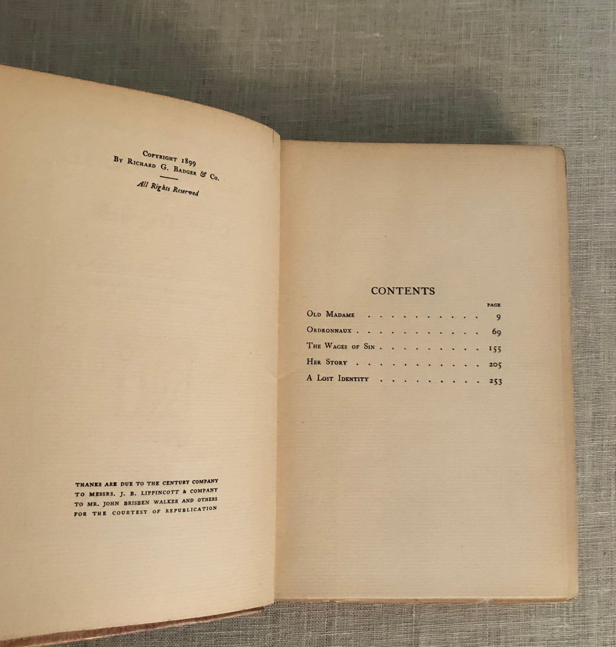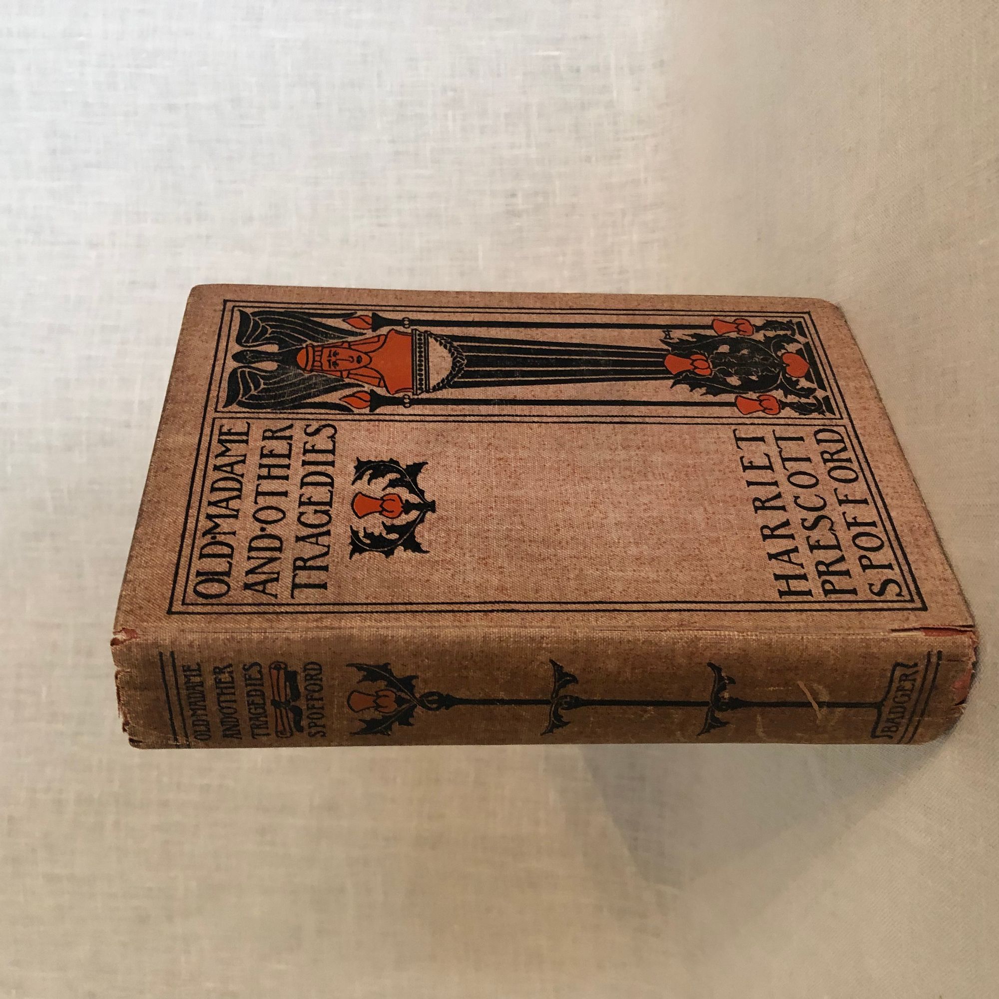 ** Inscribed by Author to fellow writer, editor and suffragette, Elizabeth G.Jordan, with her bookplate.** Hard cover, 16mo, (measuring 4 ¾ x 7 ¼ inches,) in publisher's original mottled pink cloth with pictorial decoration and titles in black and red, showing a woman's bust surmounted by an American Eagle. Top edges stained pink, others untrimmed, 301 pp. Condition: generally Very Good, with a repair to the cracked binding, slight wear to the cloth at tips, and at front joint. Otherwise clean, mildly age toned and protected in mylar. This represents the first collection of these stories in book form, including: "Old Madame," "Ordronnaux," "The Wages of Sin," Her Story" and "A Lost Identity." Harriet Prescott Spofford ( 1835-1921) is now recognized as a largely under-appreciated, prolific, nineteenth-century female author who regularly portrayed non-stereotypical women in her work. Born in northern Maine, Spofford relocated to a relative's in Newburyport, Massachusetts and was published in contemporary magazines and newspapers in Boston, supporting her siblings upon the death of her parents. She earned the attention and mentorship of a noted Newburyport social reformer and woman's rights advocate, the Rev. Thomas W. Higginson, (who also edited the early works of Emily Dickinson.) Spofford also published a number of novels, poetry, children's literature, detective stories and ghost stories over her long career. The recipient of this book, Elizabeth G. Jordan, (1865-1947), is also noteworthy as a early feminist writer and suffragette activist. She began her career in journalism, later becoming editor at Harper's Bazaar at the turn of the twentieth century. Jordan edited The Sturdy Oak (Henry Holt, 1917), a "composite novel" by fourteen authors whose sale and serialization was to financially support the cause of woman's suffrage. ** The attractive book cover illustration is signed with the intertwined device featuring the initials WHB. It is our opinion this is the signature of Will H. Bradley, (although this particular item is not listed in Bambace.) Stylistically, the type and other design accord. BAL 18534.