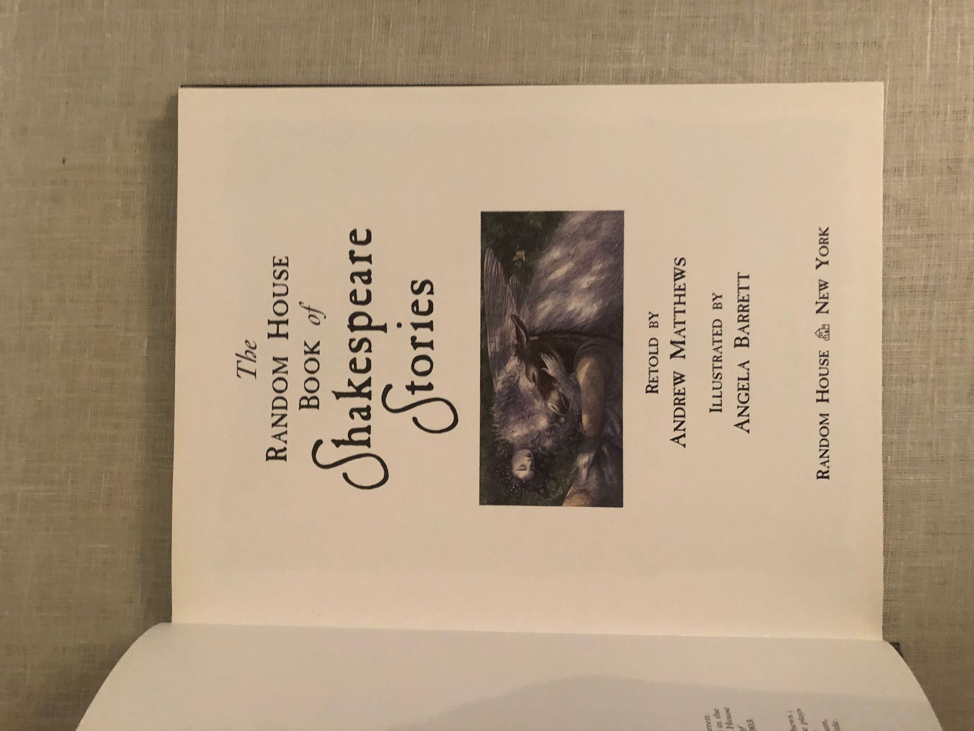 Hard cover, folio (measuring 8 1/2 x 10 1/4 inches), pp. 117 [8]. A retelling of the most famous Shakespeare plays by Andrew Matthews, lavishly illustrated by Angela Barrett, a British illustrator and artist. Plays thus treated are: A Midsummer Night's Dream, King Henry V, Romeo and Juliet, Macbeth, Anthony and Cleopatra, Twelfth Night, Hamlet and The Tempest. *** Condition: About Fine, with light shelf wear to dust jacket. In mylar. Dust jacket not price clipped.