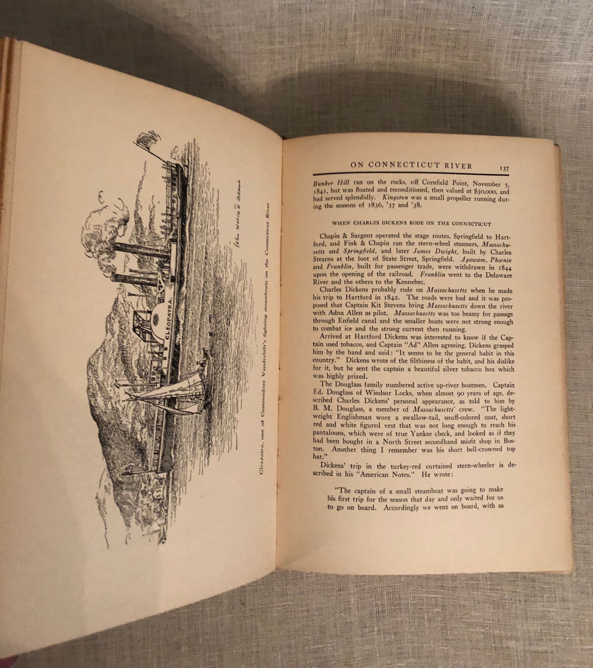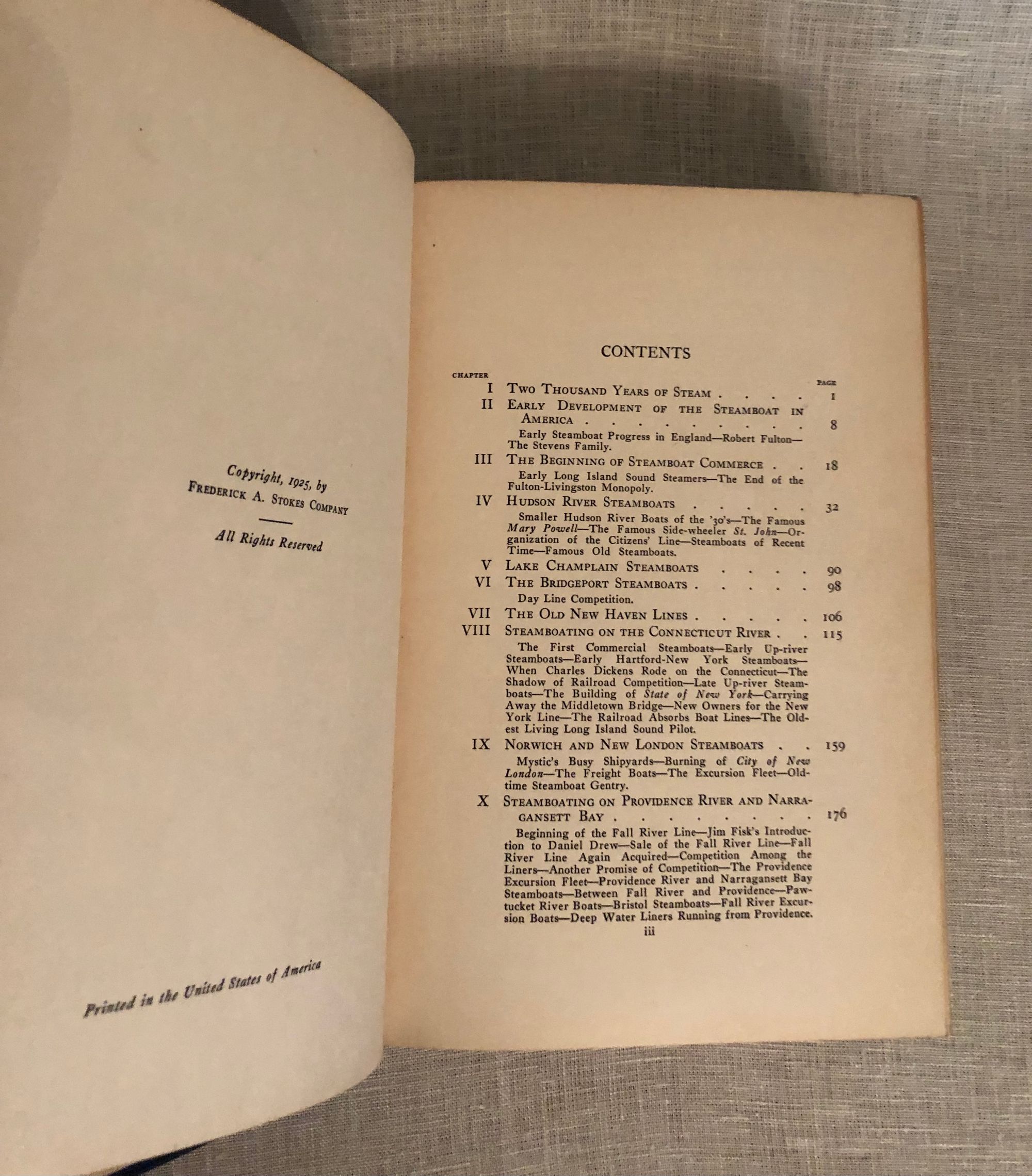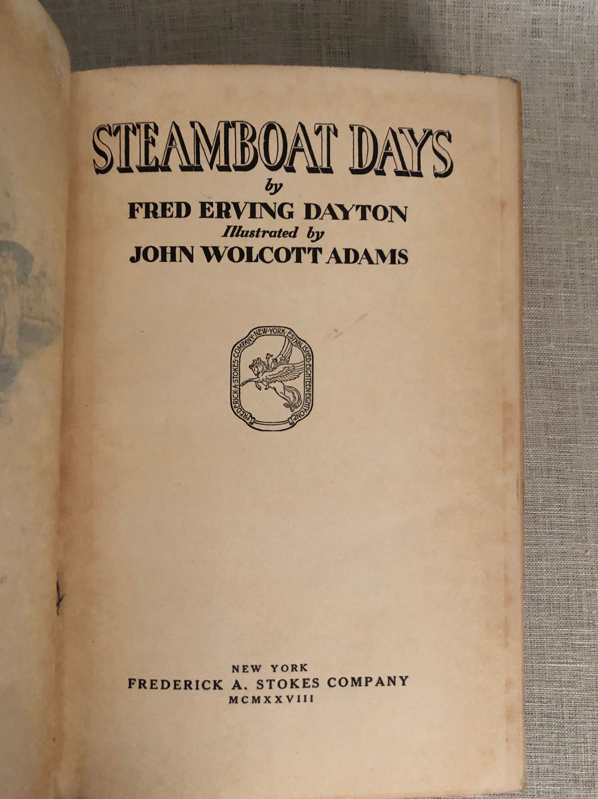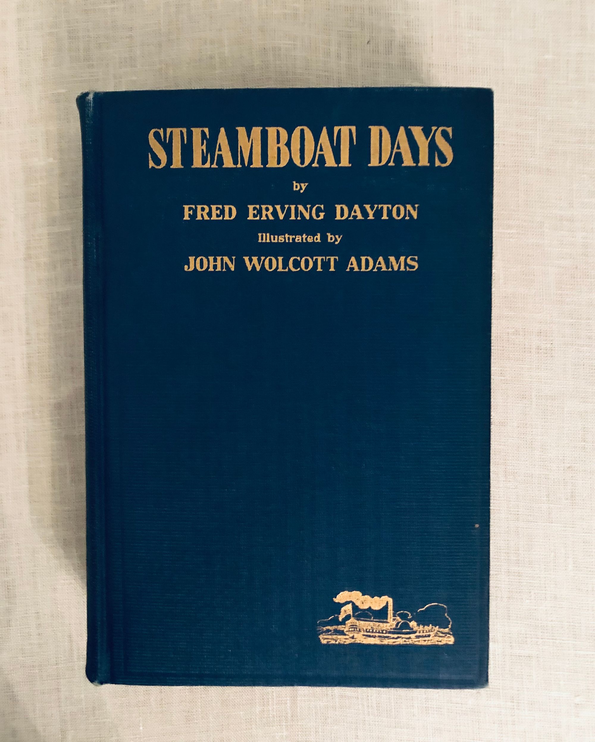 **Presentation copy from the Author to fellow writer of note, Bud Kelland, (undated).** Hard cover, 8vo., in blue publisher's cloth, embossed with border and with the title and ship vignette to the front board in gilt, and upon spine, 436 pp. Condition: Very Good, with a couple of repairs attempted at two final pages, due to a manufacturing error with the page trim. Minor rubbing to exterior corners and edges. First published in 1925, Steamboat Days is a heavily list-centric compendium of details of the industry, beginning in England, and early America. Broken down by geographic region, it includes details on every part of America's riverine commerce, especially as it blossomed in the nineteenth century. (Of particular interest to this bookseller is the mention of steamboats on the Merrimack River, ferrying passengers to a day of relaxation at Plum Island from Haverhill, or goods and materials from Newburyport to Salem or Boston.) Numerous pen and ink illustrations of individual steamboats are provided by John Wolcott Adams (1874-1925), a descendant of the famed Presidents of the same last name, as well as a successful magazine and book illustrator, who once worked with Howard Pyle teaching art at the latter's art school in Delaware. **The presentation inscription is from the Author to Bud Kelland. Kelland wrote many popular novels in the thirties and forties, his character Scattergood Baines being serialized into a run of six popular Hollywood movies.