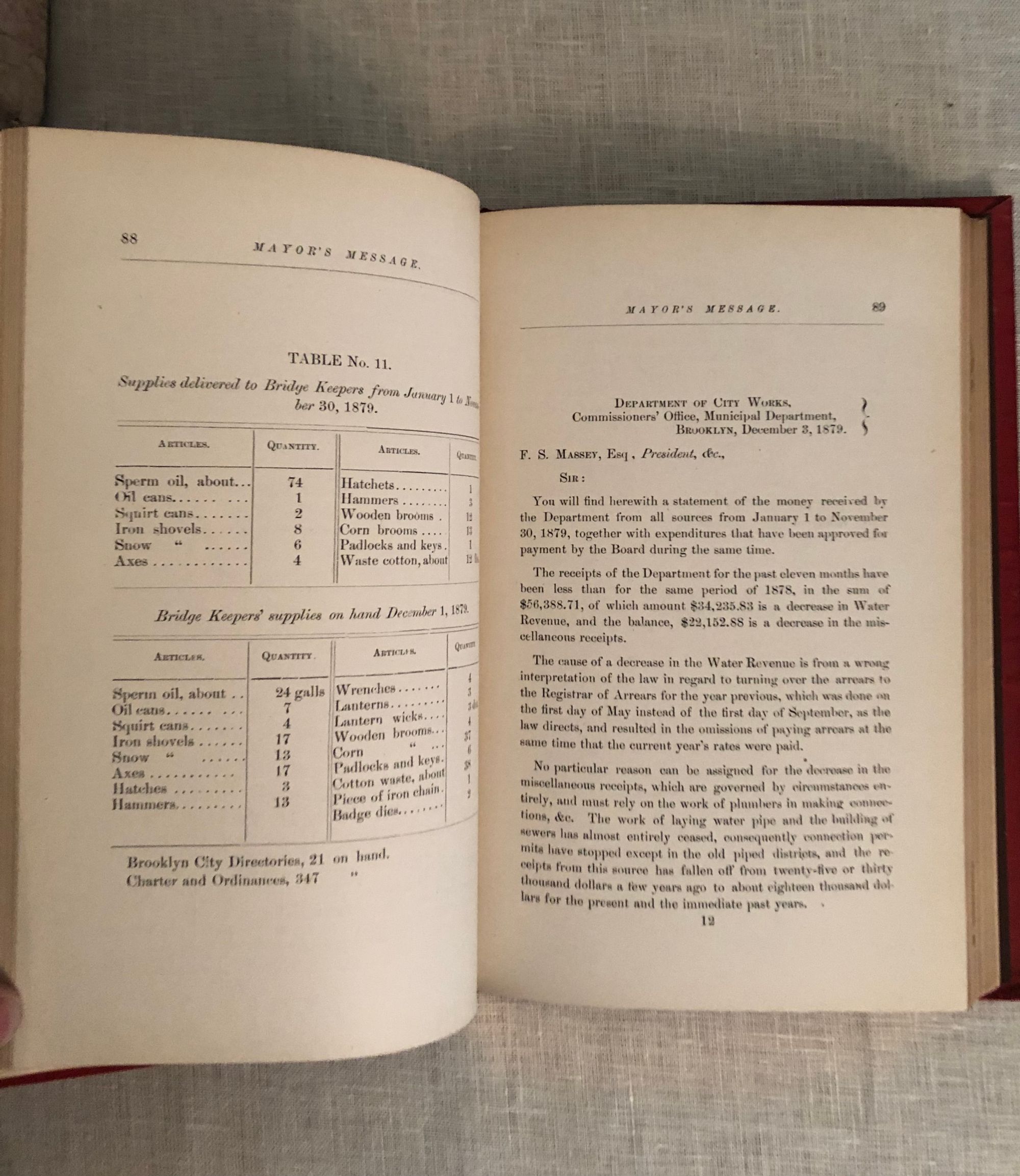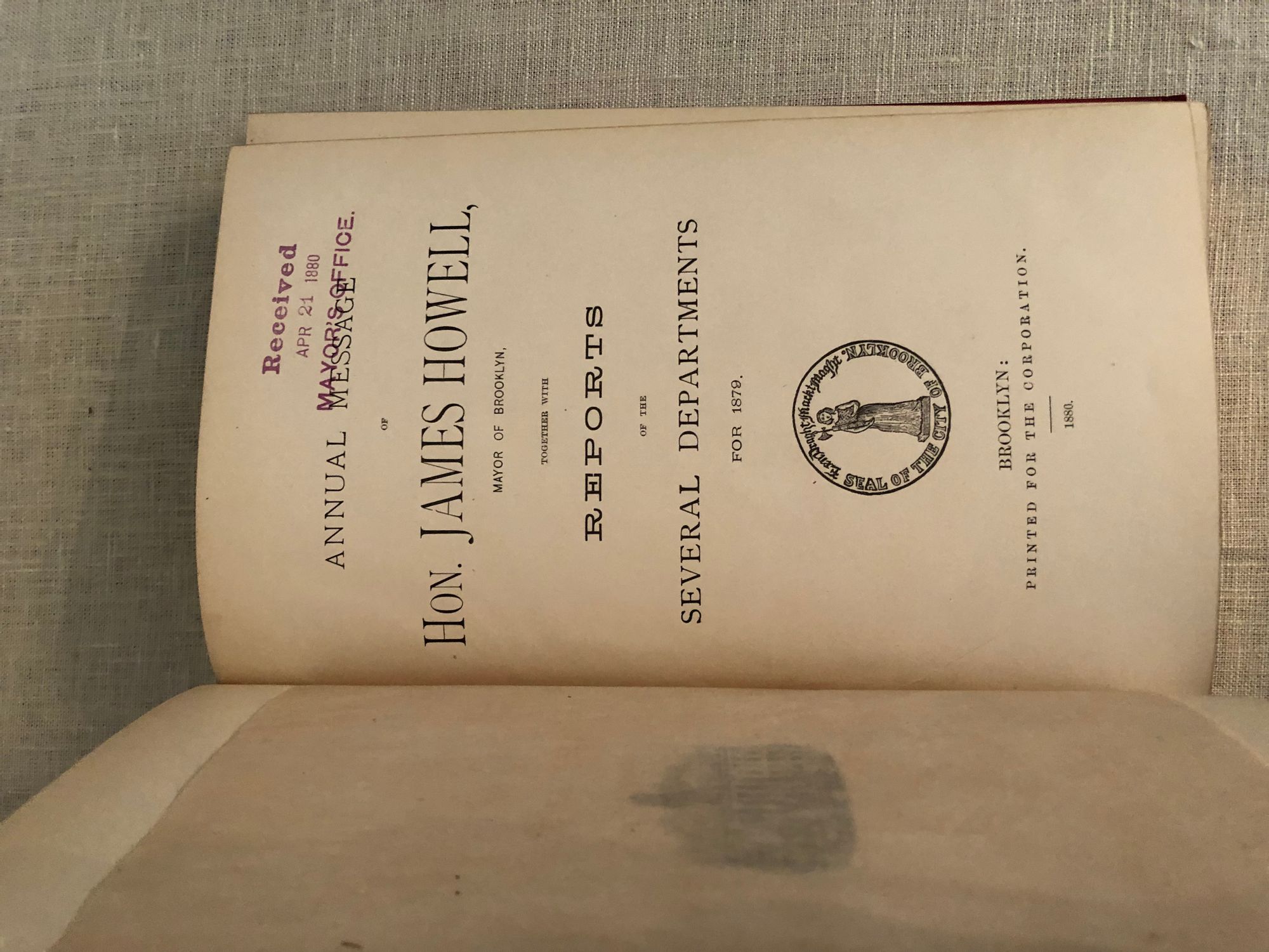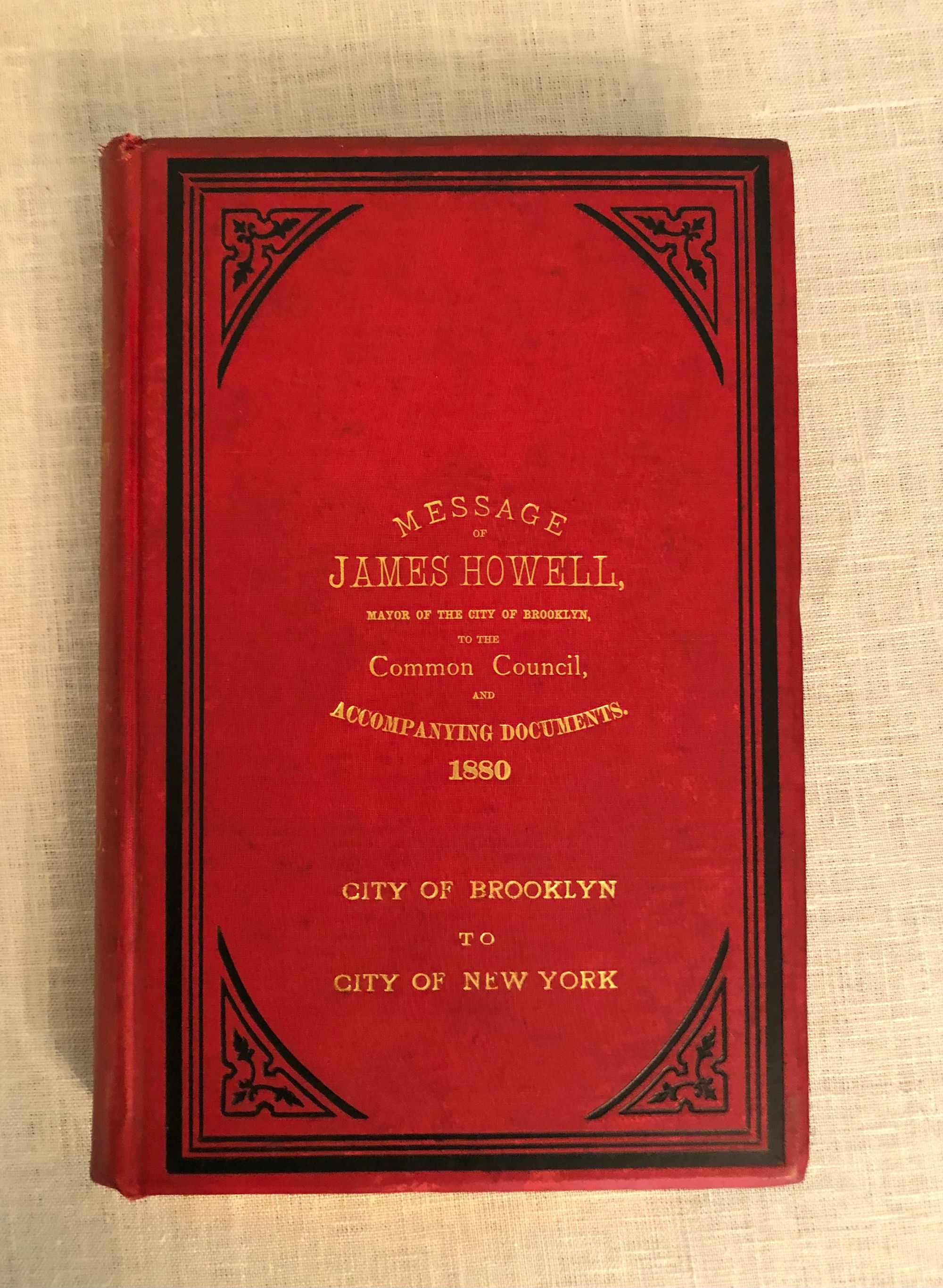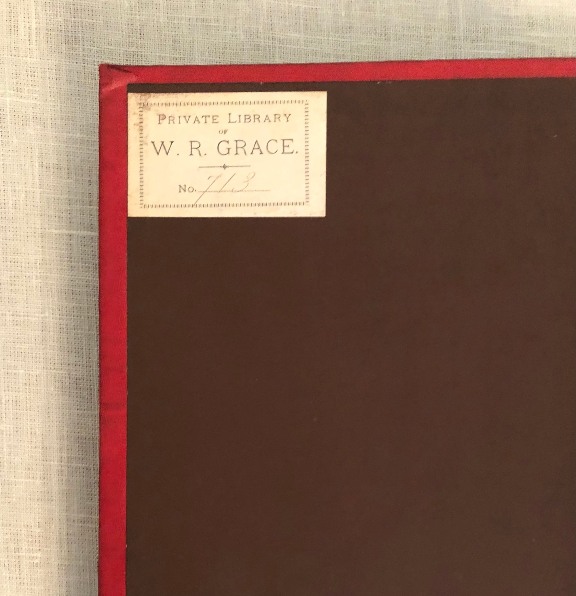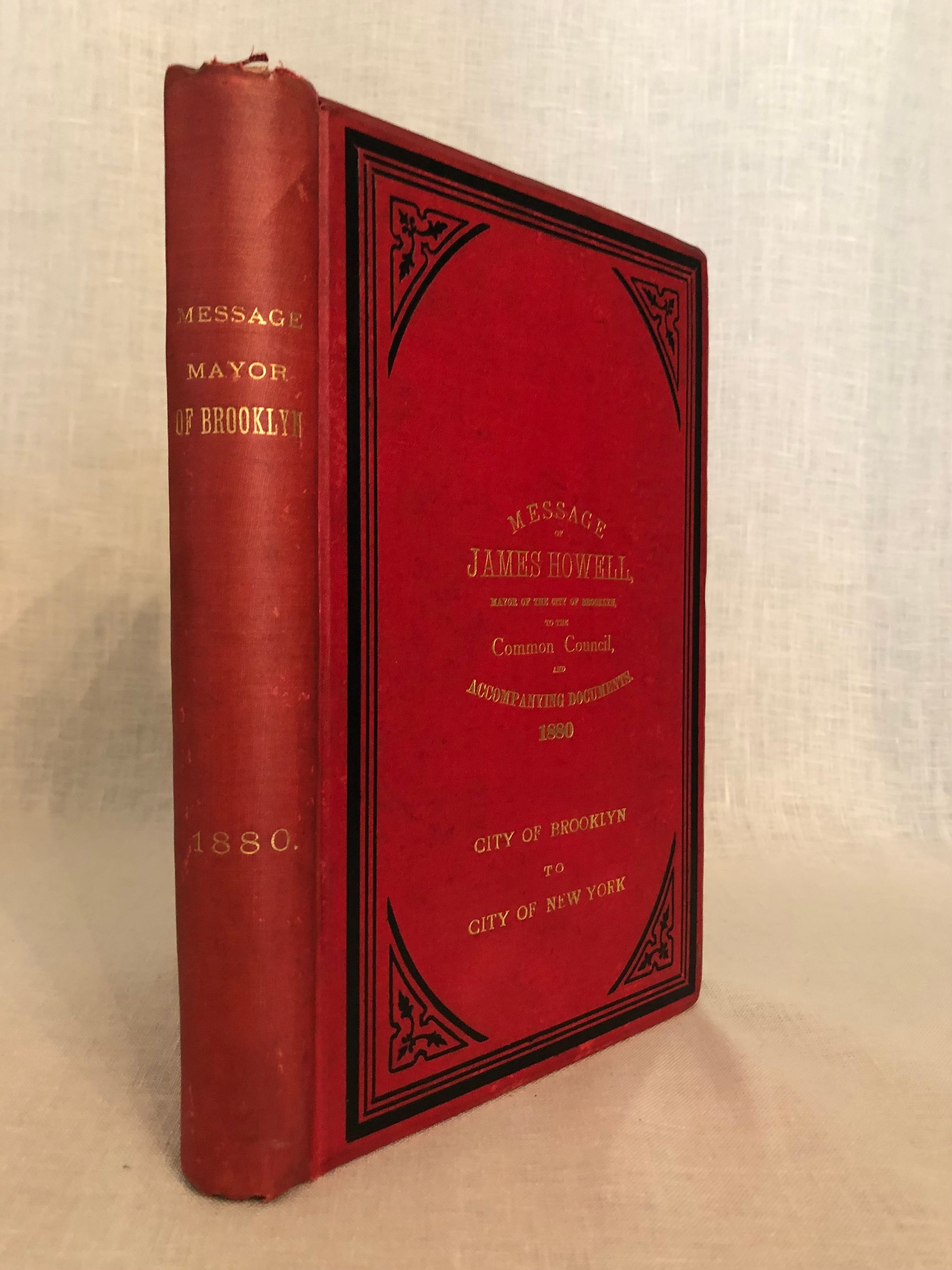 196pp. Octavo (5 ¾" x 8 ¾"). In publisher's red cloth binding with gilt lettering and black decoration. Condition: About Very Good, with some light soiling/wear to covers. Large tear to tissue paper pullout of taxes for 1877. Labeled "Private Library of W.R.Grace. No. 713" to front pastedown. Stamped "Received APR 21 1880 MAYOR'S OFFICE." to title page and pages 57, 79. Light pencil annotations to "Mayor's Message" chapter. *** William Russell Grace (1832-1904) was the Mayor of New York City from 1881-1882 and 1885-1886. He was the founder of W.R.Grace and Company, a major American chemical business. Grace left his native Ireland in 1846 during the Great Famine (sometimes called the Irish Potato Famine), and subsequently traveled with his father, James Grace, to Peru to establish an Irish agricultural community. His father returned to Ireland, but William Grace stayed in Peru and established W.R.Grace and Company. The company was later headquartered in New York, where Grace ran for mayor on a reform platform against the infamous "Tammany Hall" political machine. In his second term of office, Grace received the Statue of Liberty for America as a gift from France. *** The book contains facts & figures for the New York suburb of Brooklyn for the year 1887. *** James Howell (1829-1897) was the mayor of Brooklyn from 1878-1881. His oversaw the final stages construction of the Brooklyn Bridge, known at the time as the East River Bridge, which is mentioned in this book.