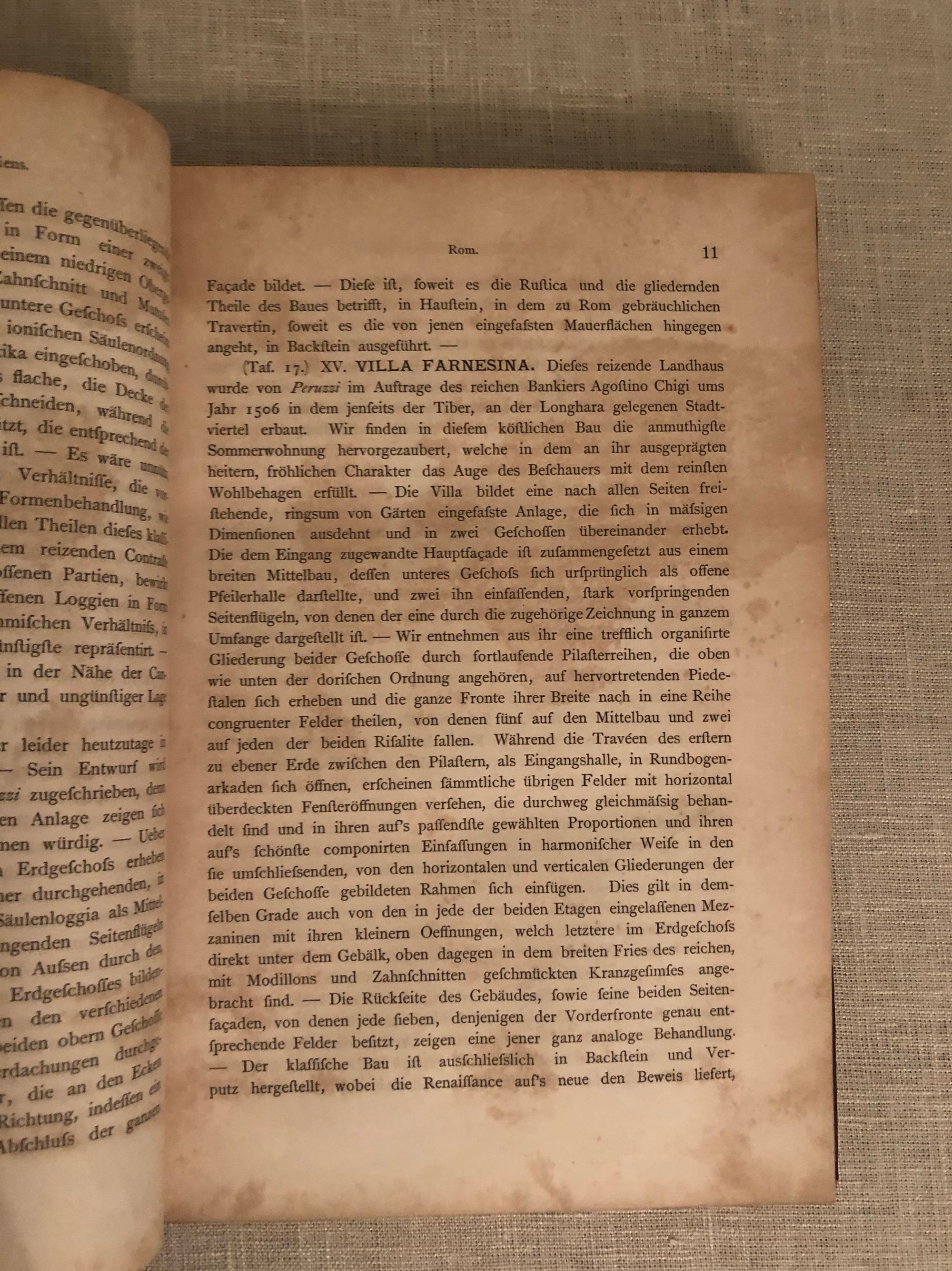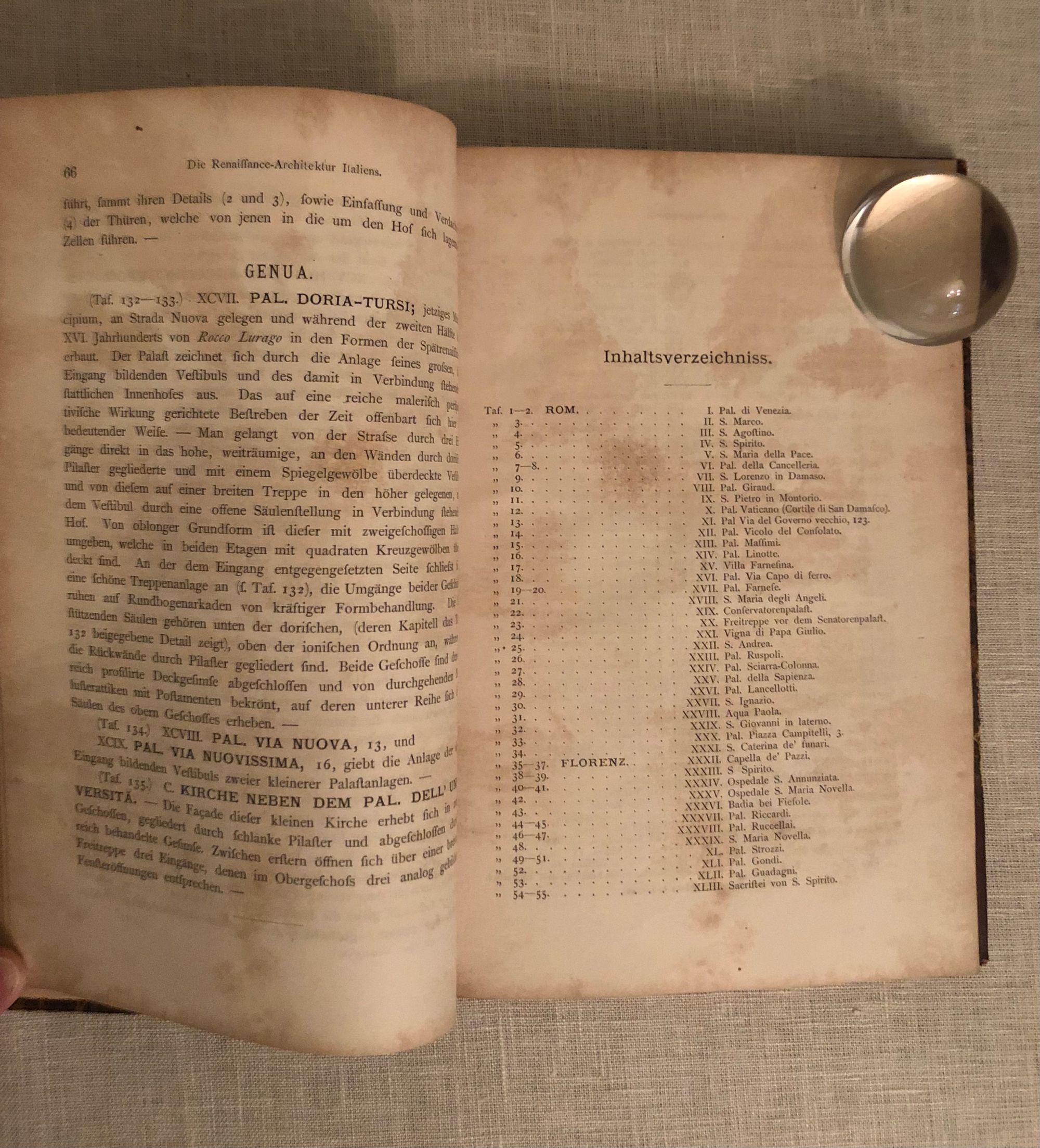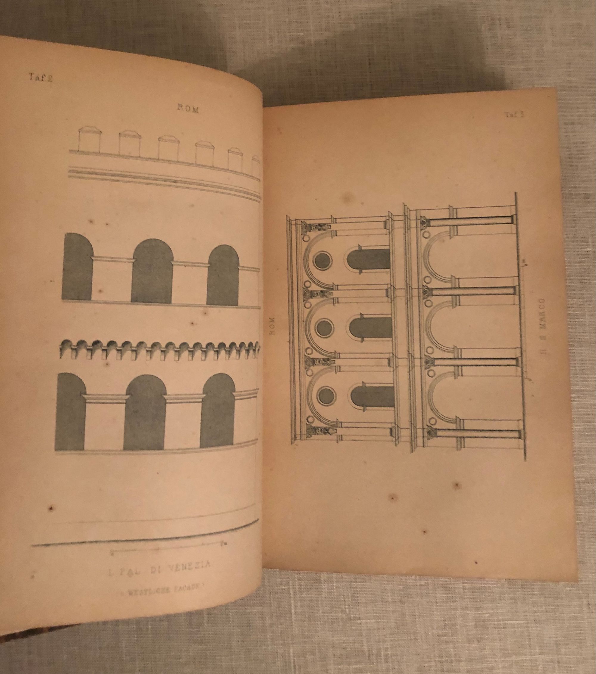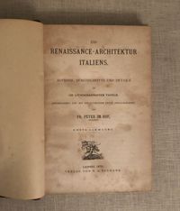 Hard cover, octavo (8 ½" x 5 ⅝"). pp iv 66 [2] + 135 plates. In three-quarter leather binding over marbled boards. Condition: Good, with wear to covers and age-toning to the pages. *** Wonderful collection of plates showing architectural drawings (elevations and plans) of Italy including Rome, Florence, and Siena. German text.