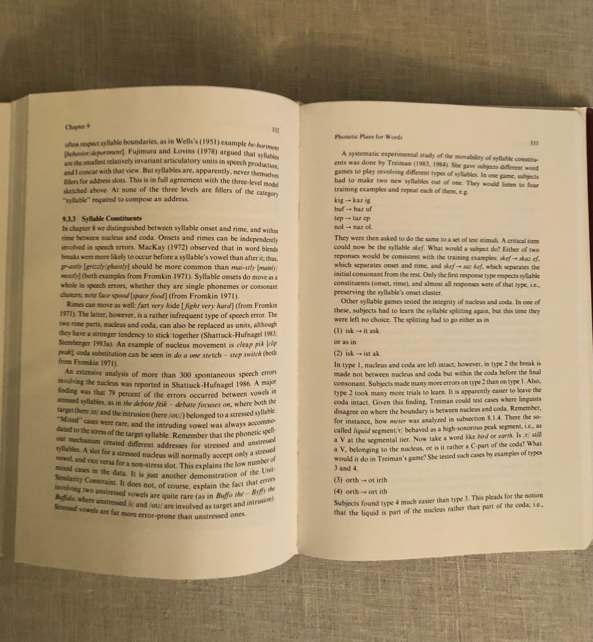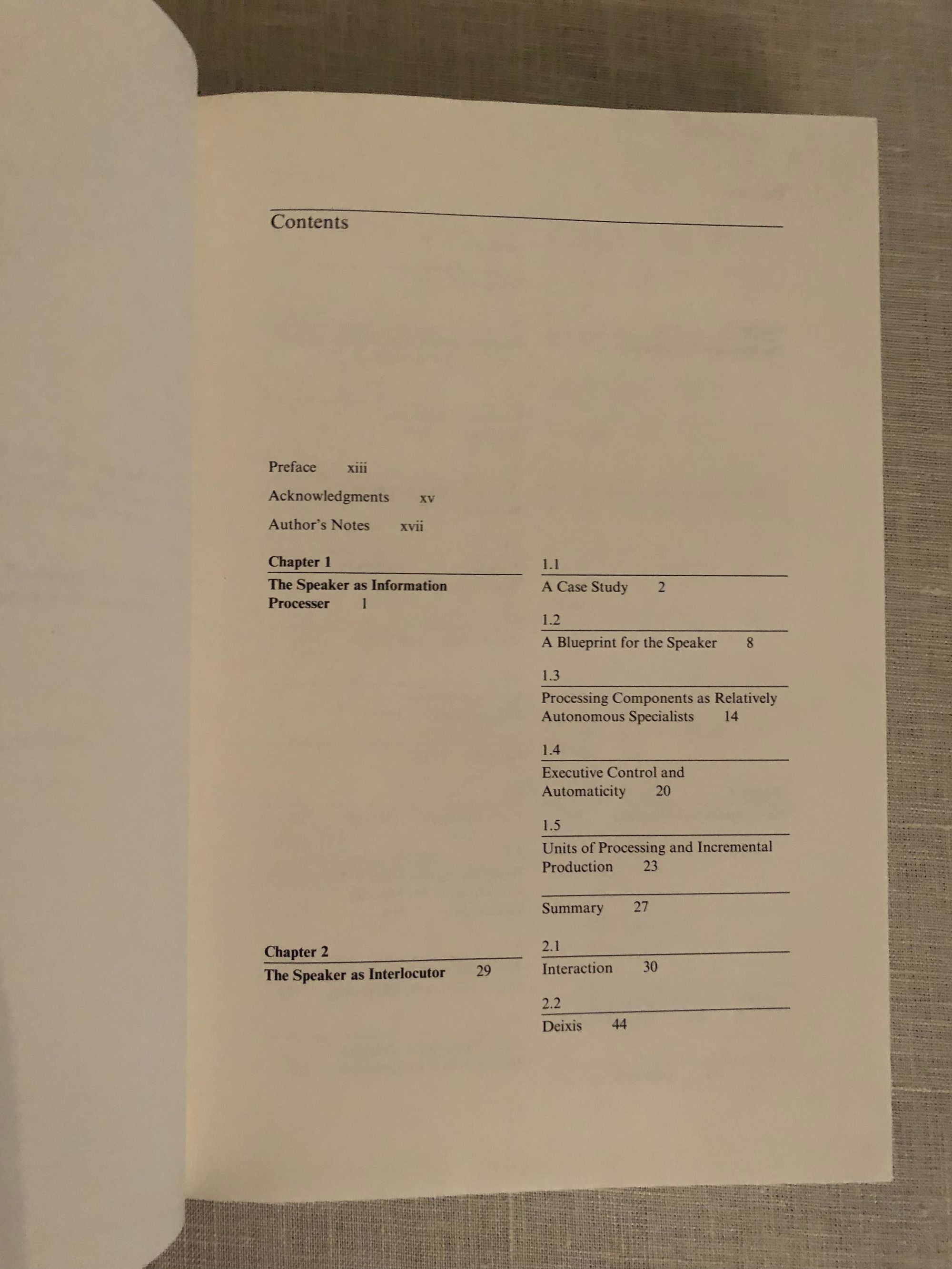 Hard cover, in red cloth with white title to spine, in dust jacket, 566pp.Condition: Very Good in a Good dust jacket. From the blurb: "...covers the entire process of speech production, from constraints on conversational appropriateness, to articulation, and self-monitoring of speech." From the ACL-MIT Press Series in Natural Language Processing. The Author, Willem J.M. Levelt (b. 1938), is the founding Director of the Max-Planck Institut für Psycholinguistik, located in Nijmegen, The Netherlands.