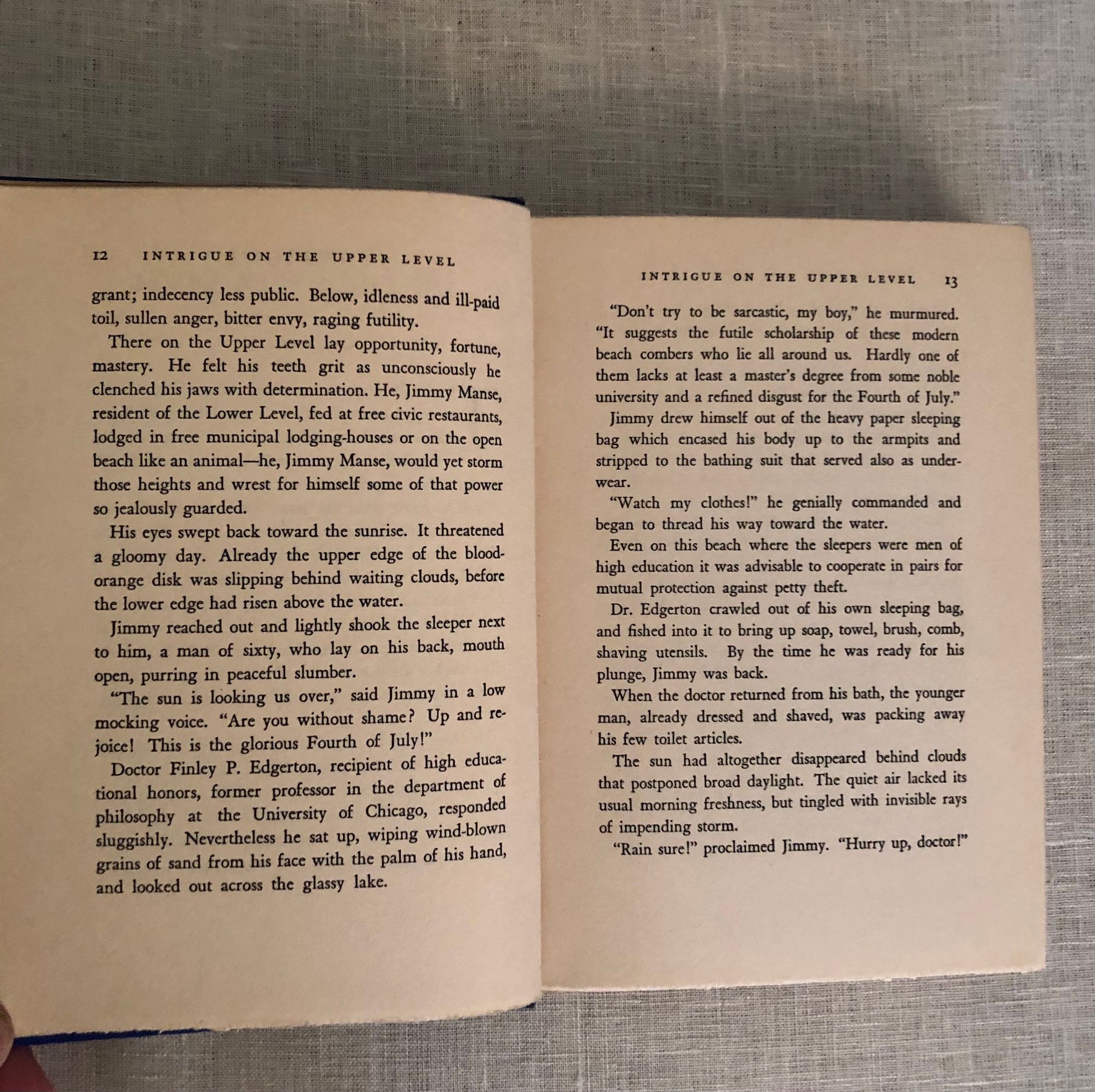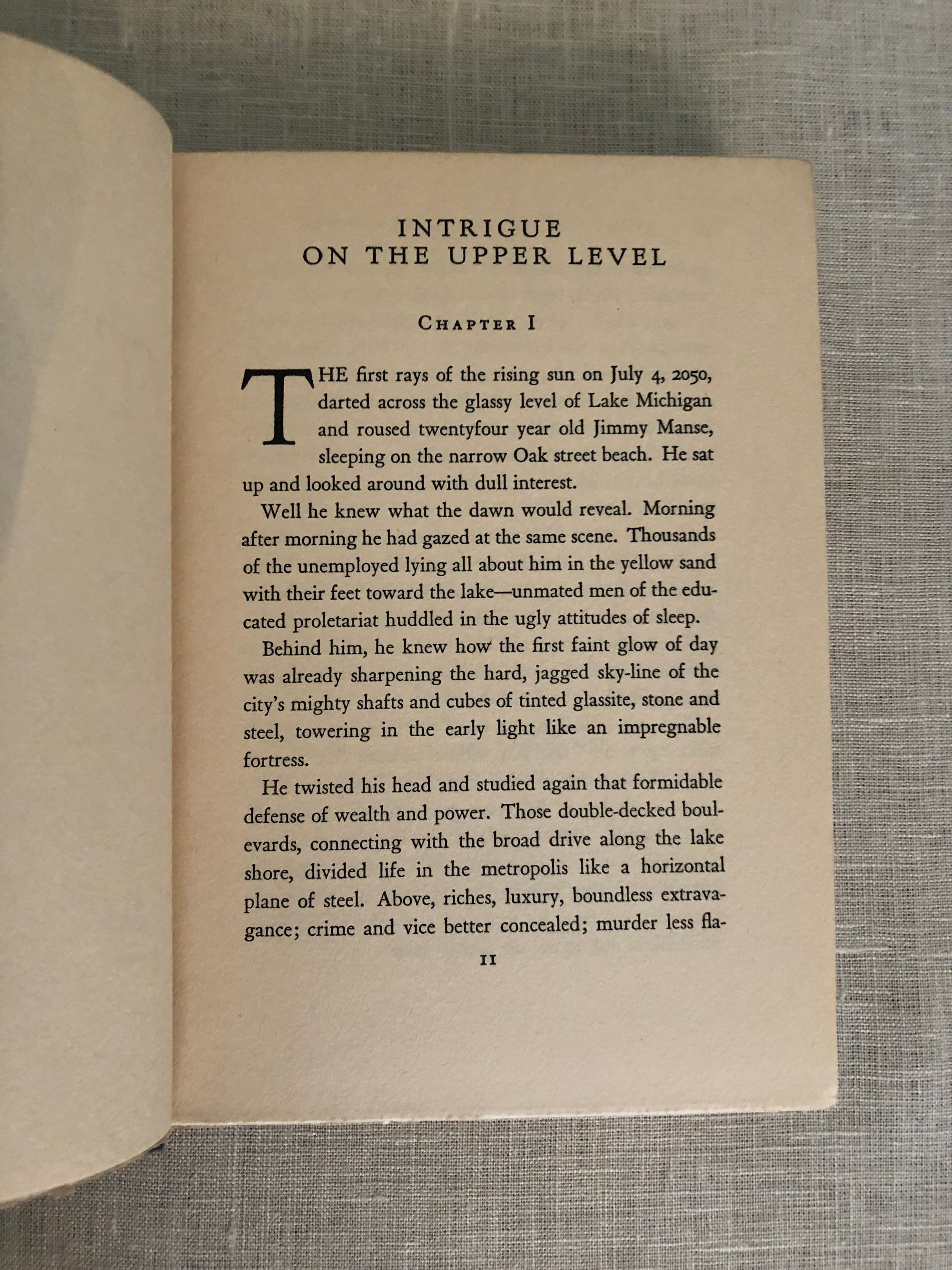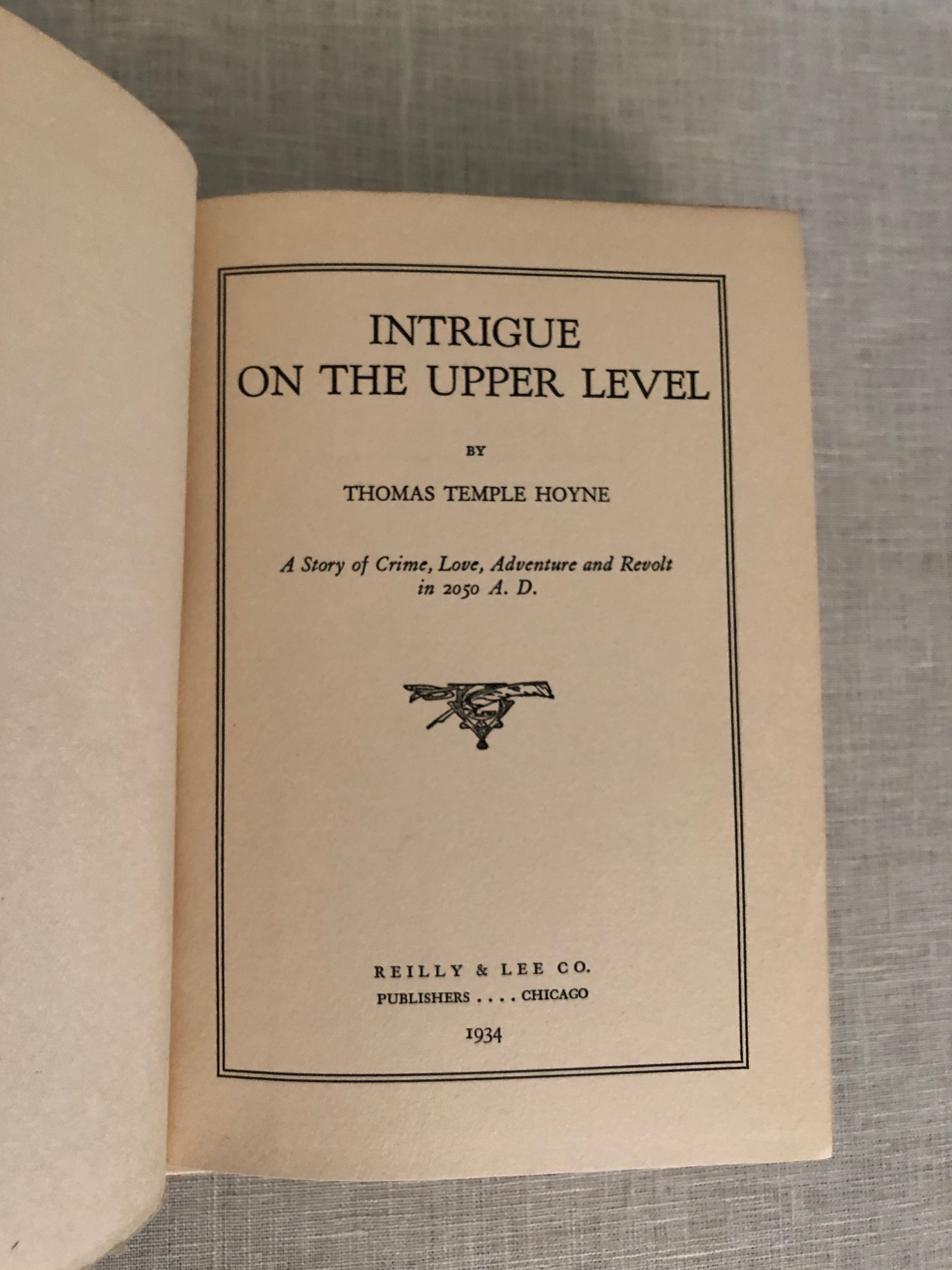 Hard cover, 8vo., in blue publisher's cloth with titles in silver. The Reilly and Lee Co.,Publishers, Chicago,1934, First Edition. Condition: Very Good Minus, with slight edge wear and corners lightly bumped. Lacking d/j. Interior is moderately age-toned. There is a small price stamp on rear fly, otherwise clean and not written on. "A Story of Crime, Love and Revolt in A.D. 2050." This dystopian, futuristic novel set in 2050's Chicago was the only such work imagined by the author Thomas Temple Hoyne (1875-1946). His several prior works all concerned topics on economics. The fictional world of Hoyne is filled with much conflict between the have and have-nots, who are literally divided between the lakeshore Lower Level of the poor and the castellated Upper Level, hovering, seemingly unassailable, above. A thoughtful, and occasionally erudite, post-Great Depression cautionary tale. Bleiler p. 104.