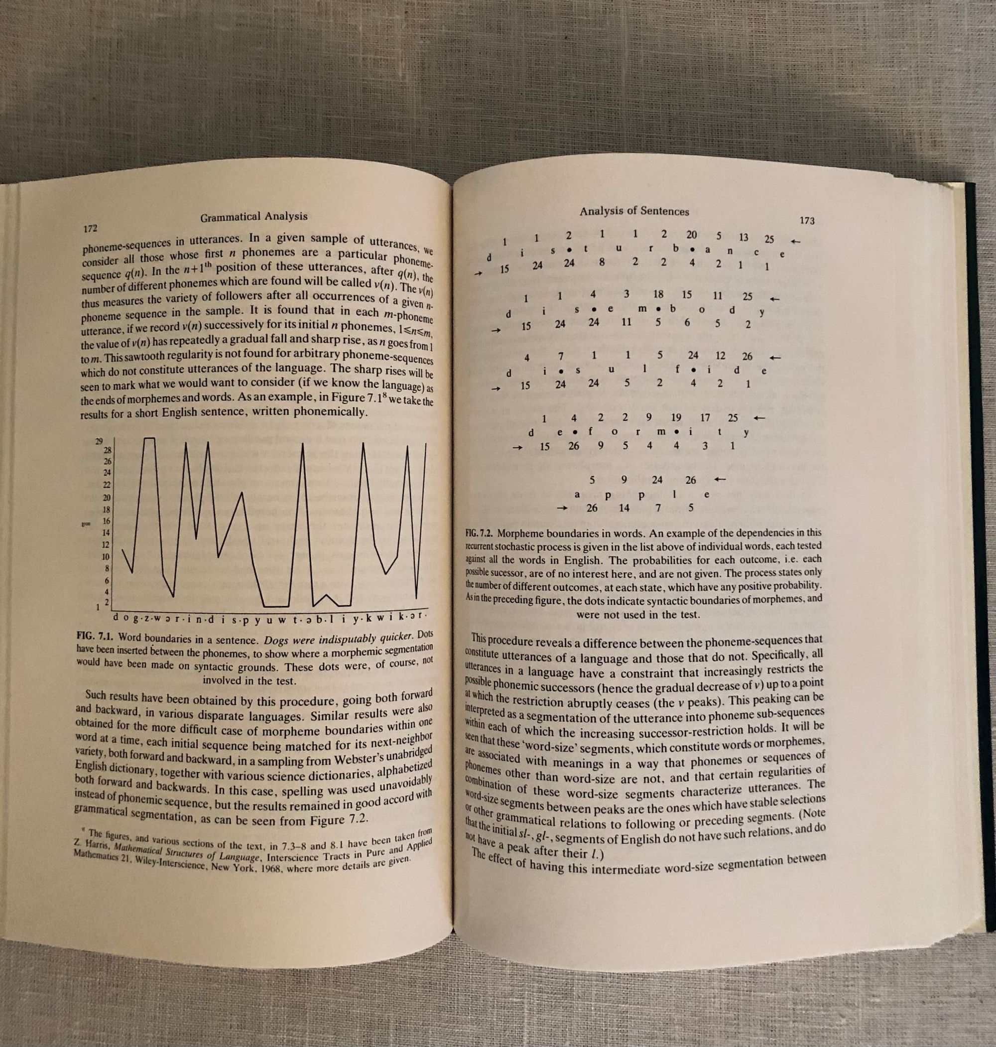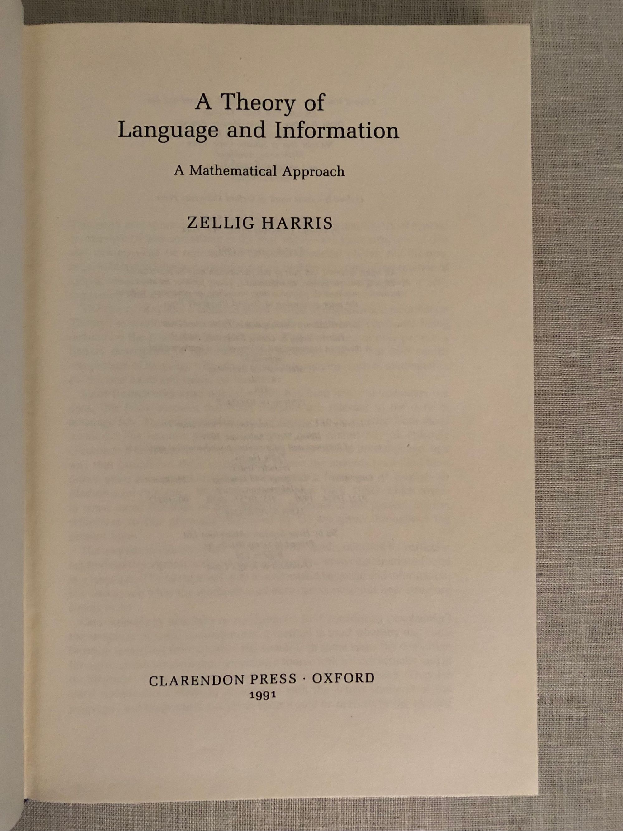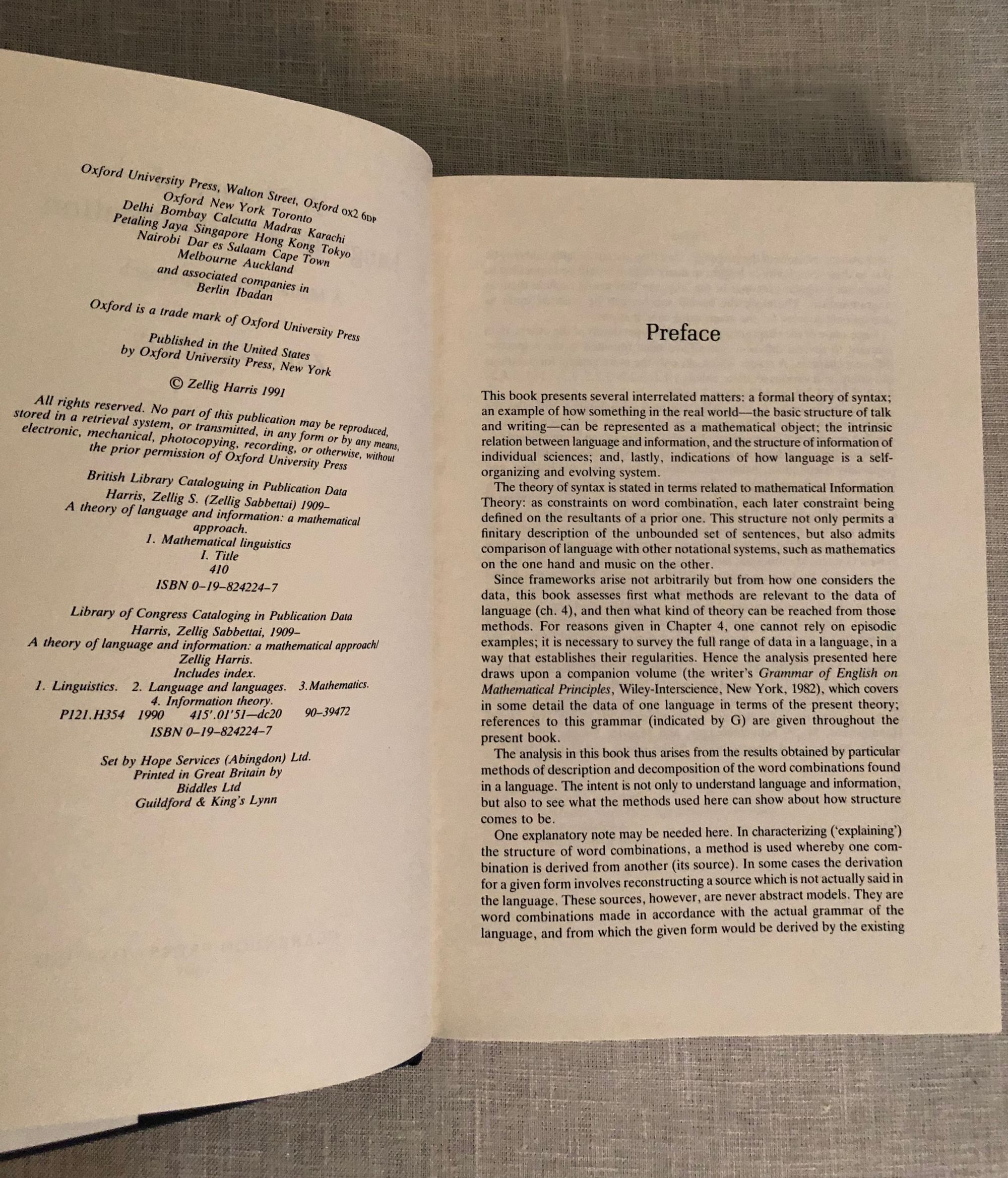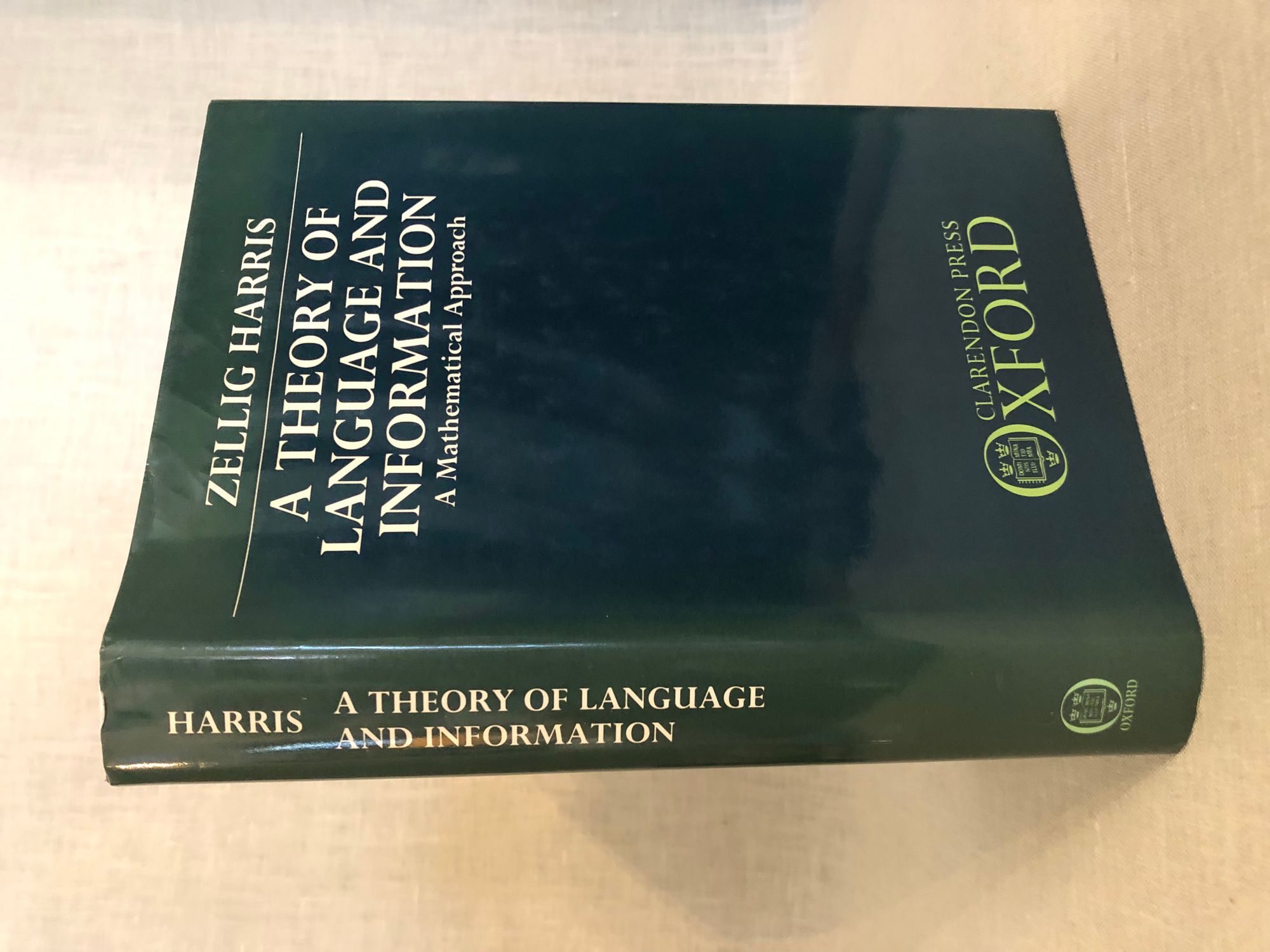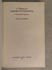 Hard cover, 8vo., (measuring 6 ¼ x 9 ¾ inches) in black publisher's cloth with gold printed title to spine, the dust jacket green with white and green print, in mylar. Xii + 428 pp. The discussion of language development is compared to combining words into a mathematical object, where "each departure from equiprobability is a contribution to the structure and to the meaning of a sentence. He discusses the differences in the structure and content of language, mathematics and music…" Zellig Harris (1909-1992) founded the first Department of Linguistics in the United States at the University of Pennsylvania. Condition: Very Good, with minimal rubbing to d/j, generally very clean and bright within. Owner's signature in pen to front fly.