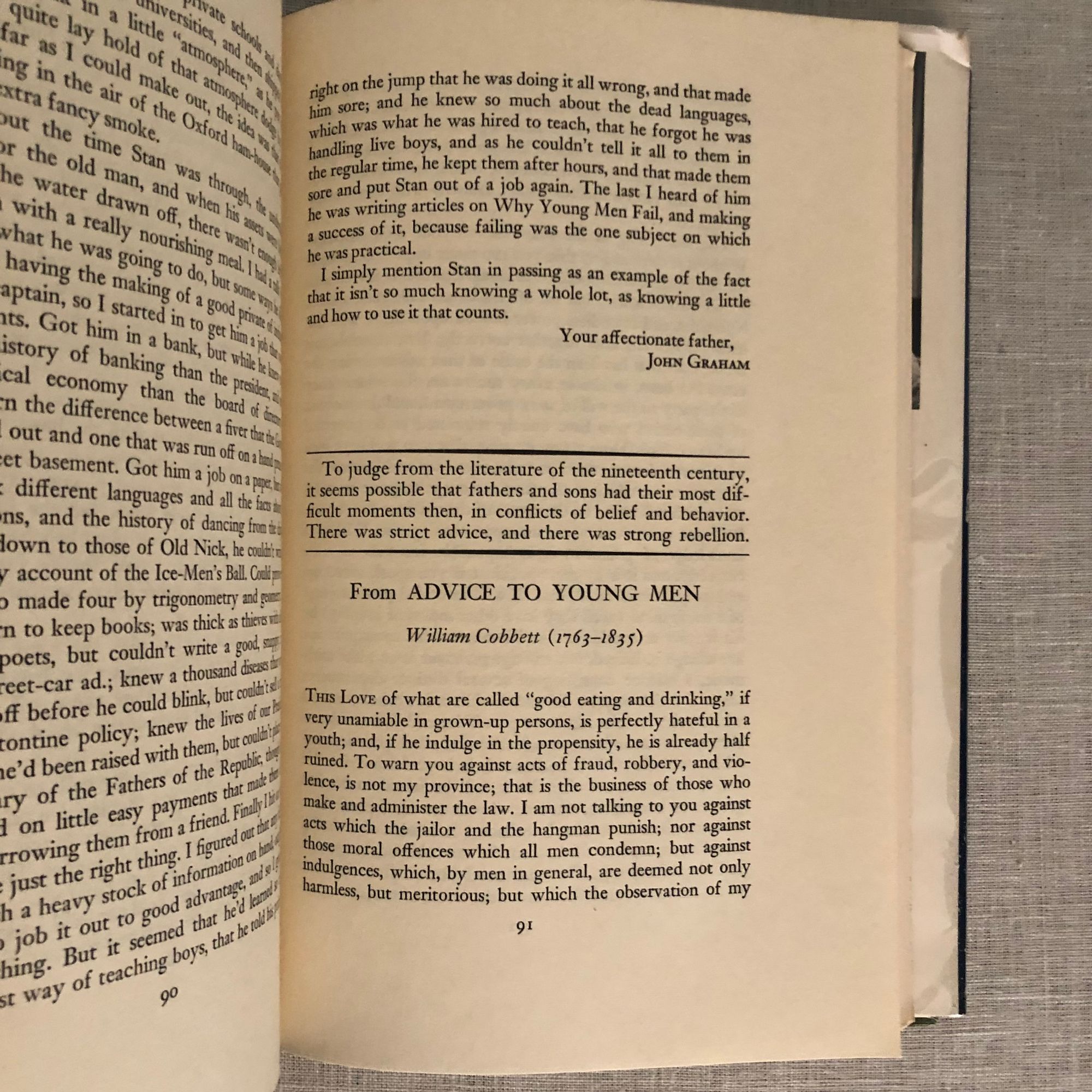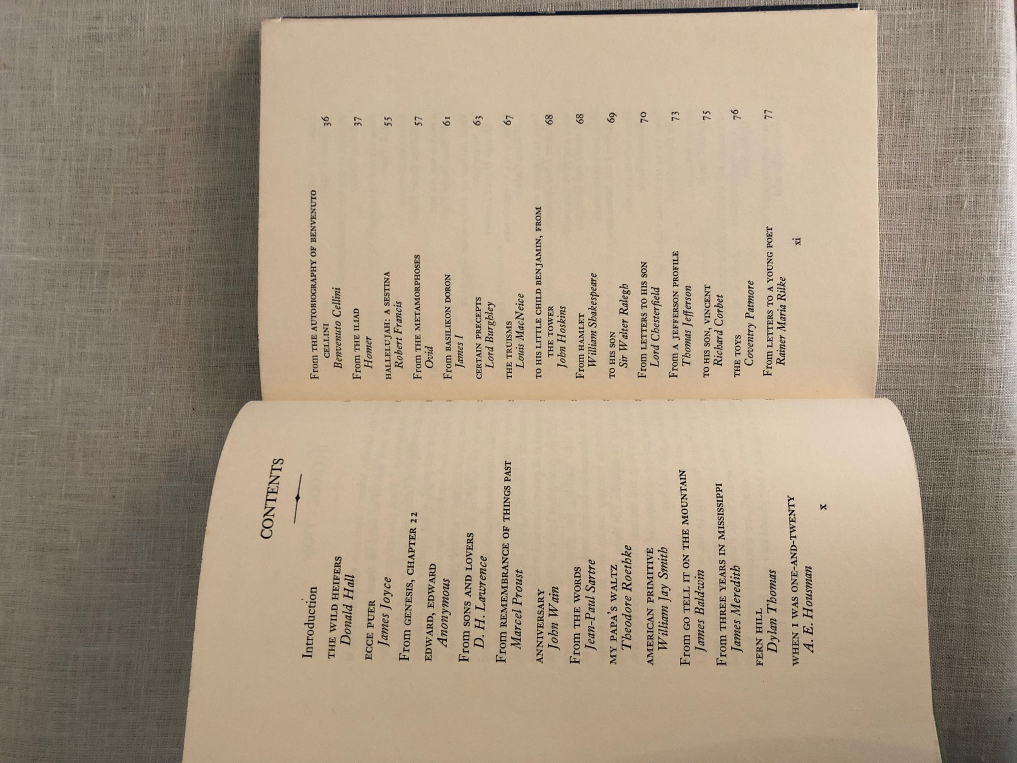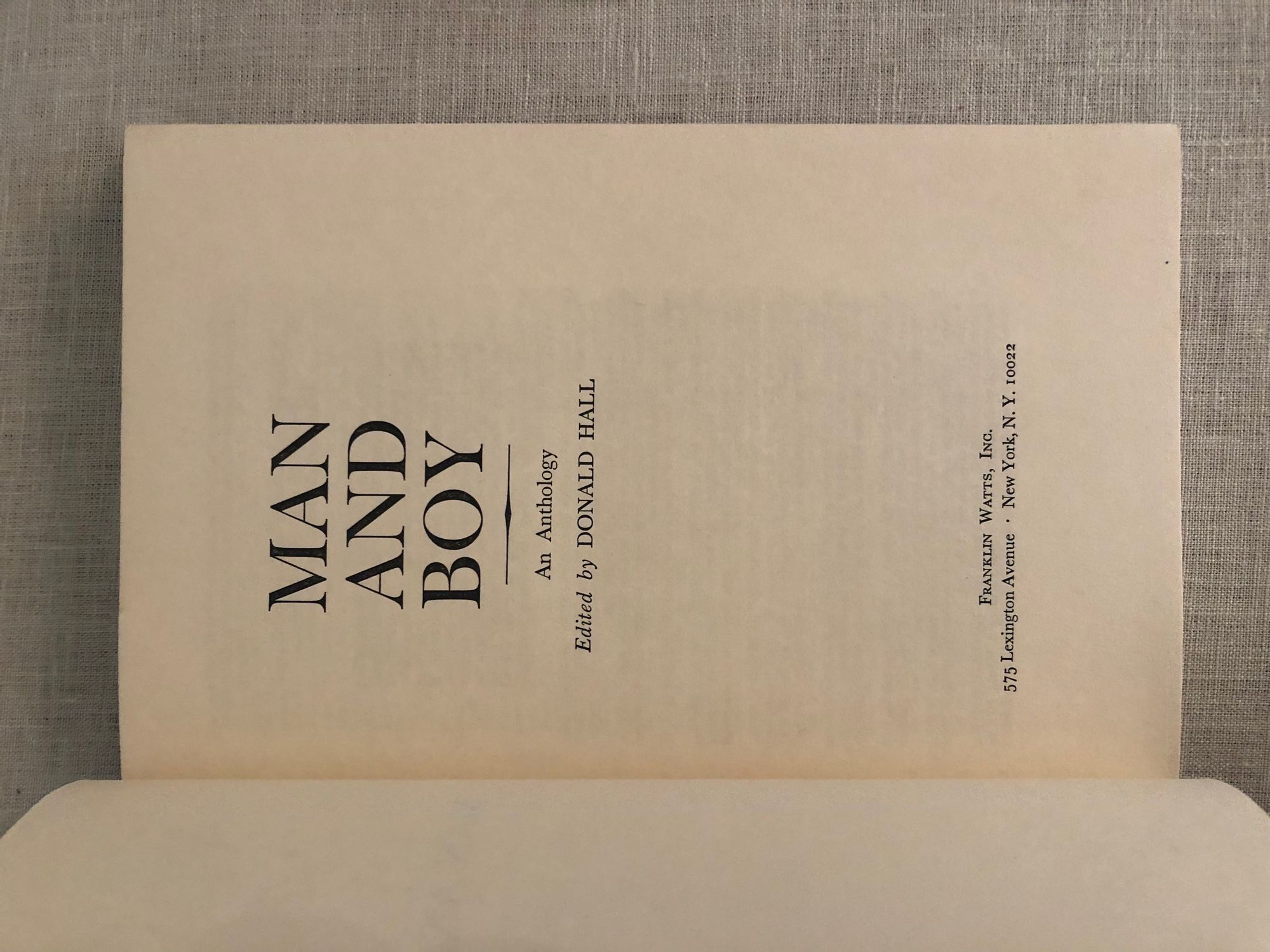 Hard cover, 8vo, (measuring 9 ΒΌ" x 6"). In publisher's olive cloth binding with black lettering and decoration,210pp. CONDITION: Very Good, in like dust jacket, which is now protected in mylar. Corners bumped. *** A scarce anthology by Donald Hall (1928-2018), Poet Laureate of the United States, and author of children's books including the Caldecott Medal winner, "Ox-Cart Man" (1979). This book contains poetry and prose concerning grandfathers, fathers and sons - from reminiscences to advice - including authors such as James Joyce, Ovid, D.H.Lawrence, Jean-Paul Sartre, James Baldwin, William Shakespeare, et al.