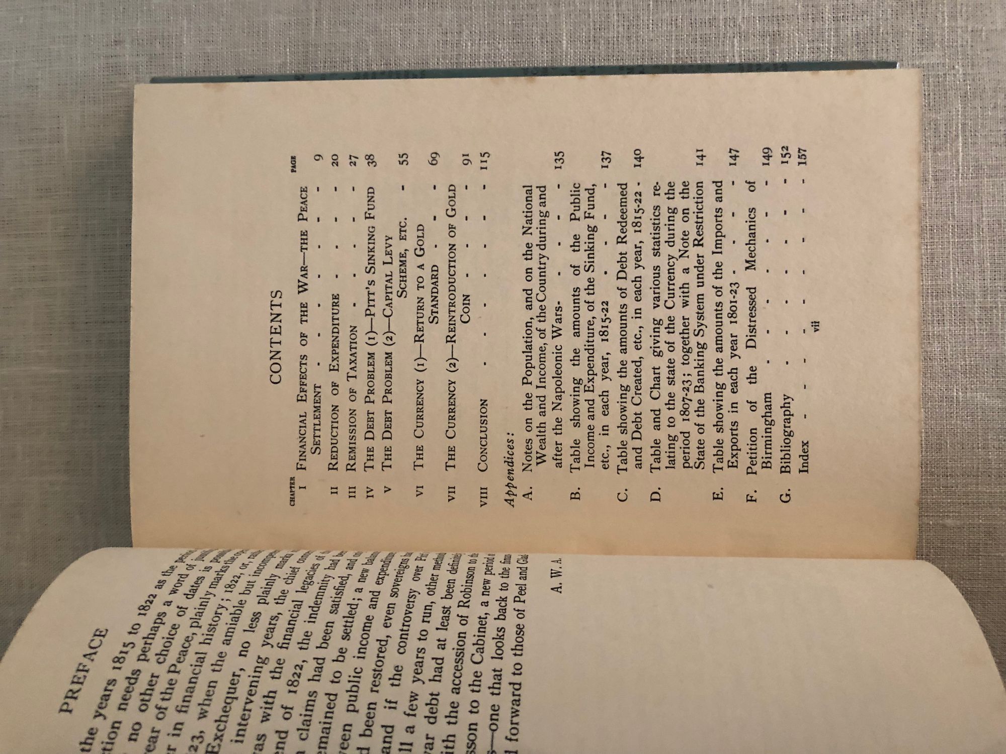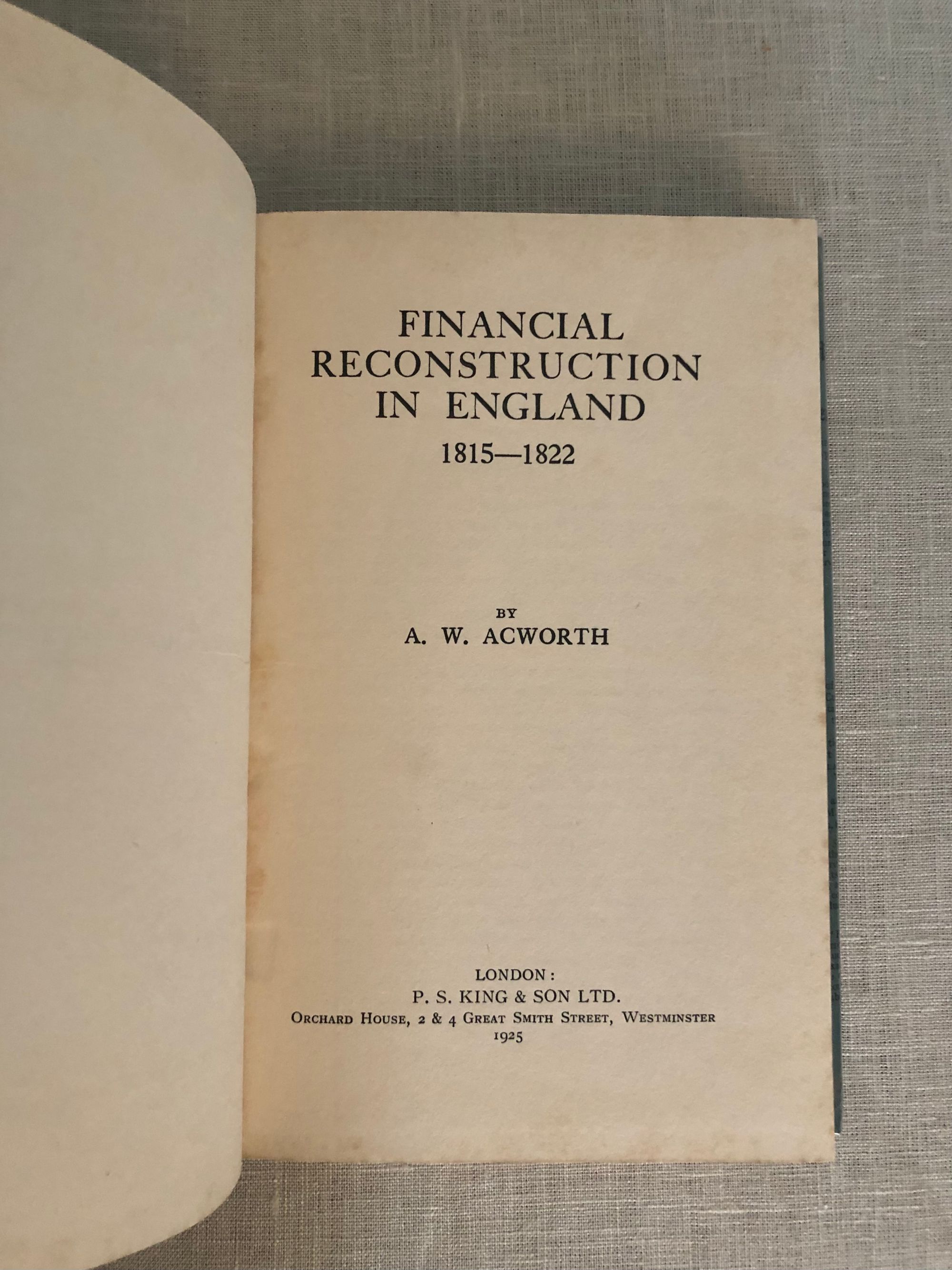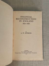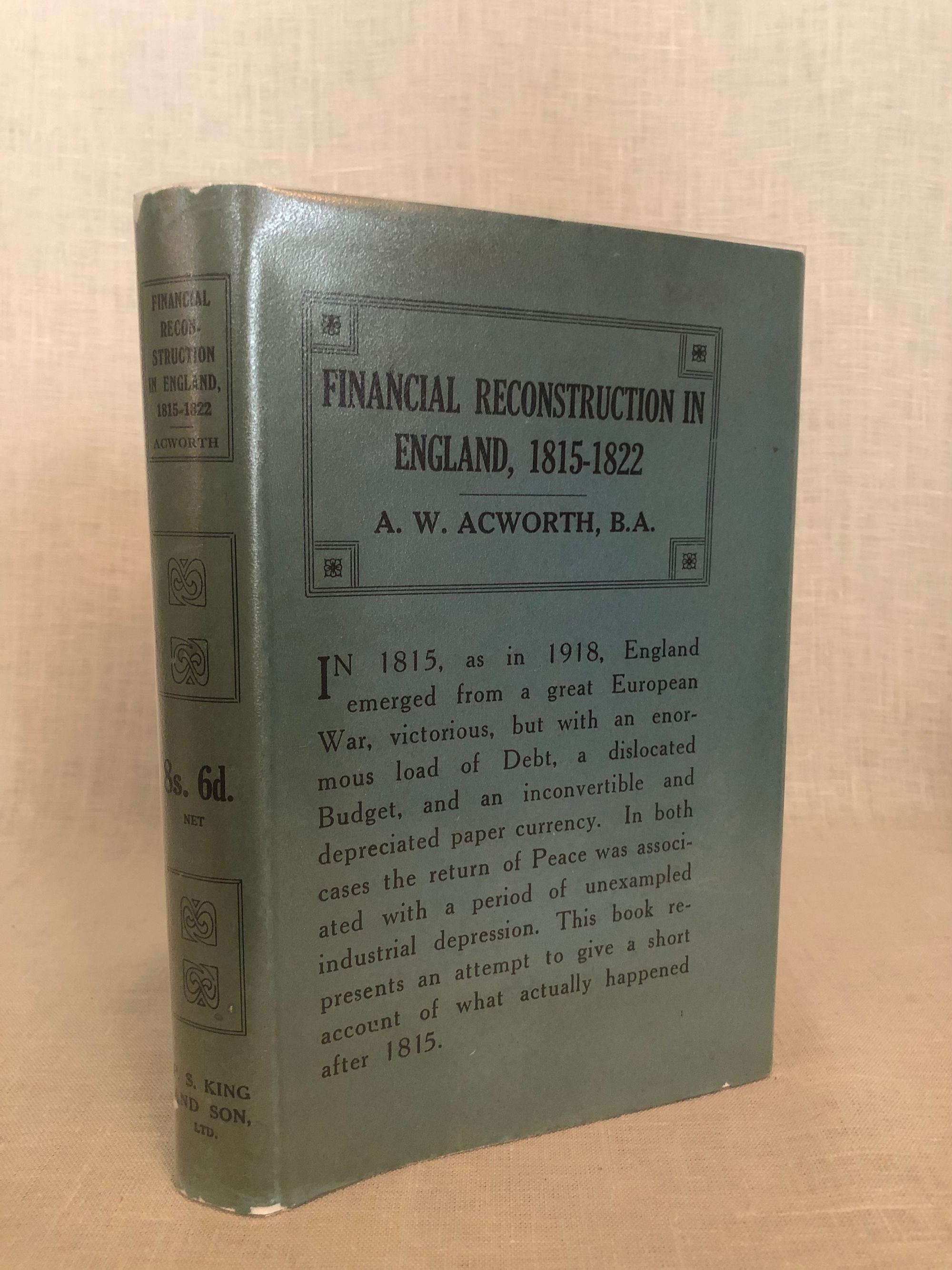 Hard cover, 8vo., pp viii 9-158 + 2pp ads + foldout chart. In publisher's navy cloth binding with gold lettering to spine, and including scarce dust jacket. Condition: Very Good in like dust jacket (now protected in mylar), but with some chips to dust jacket and some wear to the top & bottom edges of the covers. ** Written in the aftermath of WWI, this work attempts to draw parallels between the economic situation in Europe in the 1920s, versus the conditions after the Napoleonic wars of the previous century. The author discusses the settlement after the Napoleonic wars, taxation, expenditure, debt, and the problem of maintaining (or not) the gold standard. *** The author, Angus Whiteford Acworth (1898-1981), was a financier and keen conservationist. He visited Jamaica in 1946 at the request of the Jamaican Historical Association, and published "Treasure in the Caribbean: A First Study of Georgian Buildings in the British West Indies" in 1949. OCLC 3932589.