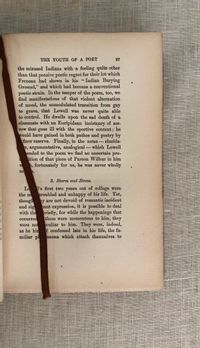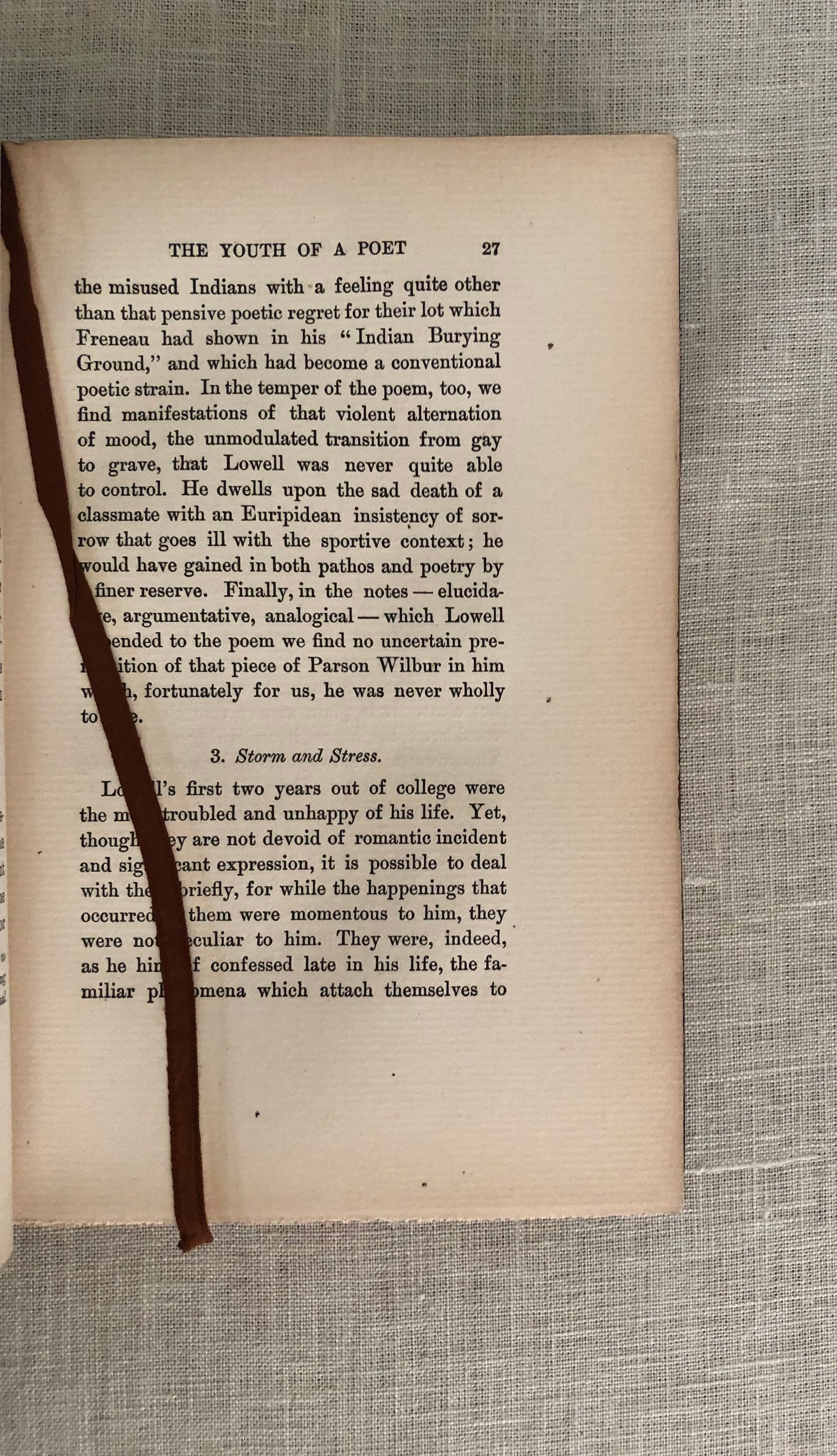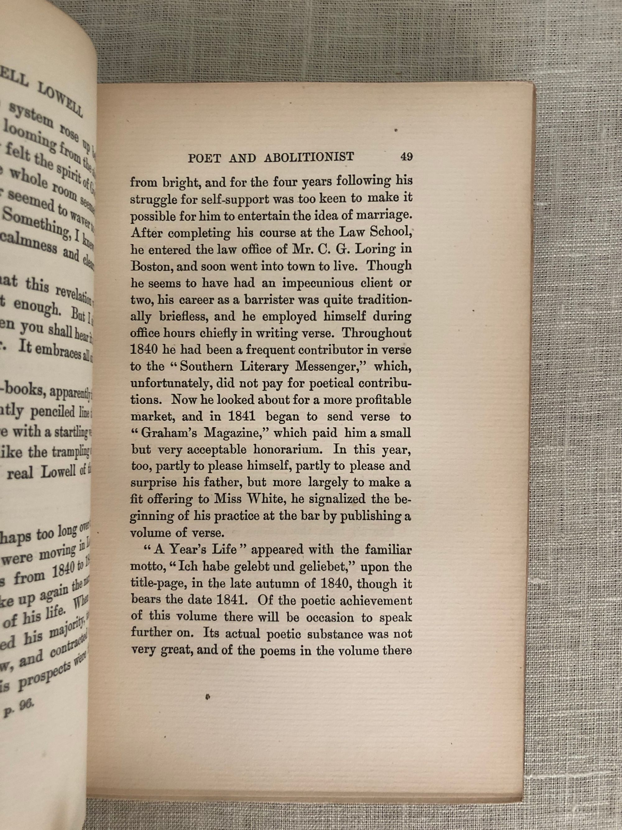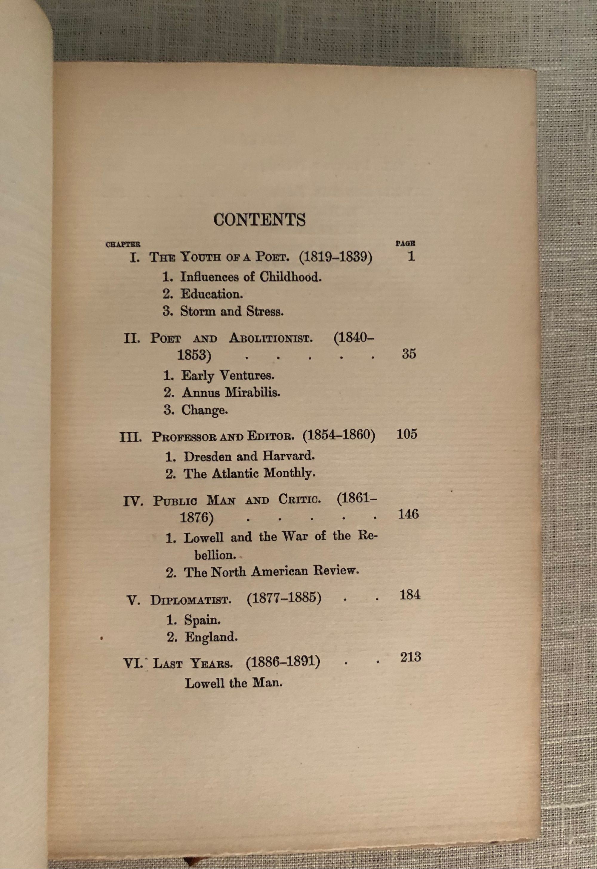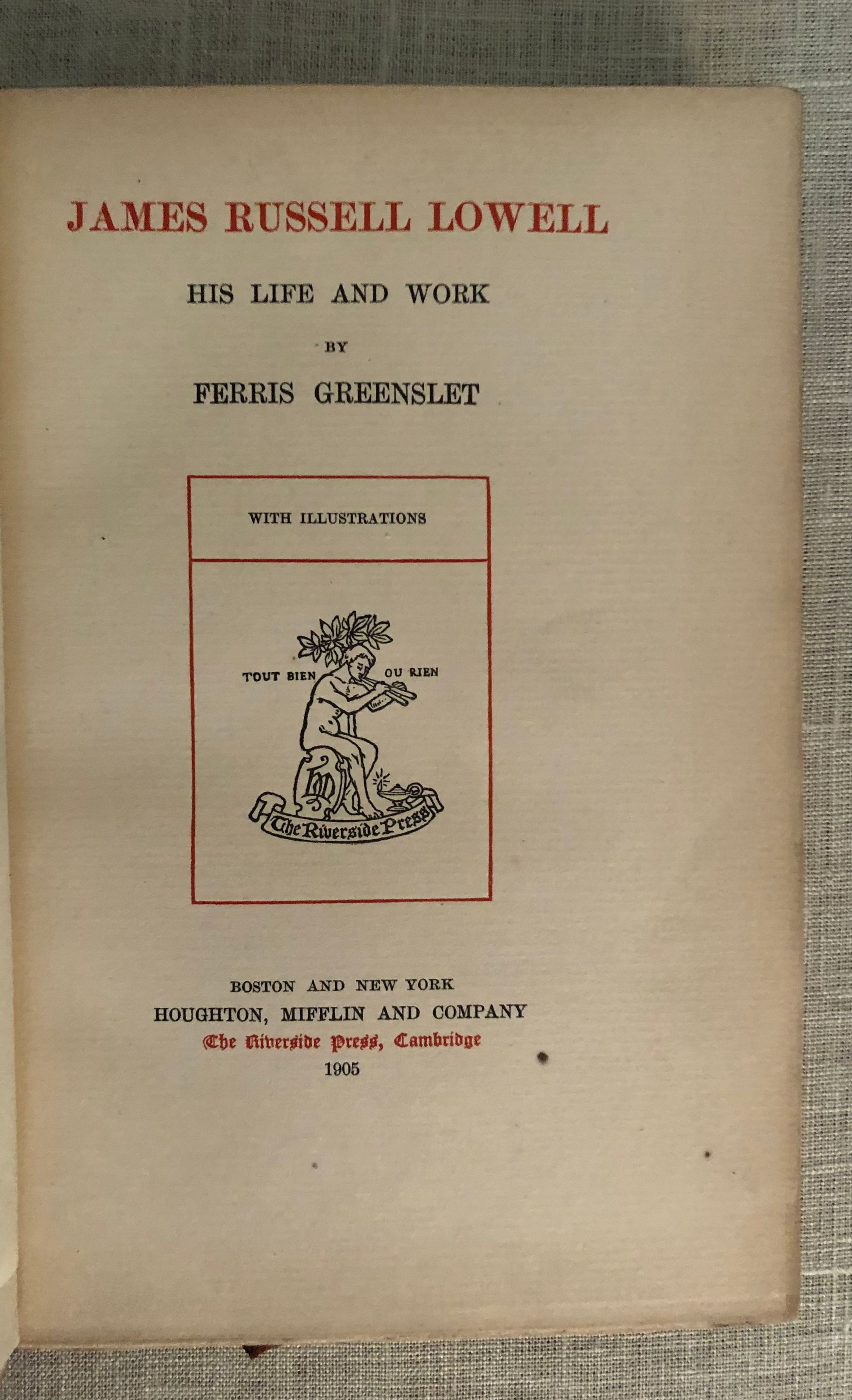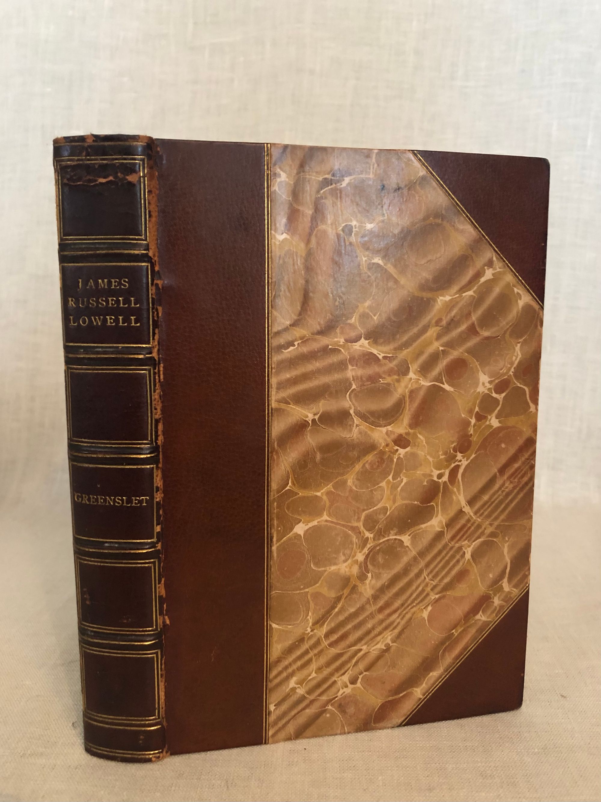 First trade edition, printed October 1905. Hard cover, 12mo., (measuring 5 x 7 ½ inches), in three quarter brown morocco with gilt, marbled paper covered boards, gilt title to spine with six raised bands, top edge gilt, glazed marbled endpapers, engraved bookplate of William Caleb Loring, inscription to ffep "William Caleb Loring from his loving wife-Christmas 1906." Includes five illustrations including engraved portrait frontispiece of the author. Condition: Very Good Minus. The volume is generally clean and tight, having had minimal use. The text is moderately age toned. The outer joints and top half inch of spine are notably rubbed. Fore edges dusty. This book once belonged to William Caleb Loring, an Associate Justice of the Massachusetts Supreme Judicial Court, and purchased from the estate of his descendants. Additionally, there is a connection of the book's subject, Mr. Lowell, to the Loring family; the book mentions Lowell's first job after Harvard Law to be in the Boston firm of Mr. C.G.Loring (page 49), where he apparently did little legal work and instead noodled around writing poetry. Also both the Author, Ferris Greenslet, a longtime director and literary adviser at the publisher Houghton Mifflin Company, and his biography's subject, were once editors at the Atlantic Monthly. The fireside poet's correspondence, among other sources, are used to cast light on Lowell's career as a poet, abolitionist and diplomat. This is listed among the works of book designer Bruce Rogers. (The Work of Bruce Rogers, Jack of All Trades: Master of One, American Institute of Graphic Arts and the Grolier Club, 1939. No. 735.)