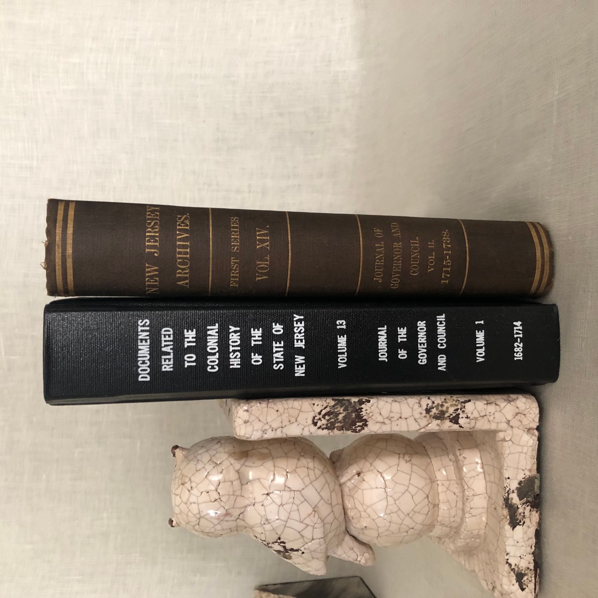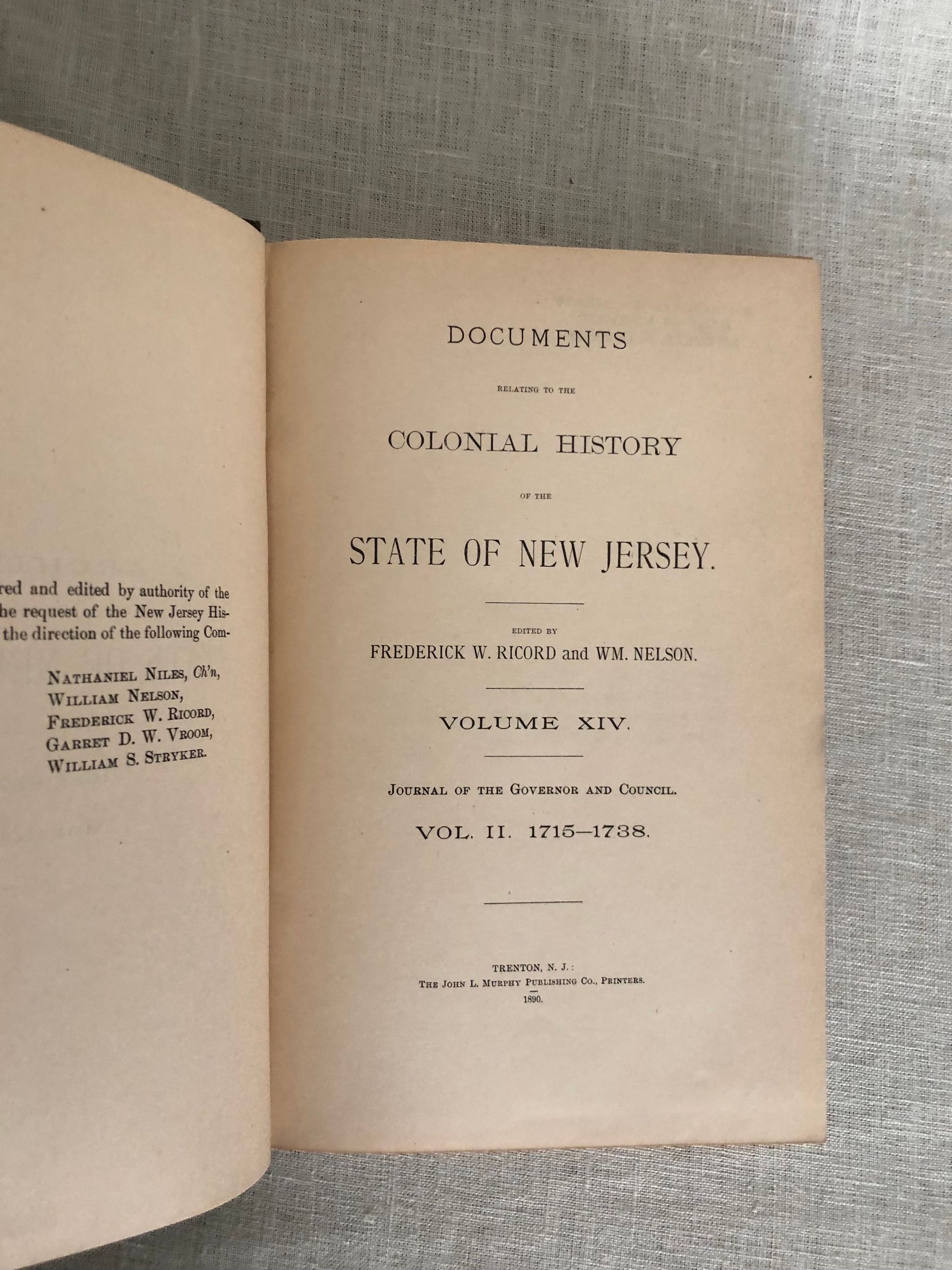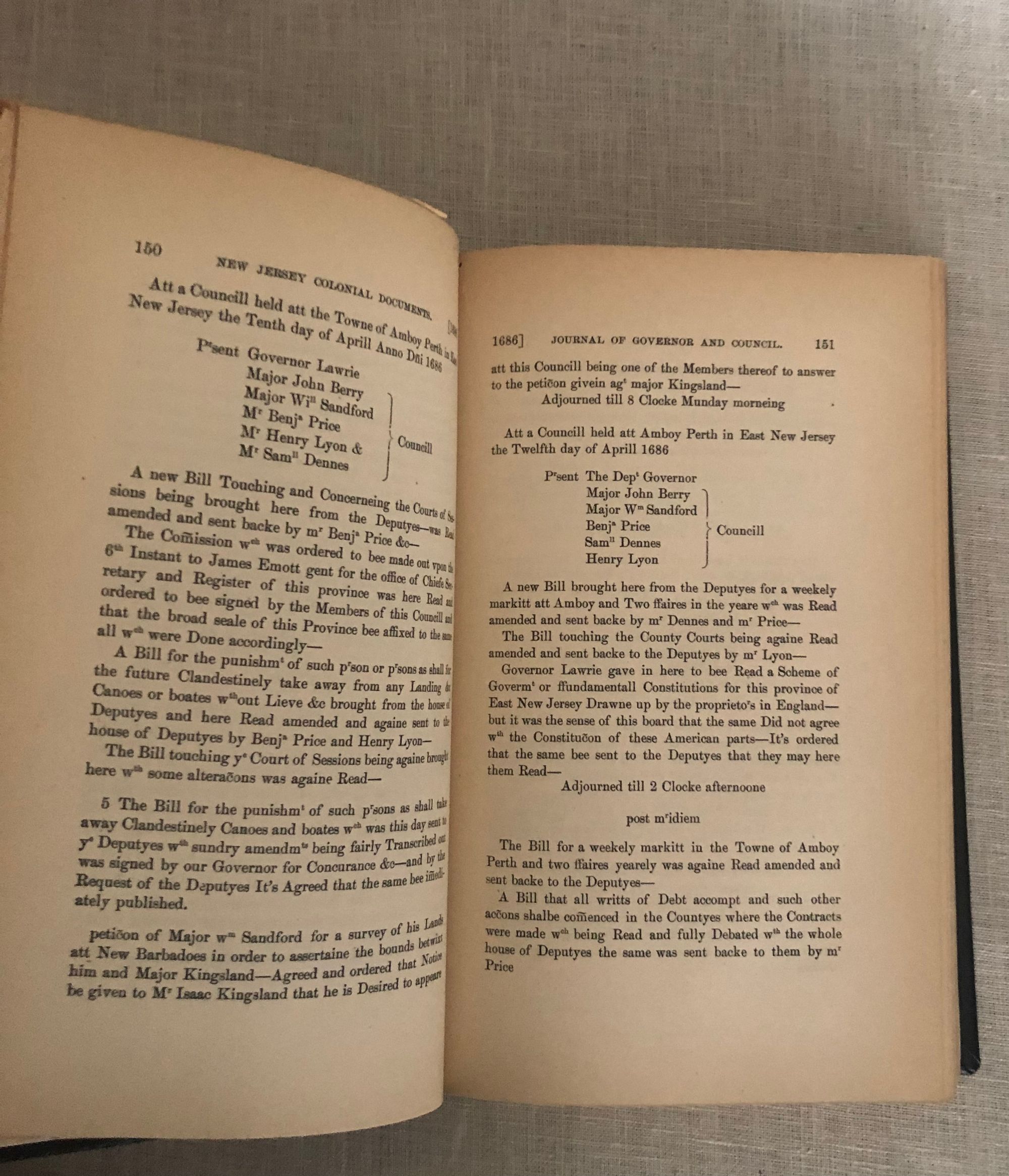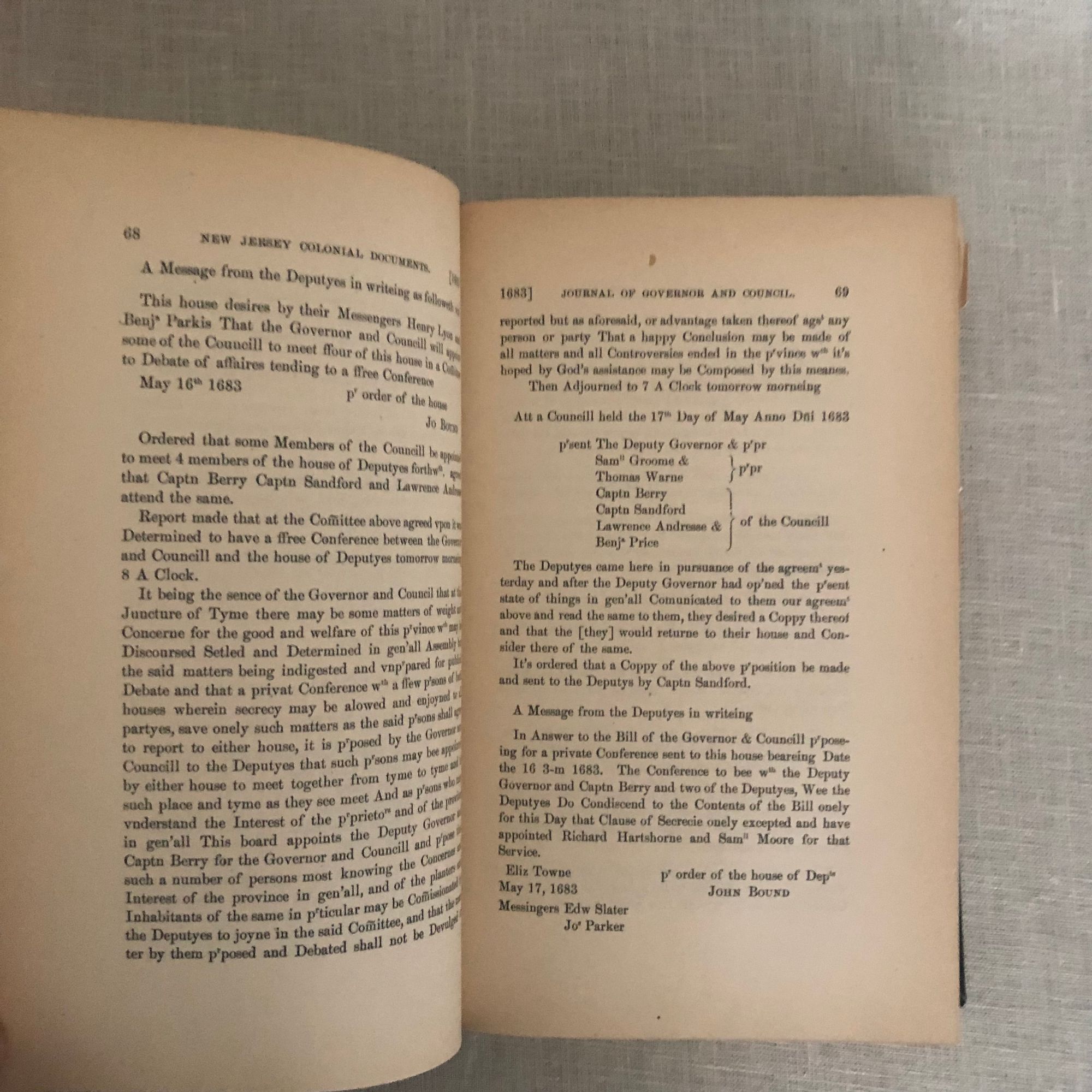 Hard cover, 8vo (measuring 5 1/2 x 9 inches), the first volume rebound in modern blue buckram, titles to spine in white ink. (xi), 580 pp. The second volume in the original blue cloth, blindstamped boards and title to gilt on spine, (ix), 567 pp. Both volumes include include Errata and Index. Both are ex-library, with identical discard stamps, pocket, stickers, and stamp to top edge. Condition: Overall, Very Good. Mild toning. Bindings firm. Vol. 2 has moderate wear to corners and edges and soiling to back cover. Original source material consisting of Minutes reported on the governance of the Province of East Jersey, beginning in 1682. The first order of business being the oath of allegiance to the King of England. This journal begins during the period of the partition of New Jersey into two separate administrative districts by the Crown, not reunited until 1702. It covers the rule, therefore, under Lord Proprietor (and later Governor) Philip Carteret (1639-1682), the dismissal of Deputy Governor Gawen Lawrie in the "quit-rents scandal, " and the 1688-89 period of takeover by the Dominion of New England under Governor Edmund Andros, which ultimately brought about the downfall and death of Carteret in 1682. The Introduction informs us: "The original manuscript volume containing this Journal is a stout folio, well bound in old sheep...The very existence of the Journal had been forgotten" until unearthed by a manservant clearing the house of a deceased New Jersey Statesman who delivered it among a great bag of books to Mr. Garret D. W. Vroom in Trenton. " He, in turn, delivered the item to the State Library where it was caused to be finally published in 1872.(Vol. 1, pp. v-vi) A fascinating, and relatively scarce, piece of early American political history.