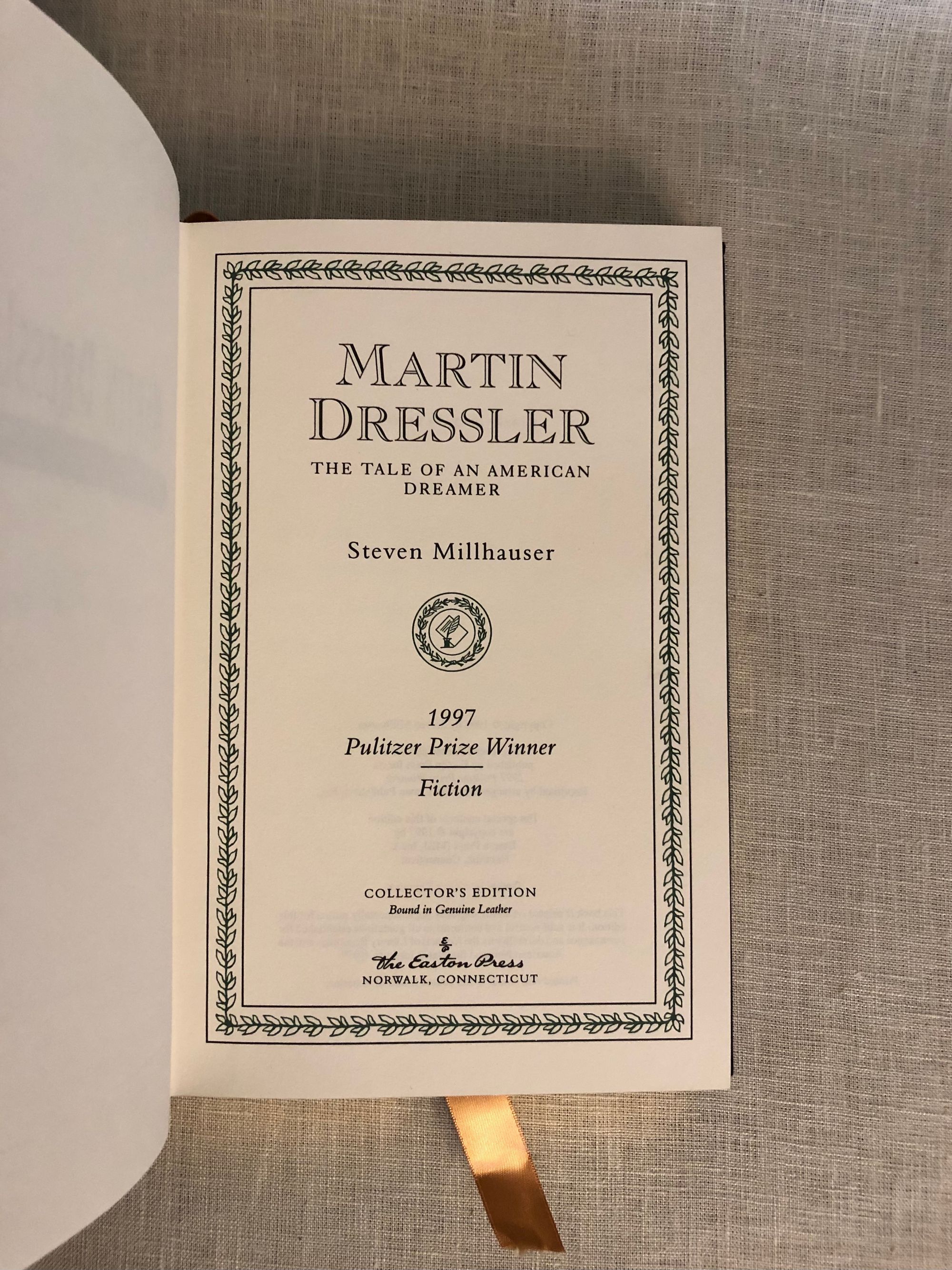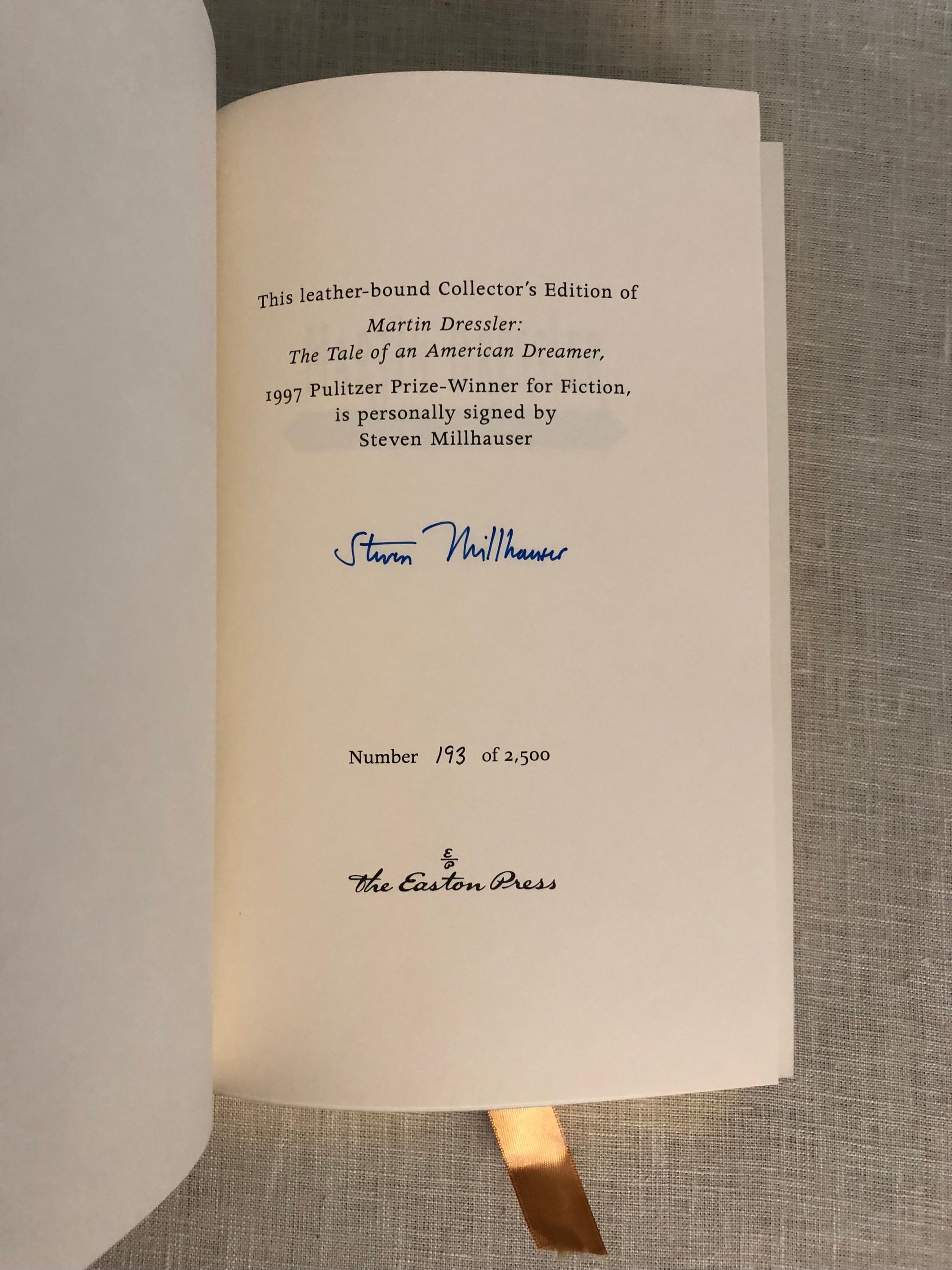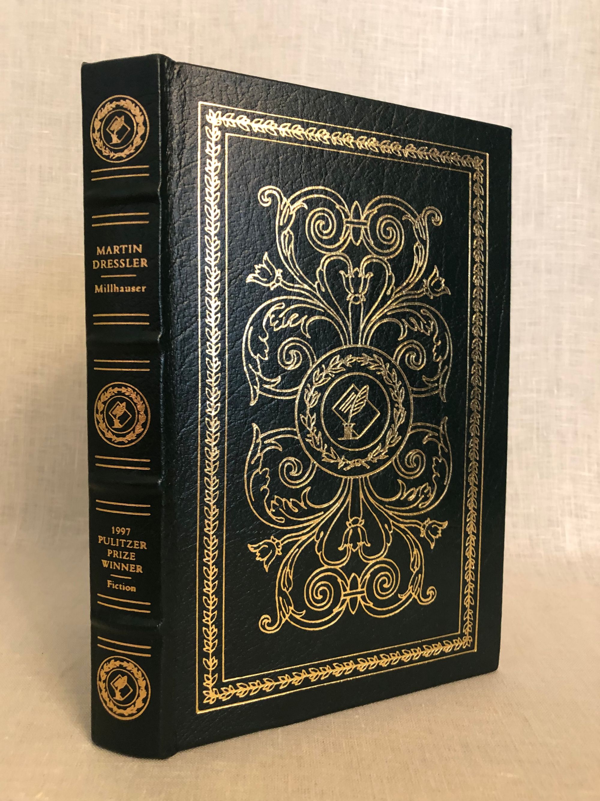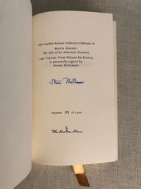 First Edition Thus. Signed Limited Edition, part of the 1997 Pulitzer Prize Winners Collection ( for Fiction), No. 193/ 2500, with Author's signature to the Limitation page. Hard cover 8vo. (measuring 6 x 9 ½ inches) in full forest green leather, with gilt cover design, title in raised compartments to spine, all edges gilt, silk moire endpapers, satin ribbon bookmark, 294pp. A signed and dated Certificate of Authenticity of Easton Press Signed Editions is also laid in, with another Steven Millhauser original signature. The novel tells a rags- to- riches story of its eponymous character, from humble cigar-store helper, to hotel owner, in early twentieth-century New York. Author Steven Millhauser (b. 1943) is more recently known for the adaptation of his work into film, including the 2006 movie, "The Illusionist, " starring Edward Norton, Jessica Biel and Paul Giamatti, based on his short story entitled "Eisenheim the Illusionist," for which he co-wrote the screenplay.