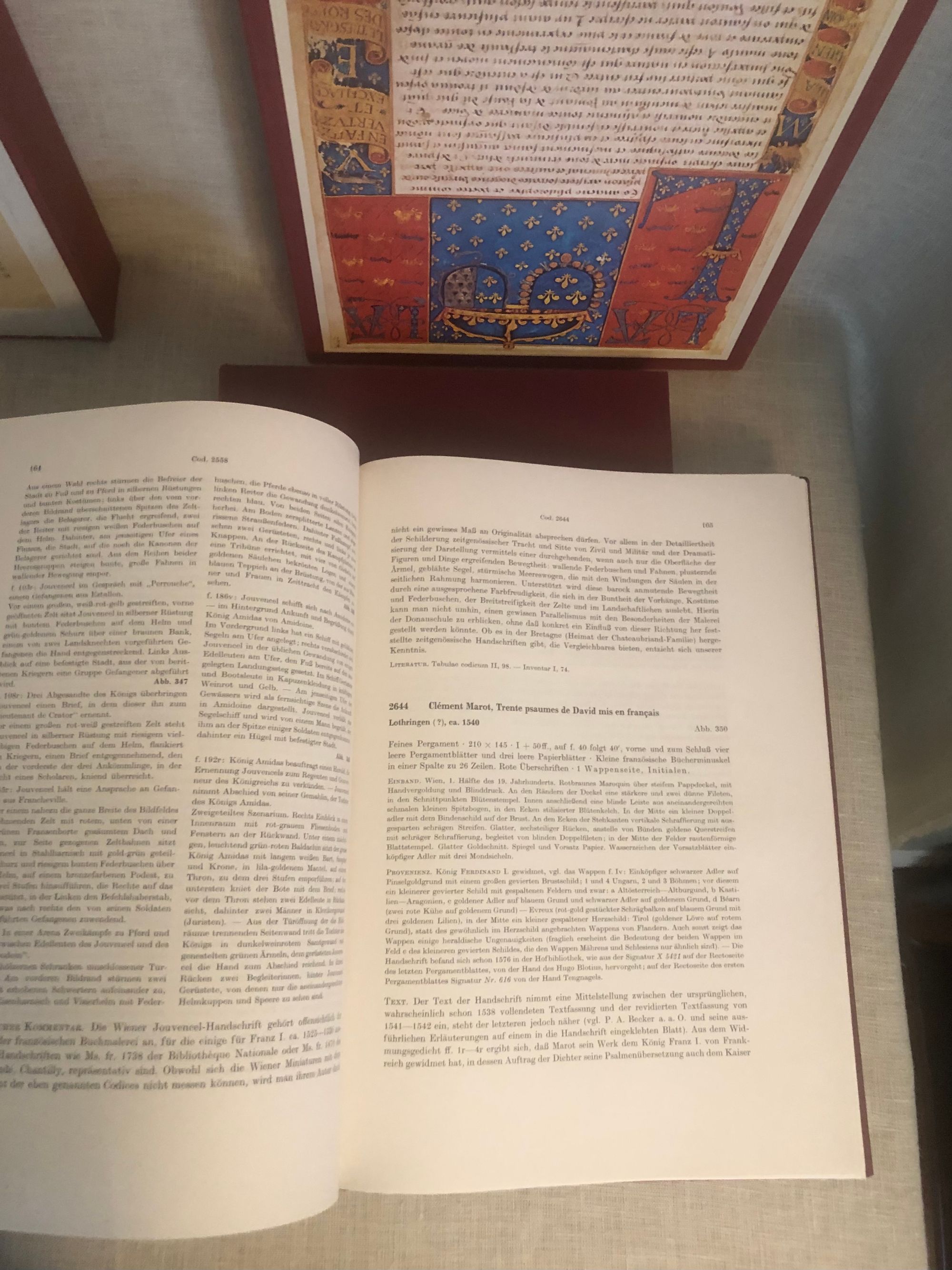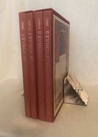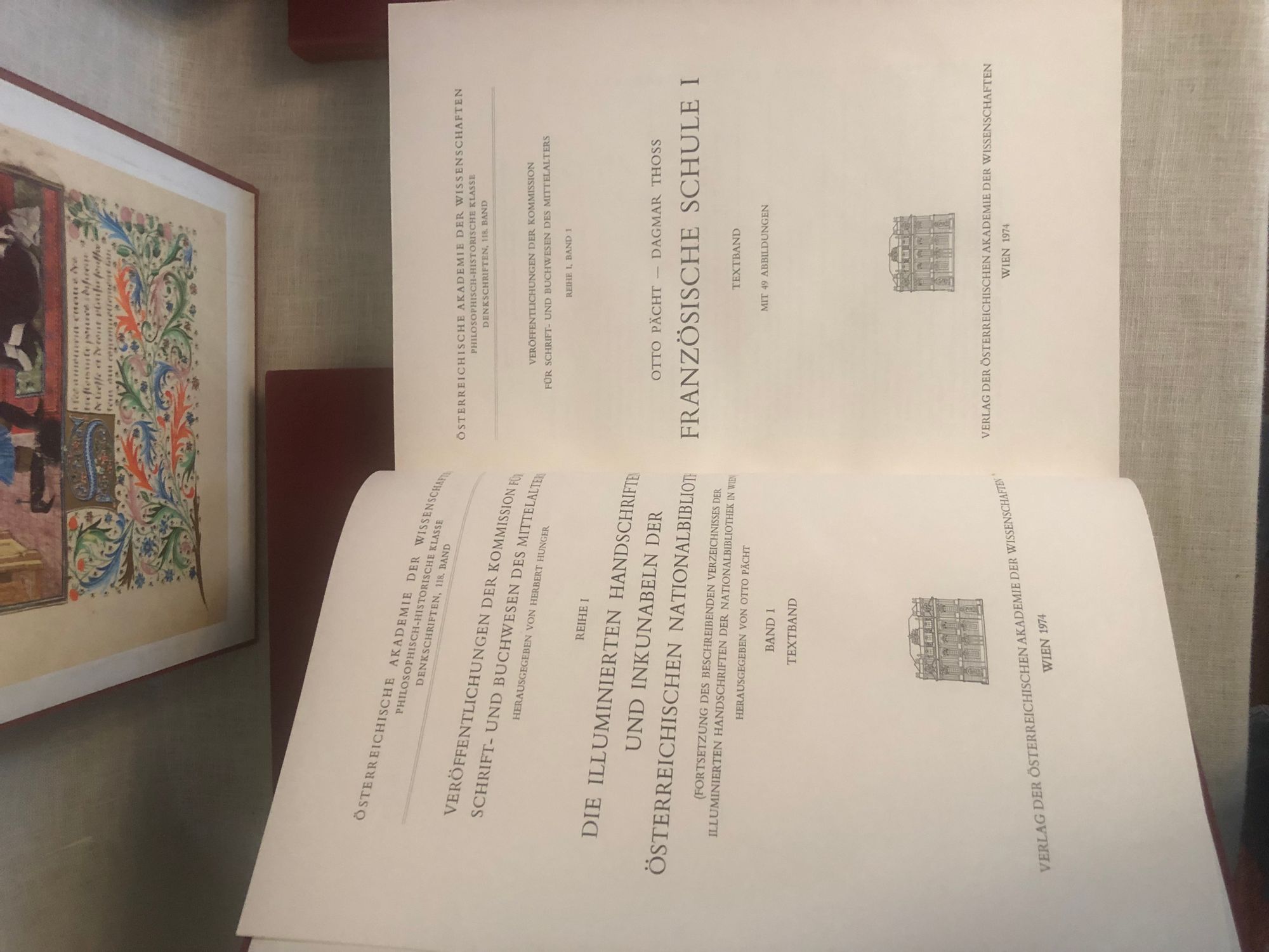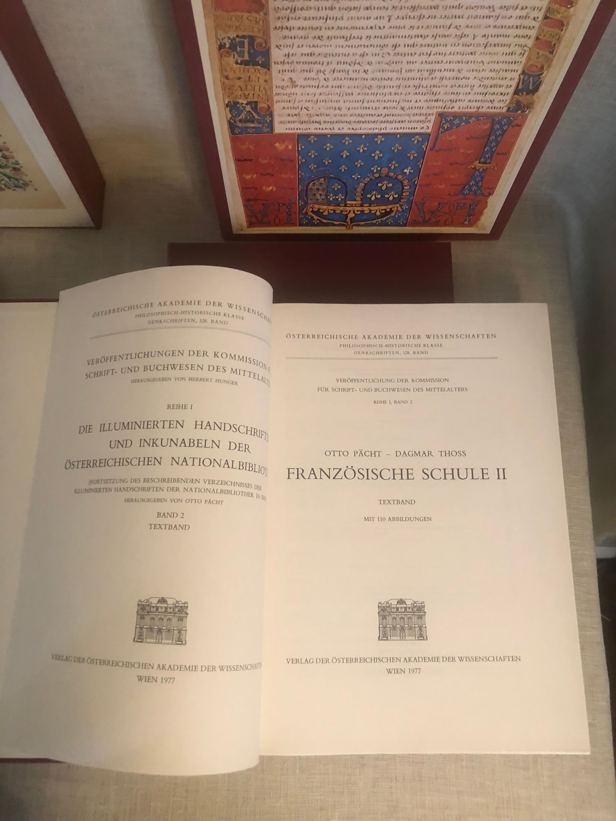 First Editions, 1974 and 1977. [4 VOLUMES IN 2 SLIPCASES ALTOGETHER] In German. Französische Schule I: Taffeln, mit 375 Abbildung und 8 Farbtafeln, (unpaginated); Textband mit 110 Abbildungen, (198 pp. plus illustrations.) Französische Schule II: Taffeln mit 424 Abbildungen und 9 Farbtafeln, (unpaginated); Textband mit 110 Abbildunge. (240 pp. Plus illustrations.) Hard cover, 4to., (measuring 8 1/2 x 12 1/8 inches) in red publisher's cloth with titles in gold to front board and spine. The two red cloth-covered slipcases each have a color reproduction to the front. Condition: books, Near Fine, very clean, tight and bright, glossy paper, spines slightly sunned. Slipcases Very Good, with slight soiling and sunning, otherwise very sound and attractive. ***Illuminated Manuscripts and Incunabula of the French School at the Austrian National Library of Vienna, Vols. I and II, published by the Austrian Academy of Sciences, Philosophical-Historic Classes, Vo. 118, Herbert Hunger, series editor, Otto Pächt Publisher, Vienna, 1974, 1977. Consists of "French School I" : Plate book, with 375 photographically reproduced examples in high-quality black and white, and a further 8 in full color, unpaginated. The second volume in that slipcase is the "Text", consisting of catalog descriptions of the plates in the other volume: it discusses the authors, painters, provenance, stylistic commentary including comparison study photos for reference, and a bibliography. The "French School II" set consists of the Plate book with 424 photographic reproductions in black and white, and 9 in full color; and the Text catalog, with similar description as above. A useful resource for the study of the medieval book or manuscript. In his Preface, Pächt stresses the work on these documents, codices and incunabula ceased with the Second World War, that the collections had since been expanded, and that work was required to modernize both the catalog listings and re-photograph the holdings. **Austrian author/editor Otto Pächt (1902-1988) wrote much about the medieval and renaissance art history of Europe while in exile from the Nazis, both in London at the Courtauld Institute, and later at Oxford. After the War he was able to return to Austria as Director of the Dept. of Manuscripts at the National Library of Vienna, where this work originated. He taught in the United States in later years. I OCLC Nr. 912303273. II OCLC Nr. 230131270.