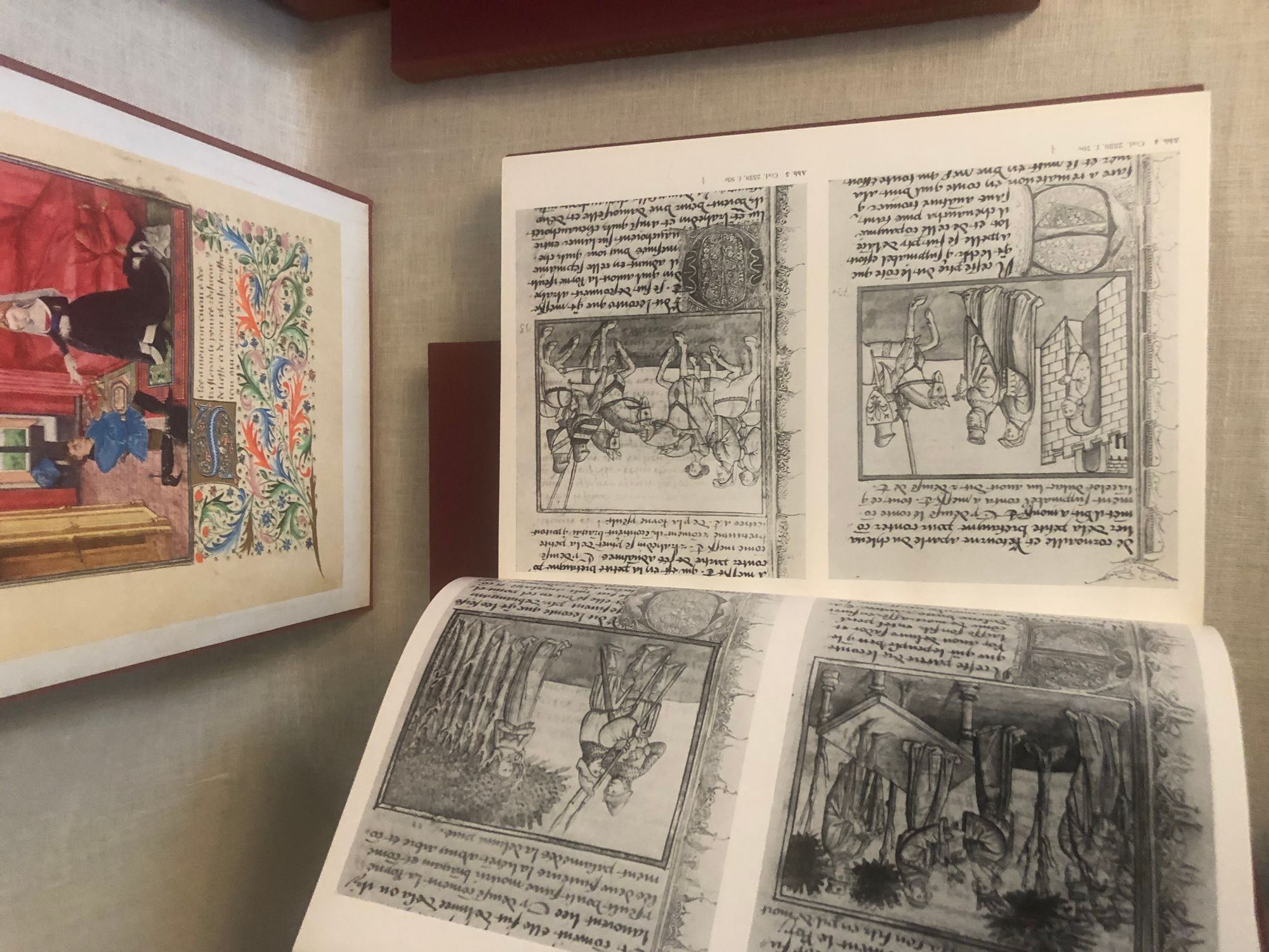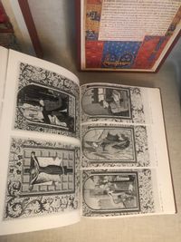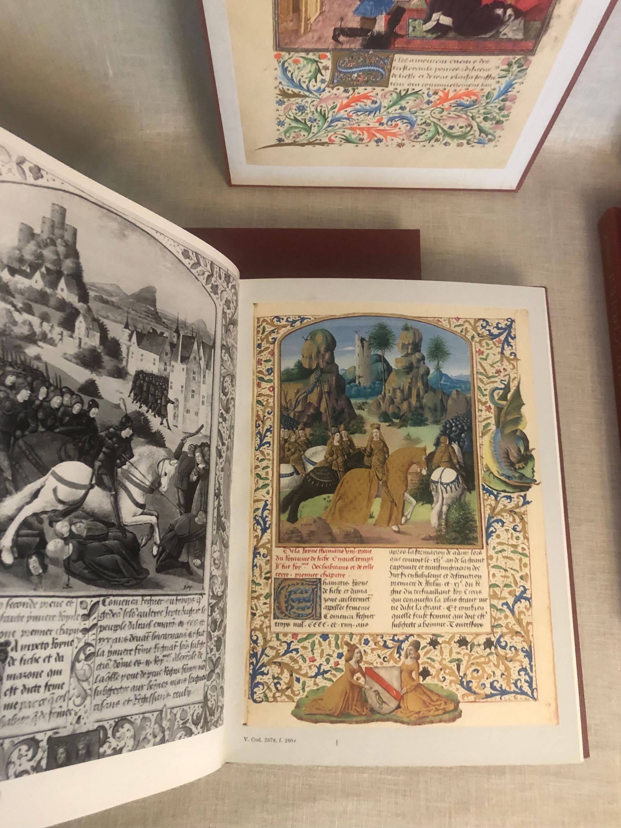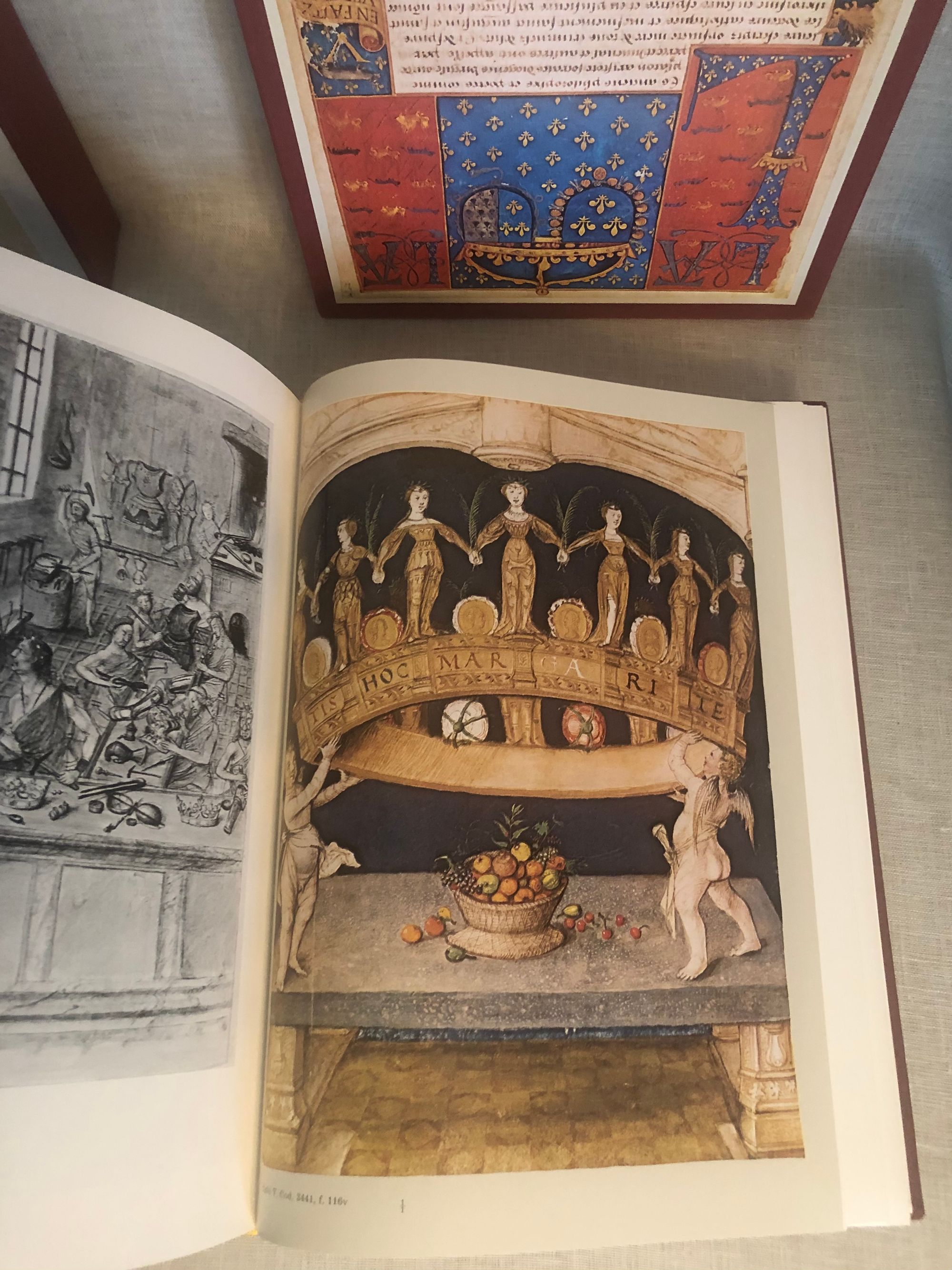 First Editions, 1974 and 1977. [4 VOLUMES IN 2 SLIPCASES ALTOGETHER] In German. Französische Schule I: Taffeln, mit 375 Abbildung und 8 Farbtafeln, (unpaginated); Textband mit 110 Abbildungen, (198 pp. plus illustrations.) Französische Schule II: Taffeln mit 424 Abbildungen und 9 Farbtafeln, (unpaginated); Textband mit 110 Abbildunge. (240 pp. Plus illustrations.) Hard cover, 4to., (measuring 8 1/2 x 12 1/8 inches) in red publisher's cloth with titles in gold to front board and spine. The two red cloth-covered slipcases each have a color reproduction to the front. Condition: books, Near Fine, very clean, tight and bright, glossy paper, spines slightly sunned. Slipcases Very Good, with slight soiling and sunning, otherwise very sound and attractive. ***Illuminated Manuscripts and Incunabula of the French School at the Austrian National Library of Vienna, Vols. I and II, published by the Austrian Academy of Sciences, Philosophical-Historic Classes, Vo. 118, Herbert Hunger, series editor, Otto Pächt Publisher, Vienna, 1974, 1977. Consists of "French School I" : Plate book, with 375 photographically reproduced examples in high-quality black and white, and a further 8 in full color, unpaginated. The second volume in that slipcase is the "Text", consisting of catalog descriptions of the plates in the other volume: it discusses the authors, painters, provenance, stylistic commentary including comparison study photos for reference, and a bibliography. The "French School II" set consists of the Plate book with 424 photographic reproductions in black and white, and 9 in full color; and the Text catalog, with similar description as above. A useful resource for the study of the medieval book or manuscript. In his Preface, Pächt stresses the work on these documents, codices and incunabula ceased with the Second World War, that the collections had since been expanded, and that work was required to modernize both the catalog listings and re-photograph the holdings. **Austrian author/editor Otto Pächt (1902-1988) wrote much about the medieval and renaissance art history of Europe while in exile from the Nazis, both in London at the Courtauld Institute, and later at Oxford. After the War he was able to return to Austria as Director of the Dept. of Manuscripts at the National Library of Vienna, where this work originated. He taught in the United States in later years. I OCLC Nr. 912303273. II OCLC Nr. 230131270.