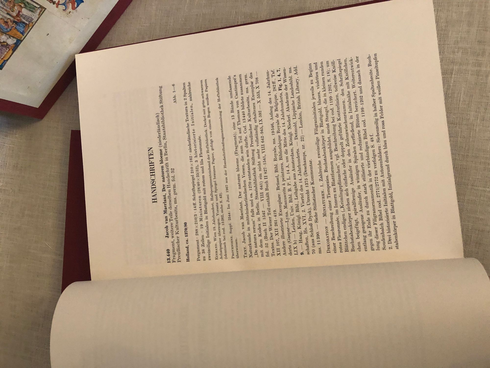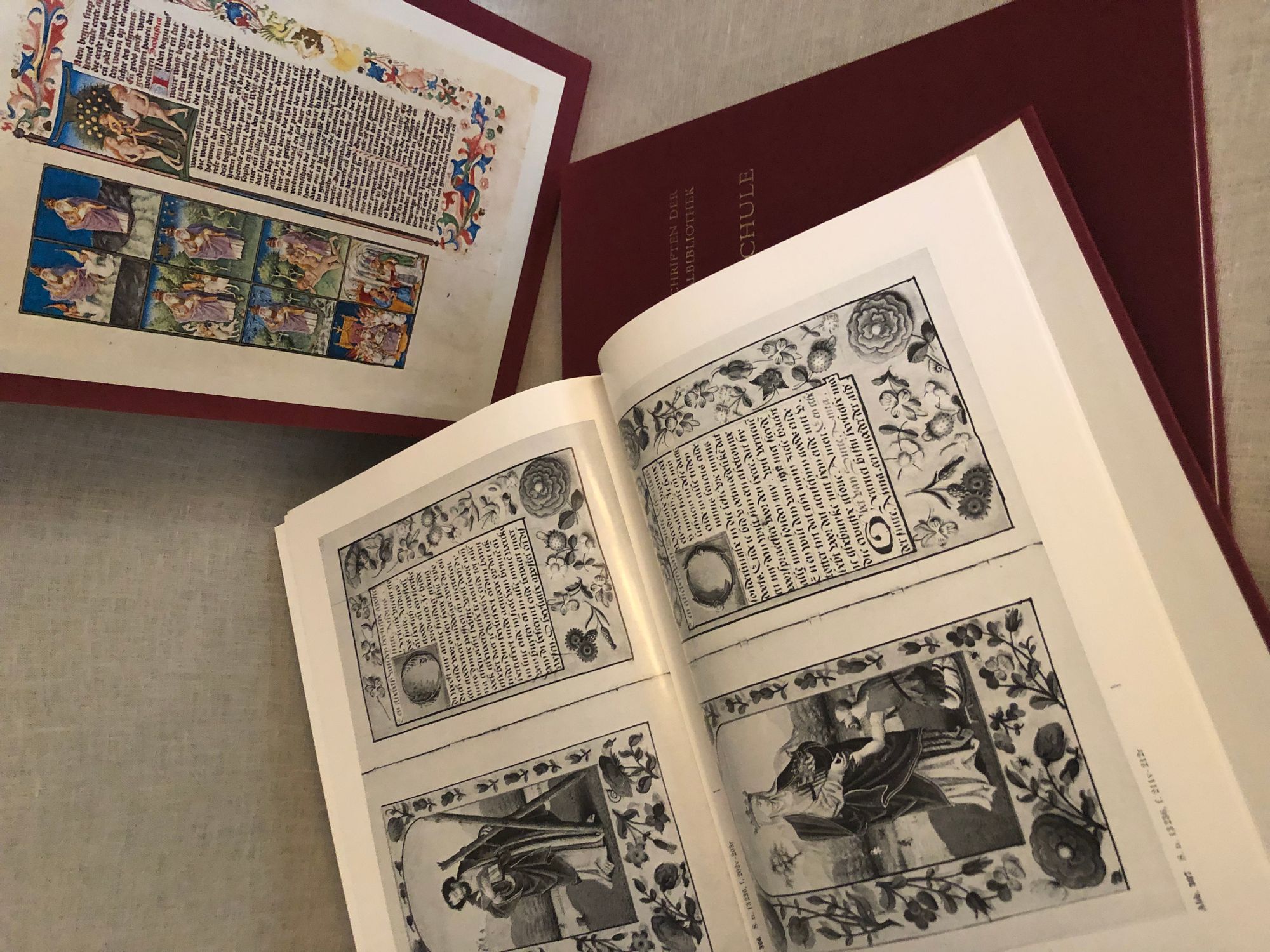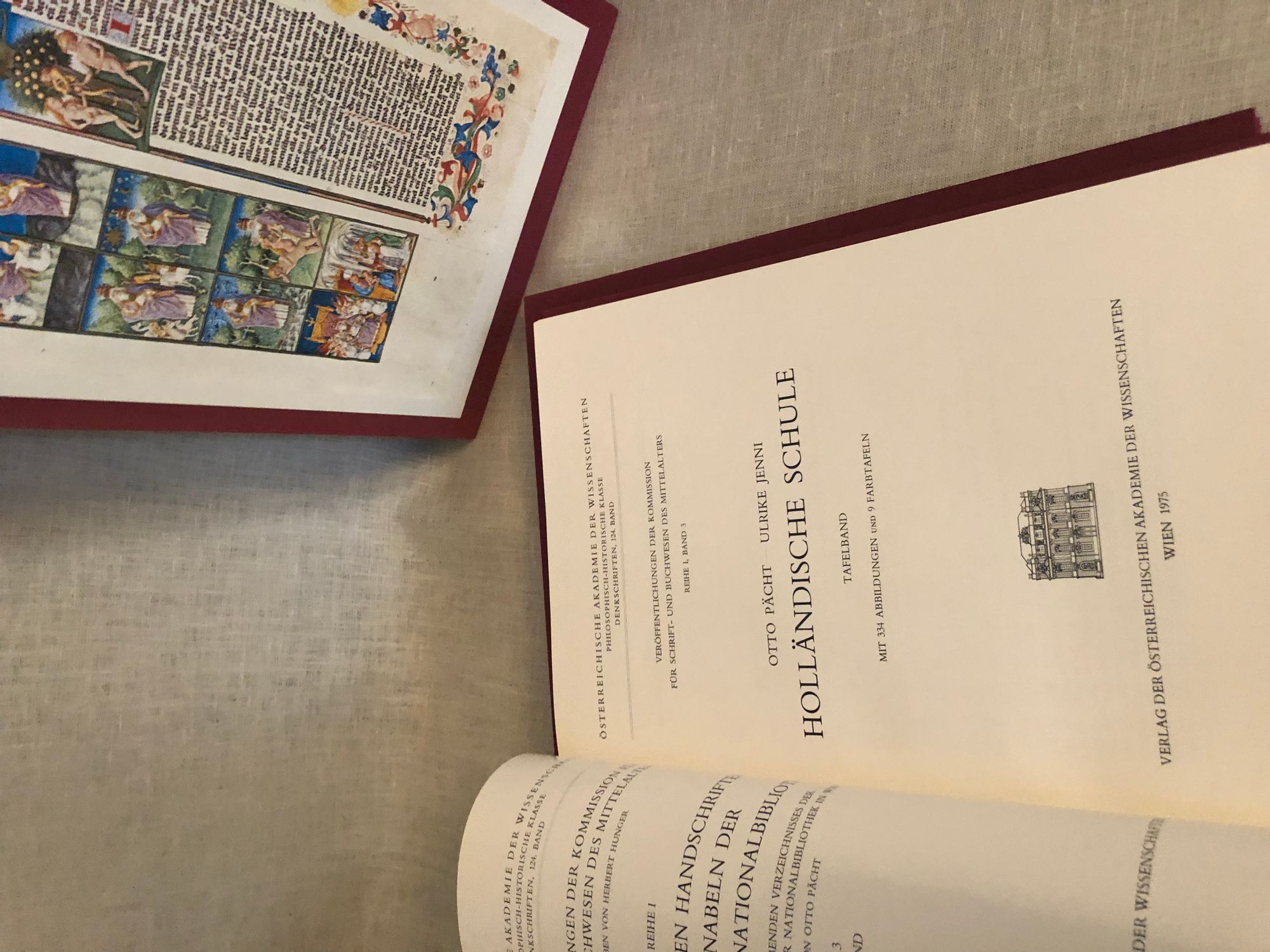 First Edition. [2 VOLUMES, together in slipcase] In German. Textband: 153 pp., 31 pp. Photos. Tafelnband: mit 334 Abbildungen und 9 Farbtafeln (unpaginated) und Liste der Abbildungen. Hard cover, 4to. (measuring 8 1/2 x 12 1/8 inches), in red publisher's cloth with titles in gold to front board and spine. The red cloth covered slipcase has a color reproduction to the front. Condition: books, Very Good , very clean, tight and bright, glossy paper, spines lightly sunned. Hinges have been taped. A few small stains to rear of one volume. Slipcase is Very Good, with slight sunning.****Illuminated Manuscripts and Incunabula of the Dutch School at the Austrian National Library of Vienna, published by the Austrian Academy of Sciences, Philosophical-Historical Memoranda, Vol. 124, Herbert Hunger, series editor, Otto Pächt Publisher, Vienna, No. 3 in series. This item consists of a set of two books in a slipcase. The Plate Book has a list of the high quality black and white reproductions of the 334 medieval Dutch manuscripts and incunabula of the collection, plus nine plates in color. The Text volume provides updated catalog descriptions of the Plates. It also includes various useful appendixes on signatures, texts, biographies of the creators, notes on bindings, iconography, handwriting comparisons, figure comparisons and other matter for the student/scholar of these works. **Austrian author/editor Otto Pächt (1902-1988) wrote much about the medieval and renaissance art history of Europe while in exile from the Nazis, both in London at the Courtauld Institute, and later at Oxford. After the War he was able to return to Austria as Director of the Dept. of Manuscripts at the National Library of Vienna, where this work originated. He taught in the United States in later years. The University of Vienna continues Pächt's work at their Pächt Archive/Research Centre for the Medieval Book, Image and Culture. OCLC I 219454710, II 863438380.