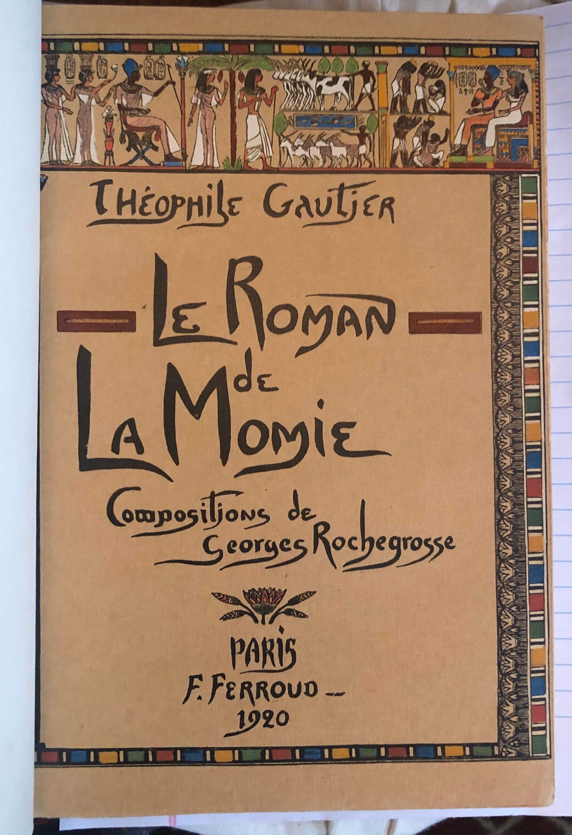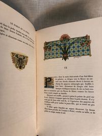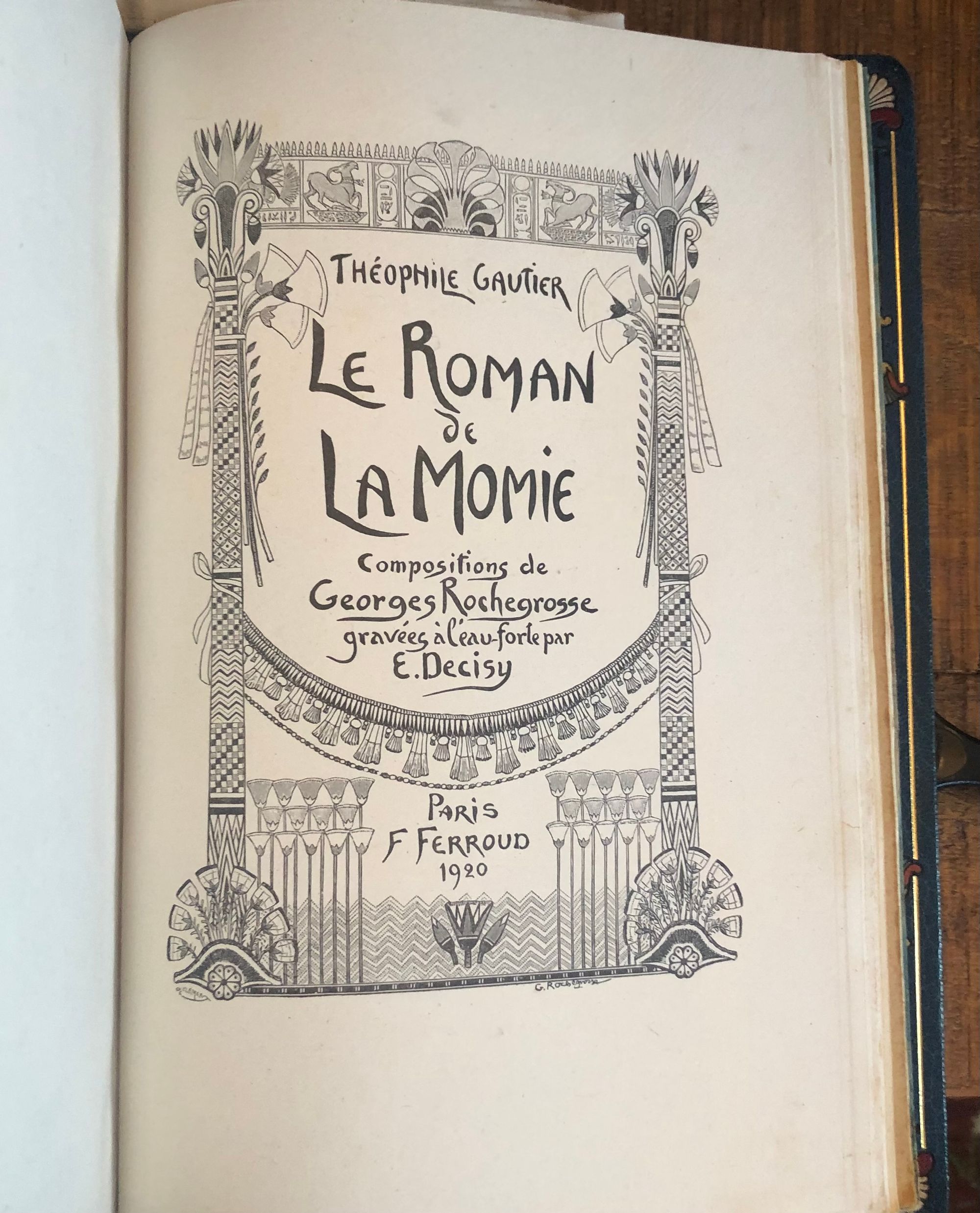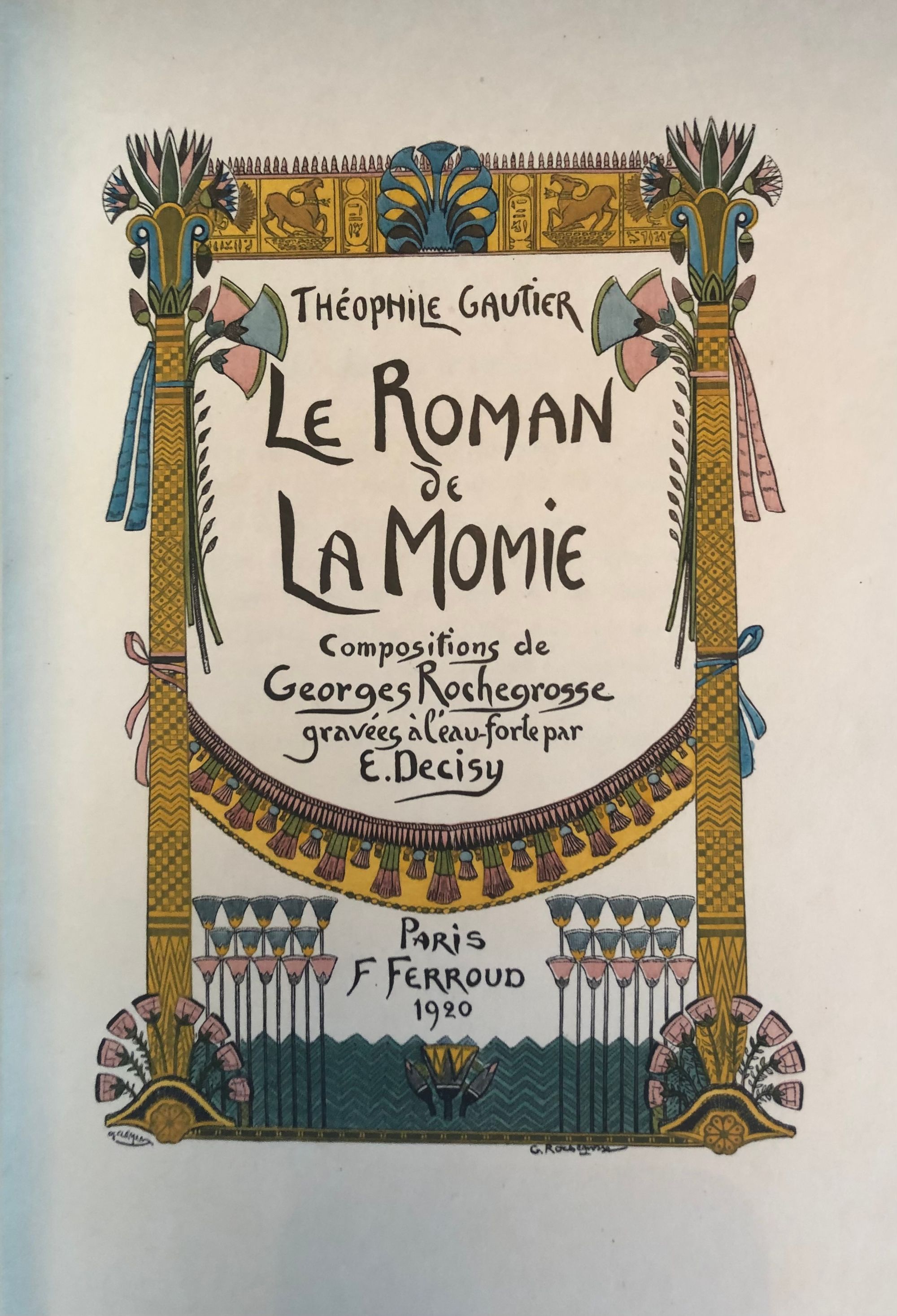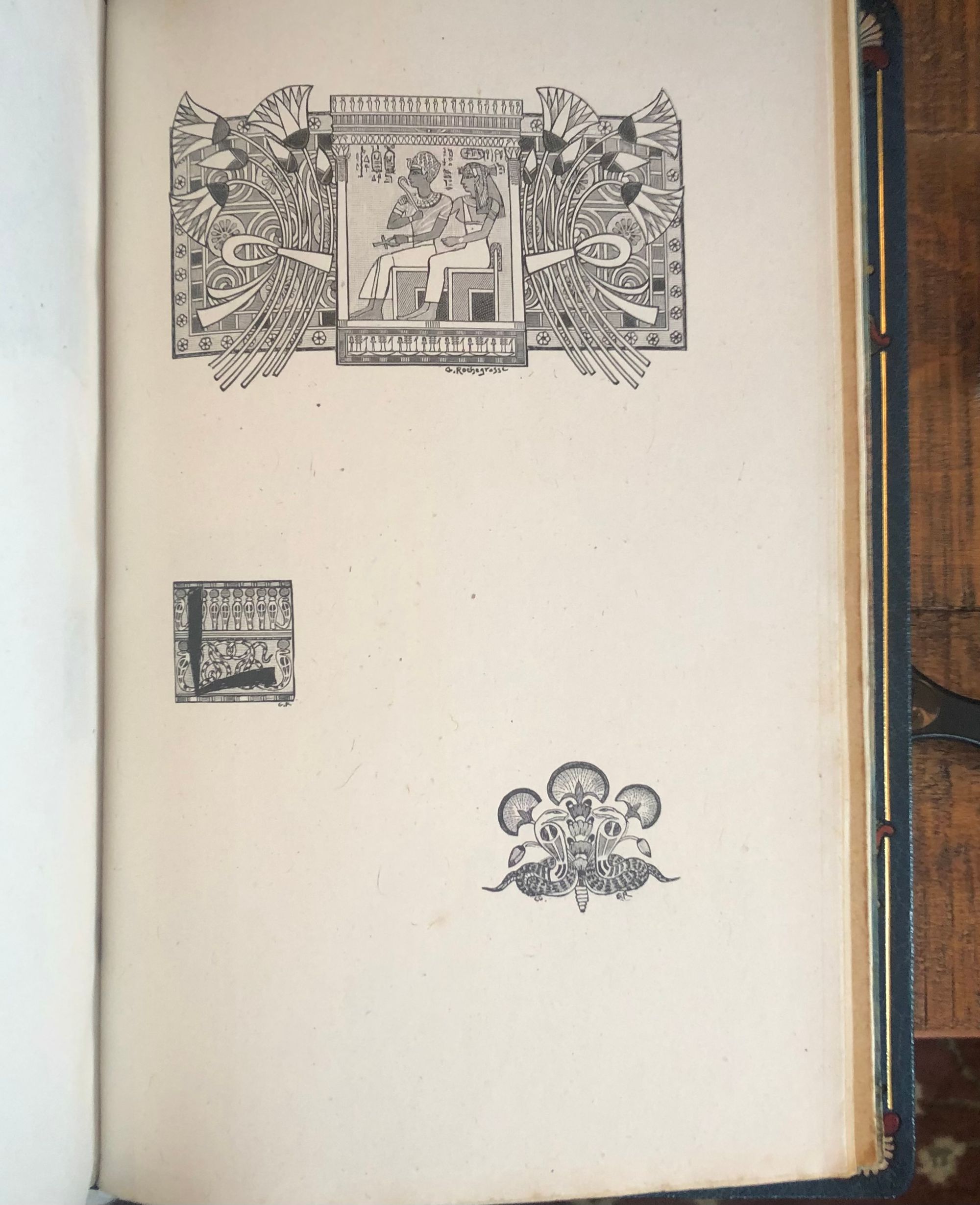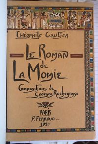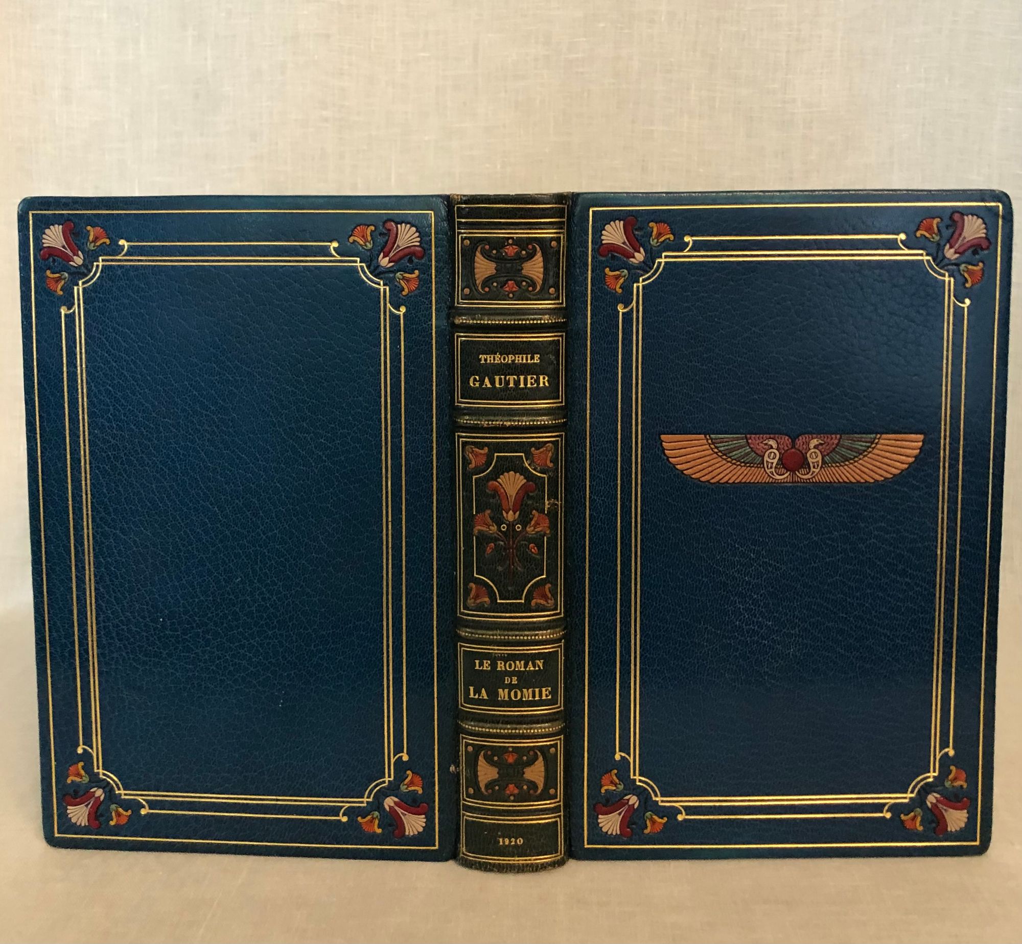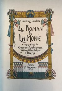 First Edition Thus. Limited Edition No. 126 of 1200; this having the limitation page initialed by the publisher, and being one of the iteration (Nos. 101 - 200) printed upon japon imperiál, containing two states of each etching, plus a separate suite of woodcuts in black on China tissue. Printed for Phillipe Renouard, (Paris bookseller and famed bibliographer of Parisian 15th and 16th century printers and booksellers.) Hard cover, large octavo (measuring 6 ¾ x 10 inches), with slipcase.** Finely bound** and stamp-signed, by Fernand Hauttecoeur in elaborate lapis blue morocco gilt, featuring an Egyptian-styled winged sun disc with flanking cobras to center front board, and triple papyrus blossom motifs to corners. These are inlaid in shades of red, orange, teal and tan. Exquisitely ornamented inner turn ins feature papyrus blossoms intertwined amongst gilt and black stems, setting off vibrant silk doublures of malachite green, peacock blue and gold. The original colored paper wraps are bound in. The book features 20 full page, tissue guarded (and 2 smaller,) etchings after the work of French art nouveau painter, GEORGES ROCHEGROSSE (1859-1938), etched by E. Decisy. Some additional illustration bears the signature of Charles Clémont.** CONDITION: Very Good Plus, or better. Spine is slightly darkened, and with a bit of rubbing at head. (One small divot near the title has been colored in the past.) Modern decorative rice paper has been imperfectly applied (with some bubbling) to verso of original endpapers at front and rear, perhaps to conceal a gift inscription (?) But even holding these pages up to the light does not reveal the cause. Text pages are clean, bright and the gouache decoration really superb. Two very small pencil reference numbers appear within, which may be the bookbinder's. The front hinge is cracked but holding firmly. The slipcase is Good and has definitely done its job to protect the brightly colored treasure within. ** The story was first serialized in "Moniteur Universel" in 1857, and in book form the following year. **AUTHOR THÉOPHILE GAUTIER (1811-1872) was a keen student of Egyptology, as were many of his contemporaries, as a raft of new archeological discoveries excited the French imagination. The story is of the discovery of a sarcophagus containing a mummy within a newly discovered tomb, by an English gentleman and party in the Biban el Moluk Valley near Thebes. The papyrus scroll buried with the sarcophagus reveals the romantic love tale of the beautiful Tahoser, daughter of Pharaoh Petamounoph. Overall, this finely detailed art and highly descriptive writing deserves appreciation for its synthesis of form and meaning. BnF 12148dotcb11958573d. (3.8 lbs)