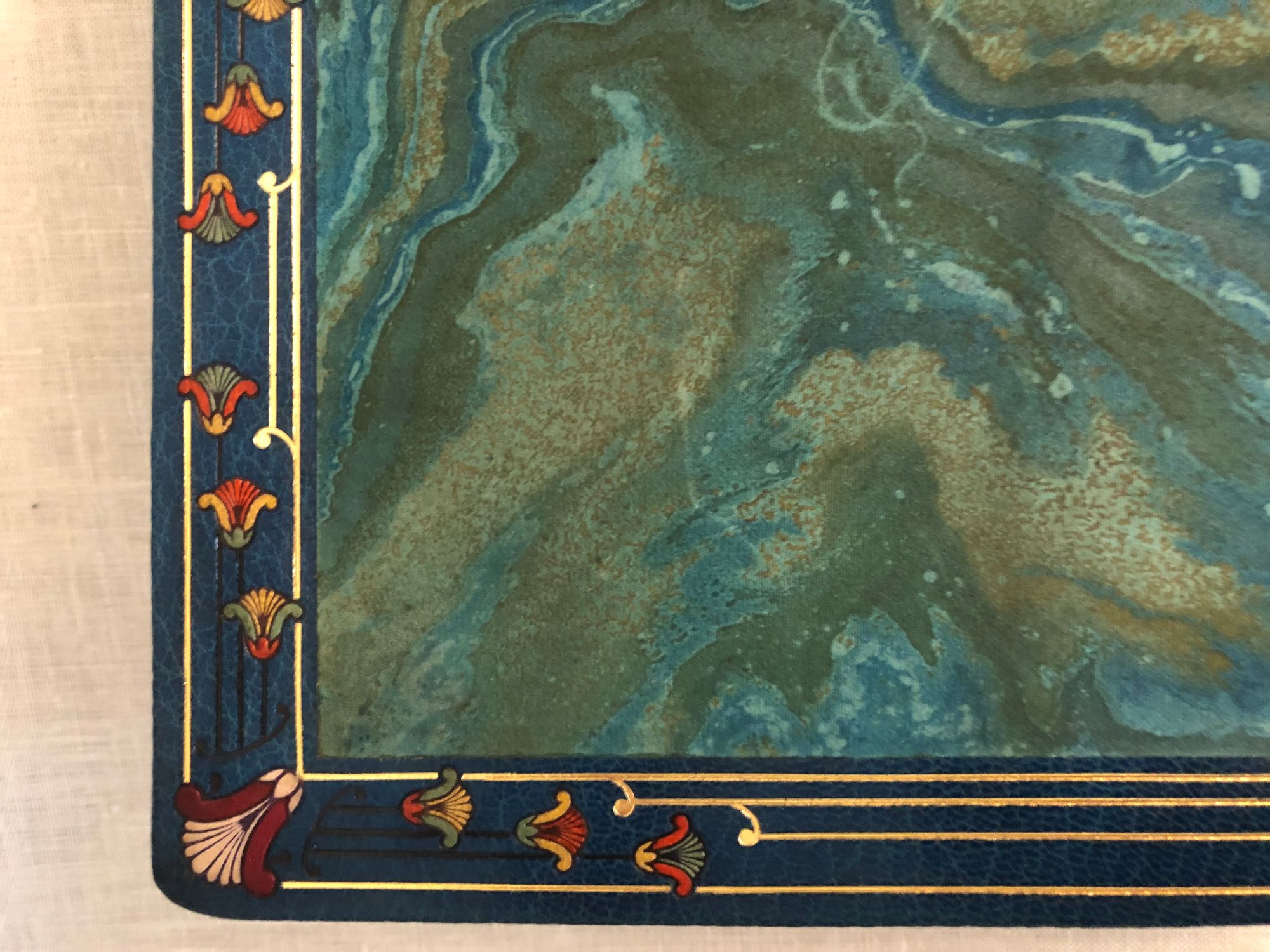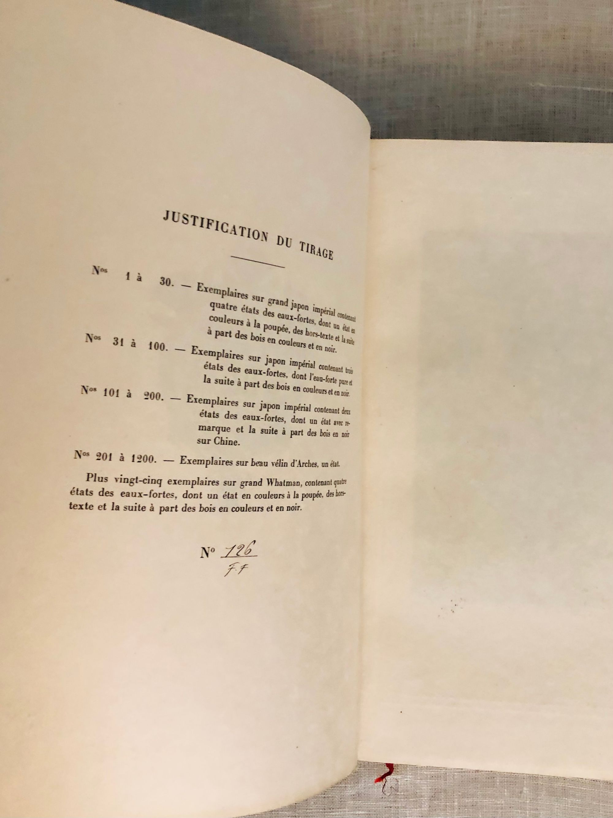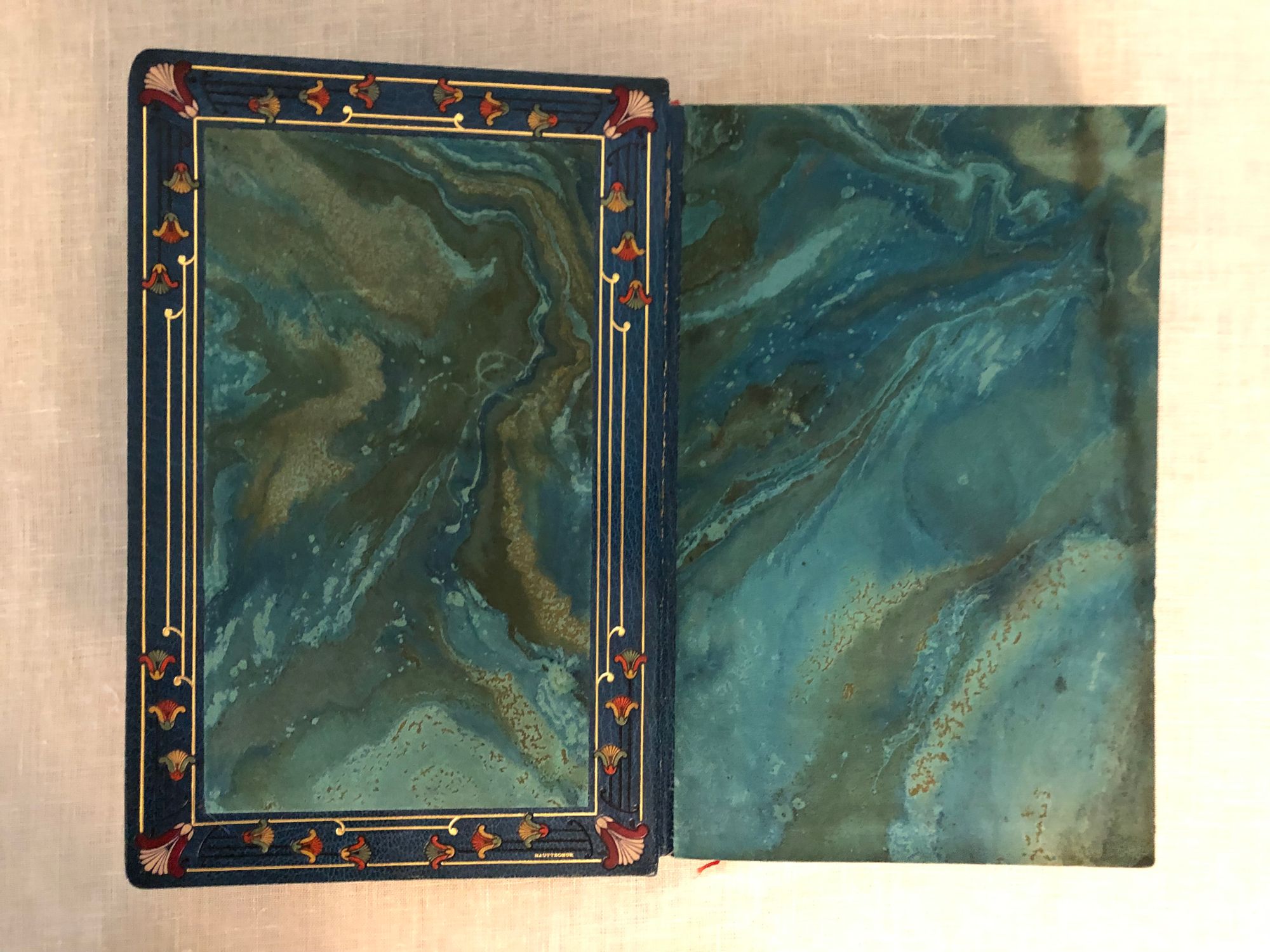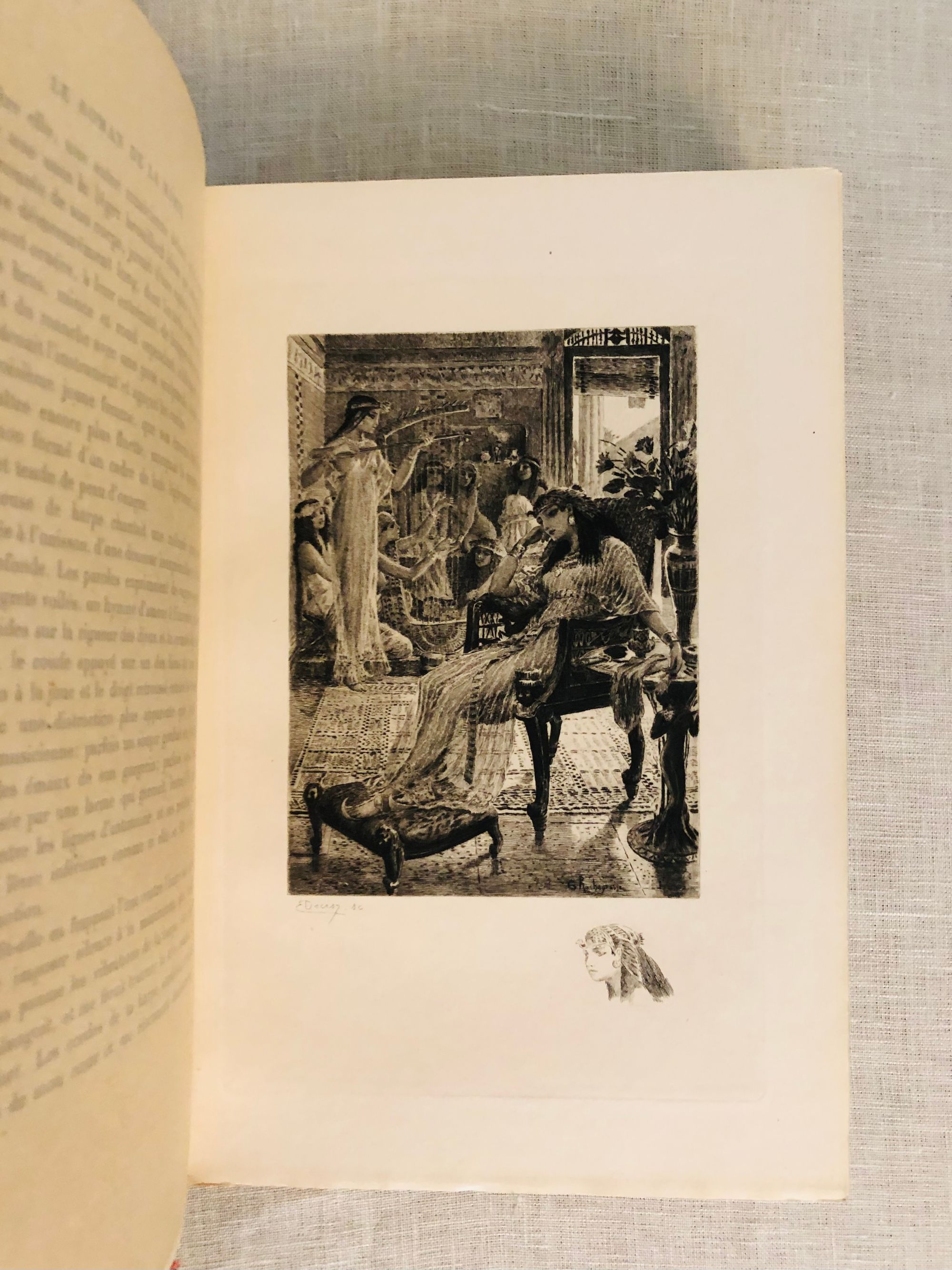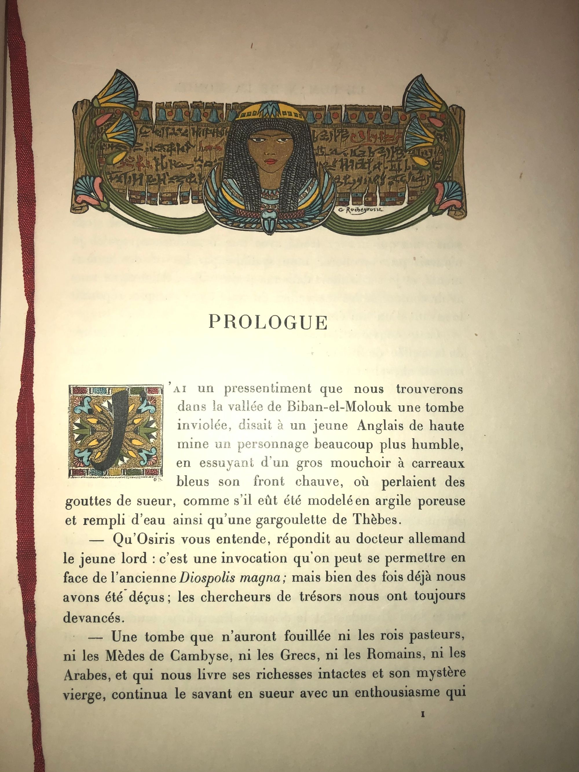 First Edition Thus. Limited Edition No. 126 of 1200; this having the limitation page initialed by the publisher, and being one of the iteration (Nos. 101 - 200) printed upon japon imperiál, containing two states of each etching, plus a separate suite of woodcuts in black on China tissue. Printed for Phillipe Renouard, (Paris bookseller and famed bibliographer of Parisian 15th and 16th century printers and booksellers.) Hard cover, large octavo (measuring 6 ¾ x 10 inches), with slipcase.** Finely bound** and stamp-signed, by Fernand Hauttecoeur in elaborate lapis blue morocco gilt, featuring an Egyptian-styled winged sun disc with flanking cobras to center front board, and triple papyrus blossom motifs to corners. These are inlaid in shades of red, orange, teal and tan. Exquisitely ornamented inner turn ins feature papyrus blossoms intertwined amongst gilt and black stems, setting off vibrant silk doublures of malachite green, peacock blue and gold. The original colored paper wraps are bound in. The book features 20 full page, tissue guarded (and 2 smaller,) etchings after the work of French art nouveau painter, GEORGES ROCHEGROSSE (1859-1938), etched by E. Decisy. Some additional illustration bears the signature of Charles Clémont.** CONDITION: Very Good Plus, or better. Spine is slightly darkened, and with a bit of rubbing at head. (One small divot near the title has been colored in the past.) Modern decorative rice paper has been imperfectly applied (with some bubbling) to verso of original endpapers at front and rear, perhaps to conceal a gift inscription (?) But even holding these pages up to the light does not reveal the cause. Text pages are clean, bright and the gouache decoration really superb. Two very small pencil reference numbers appear within, which may be the bookbinder's. The front hinge is cracked but holding firmly. The slipcase is Good and has definitely done its job to protect the brightly colored treasure within. ** The story was first serialized in "Moniteur Universel" in 1857, and in book form the following year. **AUTHOR THÉOPHILE GAUTIER (1811-1872) was a keen student of Egyptology, as were many of his contemporaries, as a raft of new archeological discoveries excited the French imagination. The story is of the discovery of a sarcophagus containing a mummy within a newly discovered tomb, by an English gentleman and party in the Biban el Moluk Valley near Thebes. The papyrus scroll buried with the sarcophagus reveals the romantic love tale of the beautiful Tahoser, daughter of Pharaoh Petamounoph. Overall, this finely detailed art and highly descriptive writing deserves appreciation for its synthesis of form and meaning. BnF 12148dotcb11958573d. (3.8 lbs)