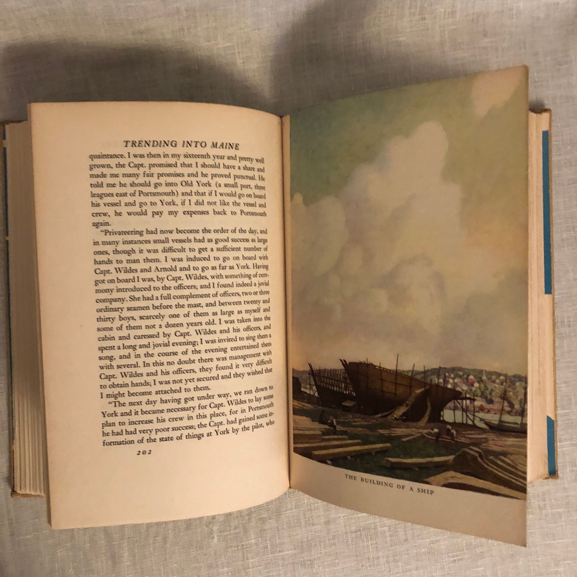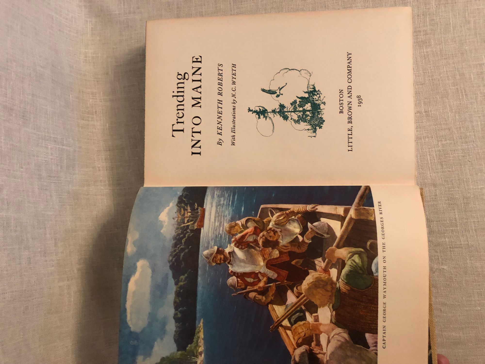 Hard cover, first trade edition (third printing), octavo (measuring 5 3/4 x 9 inches), in tan cloth with green pictorial decoration and titles, lacking dust jacket, 394pp. Condition : Near Fine. No signs of outer wear. A few light spots of foxing to decorative end paper at front only. One half inch closed tear along edge of final (uncut) page. Still bright, tight and clean. This travelogue was one of Author Kenneth Roberts's ( 1885-1957) later works. Earlier in his career, he had written a series of historical novels set around his birthplace of Kennebunk. The seventeen bright, full page color illustrations by N.C. Wyeth enliven the text.
