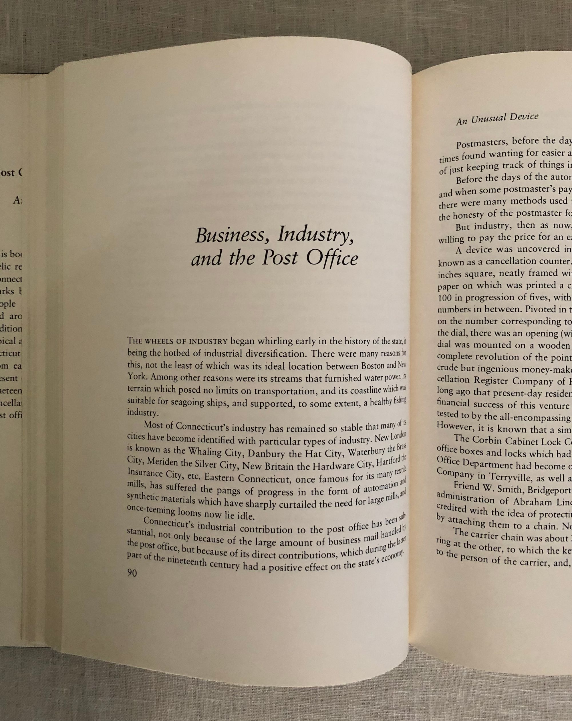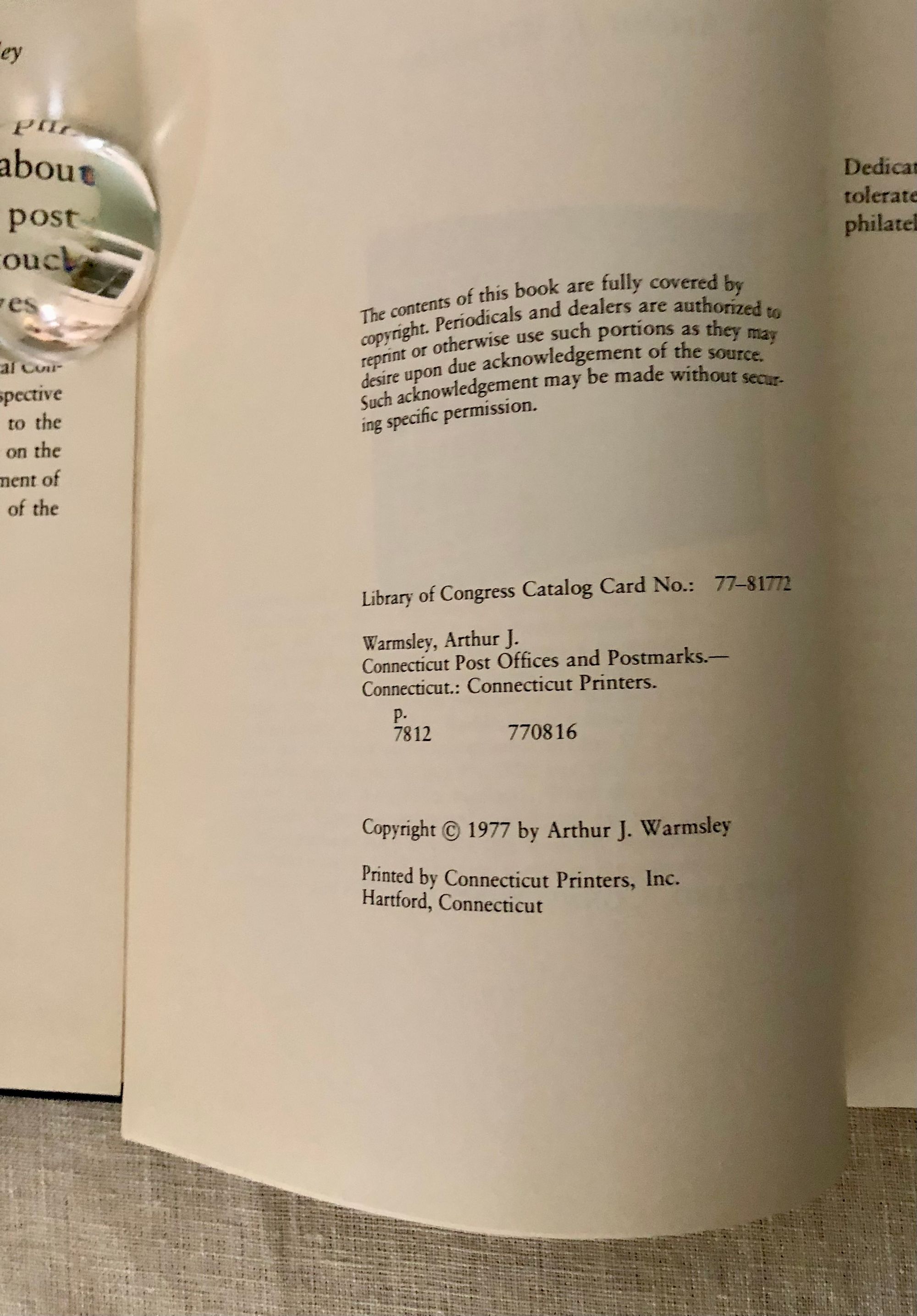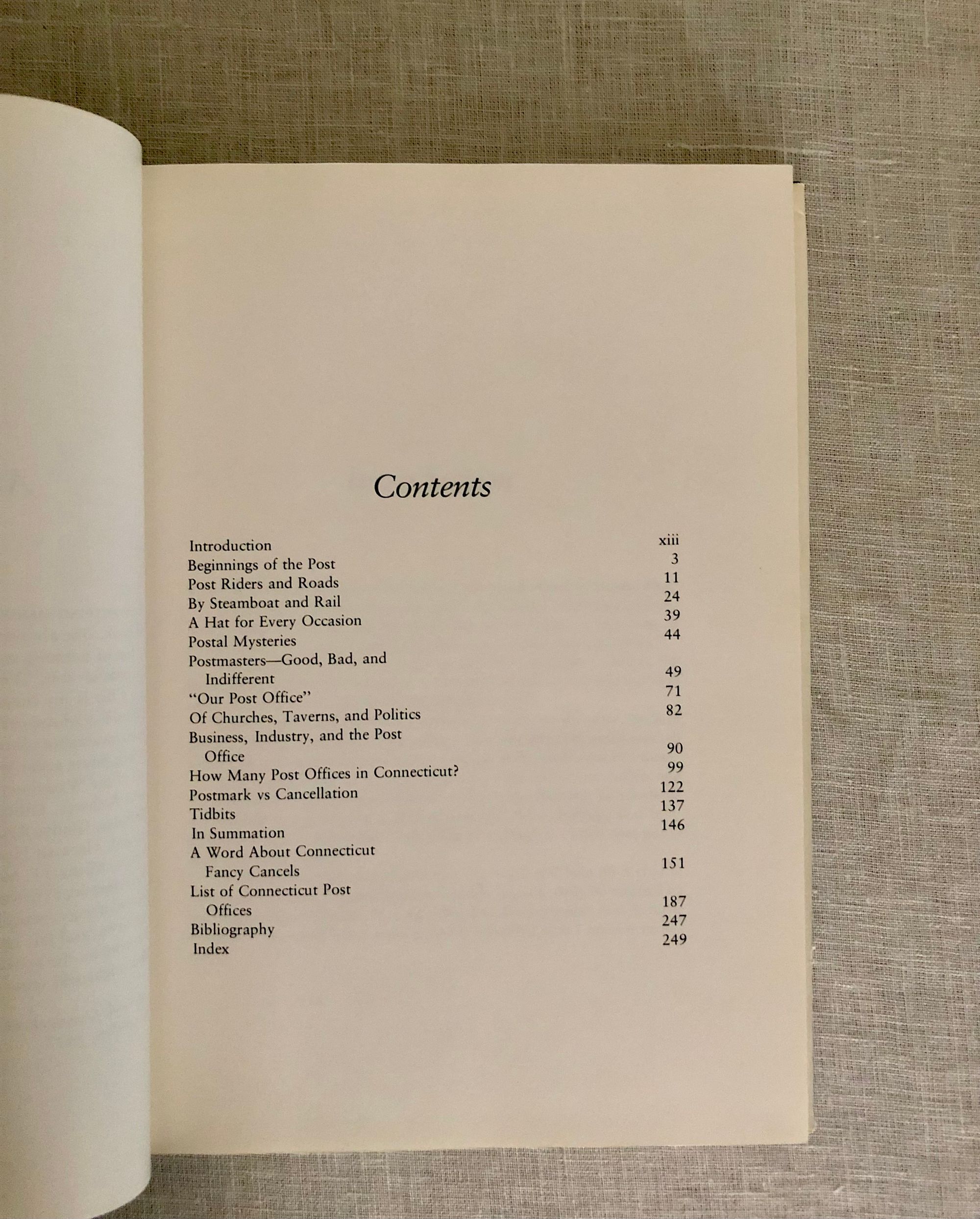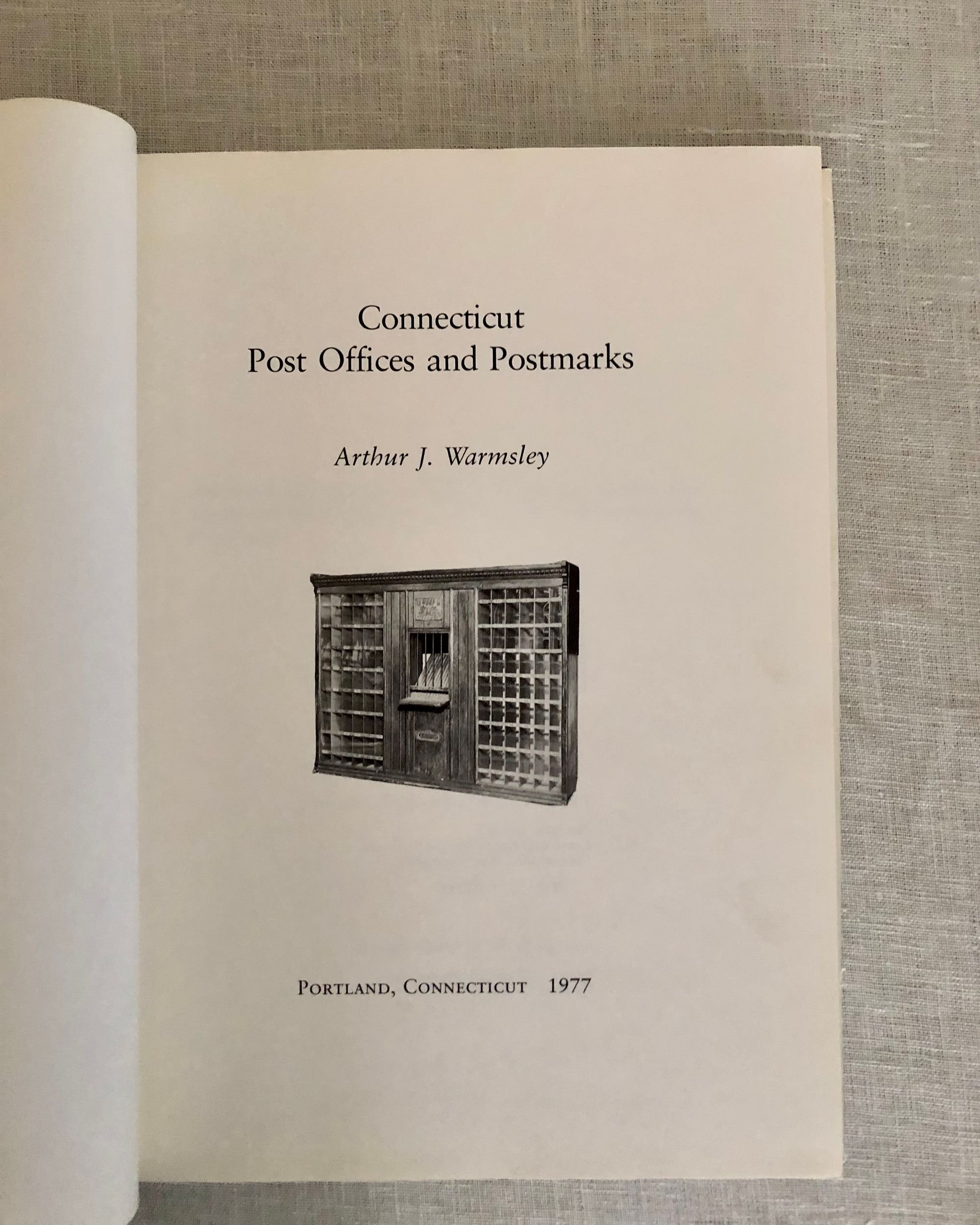 Hard Cover, quarto, 257pp. In publisher's navy cloth boards with gold lettering. Condition: Near Fine in Very Good dust jacket, which has shelf wear to edges and some dust-soiling overall. ** Illustrated history of the postal service in Connecticut. The author, Arthur J. Warmsley (1913-1998) was an enthusiastic philatelist, and tells anecdotes of the history of the postal service from the post riders of early America through the establishment of the US Post Office and the transport of mail via the New Haven Steamboat Company and the Baltimore and Ohio (B&O) Railroad. Illustrated throughout with photographs and 18 full-page plates of the postmarks (cancels) of individual Connecticut towns. OCLC 4103893.