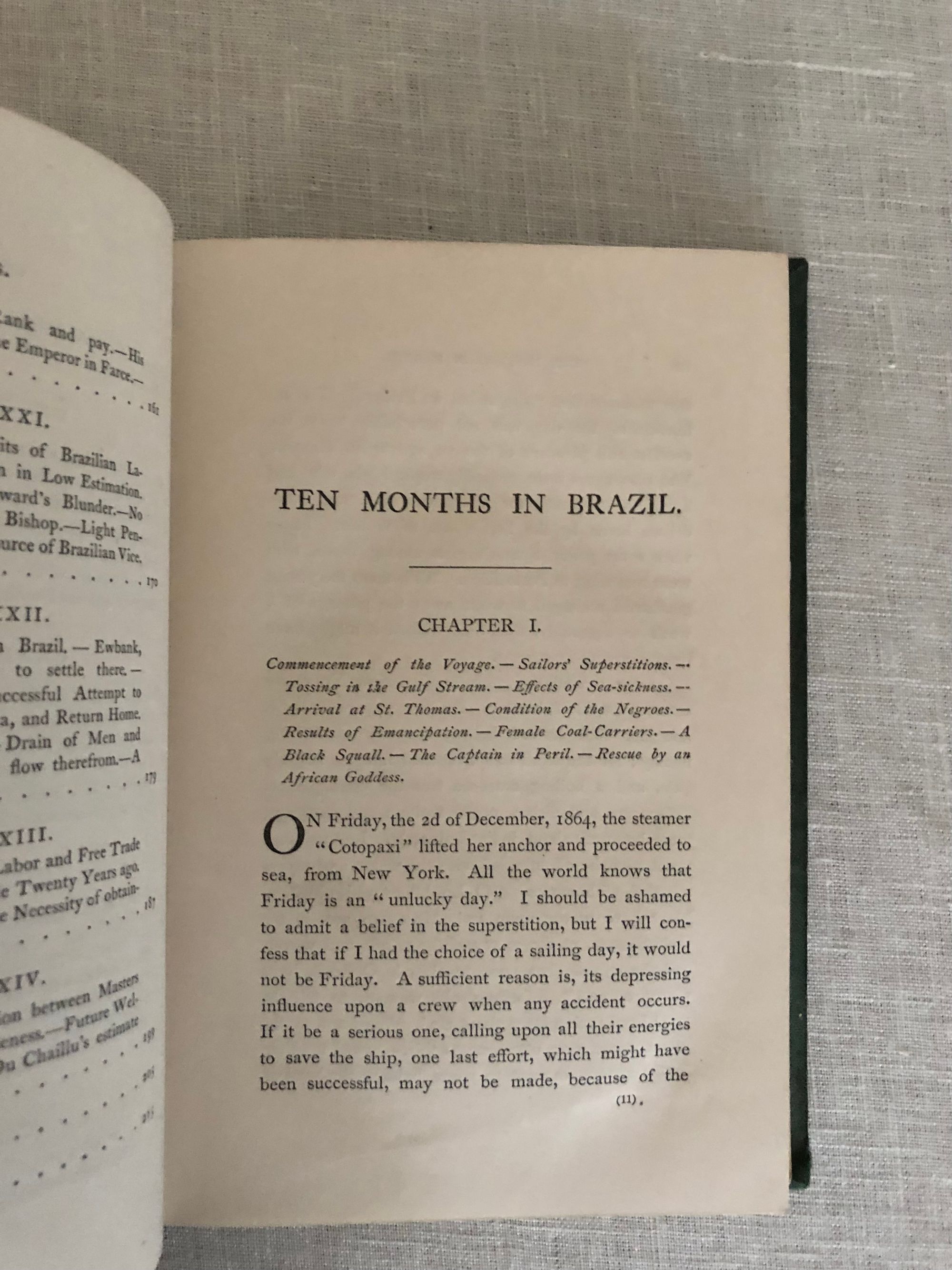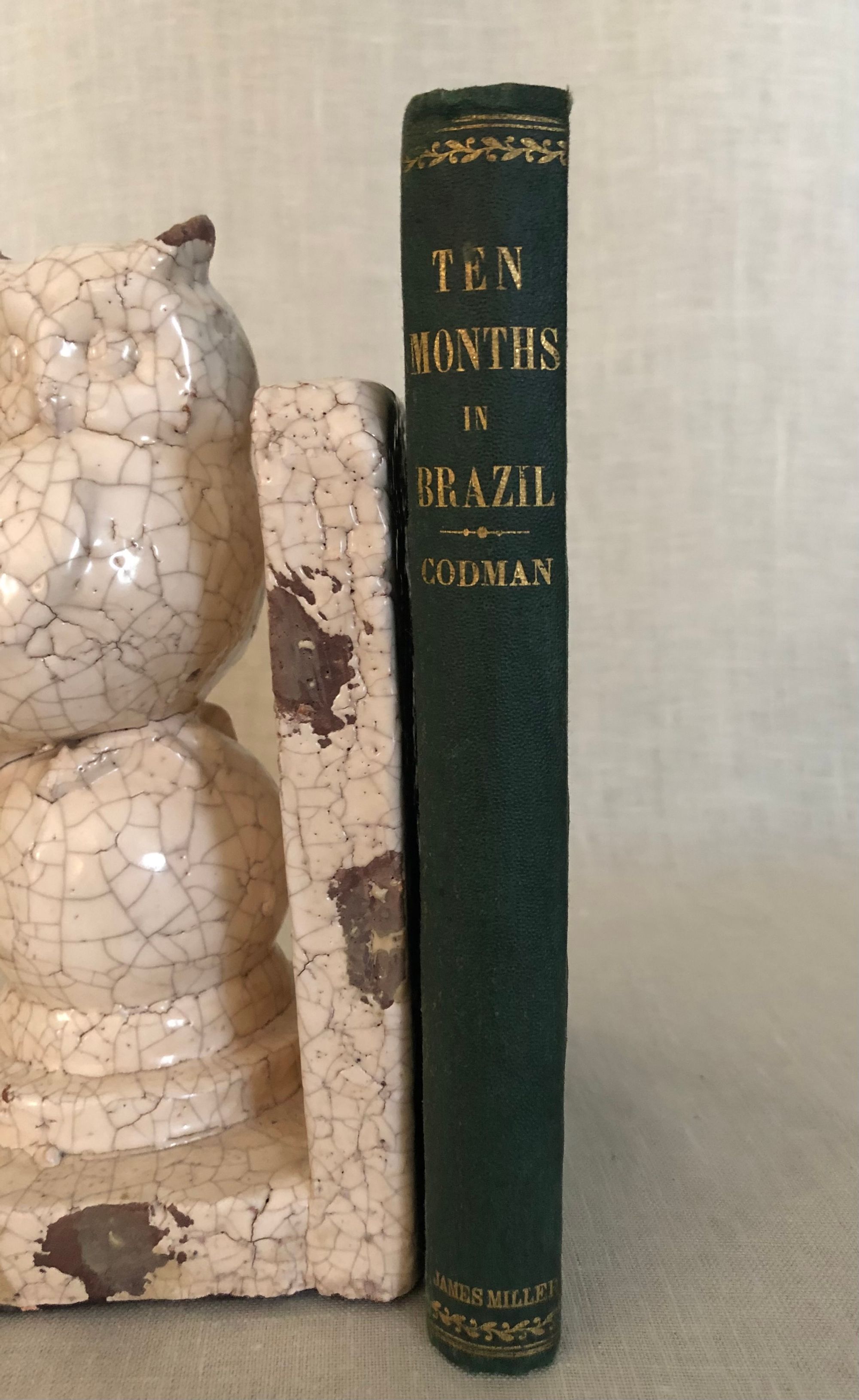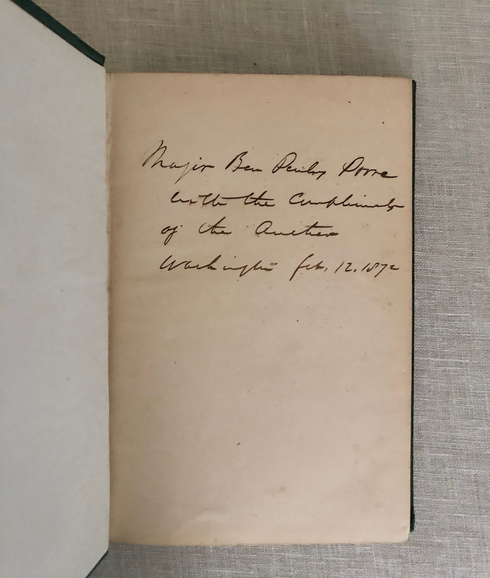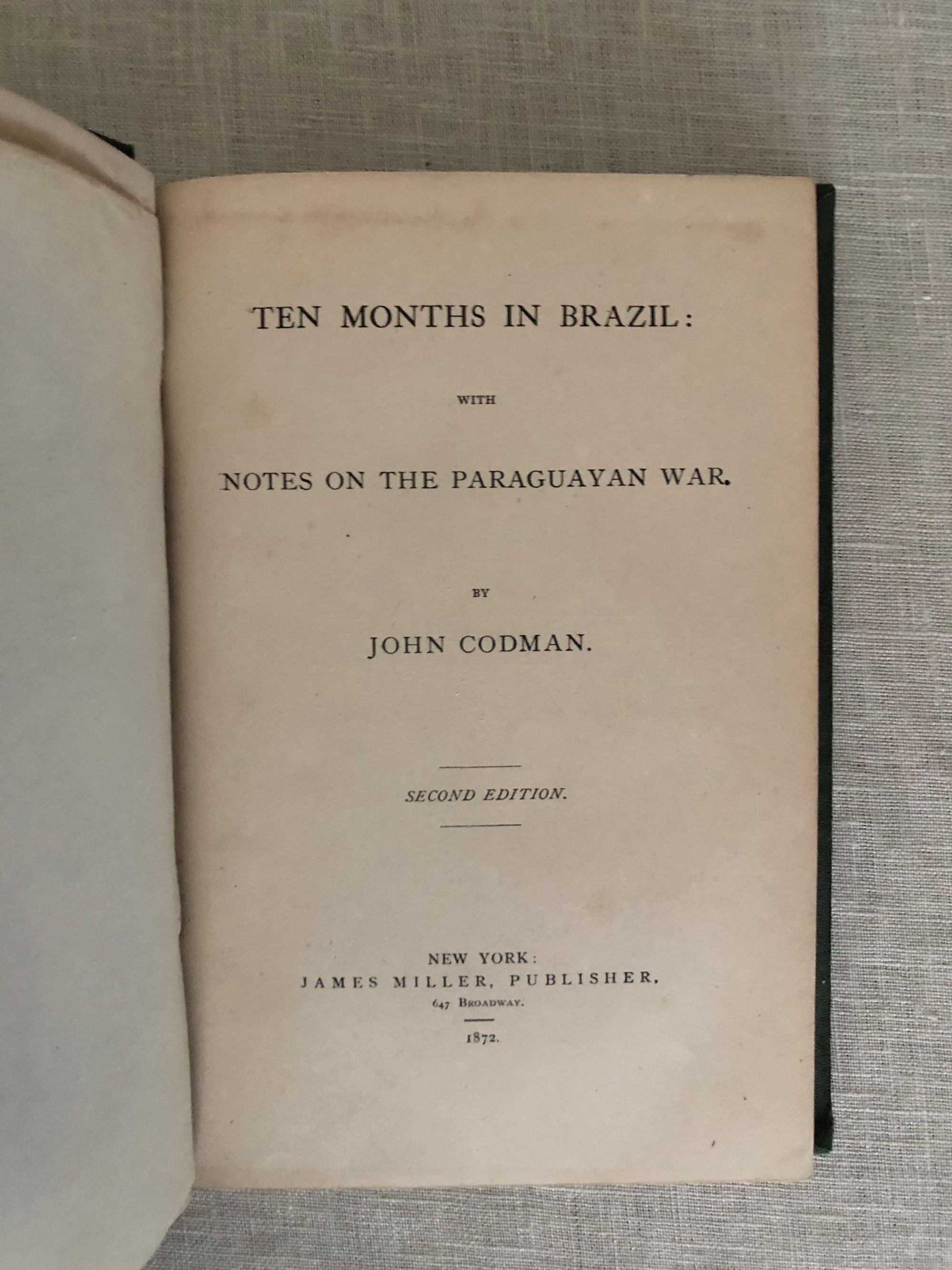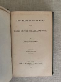 Hard cover,12 mo (measuring 5 x 7 1/2 inches), in publisher's original green pebbled cloth, both boards blind stamped with double ruled borders, corner devices and central filigree design with the initials J.M., for James Miller, publisher. The spine features the titles in gilt, with small bands of gilt design at head and foot. Glazed brown endpapers. Frontispiece illustration (2), 218, (2) pp. Four full page, engraved illustrations, including the tissue guarded frontispiece. Inscribed in old ink to front free endpaper: "Major Ben Perley Poore with the compliments of the Author, Washington, Feb. 12, 1872." Condition: Good Plus. Some minor water damage has resulted in some marks and slight bubbling of the cloth of both boards. and along the one interior quire. There was a notable fire at the historic home of the recipient family in the 1950's which is to blame for the damage. (see below) The interior remains mostly clean, with one quire loosened but holding, mildly age-toned, and with very minor foxing to prelims only.***This is a recollection of Newburyport native Captain John Codman's voyage to Brazil in 1867 to deliver the steamer Cotopaxi to the Brazilian government after its decommission from the U.S. Navy. Codman's primary topic here, however, is an economic treatise on the post- Civil War economic changes affecting trade: how the end of slavery in the United States has globalized the cotton trade, specifically to the remaining areas of slave labor in South America; how a rising abolitionist movement in Brazil will thwart that trade; how resettlement of former American slaves from the American South could help offset labor shortages in Brazil caused in part by the conduct of protracted war with Paraguay. *** Author John Codman (1814-1900), of Dorchester Massachusetts was a sea captain-turned-writer/journalist whose career bridged the age of sail and steam. He wrote one early novel, under the pseudonym "Captain Ringbolt," called Sailors' Life and Sailors' Yarns (1847), which received grudging praise in review by a young Herman Melville. This current volume was the first of three nautical travelogues. He was the well-educated, (Phillips Andover and two years of Amherst College) son of a notable clergyman, but chose to leave school for a career at sea, making captain at the age of twenty two, and establishing his own shipping business by thirty three years of age. His commercial travels took him to South America, India and China. His reputation among the merchant marine was well established: he held a record for making a remarkable profit of $100,000 on a single cargo of China tea. His maternal grandfather, Captain Ebenezer Wheelwright, as well as his maternal uncle, Captain William Wheelwright, both once resided within stone's-throw of this bookseller. ***Benjamin Perley Poore (1820-1887), the books' recipient, would have been known to John Codman as a fellow journalist. Both developed national reputations as foreign correspondents. Both had begun their journalistic careers with Boston newspapers, and they both had family connections to the Newburyport, Massachusetts area. Major Ben: Perley Poore's family house in West Newbury Massachusetts remains a landmark, now somewhat reduced in size by the fire mentioned above. But it began as a a 60-room architectural curiosity constructed of architectural salvage from area Early American buildings. Provenance: purchased from the direct descendants of Maj. Ben Perley Poore. Rare. OCLC 557954233, [Sabin lists the first edition of this title, 1867, no. 14141; the second edition has been amended and updated with new materials, according to the Introduction.]
