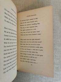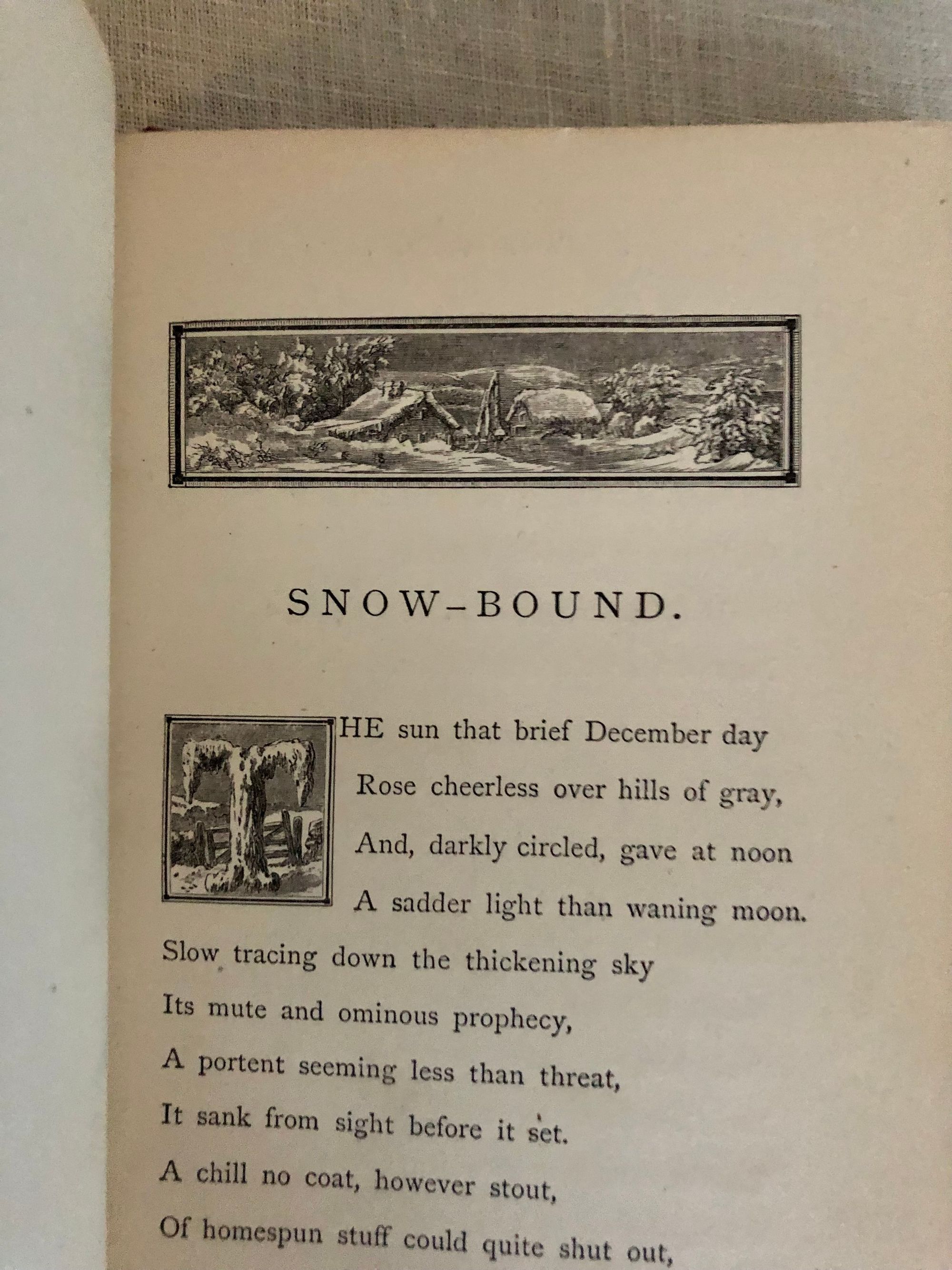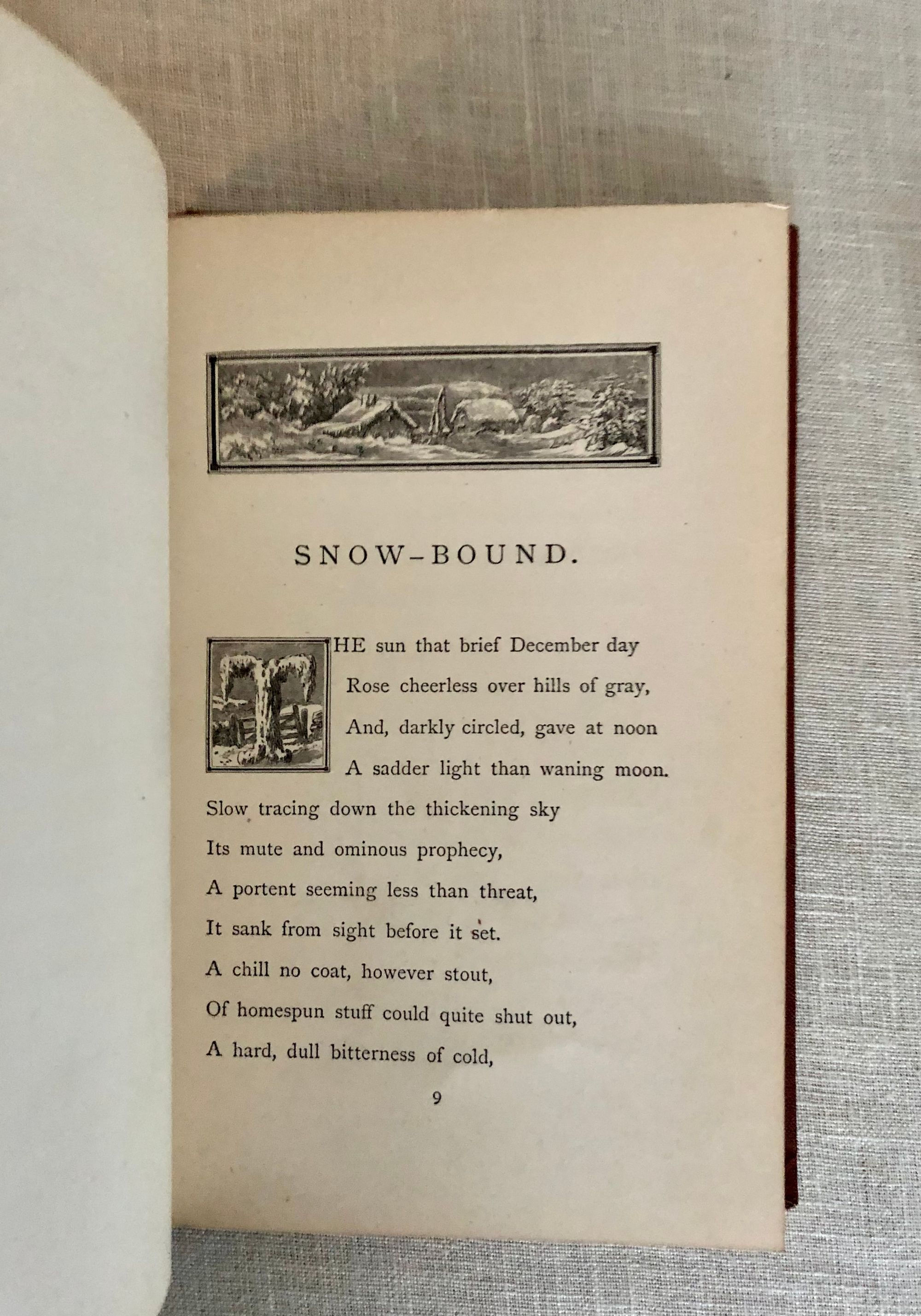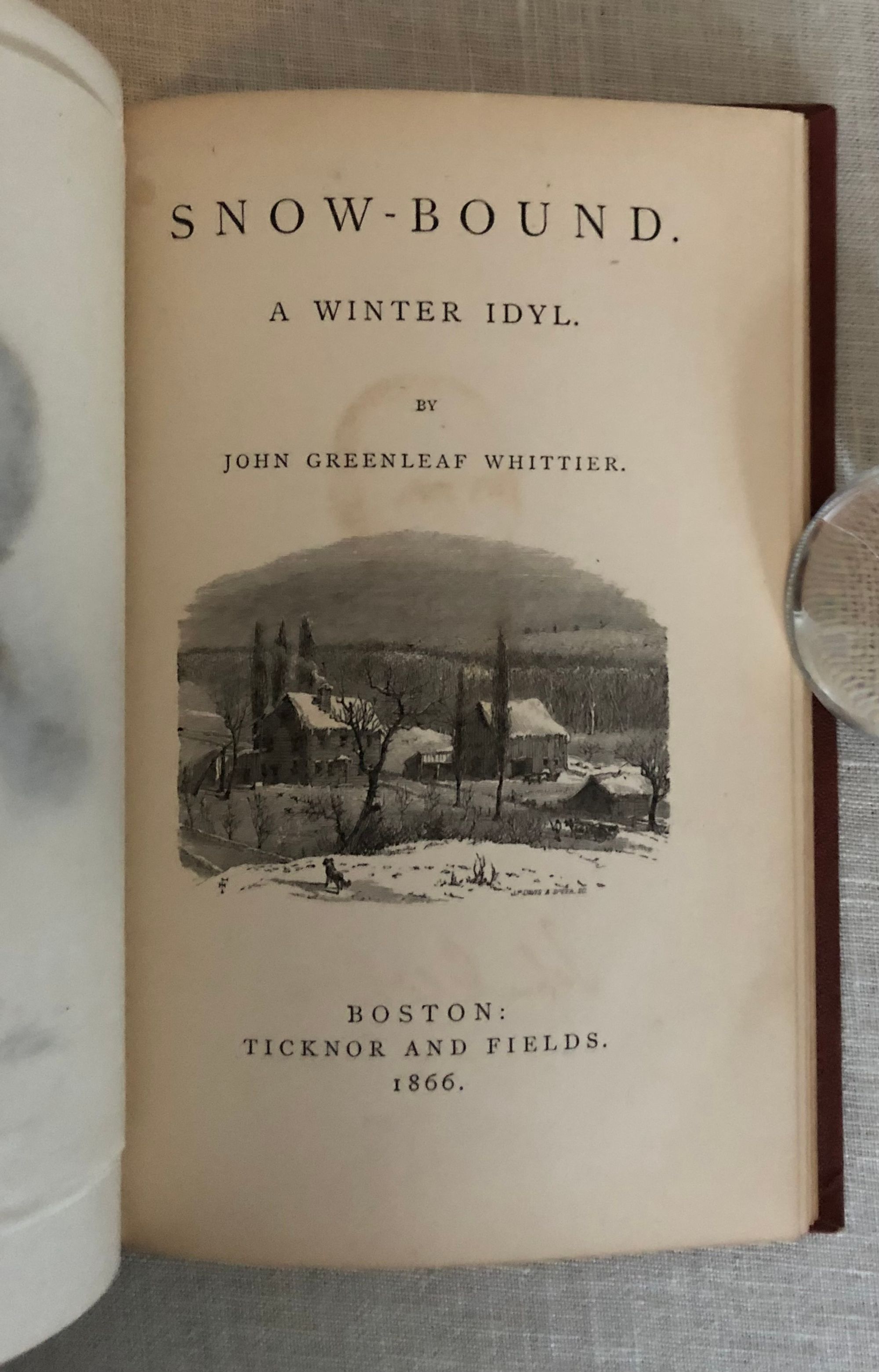 Hard cover,12mo (measuring 4 3/4 x 7 1/4 inches) in original terra-cotta cloth, blind stamped border, with the title to top board and spine in gold, publisher name at foot of spine. Triple flyleaves. (3) 51, < 52>, (3) pp. This is the Second State of the First Edition, as described by Jacob Blanck, with the page number at the bottom of page 52 missing. Condition: Very Good Plus, with a minor bump at head of top board, and some offset from author portrait to Title page. Otherwise, mildly toned but firm, and showing very minimal wear. Clean within. Collector's remarks on edition on rear pastedown in neat pencil. **Engraved bookplate to front pastedown of a former owner.** Whittier's best-known narrative poem, "Snow-Bound," was set at his birthplace, a homestead in Haverhill, Massachusetts. It describes a family's storytelling entertainments by fireside after a classic New England white-out. The few engraved illustrations help make this a wonderful object. BAL 21862.