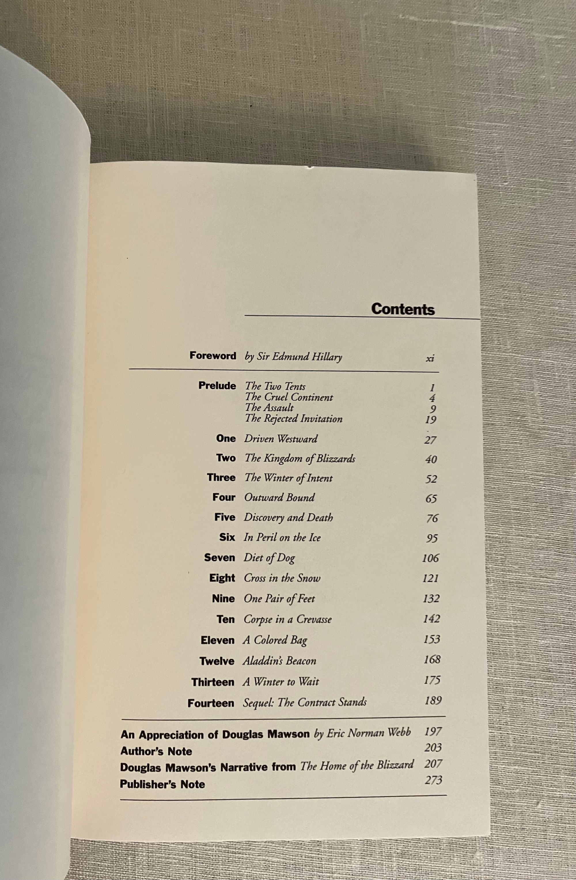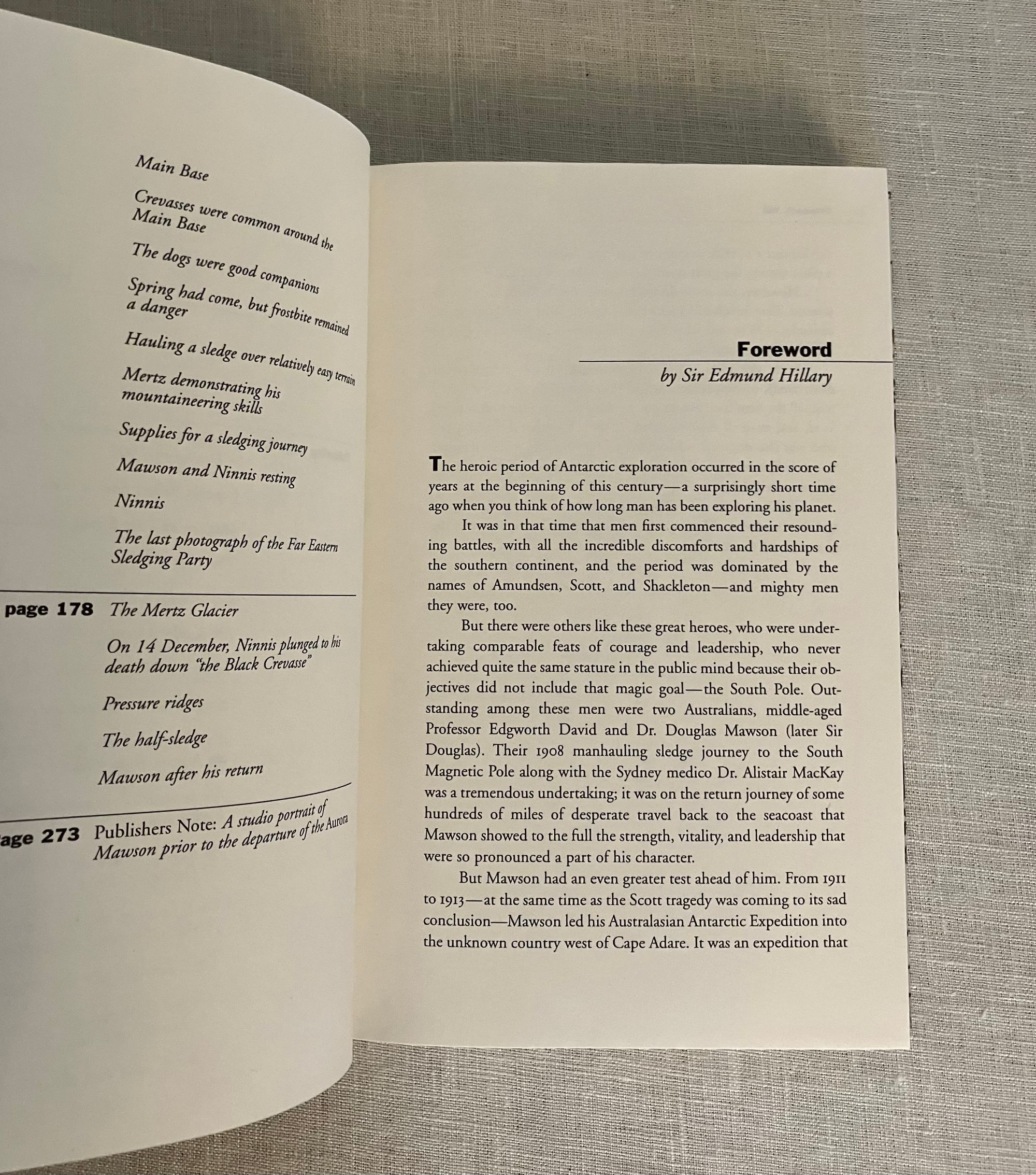 Hard cover, 8vo, in half gray buckram with illustrated paper-covered boards featuring facsimile manuscript of the great Polar explorer Douglas Mawson, title to black printed labels to the spine, gilt, 274 pp. First Edition. Condition Fine (as new). A biography of Australian Sir Douglas Mawson, (1882-1958), once a member of Shackleton's Nimrod Expedition 1907-1909. Later, in 1911-1914, Mawson would have the epic survival adventure to complete the Australasian Antarctic Expedition. Originally a three man scientific party, he would finish the expedition alone, suffering what is described as " the ultimate test of strength and endurance, an ordeal of almost unimaginable proportions." This volume is reprinted from a 1977 title with additions, including a forward by Sir Edmund Hillary, reproduction glass-plate photographs, and a new Author's Notes, as well as a reprint of Mawson's expedition diary.