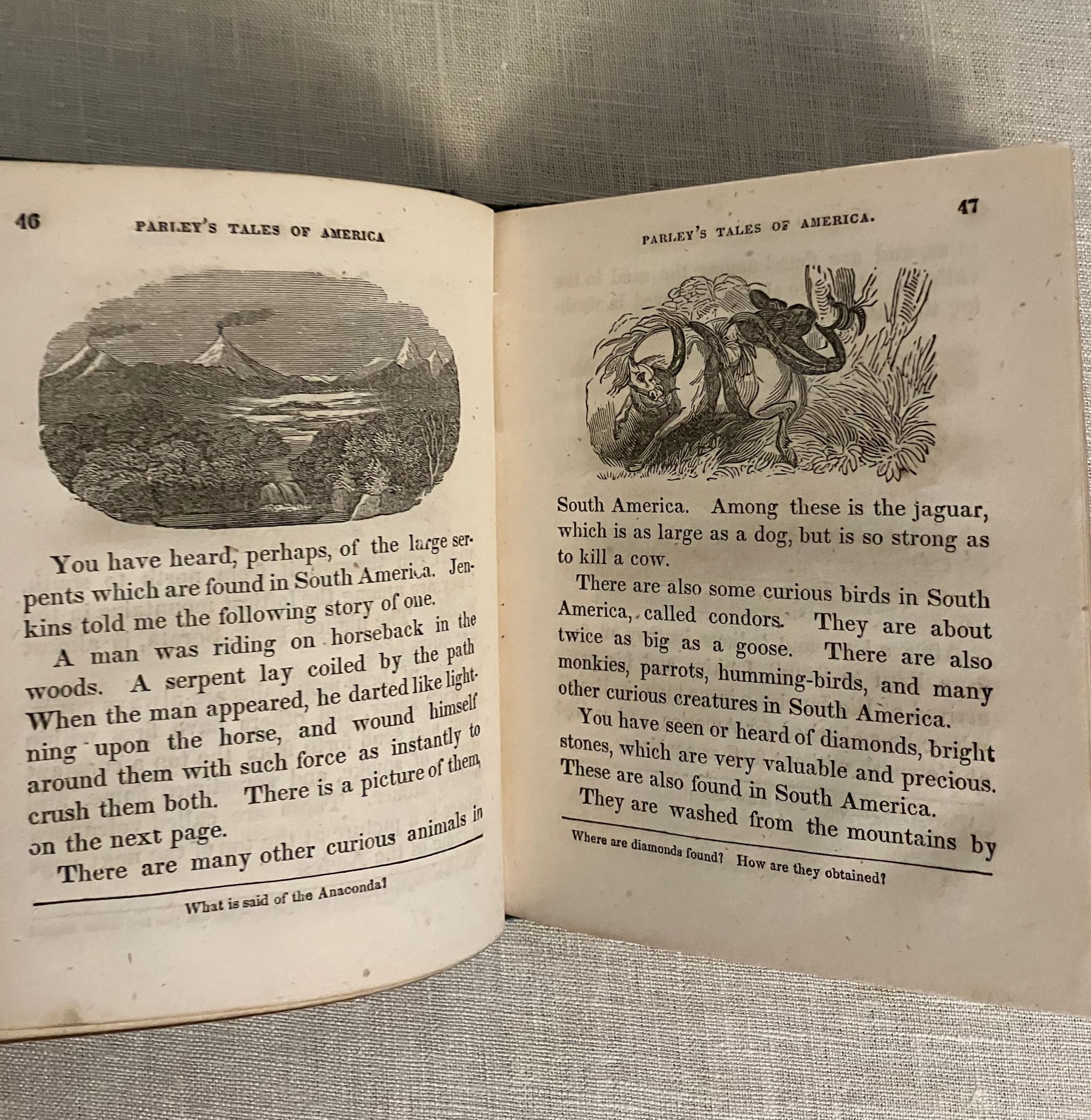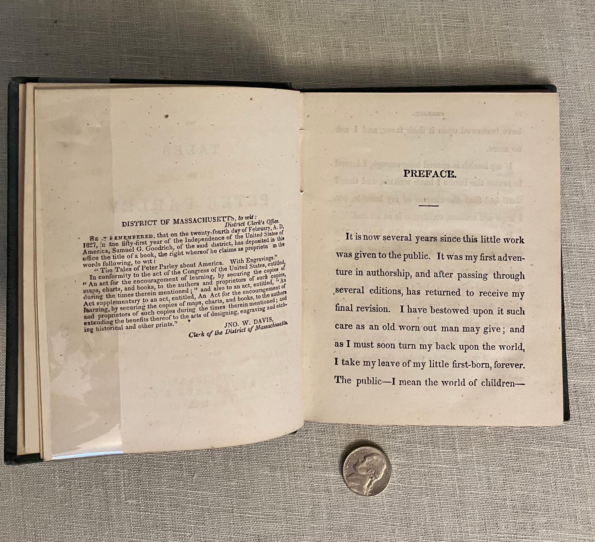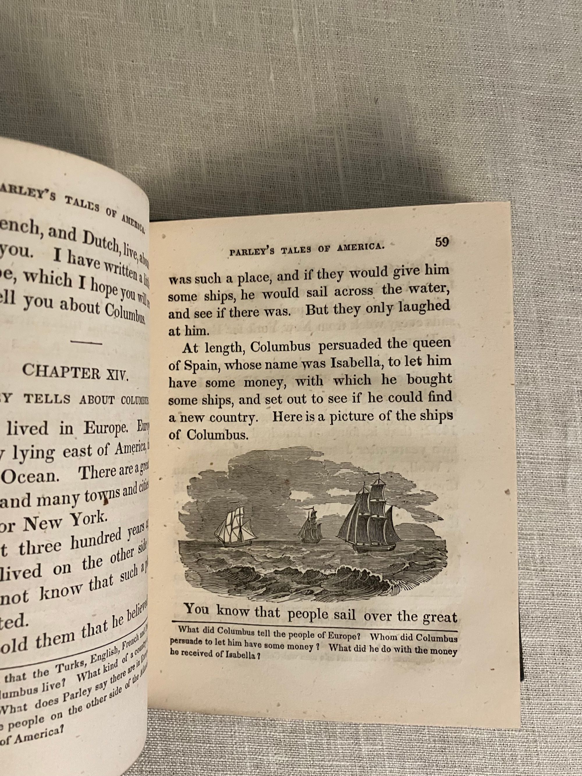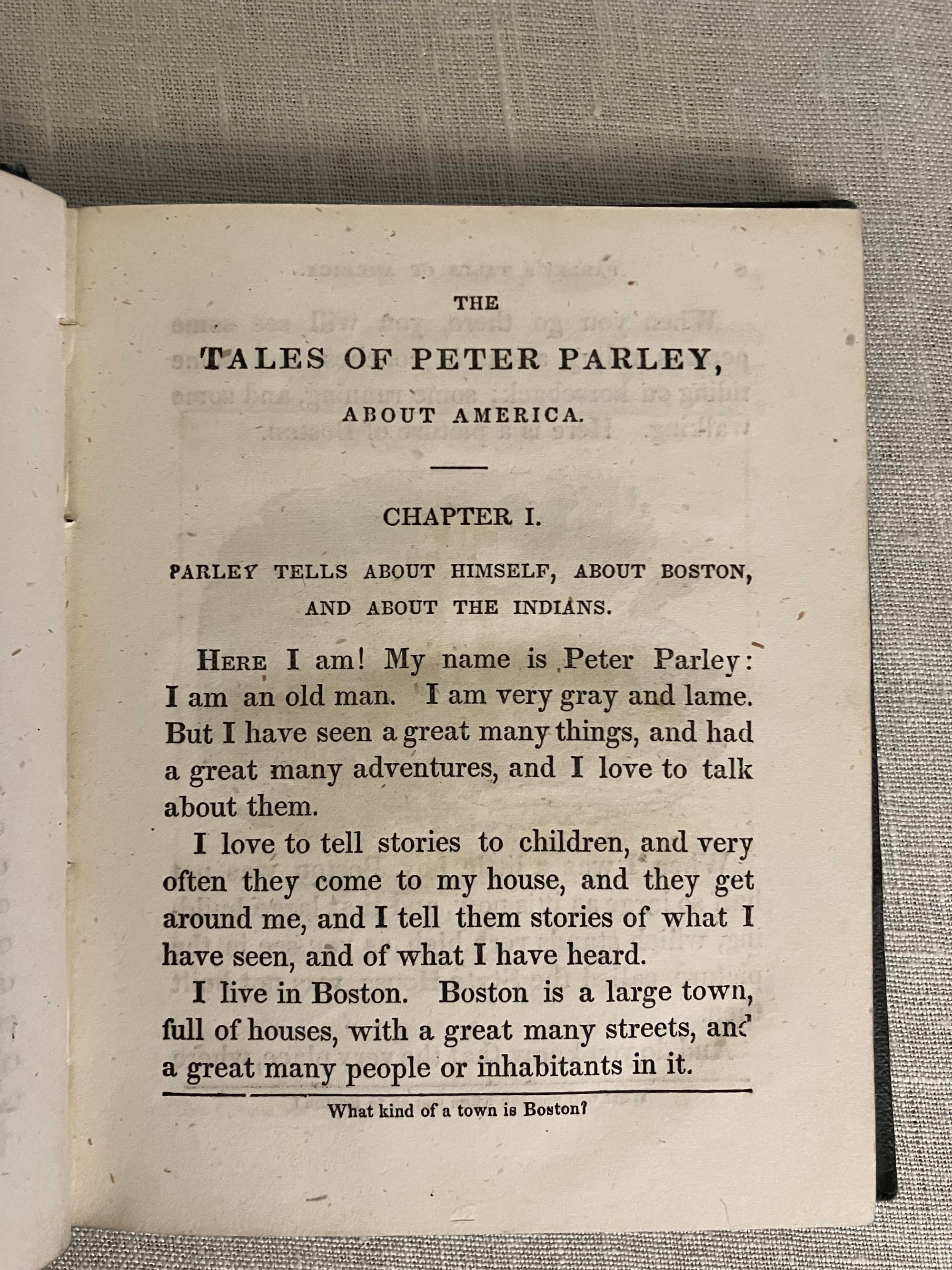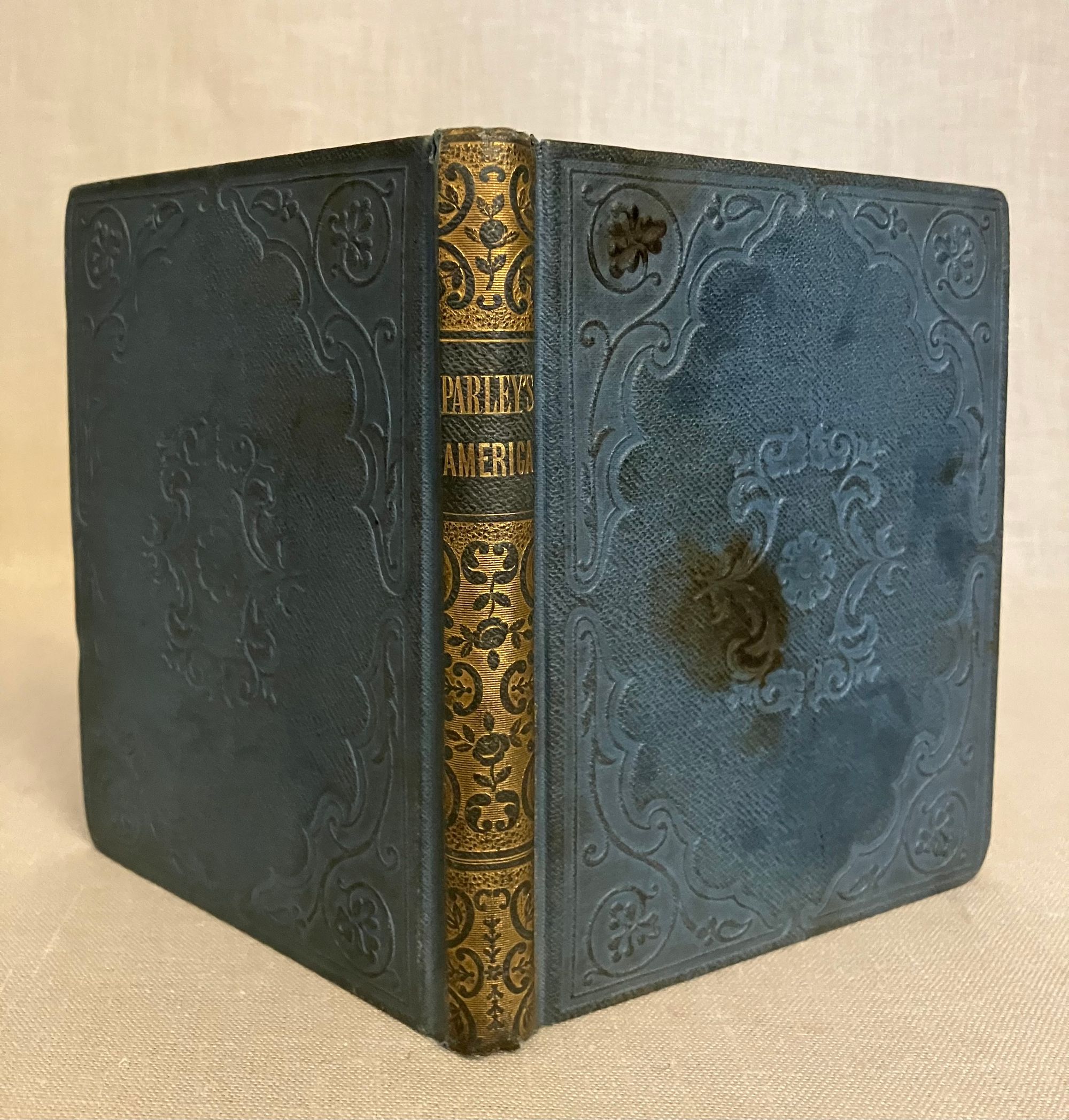 Hard cover, 24 mo ( measuring 4 1/2 x 5 3/4 inches ), in original blue cloth, with floral design stamped in blind to both boards, and the spine ornately decorated in gilt. 144 pp. Condition: Good Plus. The book is generally tight and clean within, with a couple of old ink stains ? to the top board and moderate soiling to both boards. Otherwise, very attractive and charming with the many engraved illustrations. A gift inscription in old ink dated 1855 from a father to his daughter, appears on the ffep. This work of history and geography for children of the young republic was first published in 1827, going through various editions in the subsequent years. Author Samuel Griswold Goodrich (1793-1860) a largely self-educated man, relocated his Connecticut bookshop and publishing business to Boston just prior to the advent of Peter Parley. The series was much imitated. As described in the author's introduction, this is the Revised Edition of the very first book of the series, and the current copyright page re-asserts Goodrich's original filing of 1827. OCLC 41485038
