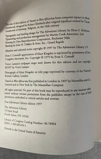Hard cover, Octavo (5 ½" x 8 ⅜"). pp xxiii [3] 248 [6]. In half buckram with paper-covered boards featuring an African river, gilt titles to spine on dark green printed labels, and end papers featuring a map of West Africa. Condition: Fine. *** One of the few Western women to travel in Africa in the nineteenth century, Mary H. Kingsley (1862-1900) had, after her parents' death, "five or six months which were not heavily forestalled" and, being giddy "like a boy with a new half-crown" determined to spend her newly found freedom in exploration of the world. She decided on Africa in part because she had read of its perils - and no doubt, because it was a land that her explorer father, George Kingsley, had not sought out. She traveled by river, at times in a dugout canoe, and sought out cannibals (stayed with them overnight), got caught in a game trap, freed a captive leopard, and took several fish specimens back to the British Museum. *** Mary Kingsley shared a talent for writing with her uncle, the novelist and poet Charles Kingsley (he of "The Water-Babies" fame). She was also deeply sympathetic with everyone she met, and rejected the notion that Westerners should impose their own religion or values on African societies. Her final journey was to South Africa to serve as a nurse during the Boer War, where she treated prisoners of war, before succumbing to typhoid. *** The Adventure Library was a series of 30 books sold by subscription between 1994 and 2003. The series was the brainchild of Edward Livermore Burlingame, an American publishing executive, who put up his own money to kickstart the company. He had been looking for something new to accomplish, and thought that the classic works of exploration were being overlooked by the reading public, because there were no new editions. This is book 10 in the series.