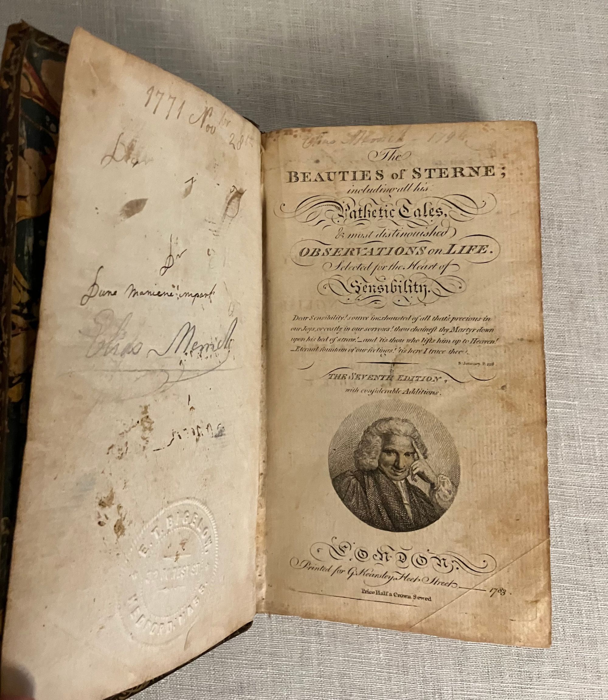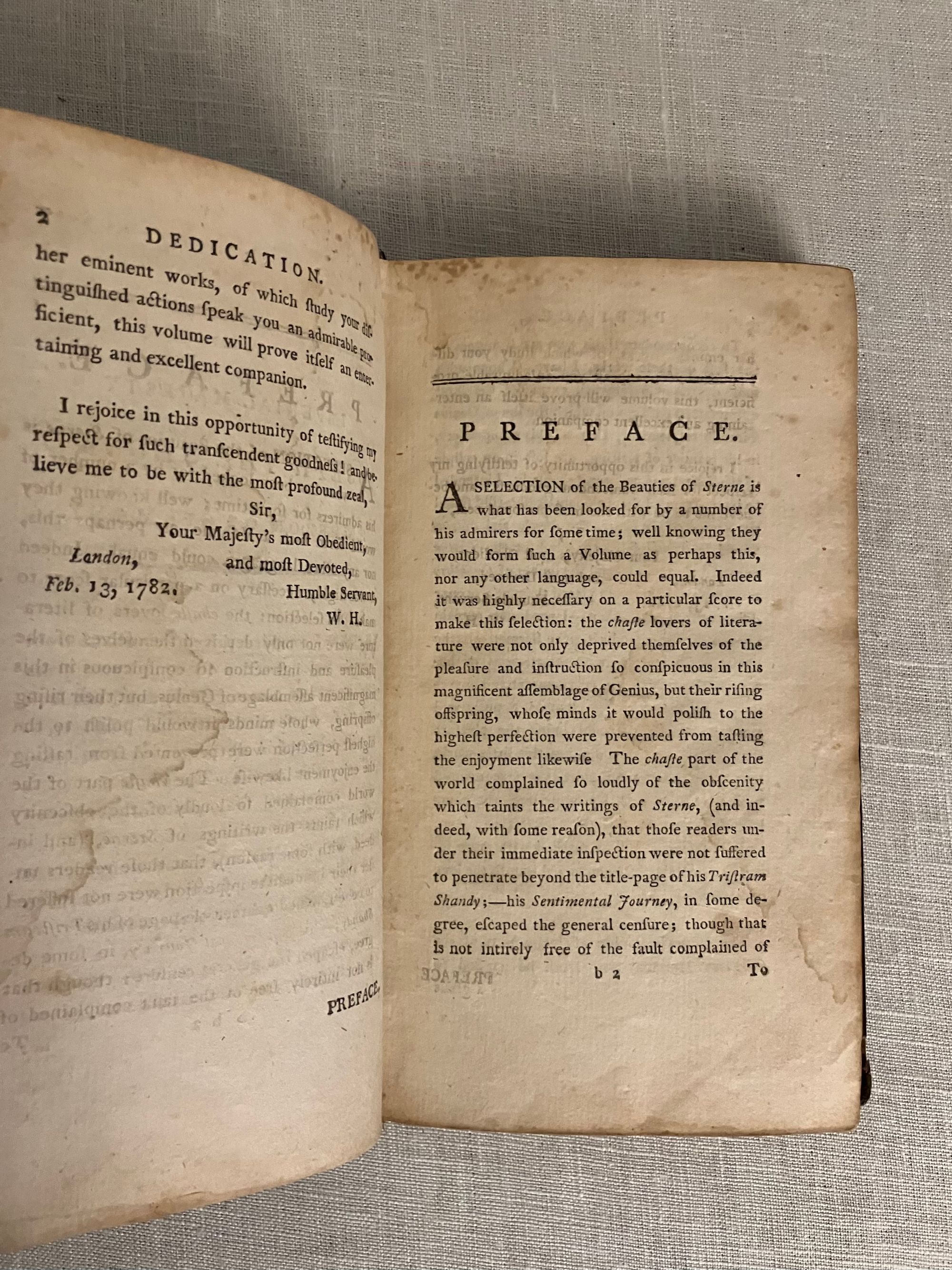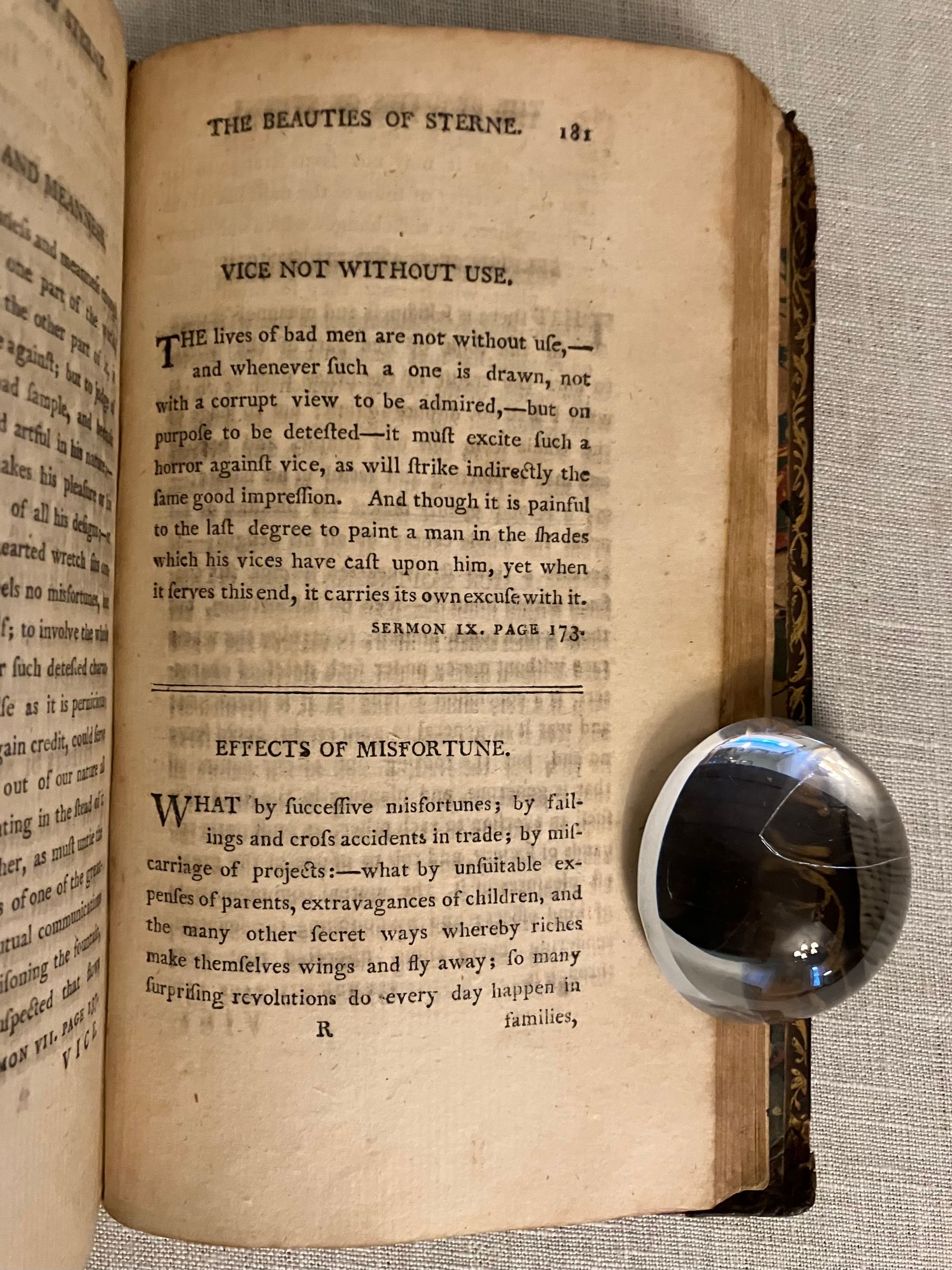 Hard cover, 12 mo., (measuring x x x inches), in full tree calf gilt, with a red leather label with title applied to the elaborately gilt spine, marbled end papers with a former owner's pencilled signature on the pastedown dating from 1794. Other pencil and old ink dated signatures to both endpapers. Seventh Edition, (2) 284pp. which includes three pages of publisher's adverts at the rear. Printed by C. Etherington, at No. 3 Peter-borough Court, Fleet-Street. Condition: Good. Covers worn, especially the at corners, with small losses at head and tail of spine. Hinges are cracked but holding firmly, the front hinge having been previously reinforced with white tape. A modern collector's blind stamp is also upon the ffep. Text is moderately toned throughout. However, this item remains handsome and entertaining. Irish-born author Laurence Sterne (1713 - 1768) was a novelist and clergyman, famously known as the author of "The Life and Times of Tristram Shandy." This volume is an anthology of entertaining quotes from this, and other writings, including some sermons. ** Publisher and bookseller George Kearsley (the elder) (1739-1790), produced this as part of an anthology series " The Beauties of...". Other subjects included Pope, Johnson, Goldsmith, Fielding, Watts, Swift, Hume and Shakespeare, among others. He was also the producer of the periodical The North Briton, which got him into some hot water for accusing the King of lying in one issue. This item remains handsome, considering its venerable age, with a graceful patina on the splendid tree calf and carefully applied eighteenth- century decoration. Watson II, 949.