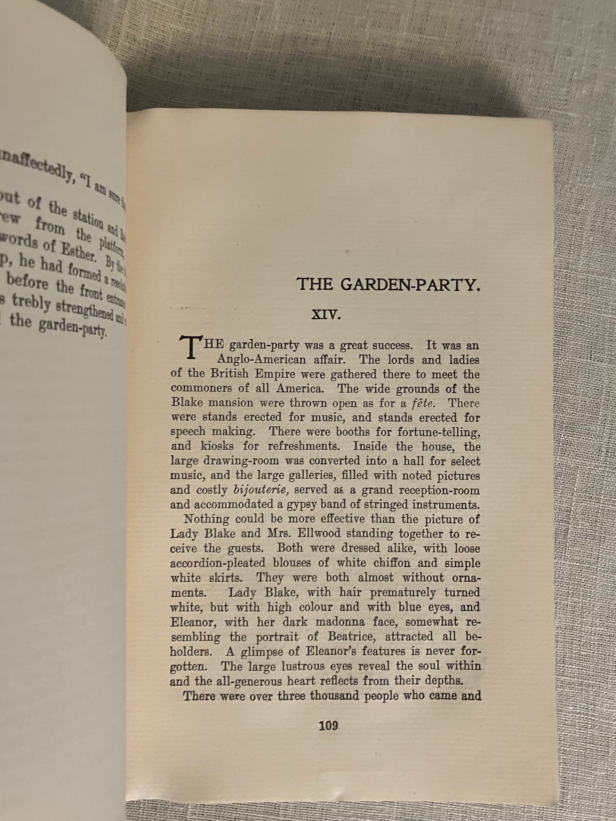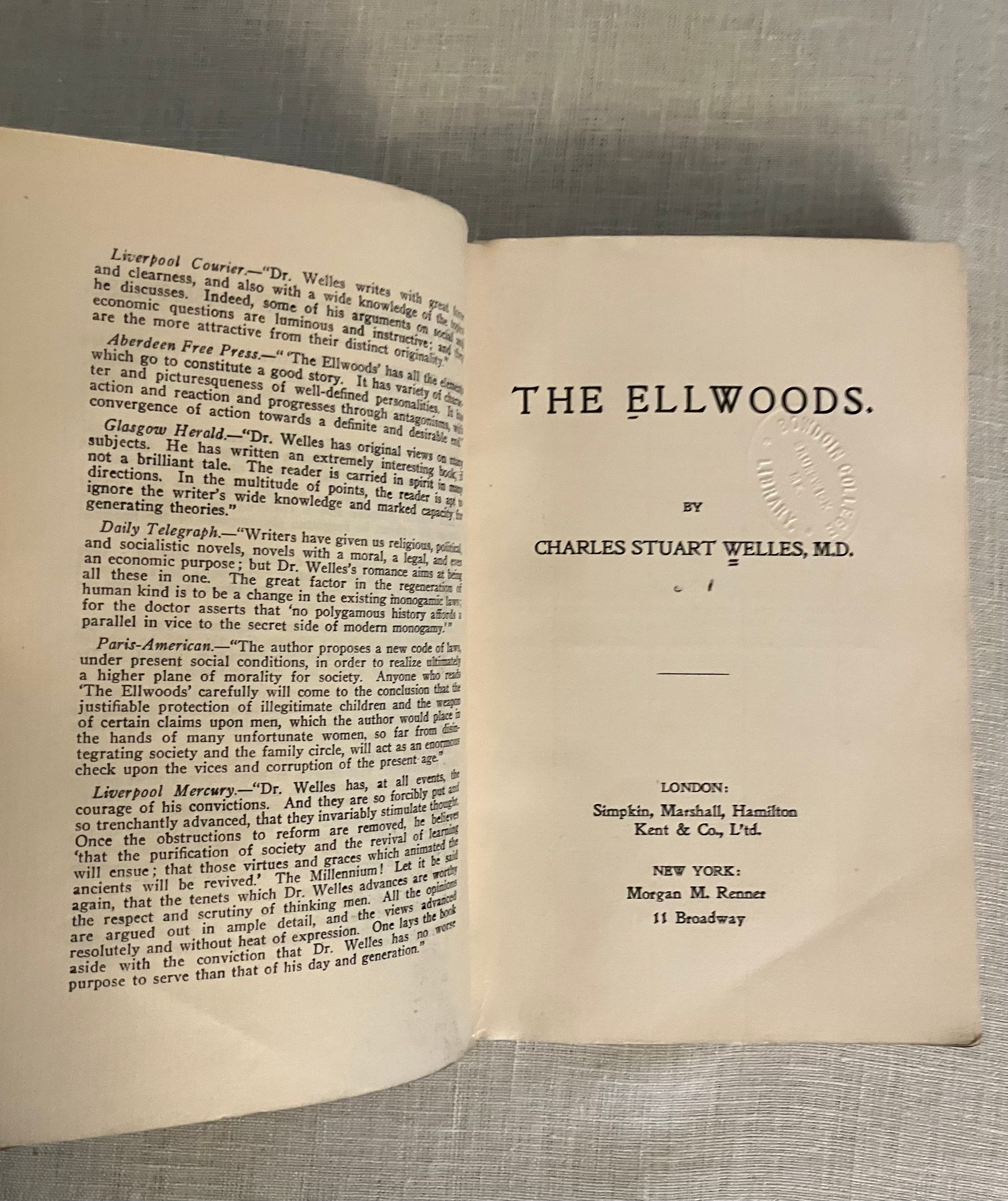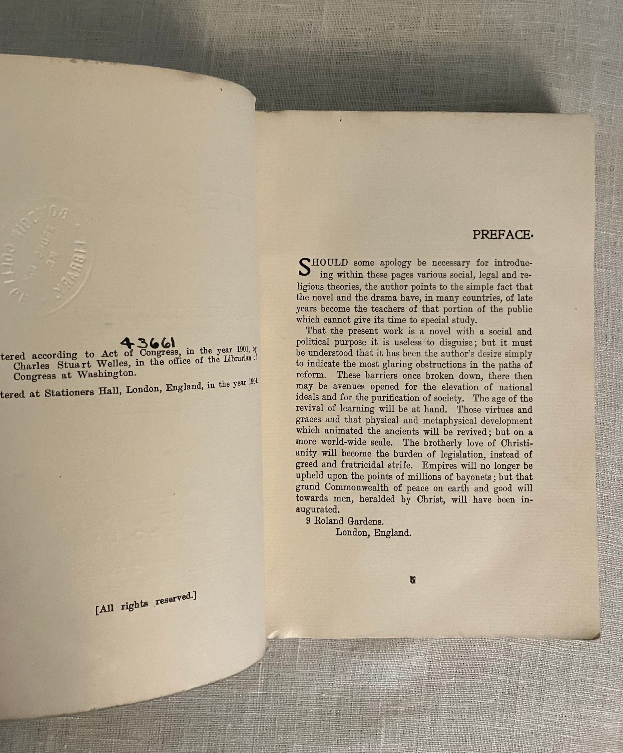 Reprint of the 1901 first edition. Soft cover in the original tan paper wraps, 12 mo (5 x 7 1/2 inches), with titles in black ink to front and spine, ex-library Bowdoin College, with large withdrawal sticker to verso front wrap, call letters to spine on a vintage paper label. Blind stamp to title page. Condition: Very Good Minus: edges dusty, spine shows one crack, missing quarter -inch of wraps at head of spine. Light soiling to exterior. However, the inside pages are clean and unmarked (looks unread.)**Described by its author in the Preface as a novel "with a social and political purpose," it appears to be highly autobiographical in nature. The saga follows a New York doctor's family removal to England, There are robust allusions to various reform questions, many based on religious interpretation, including a discussion of polygamous versus monogamous marriage, and broad hints of spiritualism. Genealogical information on the Author, Dr. Charles Stuart Welles (1848-1927) mentions his nomination as Vice President of the United States in 1888, and his appointment as First Secretary to the American Embassy in London. He wrote several novels, poems, as well as works on medicine and international law. Scarce in commerce. OCLC 7587175.